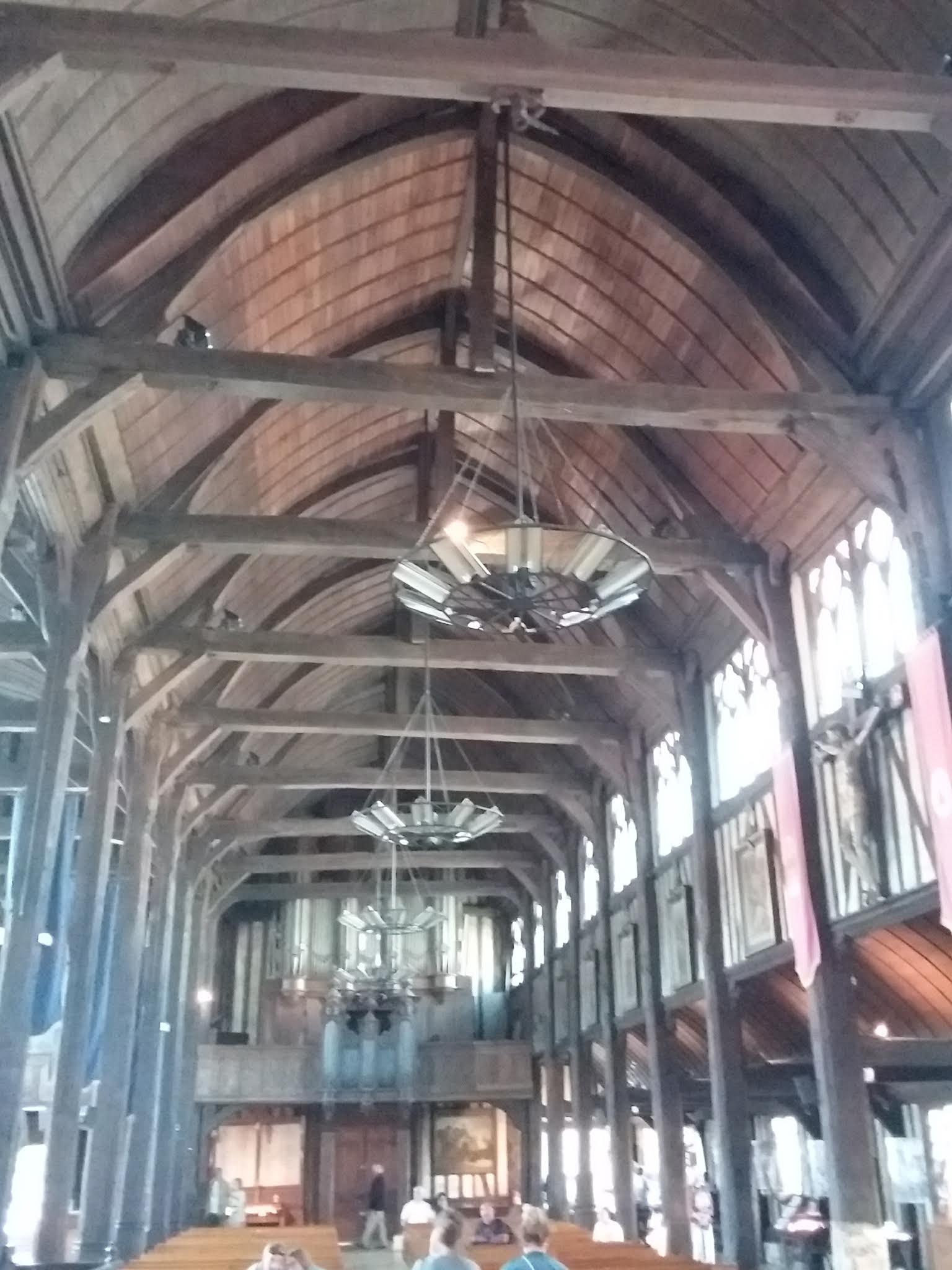 Une église atypique, une architecture faite de bois,de l'intérieur des travées se distinguent,avec la sensation de quatre coques de bateaux retournés. Un intérieur très riche en objets religieux.... Vous trouverez deux orgues très imposants et de belles factures. ....