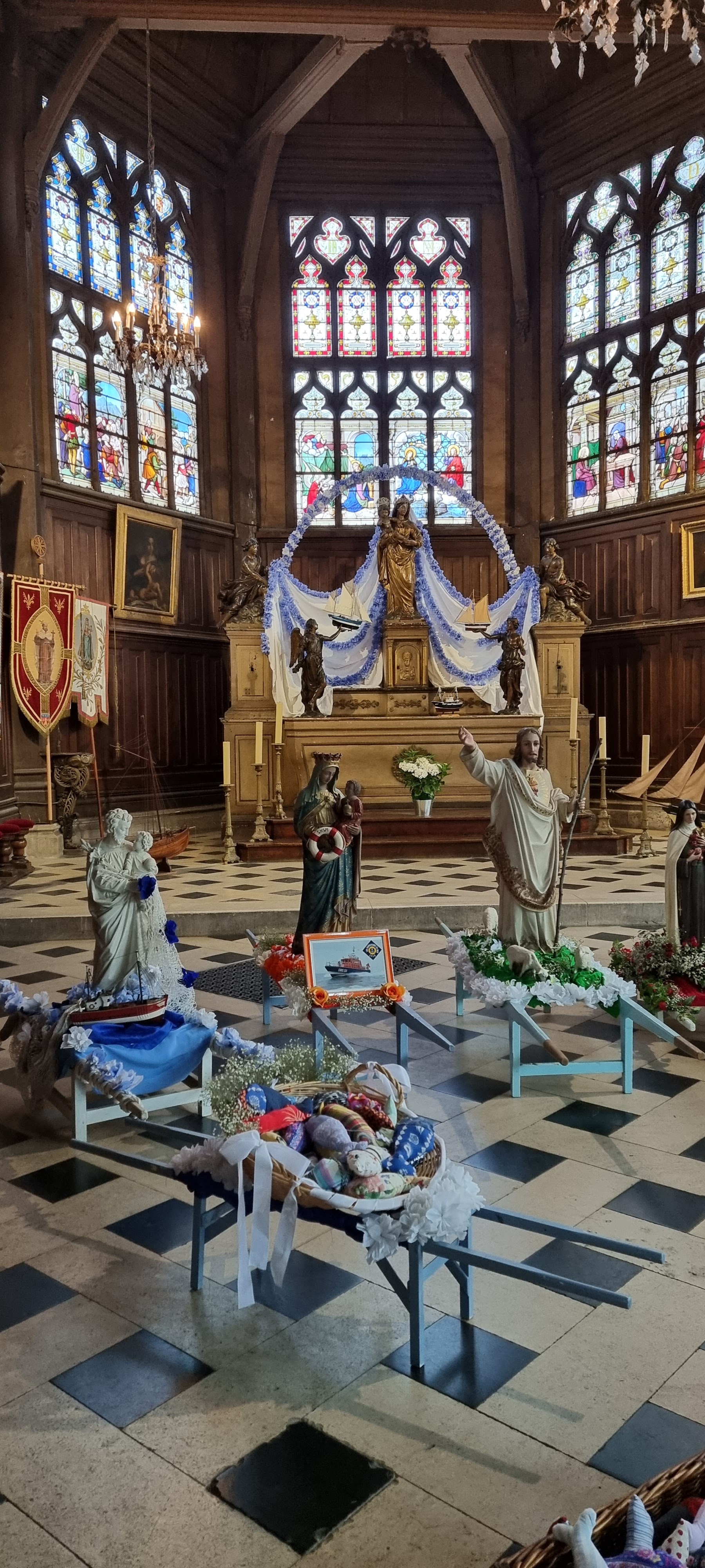 Splendide église tant à l'extérieur qu'à l'intérieur, de surcroît abondamment décorée/fleurie. Magnifiques statues divers saint(e)s, buffet d'orgue, vitraux, très belles bannières processions/bénédictions des bateaux. Nombreux émouvants ex voto. Jolies veilleuses variées. Dommage toutefois de profiter de la proximité de Lisieux pour vendre 1Euro une petite image représentant Ste Thérèse...