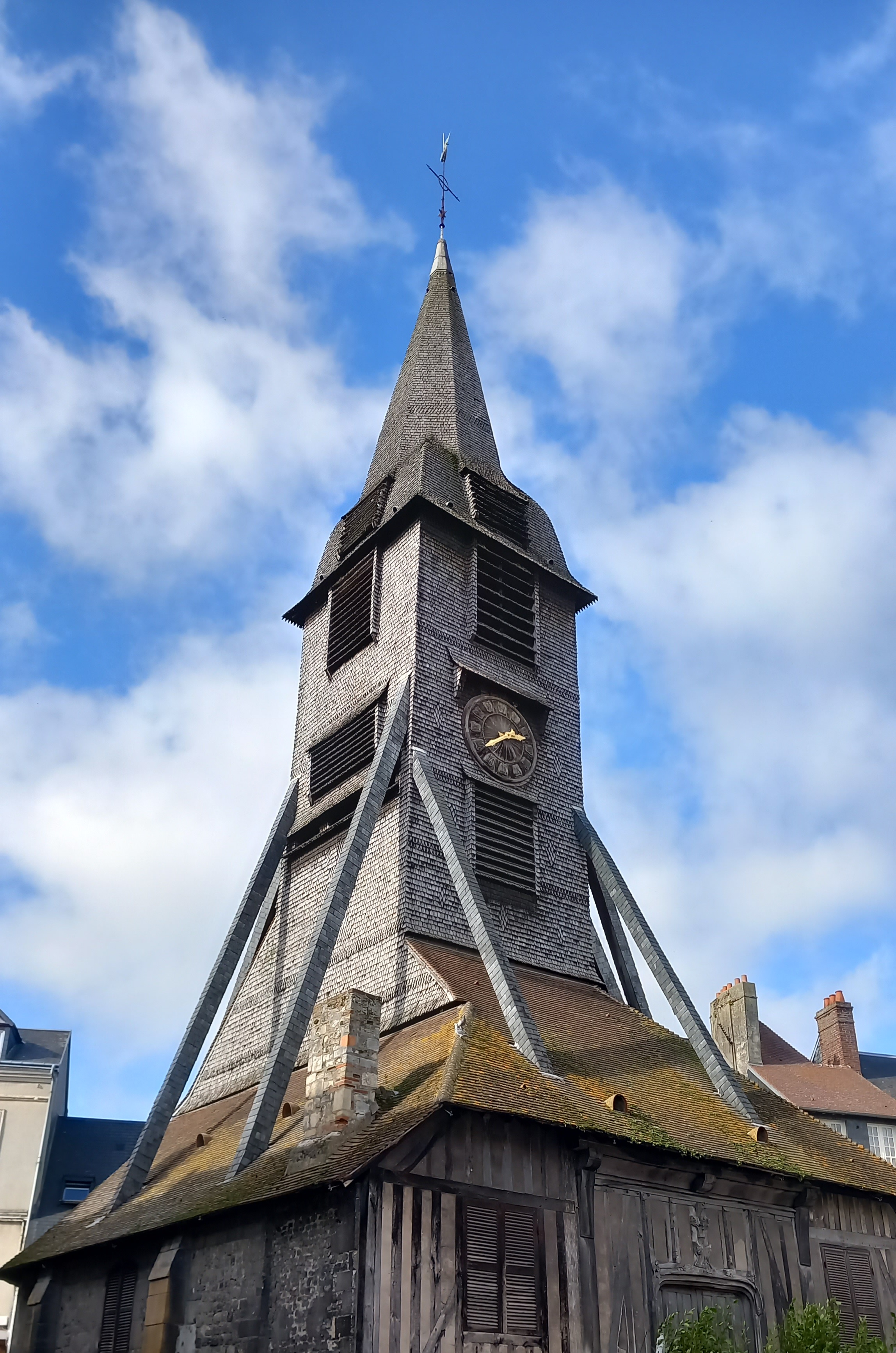 Eglise mythique de Honfleur qui rythme la vie du village depuis la deuxième moitié du XV ème siècle pour la partie droite, la partie gauche est du XVI ème siècle. La particularité est bien cette construction de bois recouverte de bardeaux de châtaignier qui reste extrêmement rare de nos jours. Il est juste étonnant de voir de nombreux fils électriques qui parcourent un peu de manière anarchique l'intérieur de l'édifice, quand on connaît les dégâts du feu sur de tels bâtiments il faudrait revoir tout cela ! Bondée lors de la messe de minuit,une expérience particulière a vivre au moins une fois.