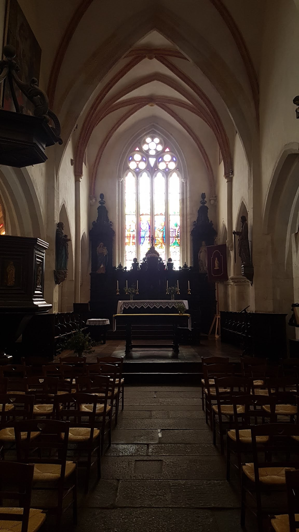 Très intéressant pour les passionnés d'histoire. A visiter impérativement pour ses vitraux financés par des familles de morts de la 1ere guerre mondiale. Les photos des morts se trouvent sur des médaillons sur un des piliers. Avant de s'y rendre, faire des recherche sur Sainte Hélène, pour comprendre un grand tableau de l'église. Église plutôt de décevante du point de vue architecturale, mais vaut le détour. Aller voir la chapelle Notre-Dame du calvaire sur son pic rocheux, très sympa, très belle vue, à faire absolument (à 500m à peine, un peu dur à trouver). PS: la chapelle de trouve sur le site d'un ancien château aujourd'hui disparu, assiégé pendant la guerre de cent ans, un combat réunissant 5000 hommes s'y déroula. 3000 hommes pour les français de Charles de Blois, 2000 pour les anglais. Bilan : 700 morts, une victoire anglaise, Charles de Blois aura l'occasion de visiter la tour de Londres pendant 5 ans. Ils sont sympas, ces anglais.