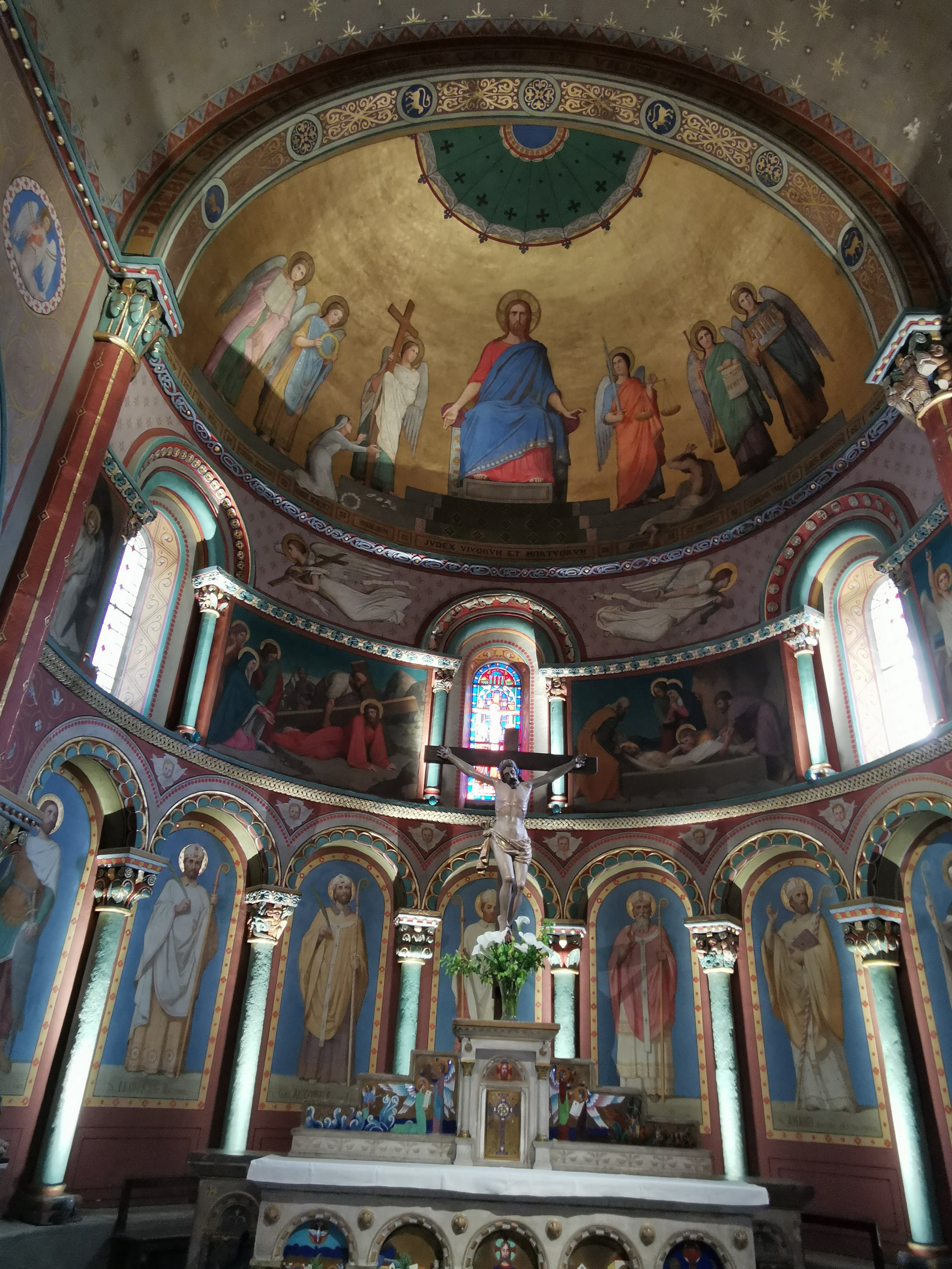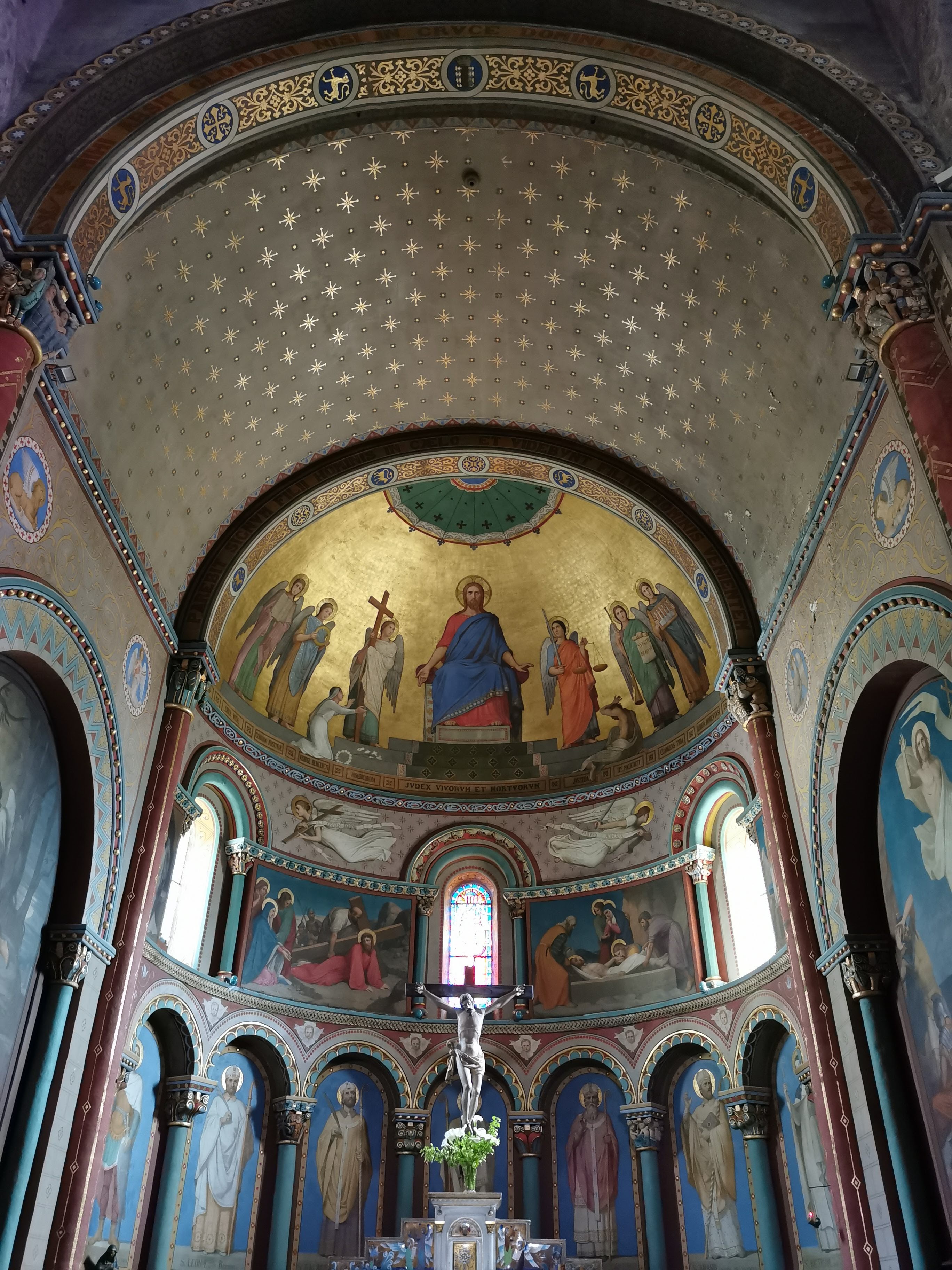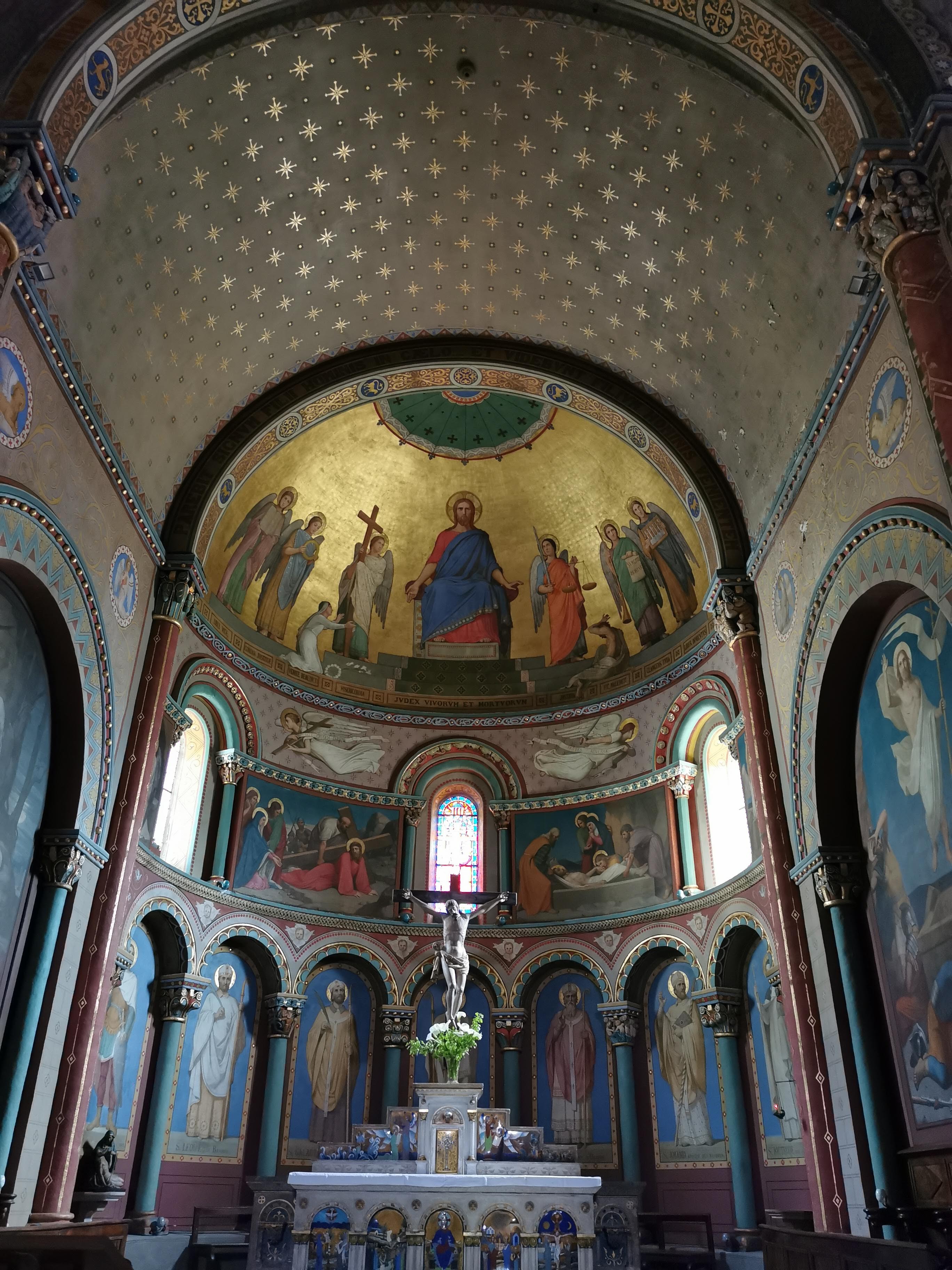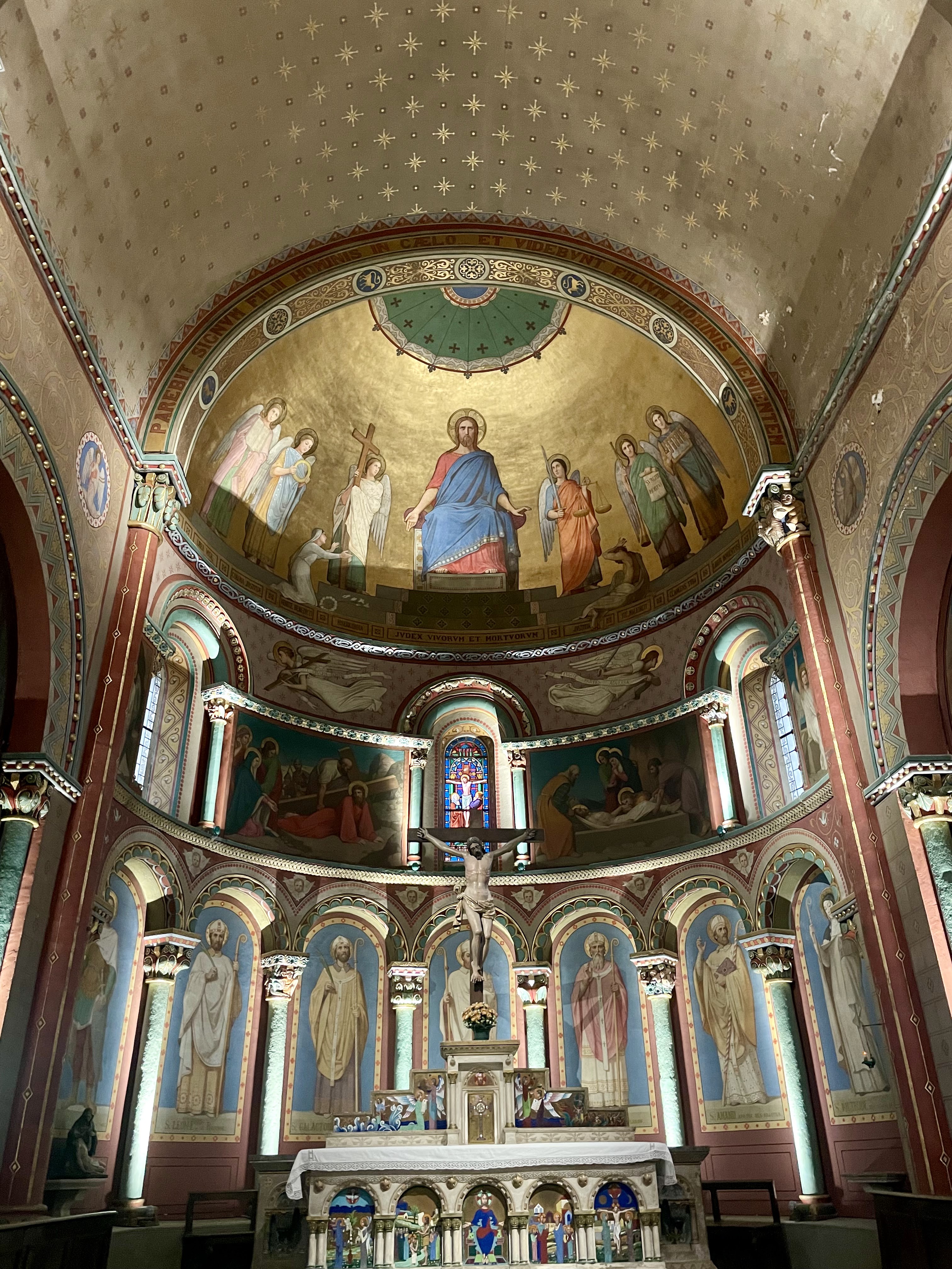 Église romane à trois nefs avec peintures murales du XIXe siècle