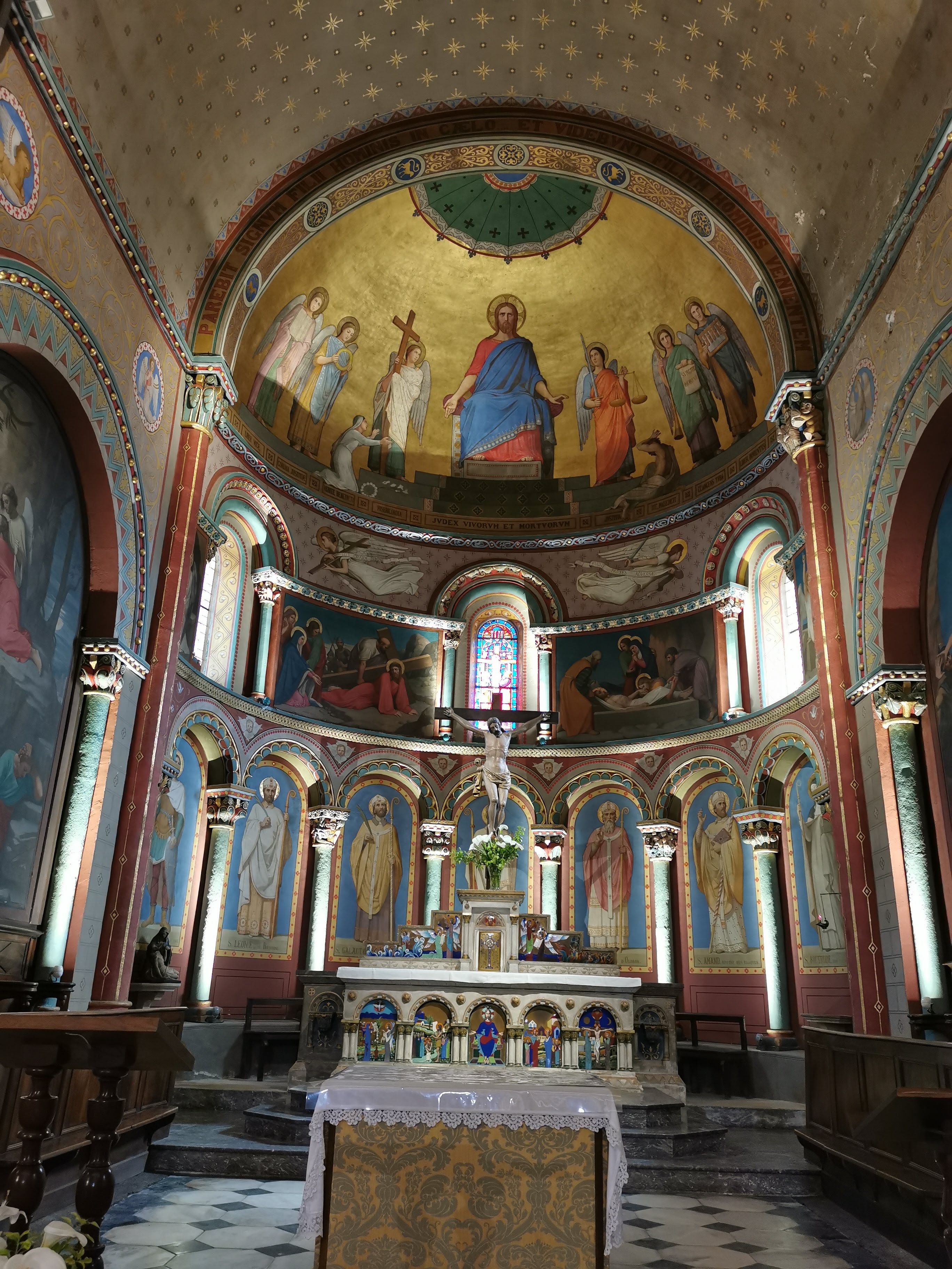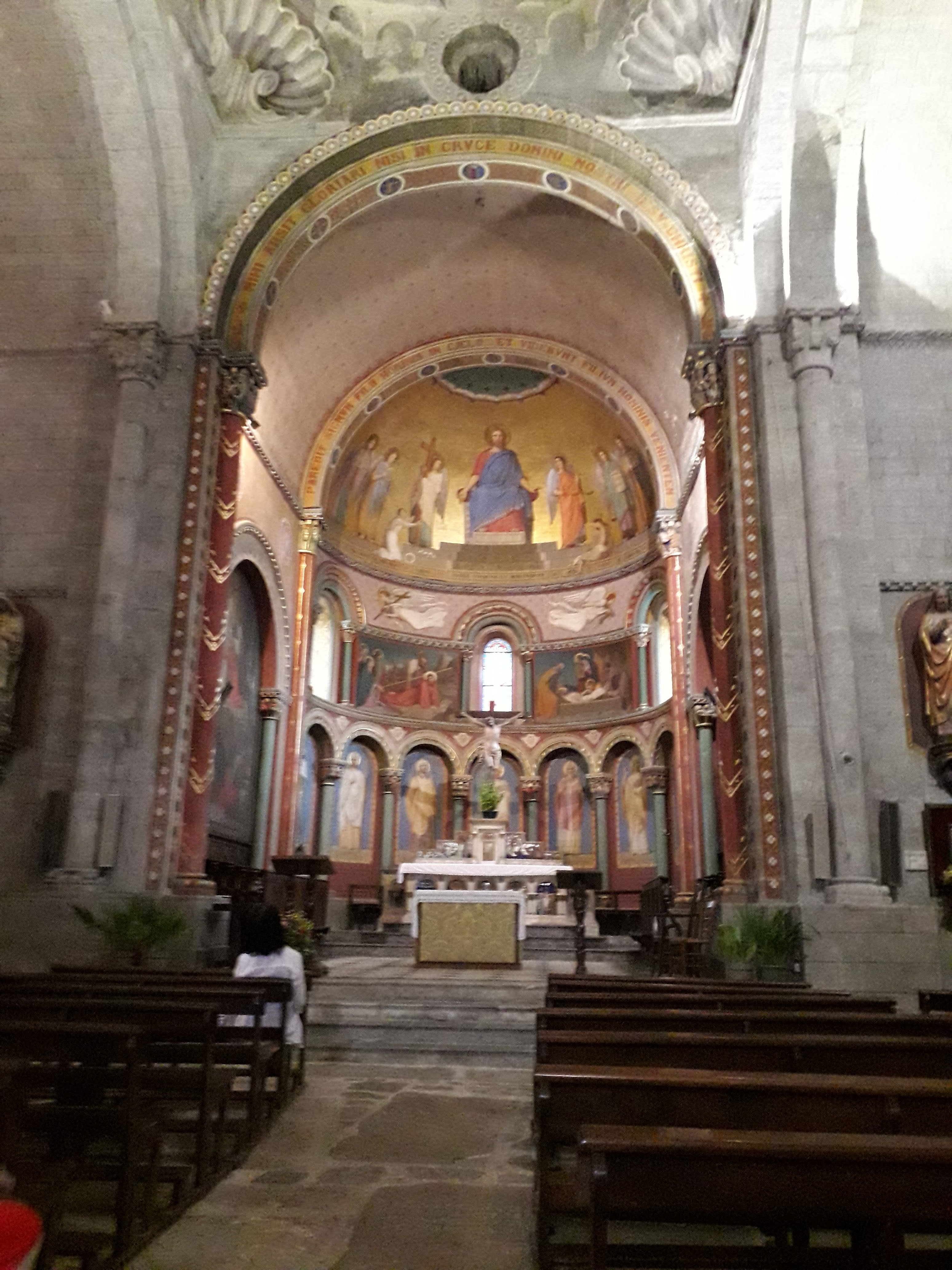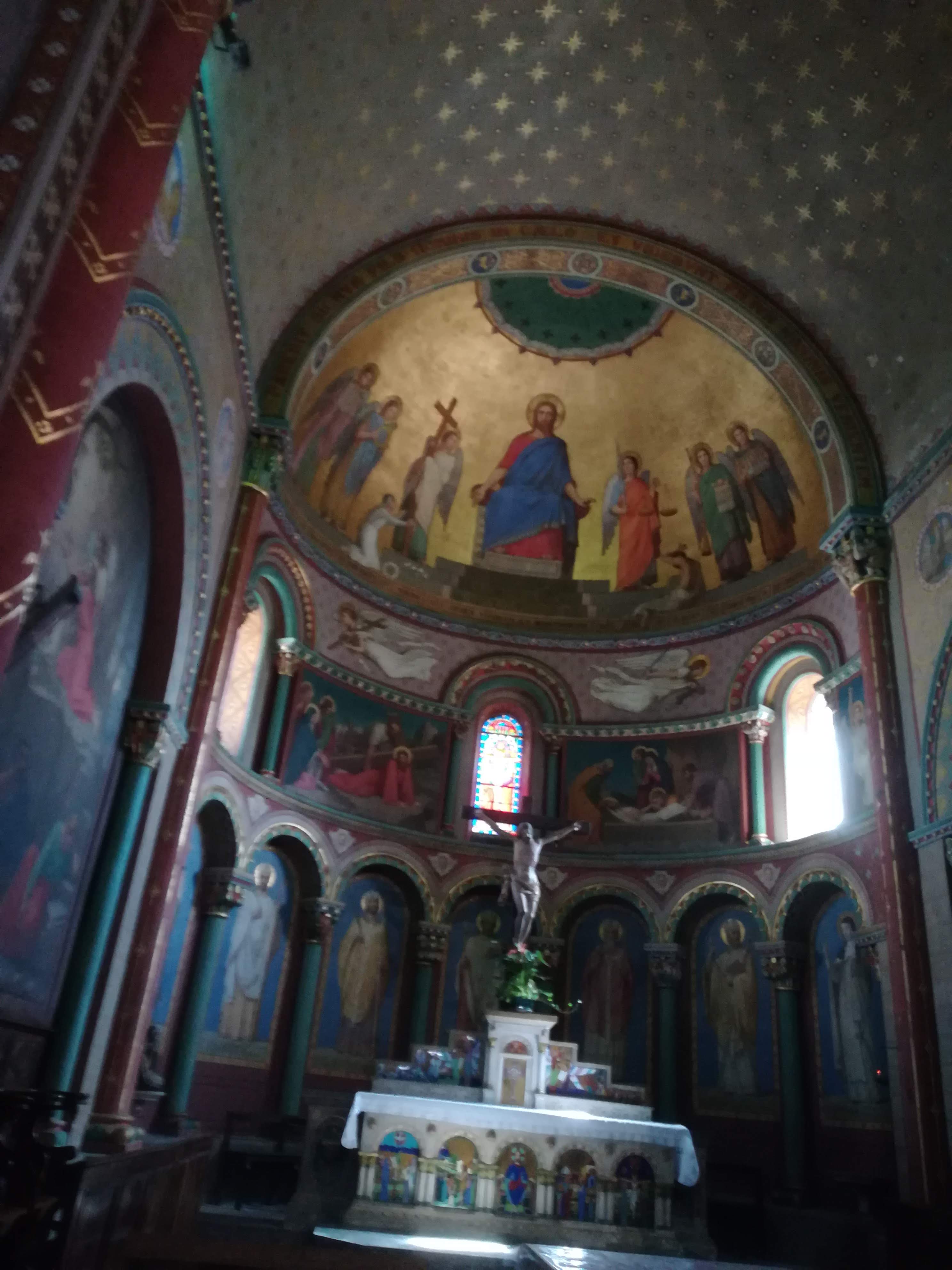Qui vaut la peine d'être visité. De style roman, polychrome,...Invite à s'arrêter un moment pour prier. Ouvert sans garde. Un plaisir.