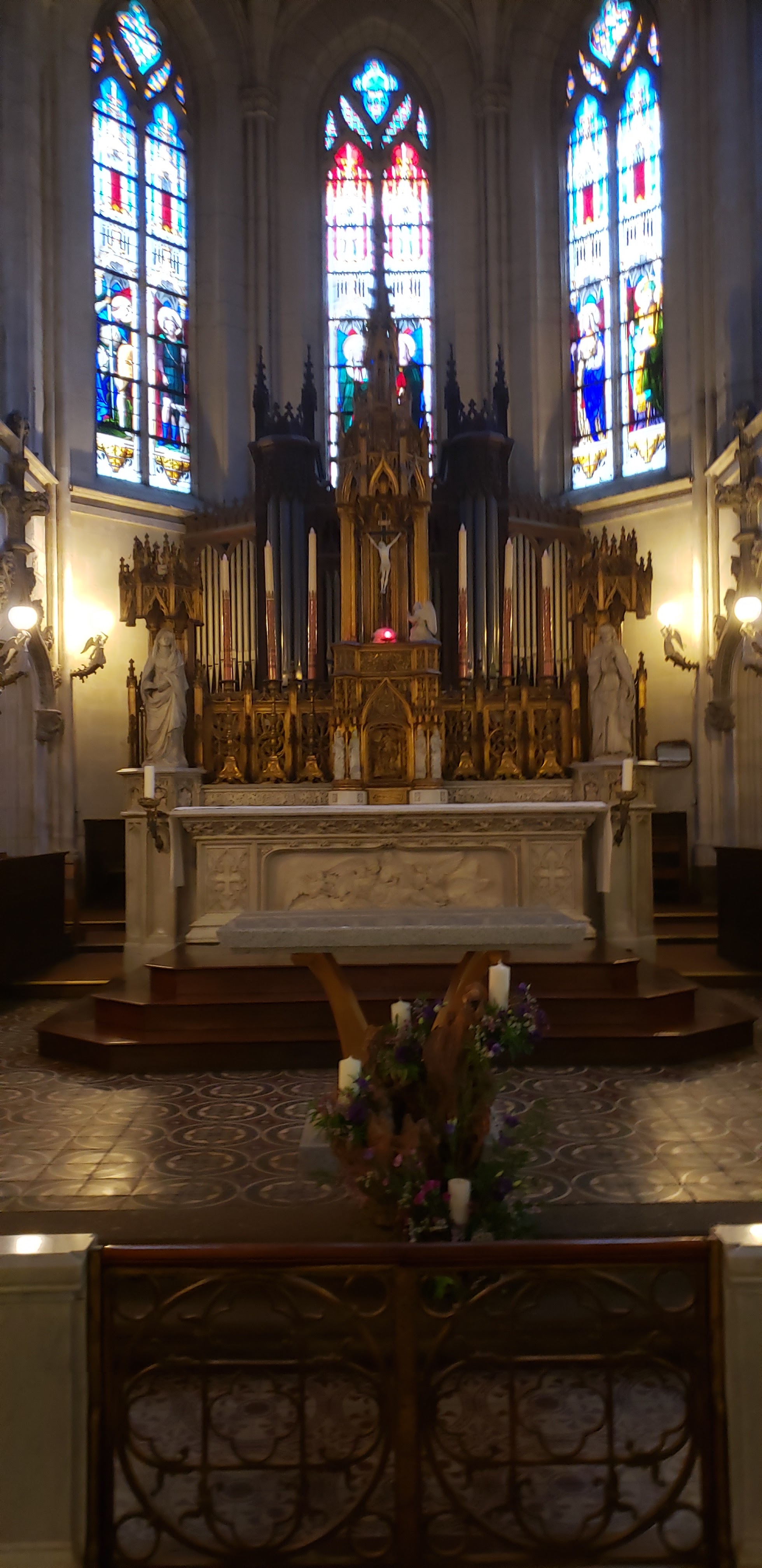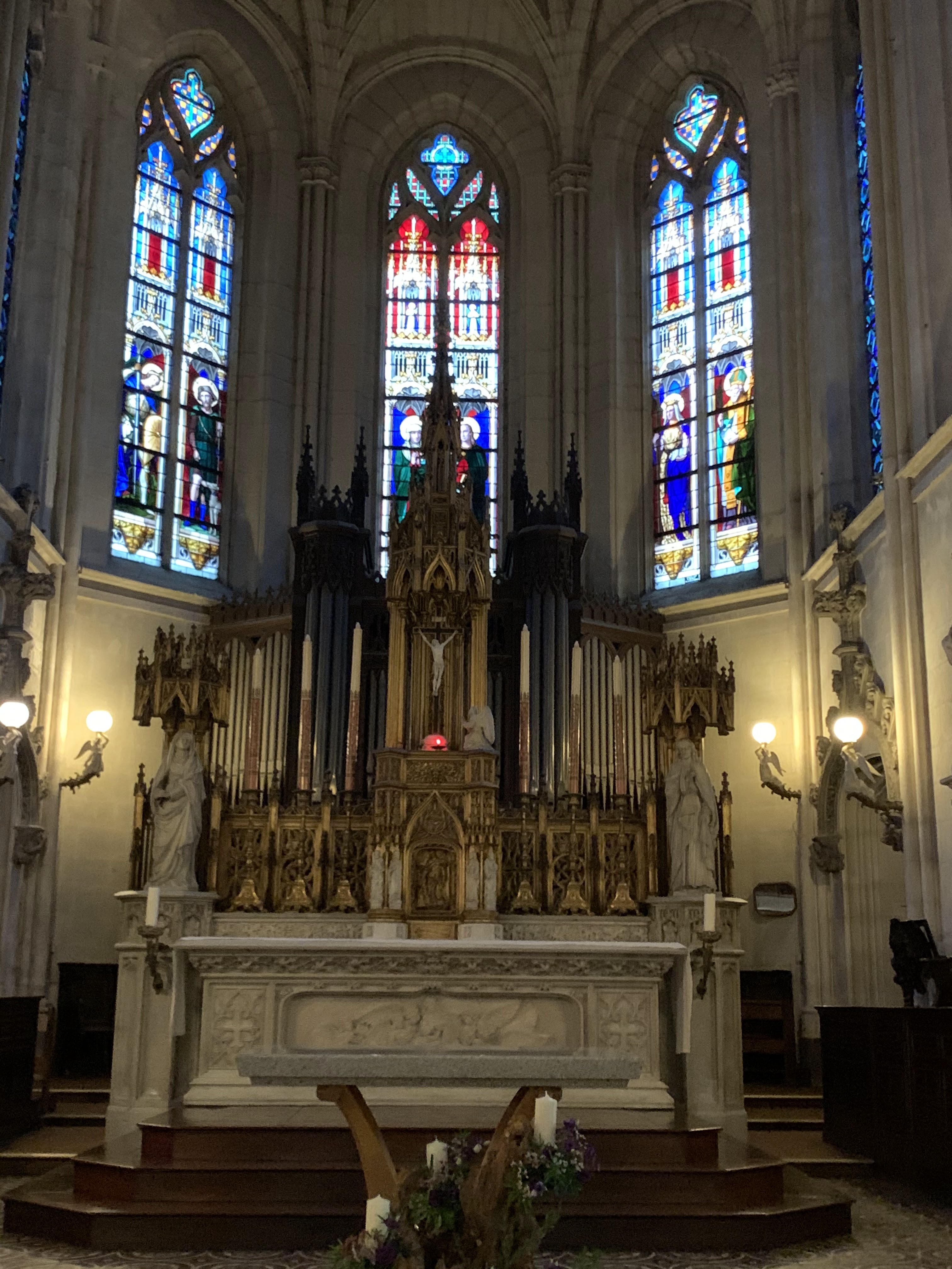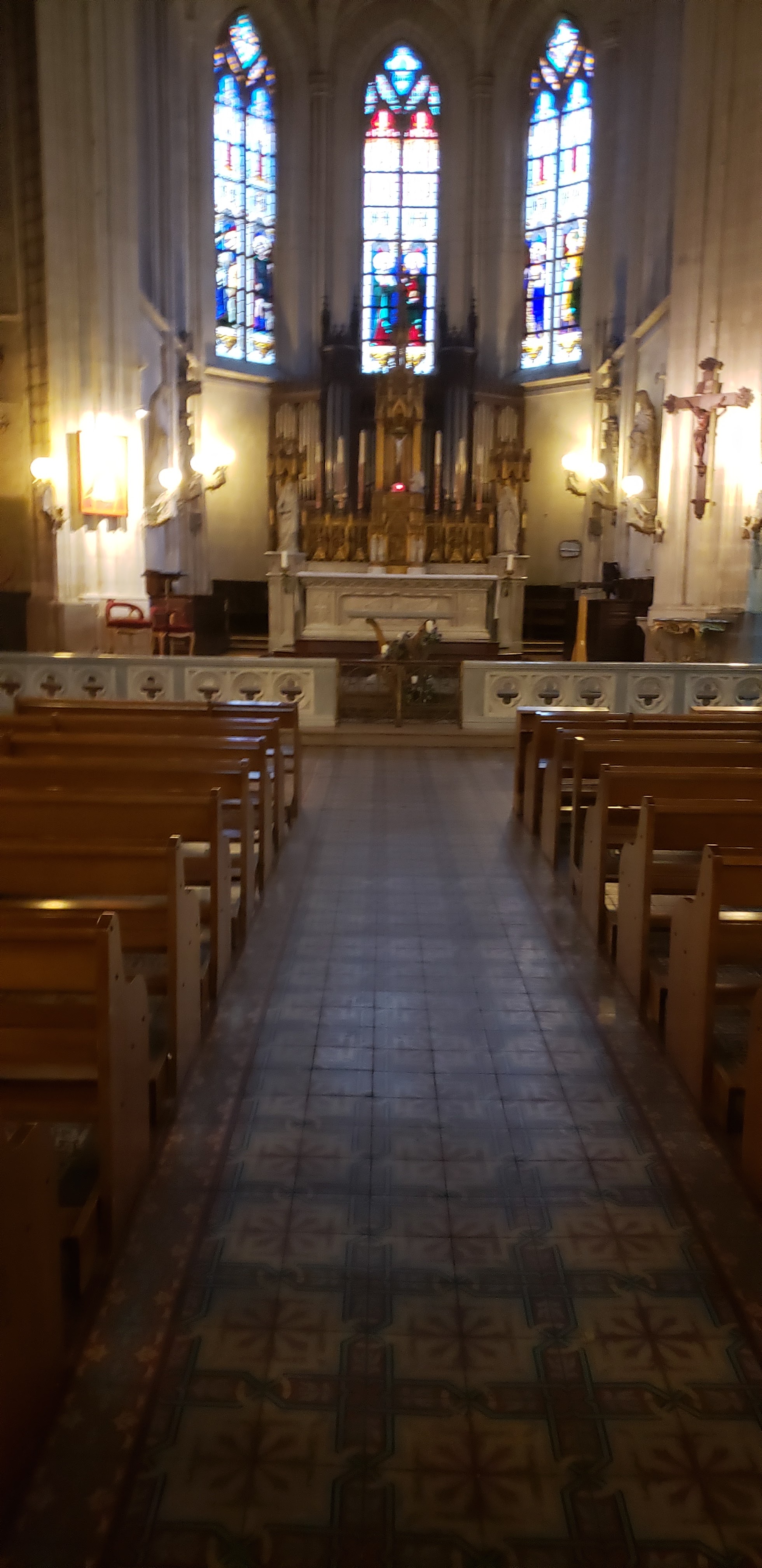 J'ai voulu le visiter parce que j'étais attiré par les spectaculaires anges claironnant, placés autour de la coupole du clocher. L'intérieur, peut-être parce qu'il pleuvait, je l'ai trouvé sombre, sombre mais par contre j'étais heureux d'admirer les splendides 8 fenêtres gothiques avec de beaux vitraux où le bleu prédomine. Je ne sais pas pourquoi, étant donné que Pâques est passée, mais le Saint-Sacrement était exposé au-dessus du maître-autel.