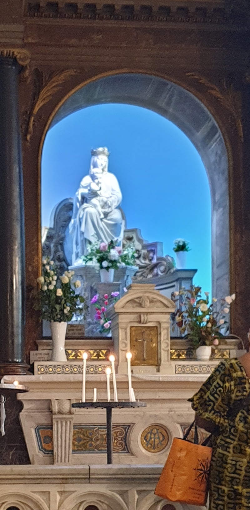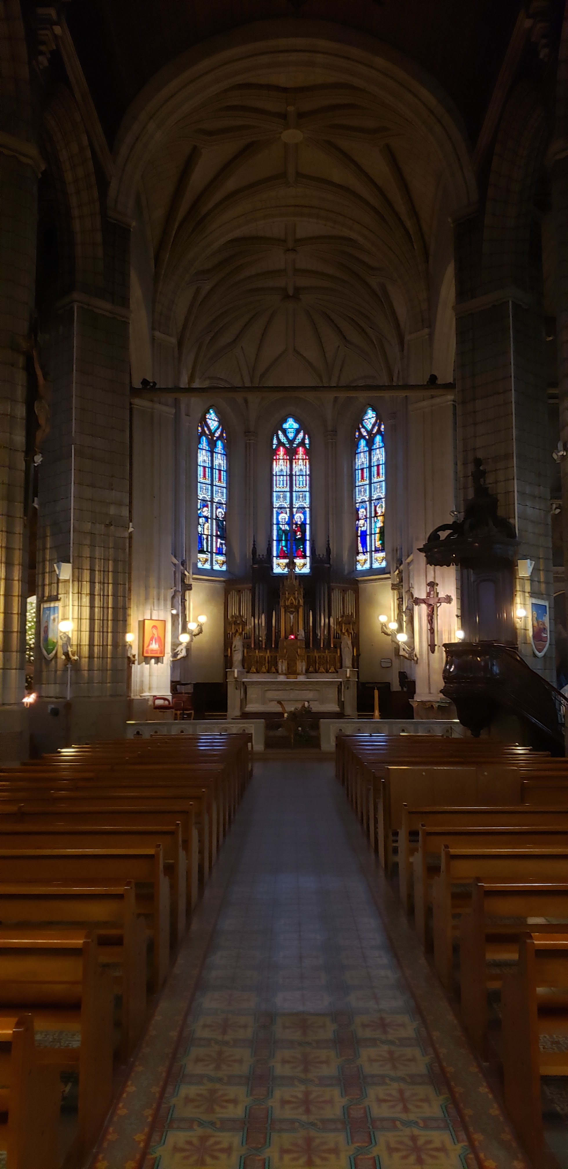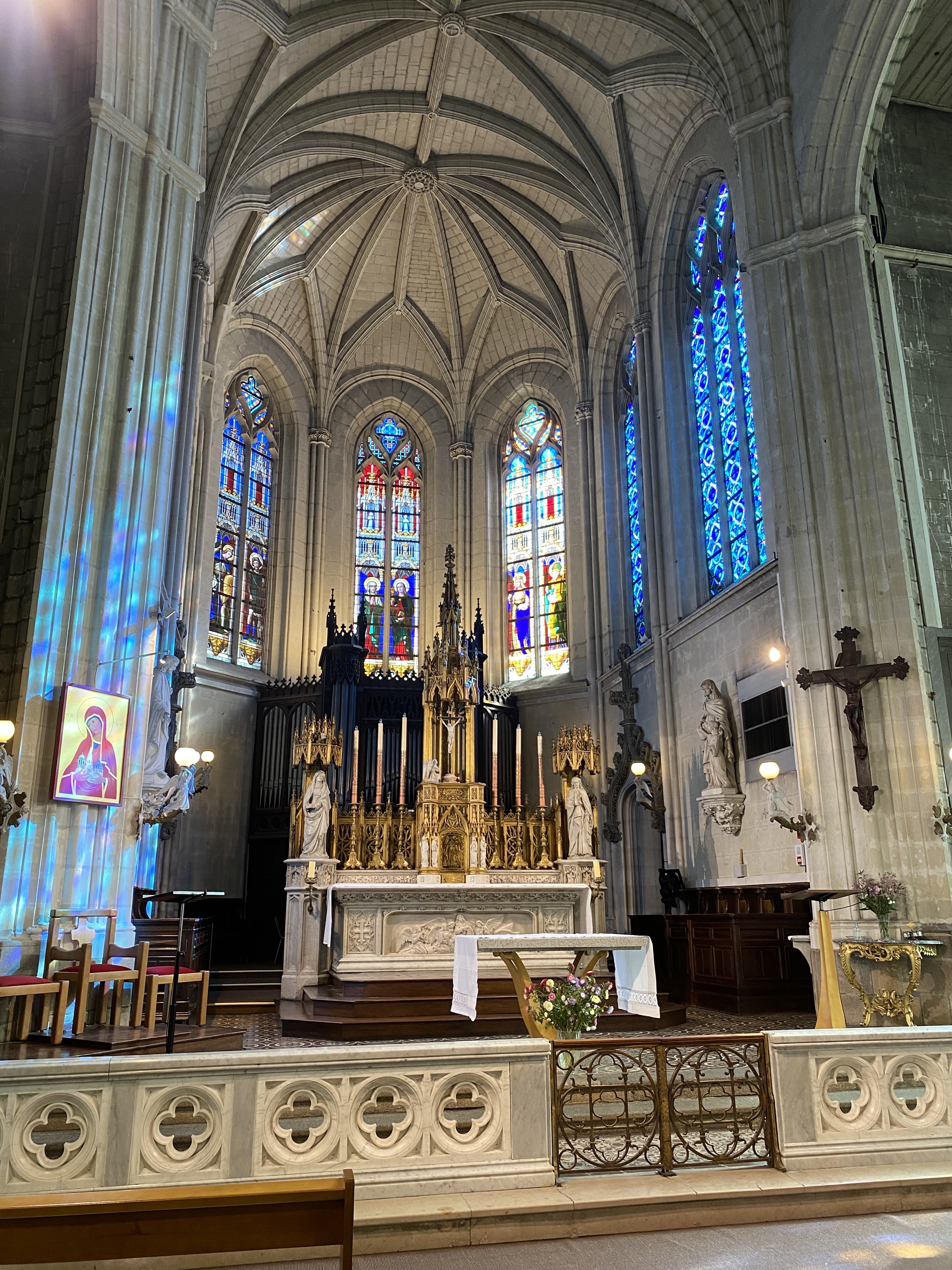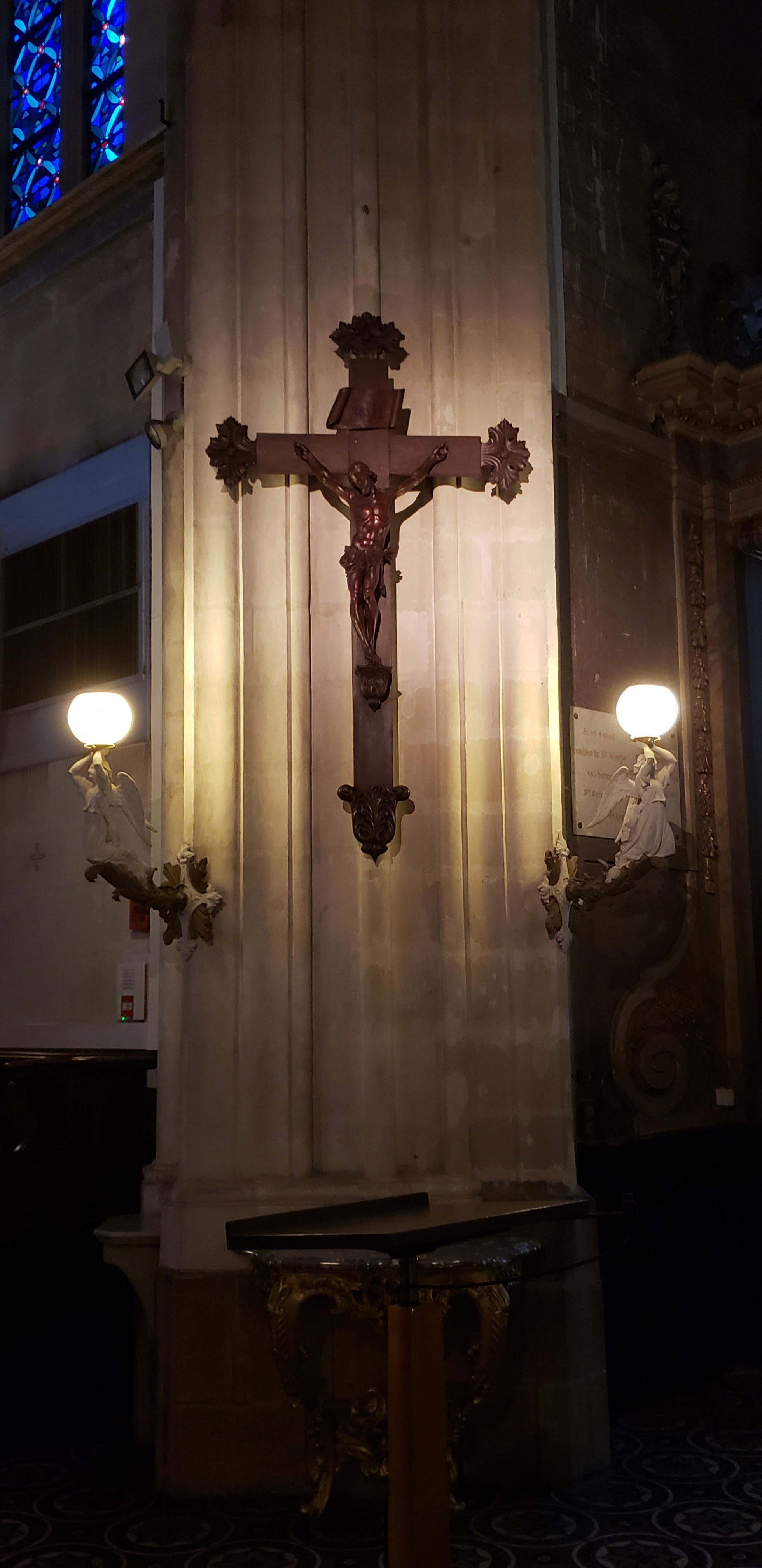 J'ai voulu le visiter parce que j'étais attiré par les spectaculaires anges claironnant, placés autour de la coupole du clocher. L'intérieur, peut-être parce qu'il pleuvait, je l'ai trouvé sombre, sombre mais par contre j'étais heureux d'admirer les splendides 8 fenêtres gothiques avec de beaux vitraux où le bleu prédomine. Je ne sais pas pourquoi, étant donné que Pâques est passée, mais le Saint-Sacrement était exposé au-dessus du maître-autel.