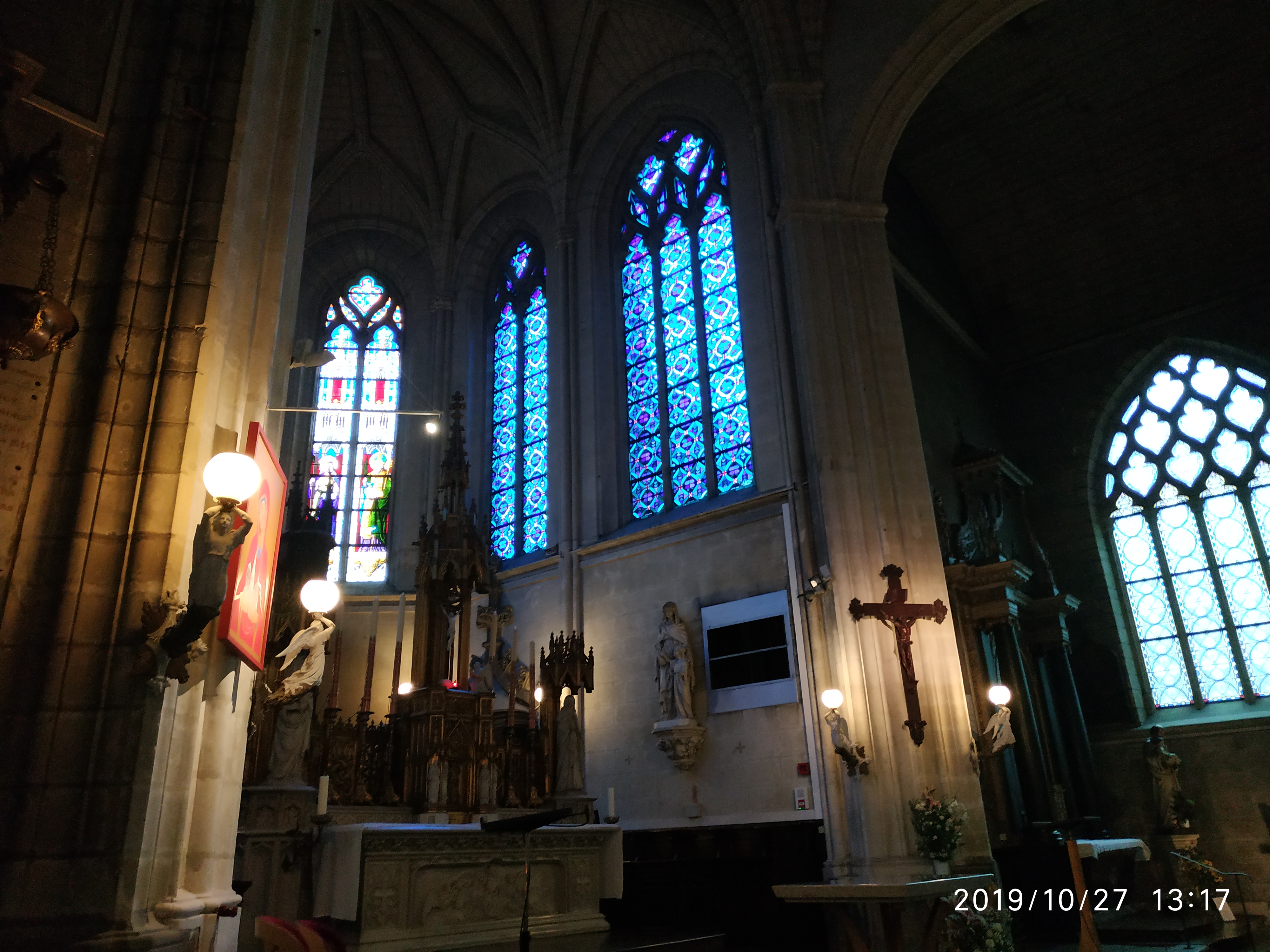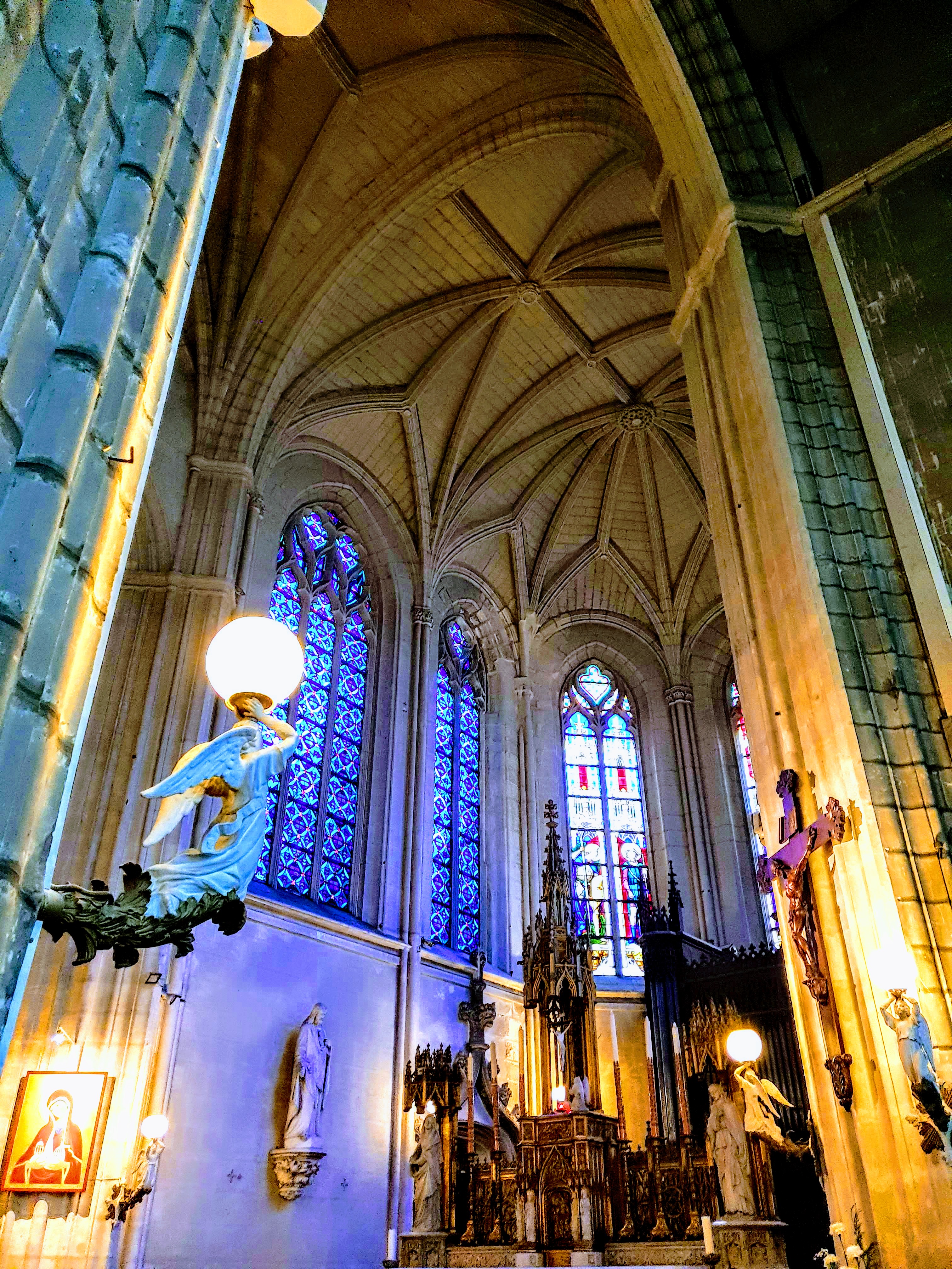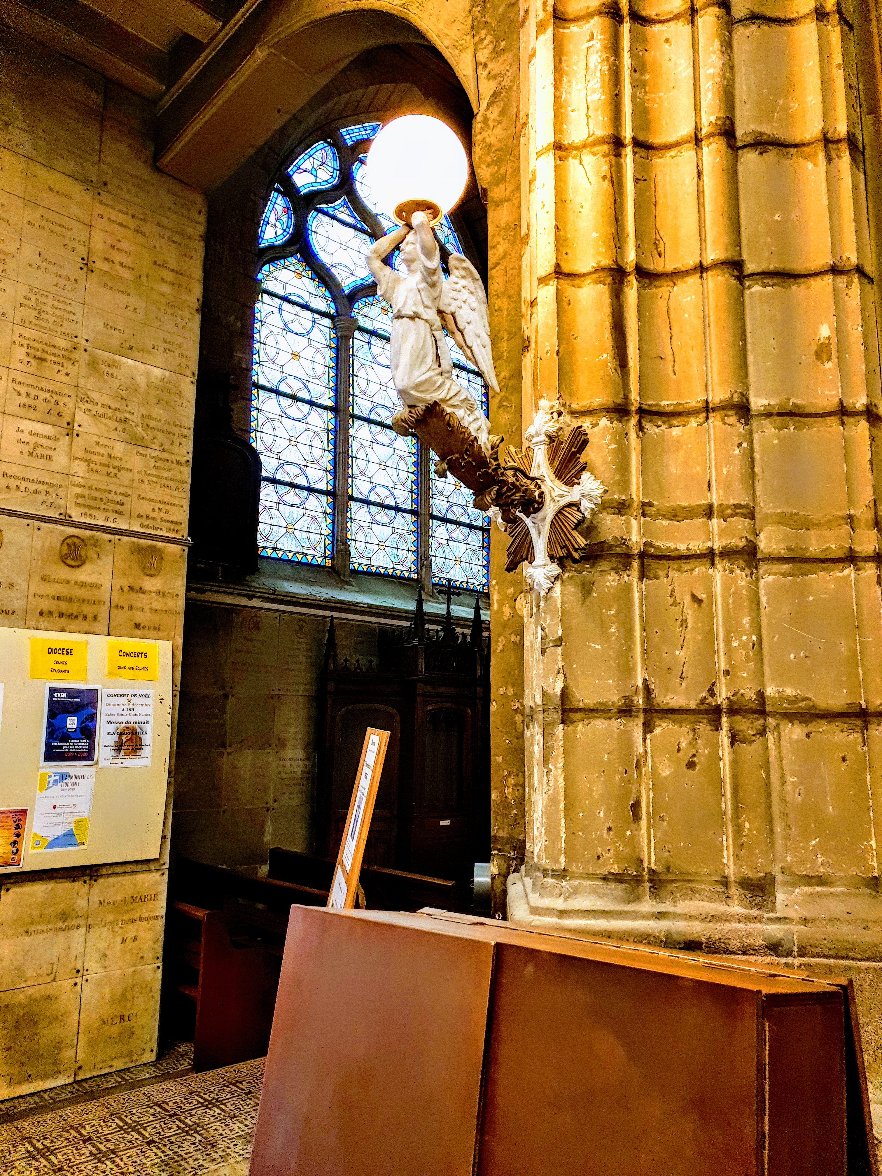 Ce samedi, j'avais le repas de Noël dr Voir ensemble, une association chrétienne, la messe se passe à l'église Sainte Croix. Cette église est l'une des plus belles de Nantes. Ses vitraux, ses statues, son ambiance propice à la méditation en font un endroit de paix. Entrez et assistez à un office. Ces moments de grâce sont trop rares dans une vie.