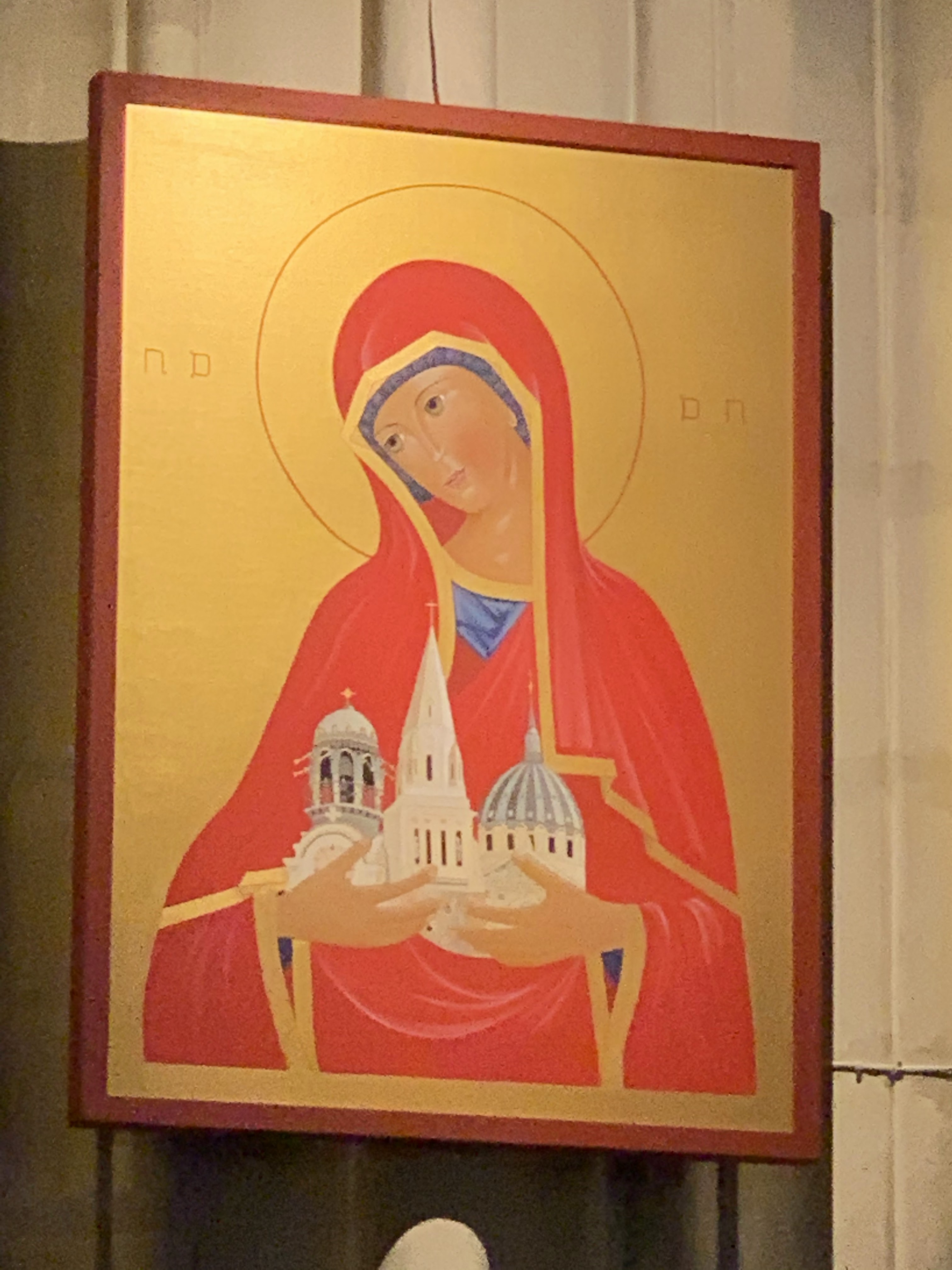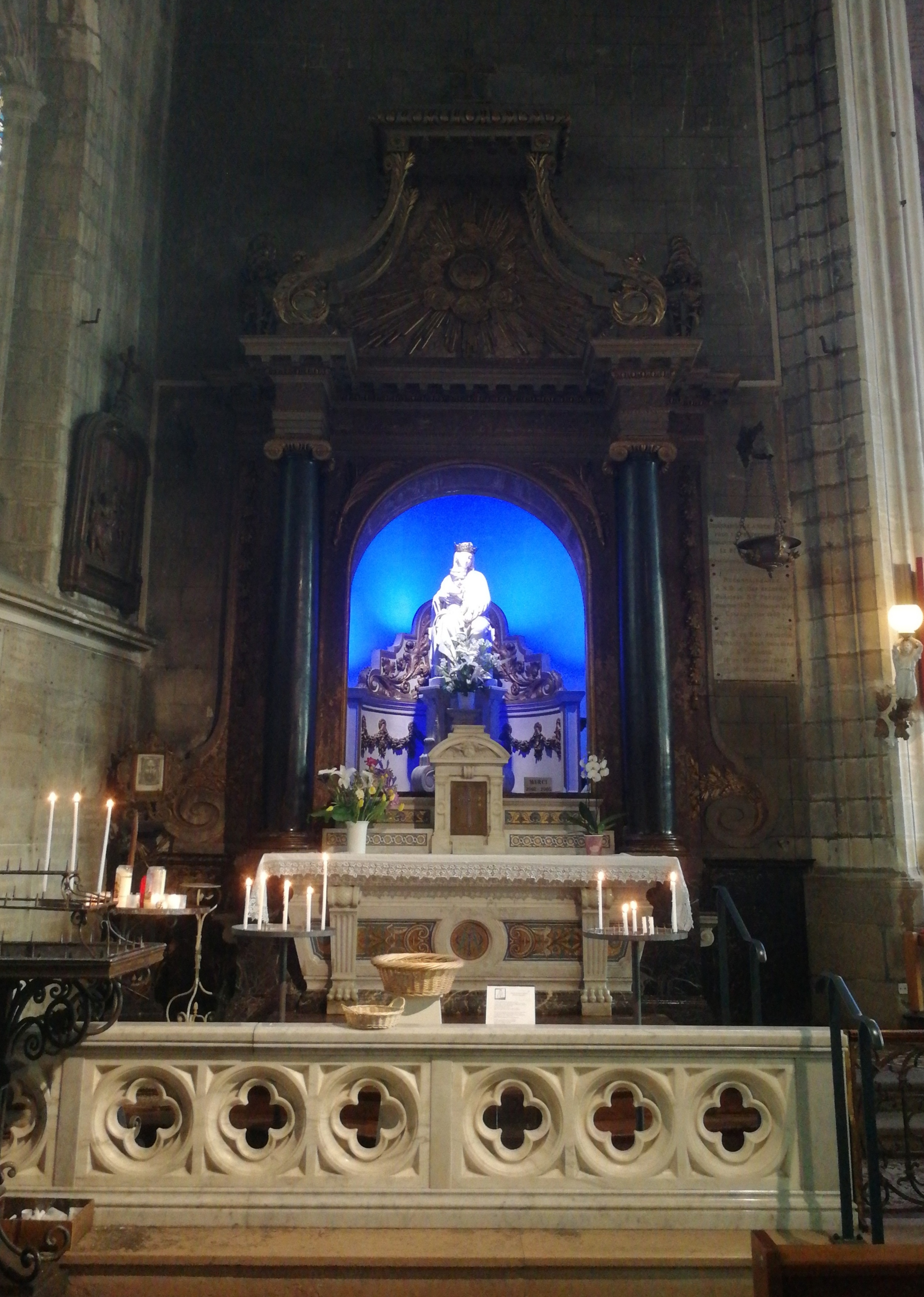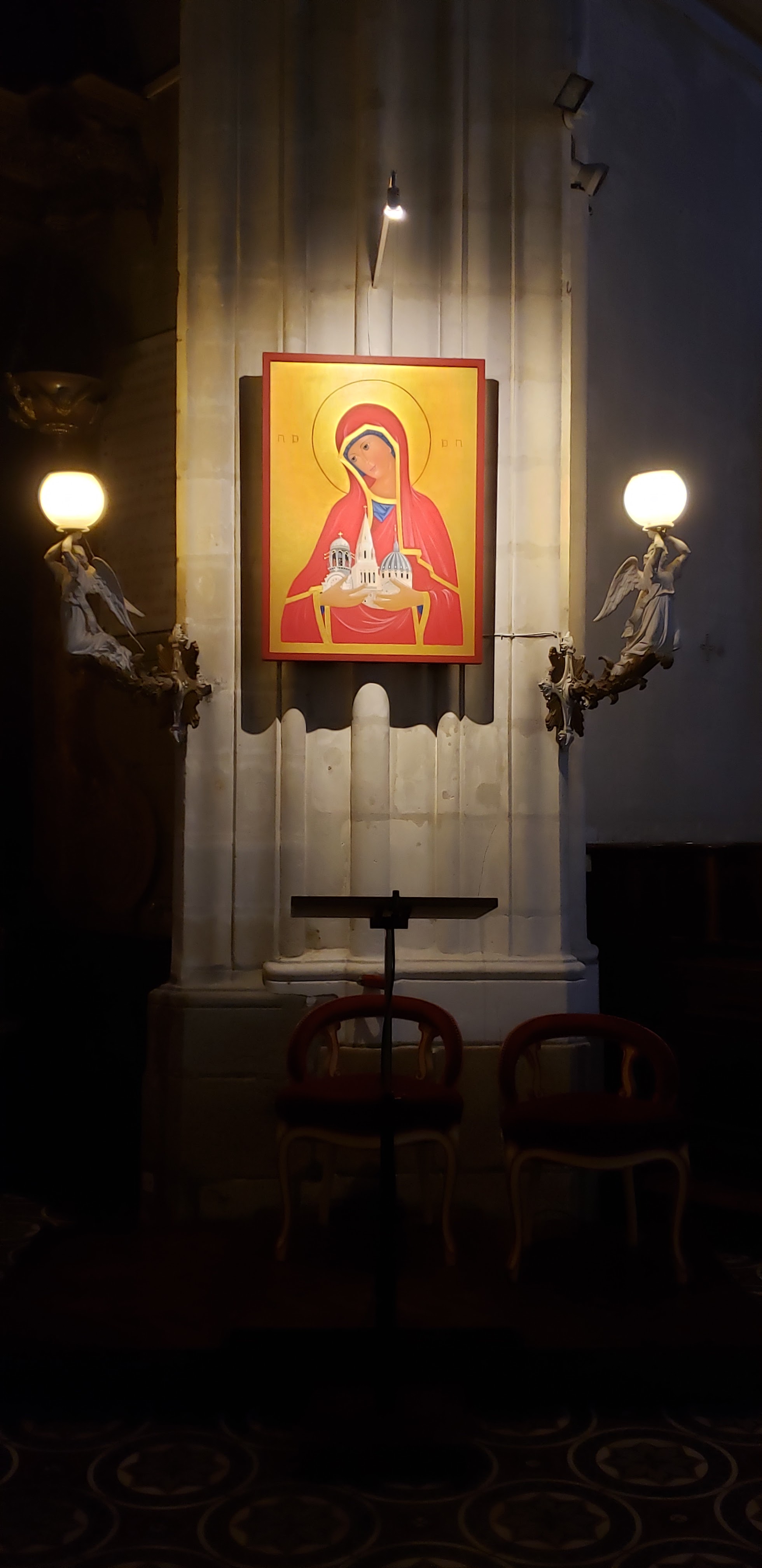 Belle petite église en plein centre ville. Très belle statue de la vierge et l'enfant sur un fond bleu lumineux !!!