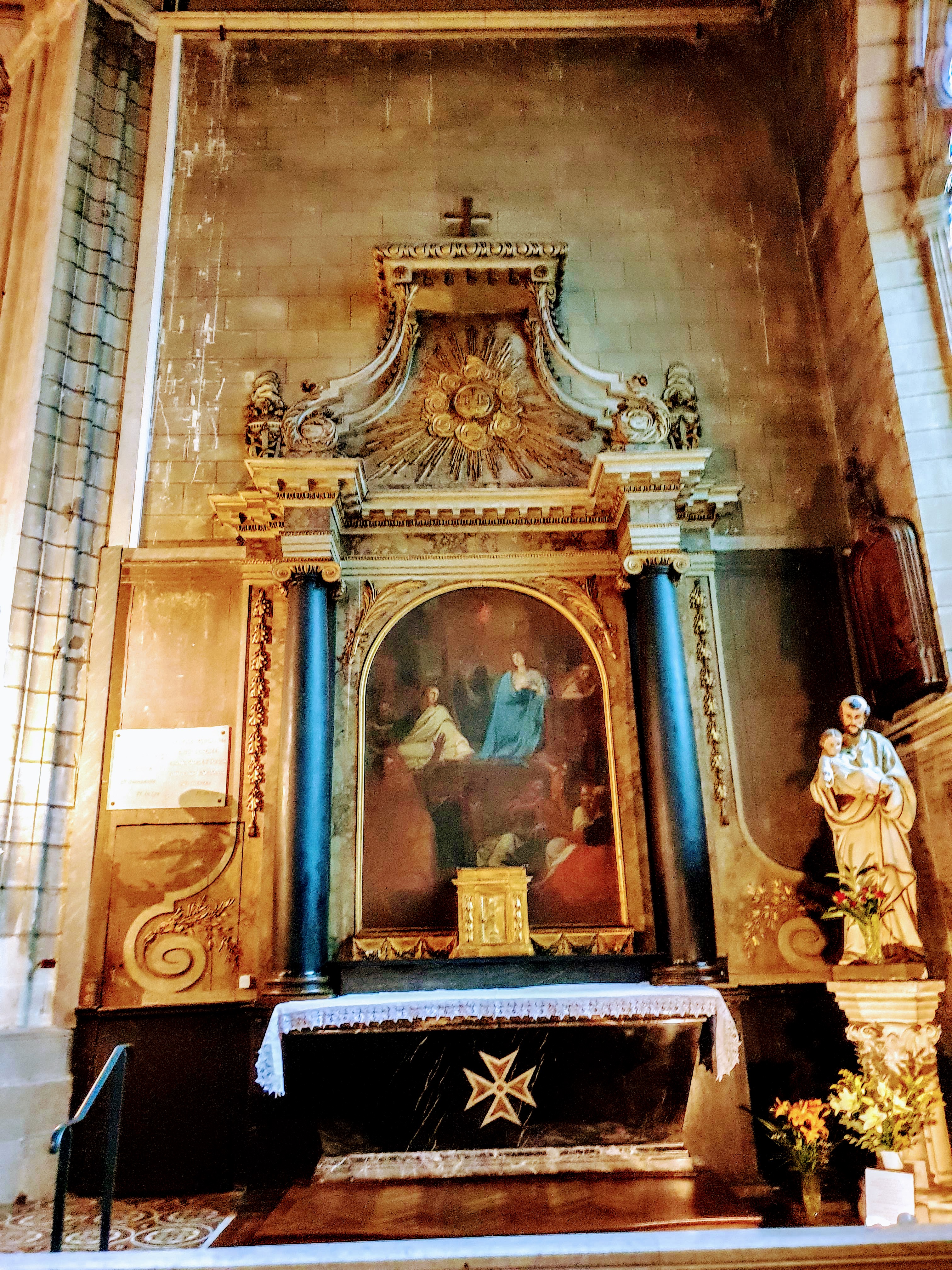 Quelle curieuse juxtaposition de styles !... La belle façade classique surmontée d'un grotesque beffroi néo-quelque-chose débouche sur une nef gothique du 17ème siècle suivie d'un choeur néogothique du 19ème...