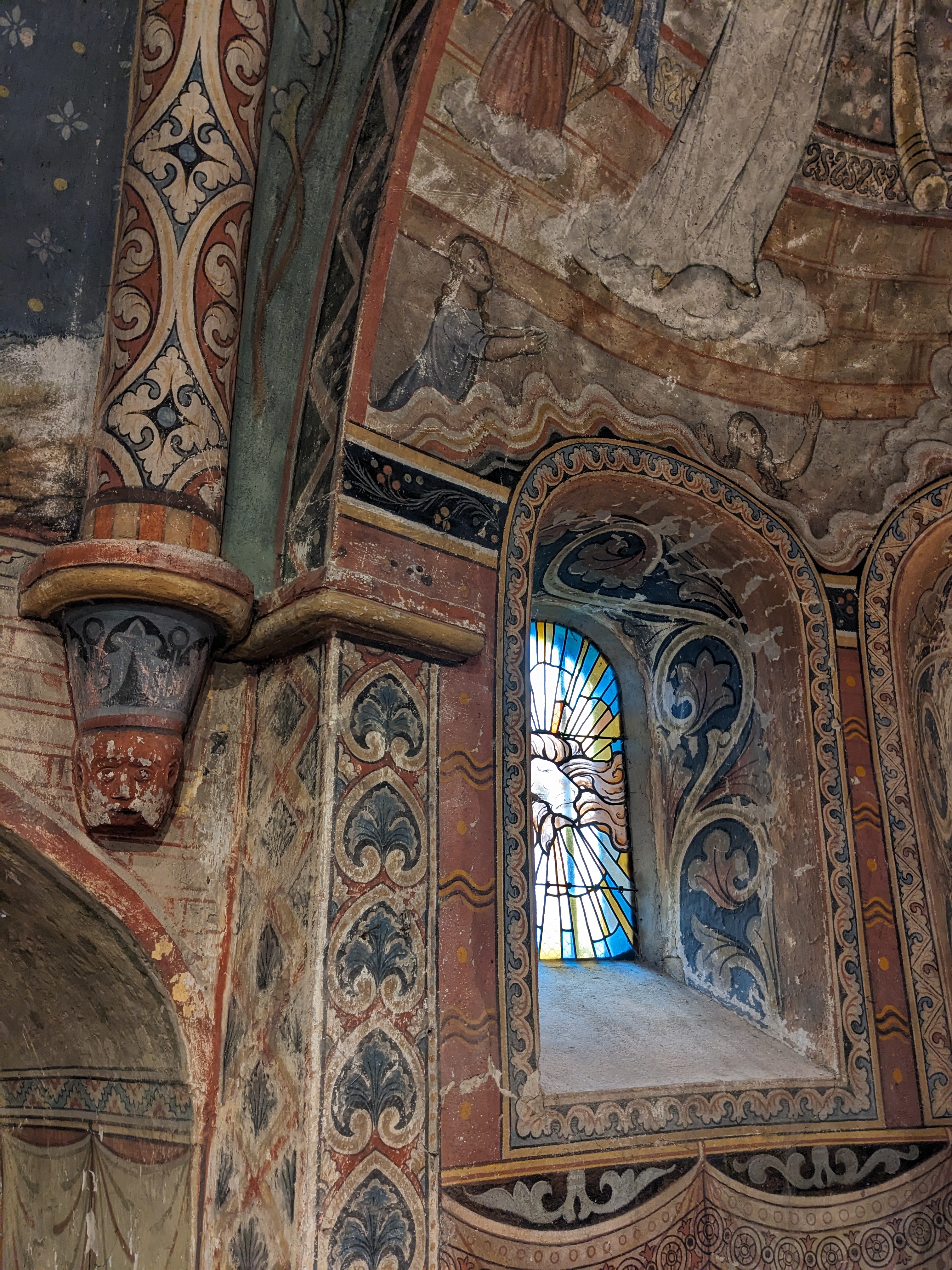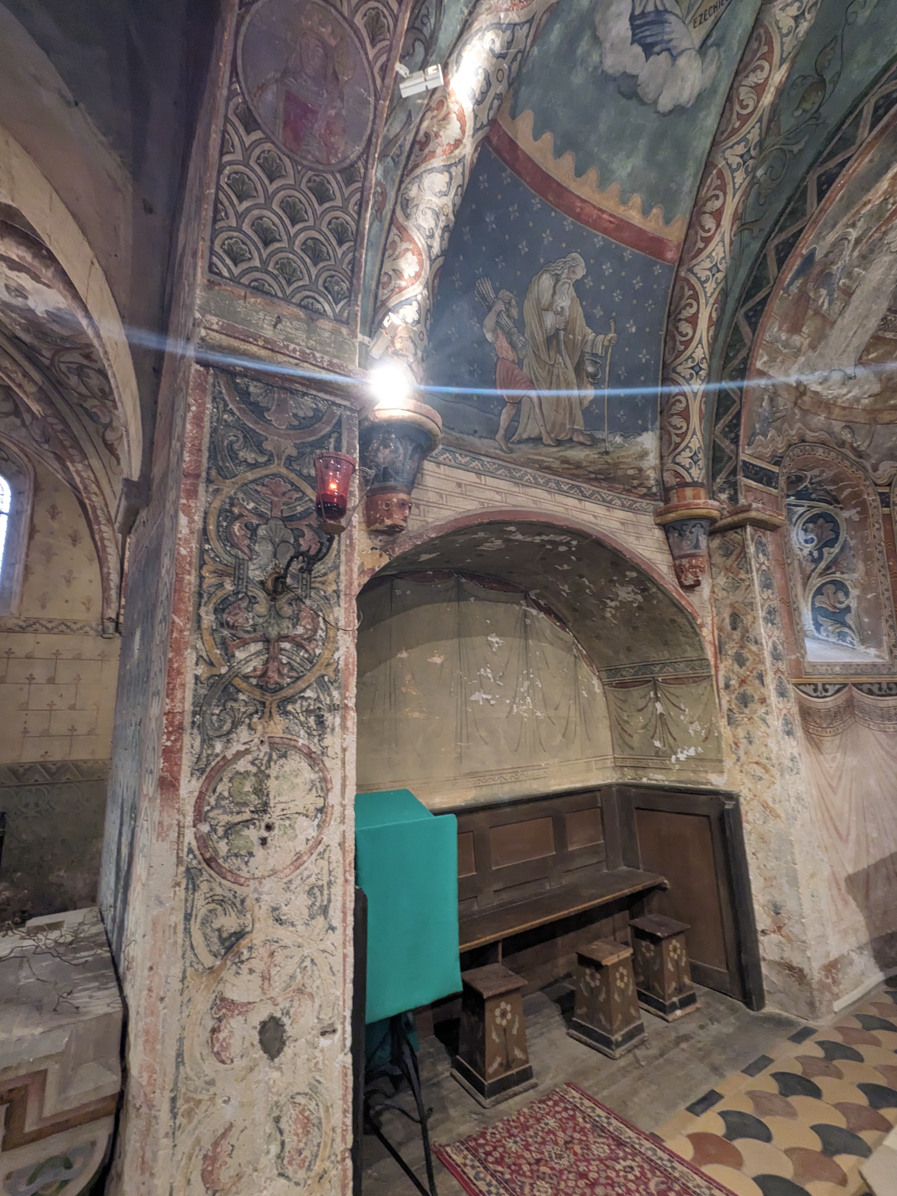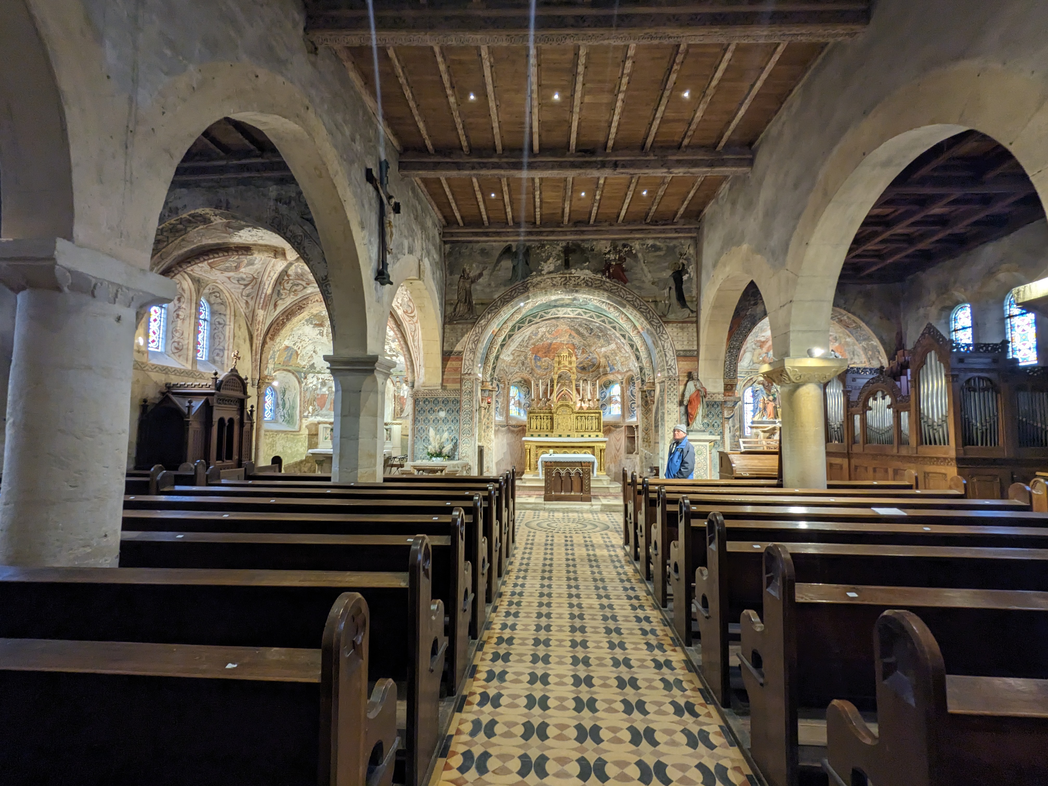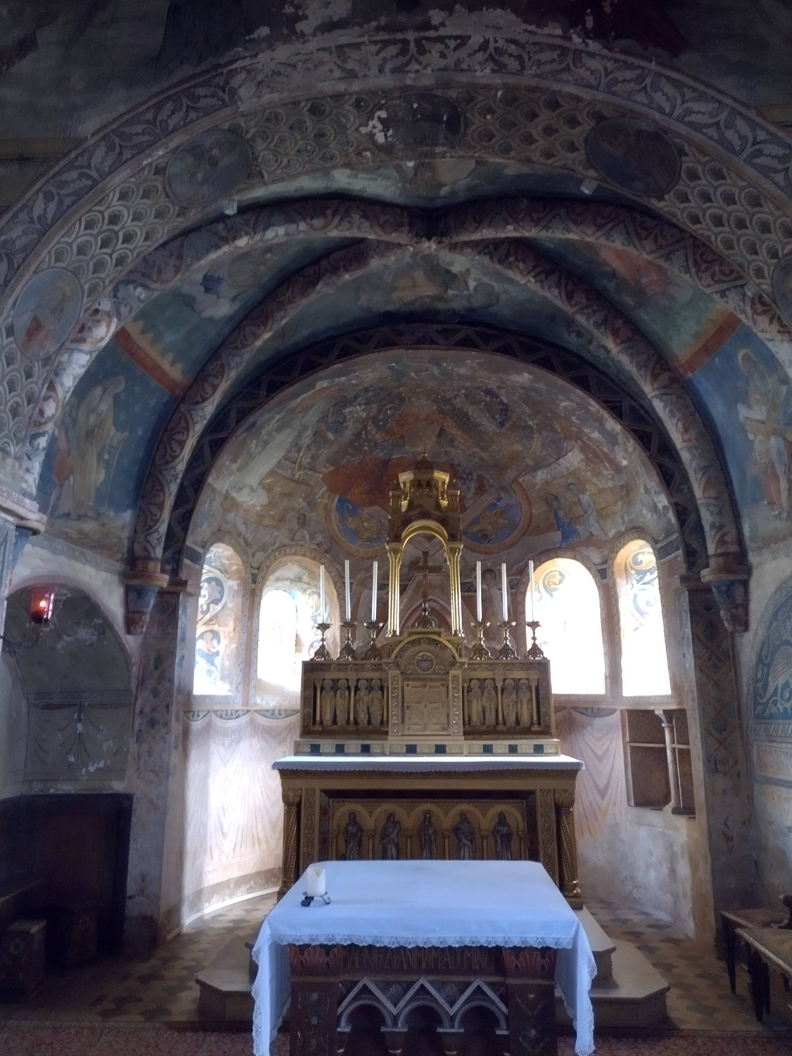 Très belle église fortifiée avec une jolie tour ronde. Les fresques du chœur et des absidioles sont superbes même si ce sont des restaurations du dix neuvième siècle. Elle donne à l'ensemble un petit air byzantin qui ne manque pas de charme. Un grand merci à la mairie qui m'a ouvert l'église pour des photos.