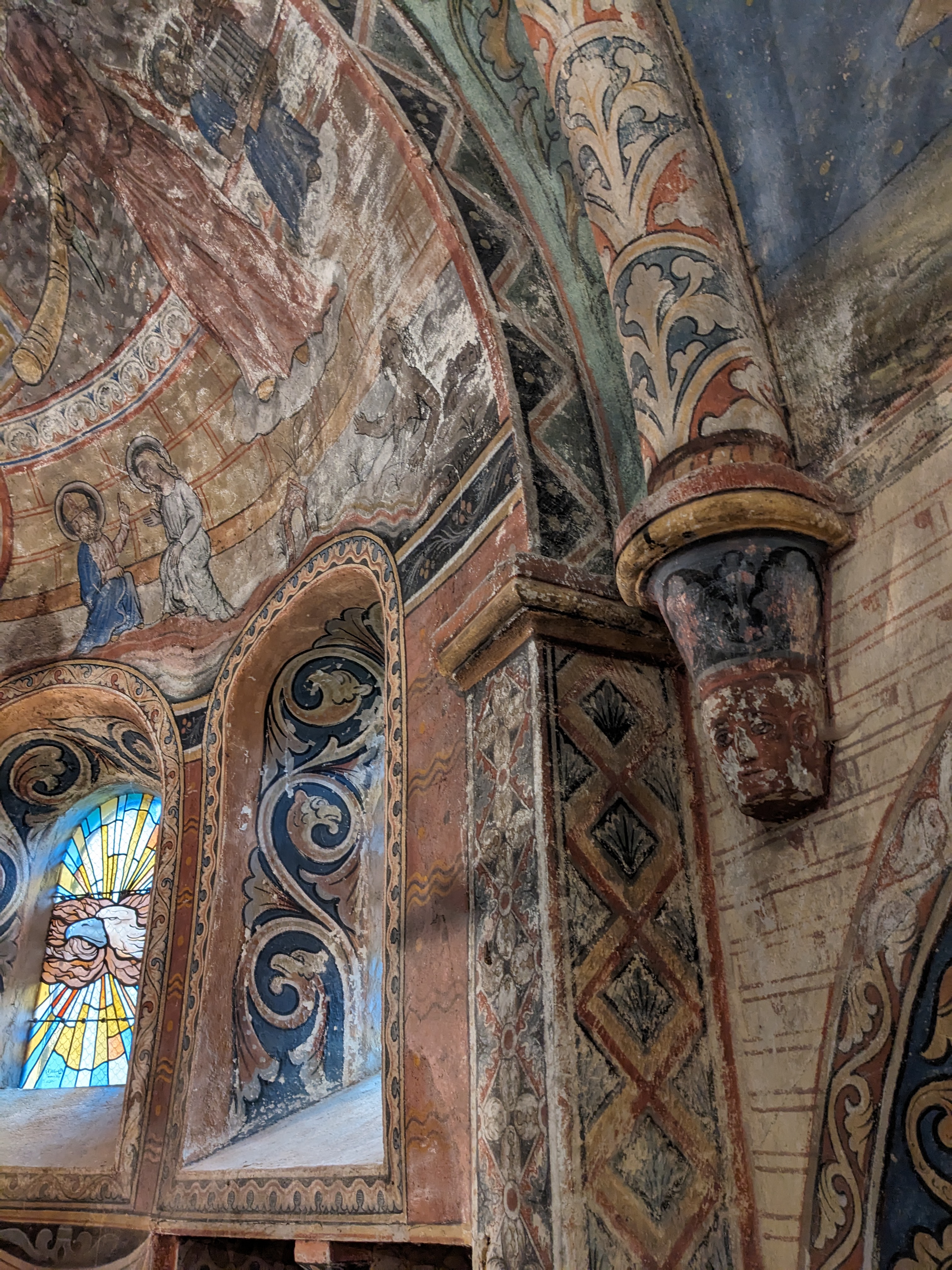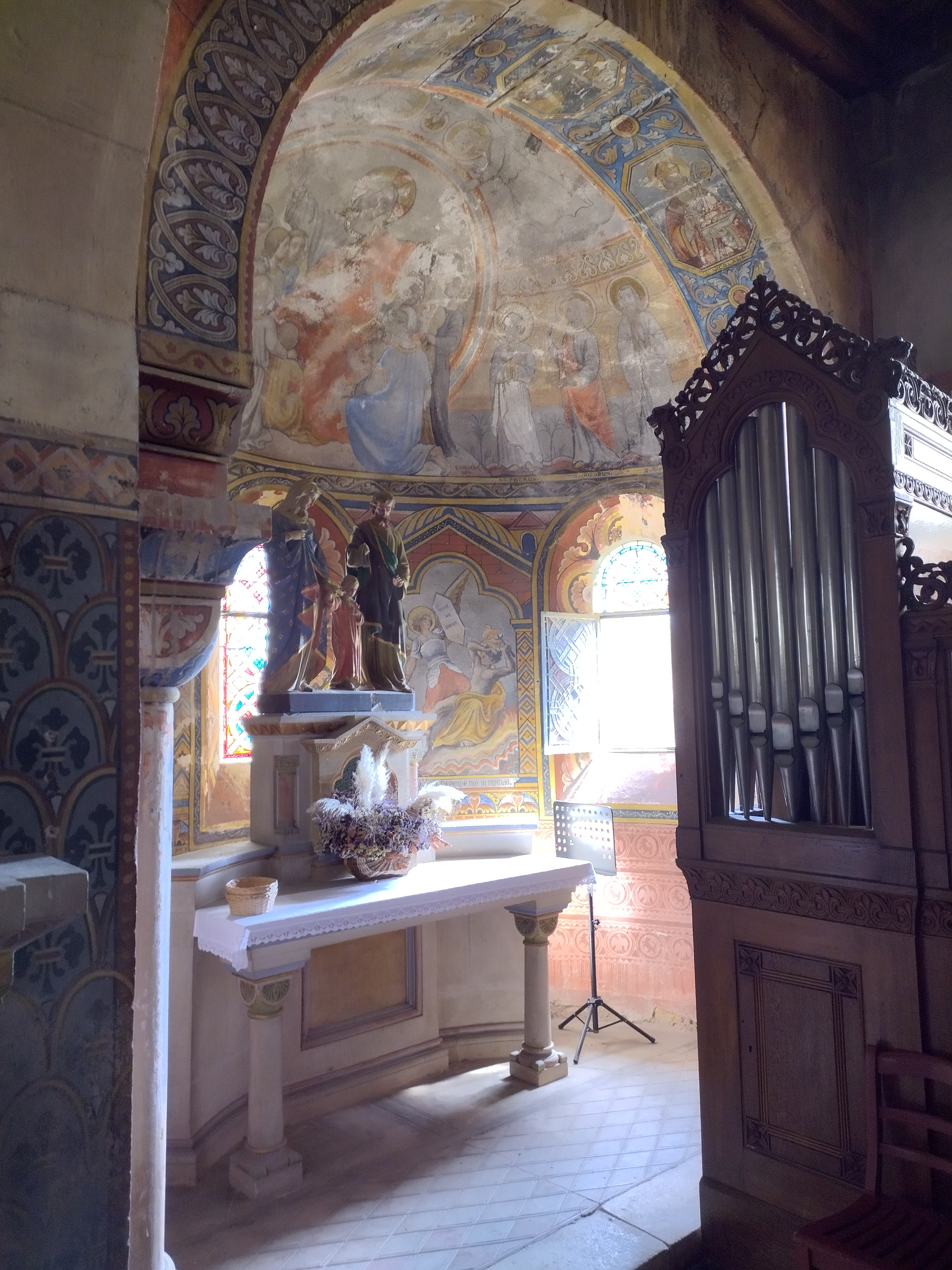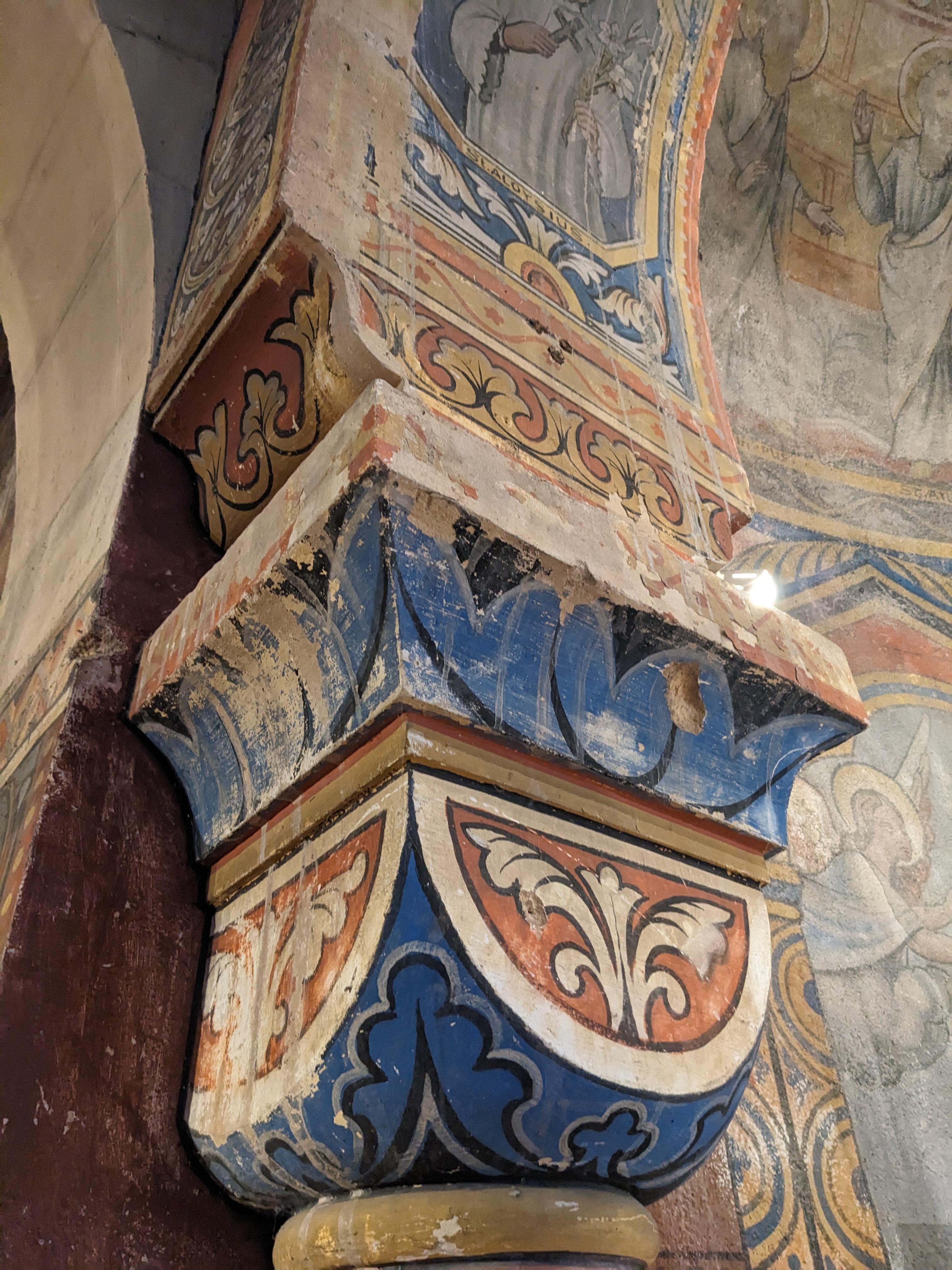 Très belle église fortifiée avec une jolie tour ronde. Les fresques du chœur et des absidioles sont superbes même si ce sont des restaurations du dix neuvième siècle. Elle donne à l'ensemble un petit air byzantin qui ne manque pas de charme. Un grand merci à la mairie qui m'a ouvert l'église pour des photos.