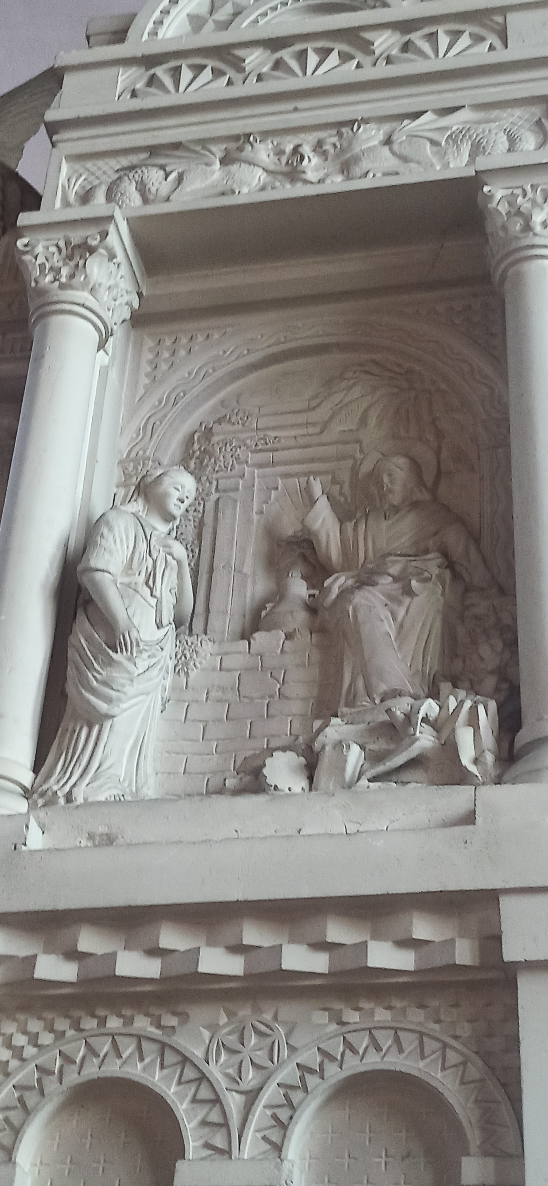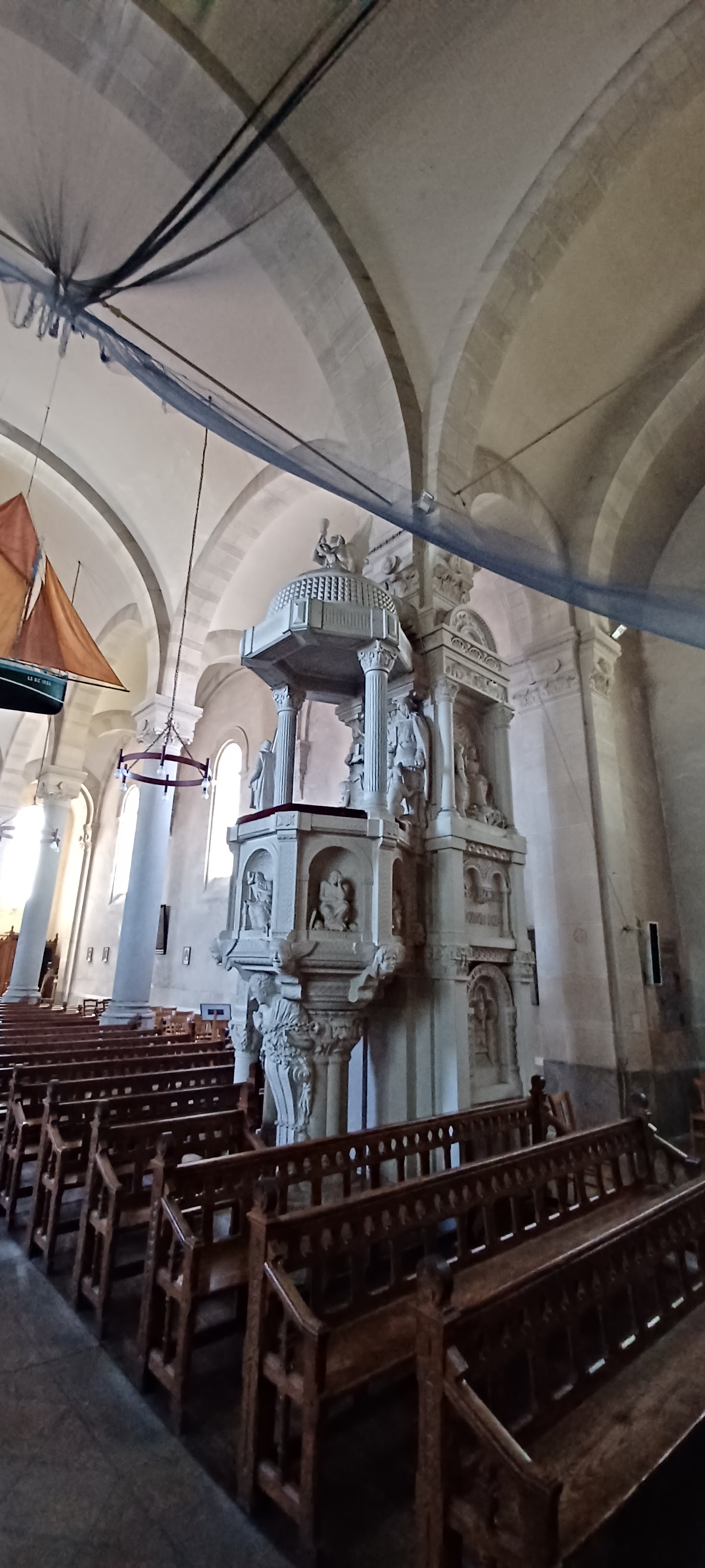 Belle église avec une belle luminosité intérieure. Les beaux vitraux et les gravures sur la chaire à prêcher en pierre sont époustouflantes ...il y a pleins de détails à observer, tous différents avec des phrases latines : de quoi occuper les enfants !