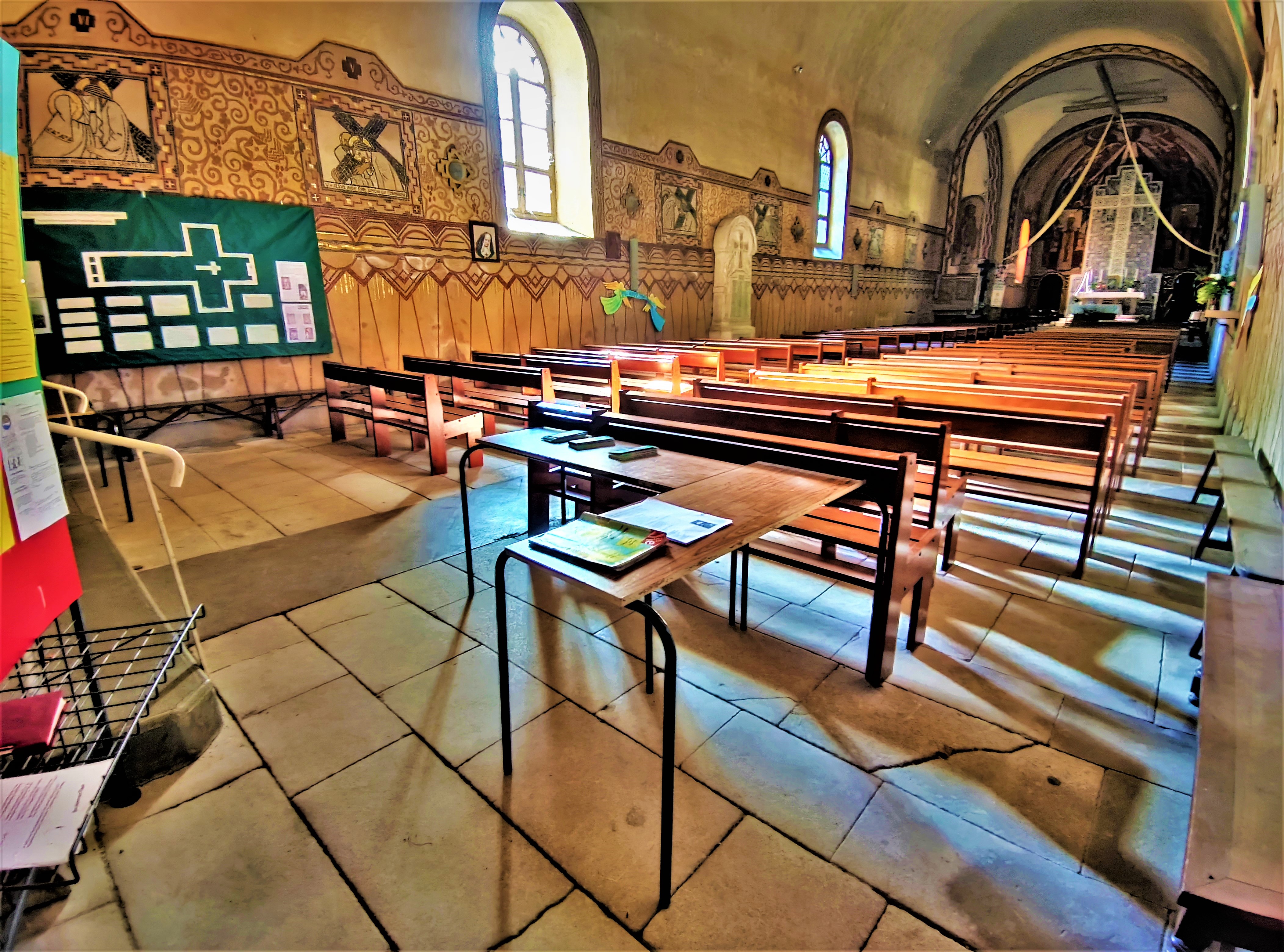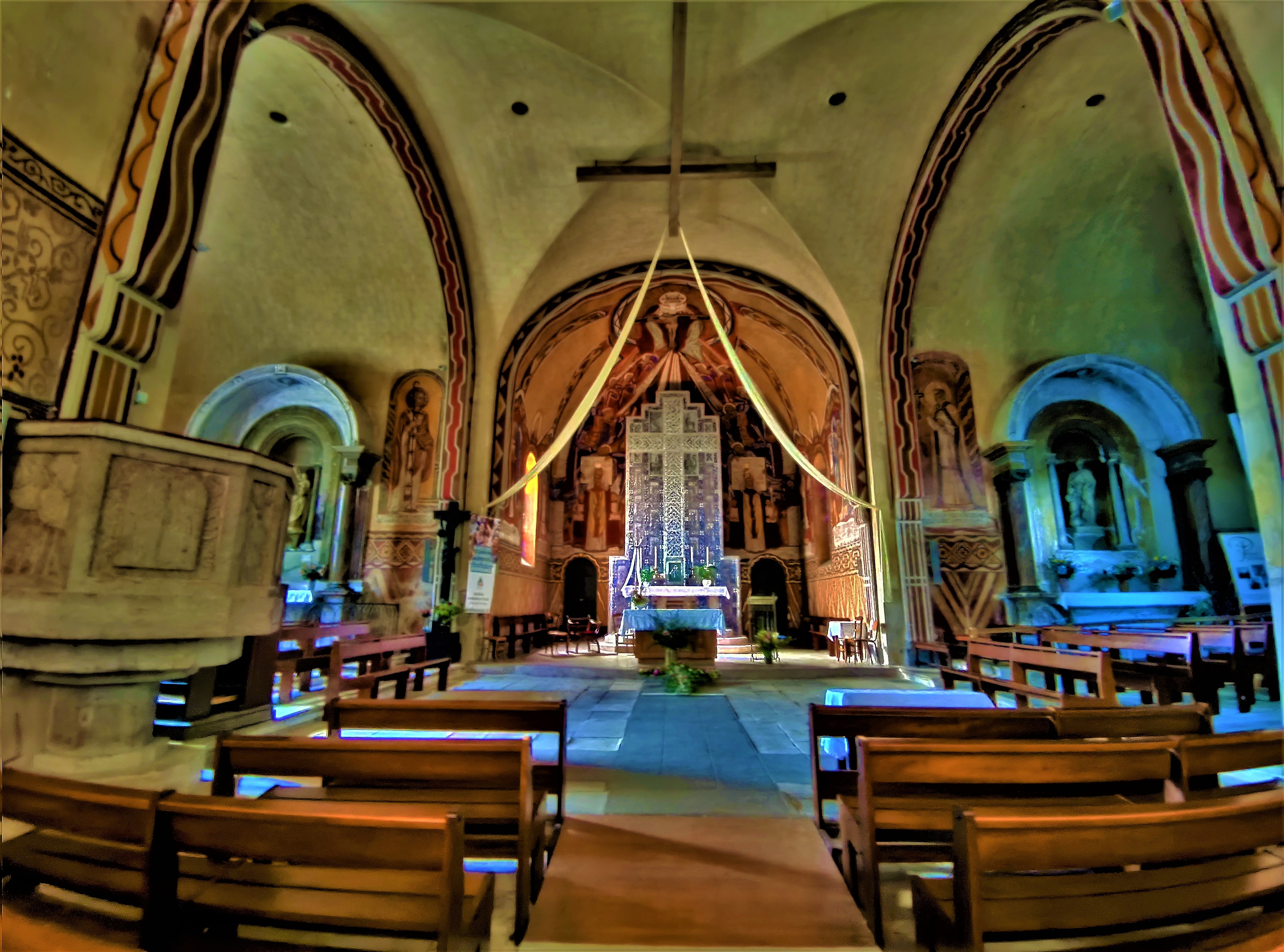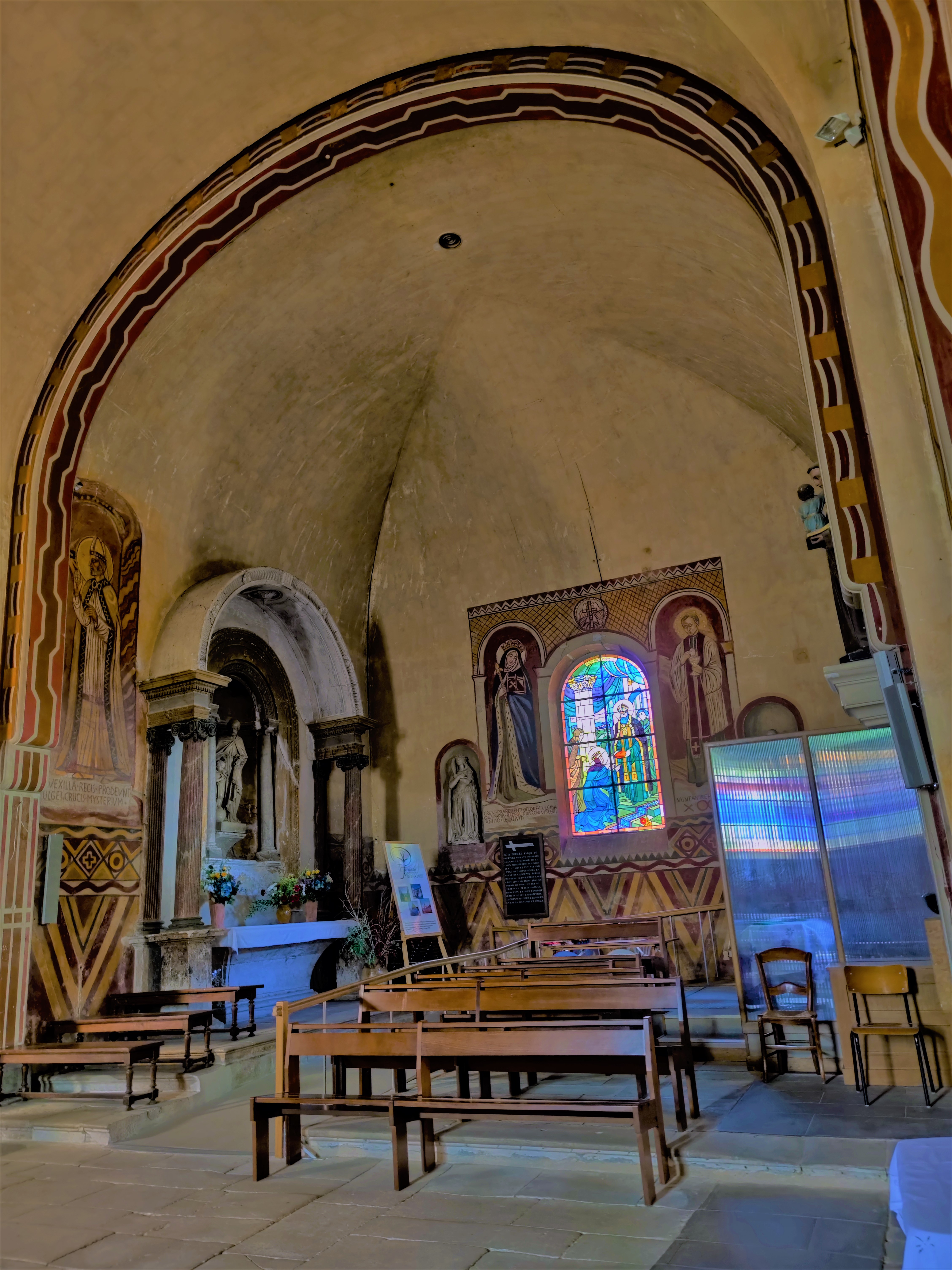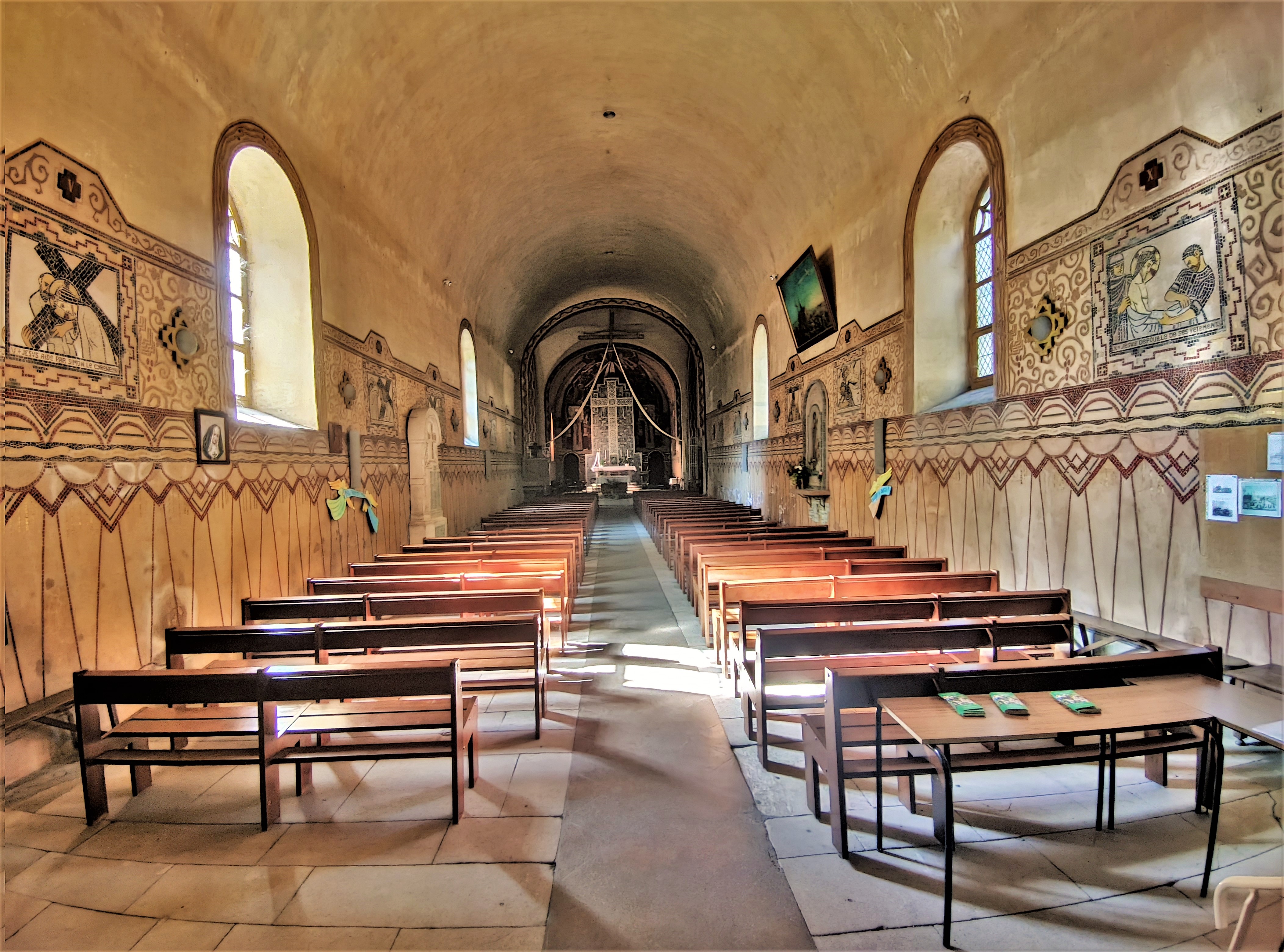 Surprise par sa decoration art déco en mosaïque, église classée monument historique , à côté de Poitiers