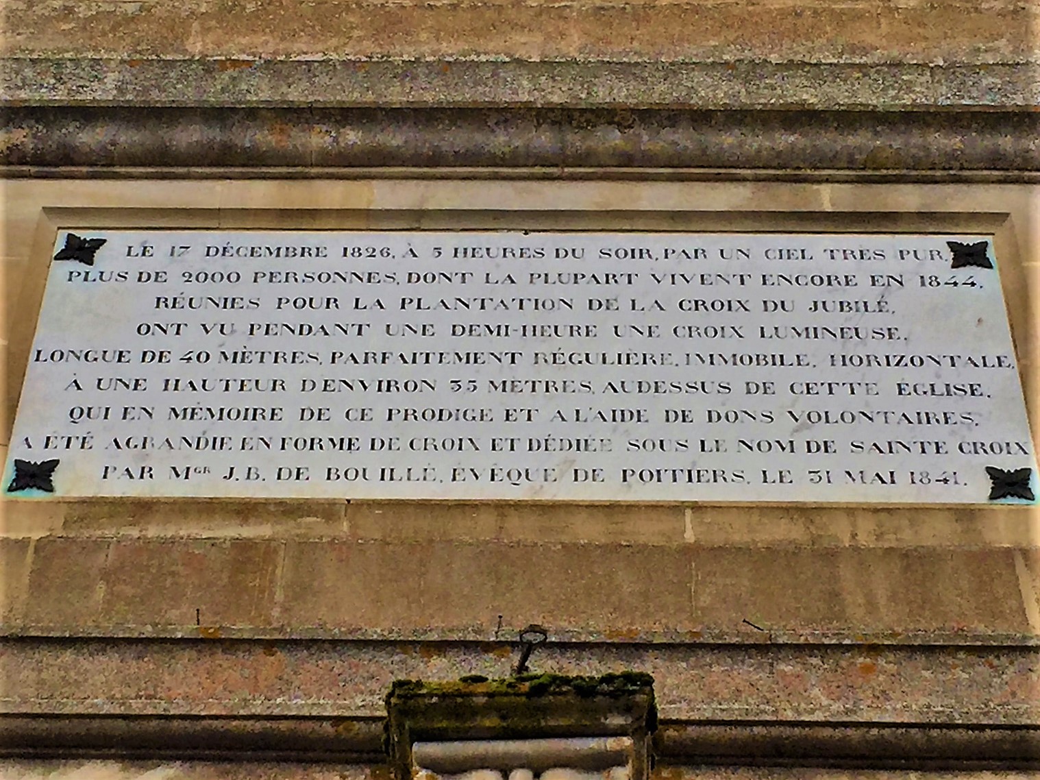 Des merveilles protégées par les MH dissimulées dans une église extérieurement peu avenante. L'église Sainte-Croix de Migné-Auxances, derrière une architecture sobre, voir banale et dépouillée, abrite de magnifiques œuvres d'art : des peintures-fresques de Marie Baranger, mais aussi de très beaux vitraux, un retable monumental et un chemin de croix en céramique, réalisation de Jean Gaudin. Depuis sa reconstruction au XIX cette église est désorientée au sens propre du terme, son cœur est à l'ouest, son portail à l'est ; ceci pour respecter le sens de l'apparition du 17 décembre 1826 d'une croix lumineuse et couchée dans le ciel, alors que l'on dressait une croix de mission sur la place publique. J'ai beaucoup aimé cette découverte loin des guides et des circuits touristiques. Ce monument est protégé par les Monuments Historiques depuis 2014 (inscription) comme l'église Sainte-Thérèse des Rocs de Poitiers, pour les fresques de Marie Baranger qu'elles abritent.