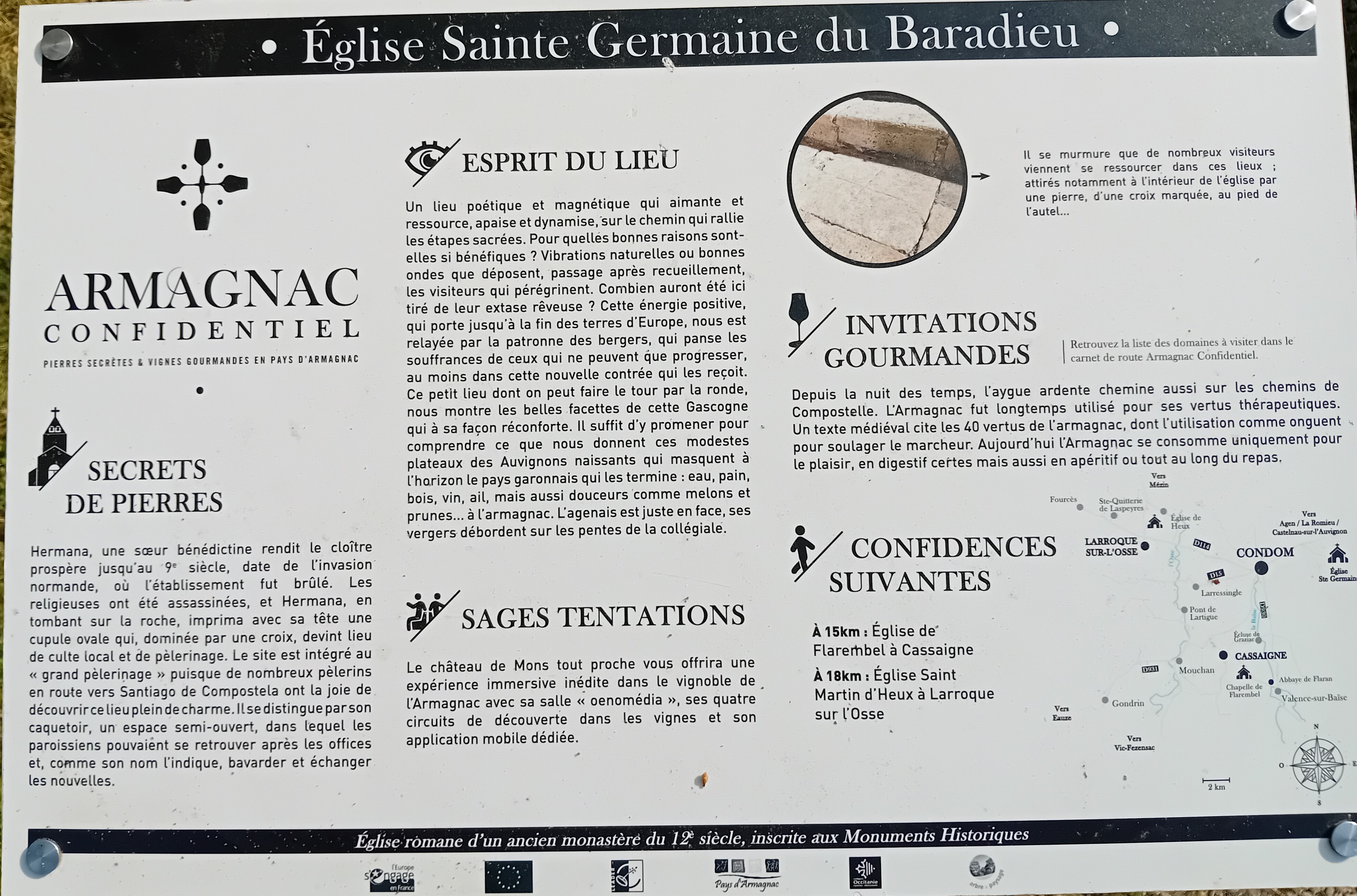 L'église Sainte-Germaine du Baradieu, située près de Condom dans le Gers, est ouverte toute l'année. Église romane d'un ancien monastère du 12e siècle, elle est inscrite aux Monuments Historiques. Le site est intégré au « grand pèlerinage » puisque de nombreux pèlerins en route vers Saint Jacques de Compostelle ont la joie de découvrir ce lieu plein de charme. Ce lieu, situé dans les collines gasconnes, est très reposant et vous vous sentirez extrêmement détendu. Les paysages alentours sont magnifiques. Ce lieu bénéficie de toilettes publiques.