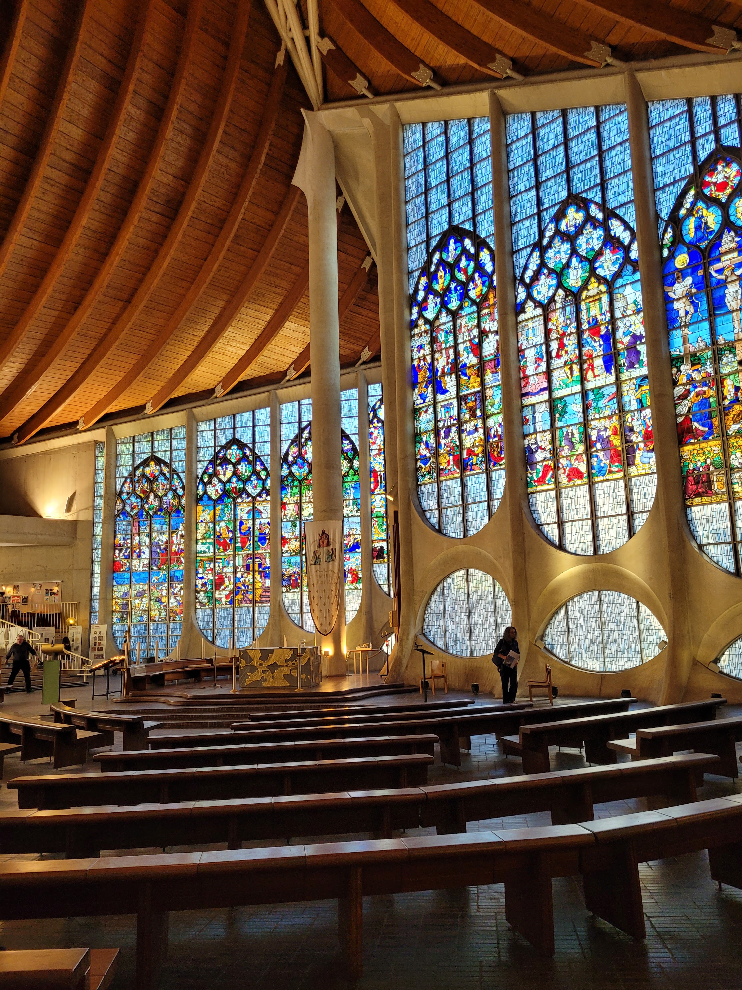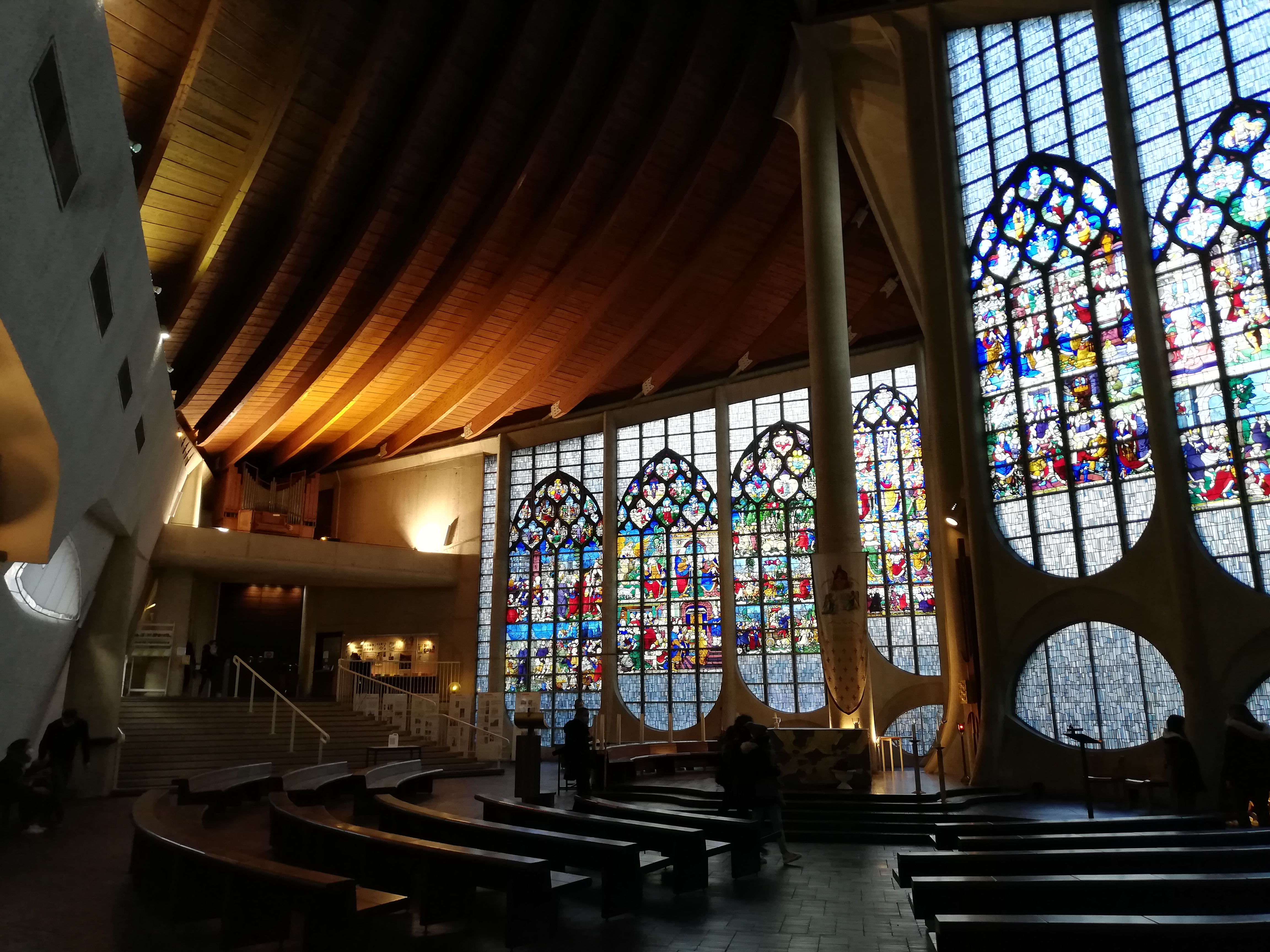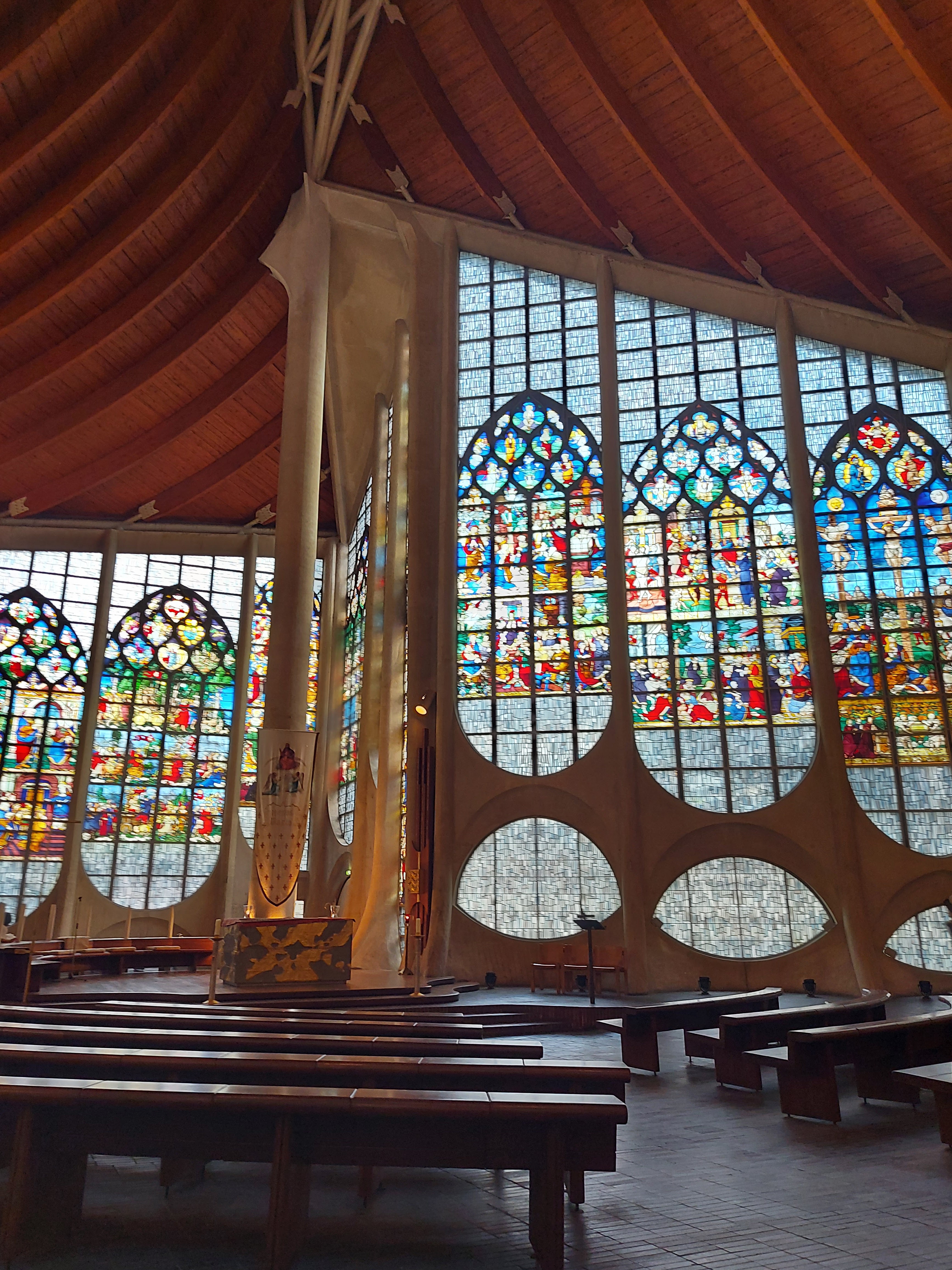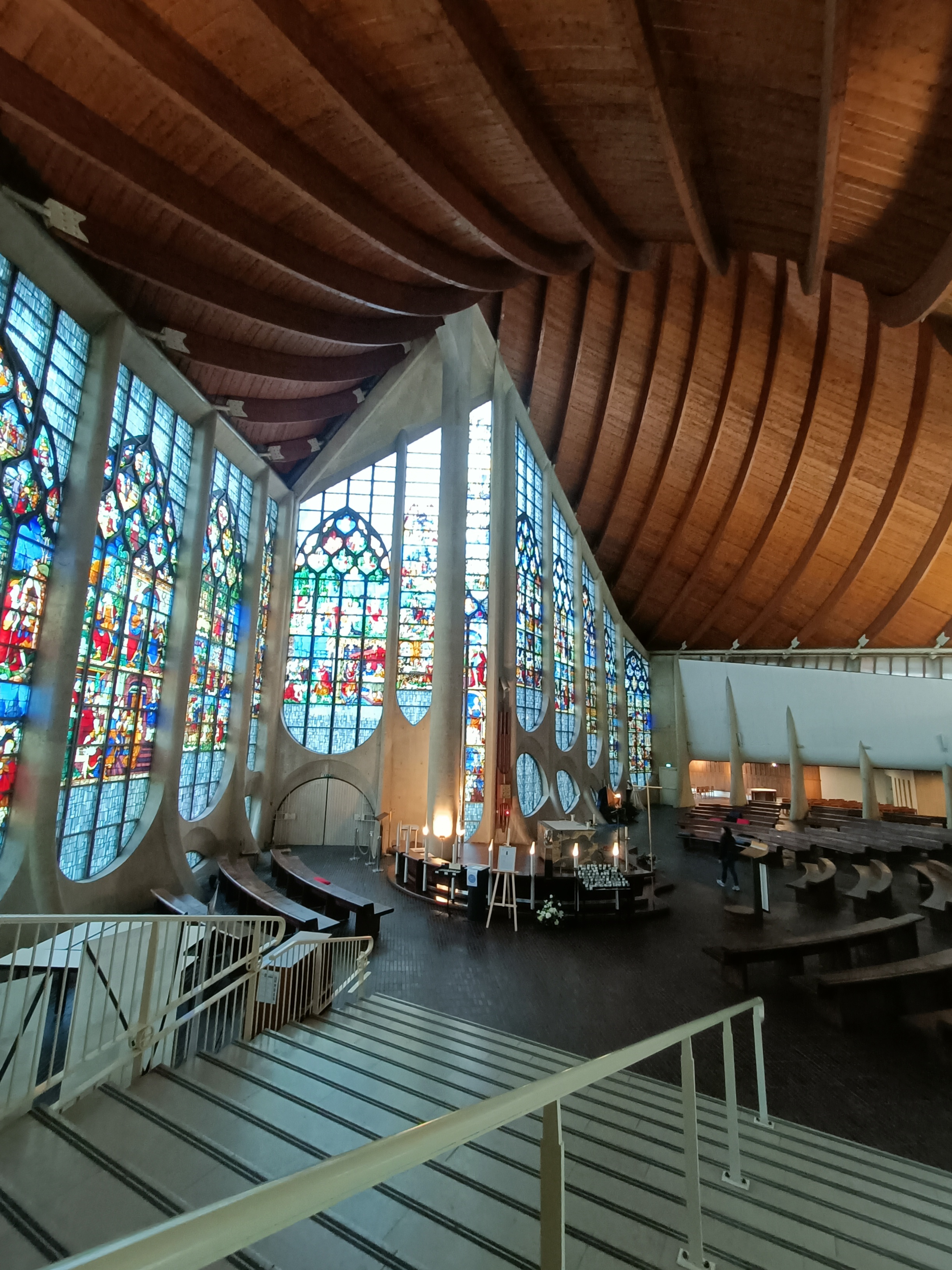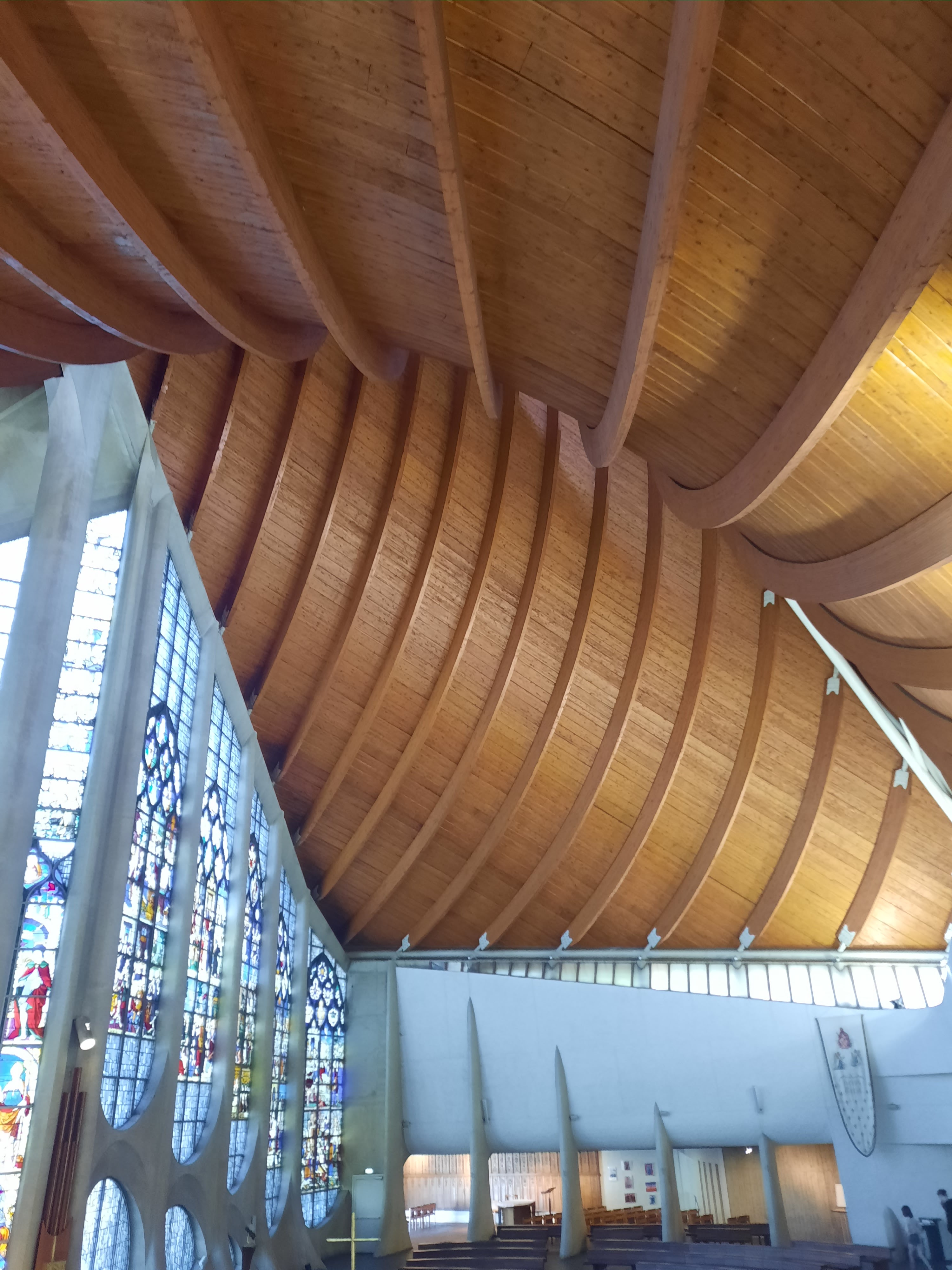 Une église moderne vue de l'extérieur et chaleureuse lorsque l'on pénètre avec ses merveilleux vitraux qui innondent l'édifice de leur lumiere. Et que dire de son toit si étrange comme une coque de bâteau, nous avons adoré son originalité !
