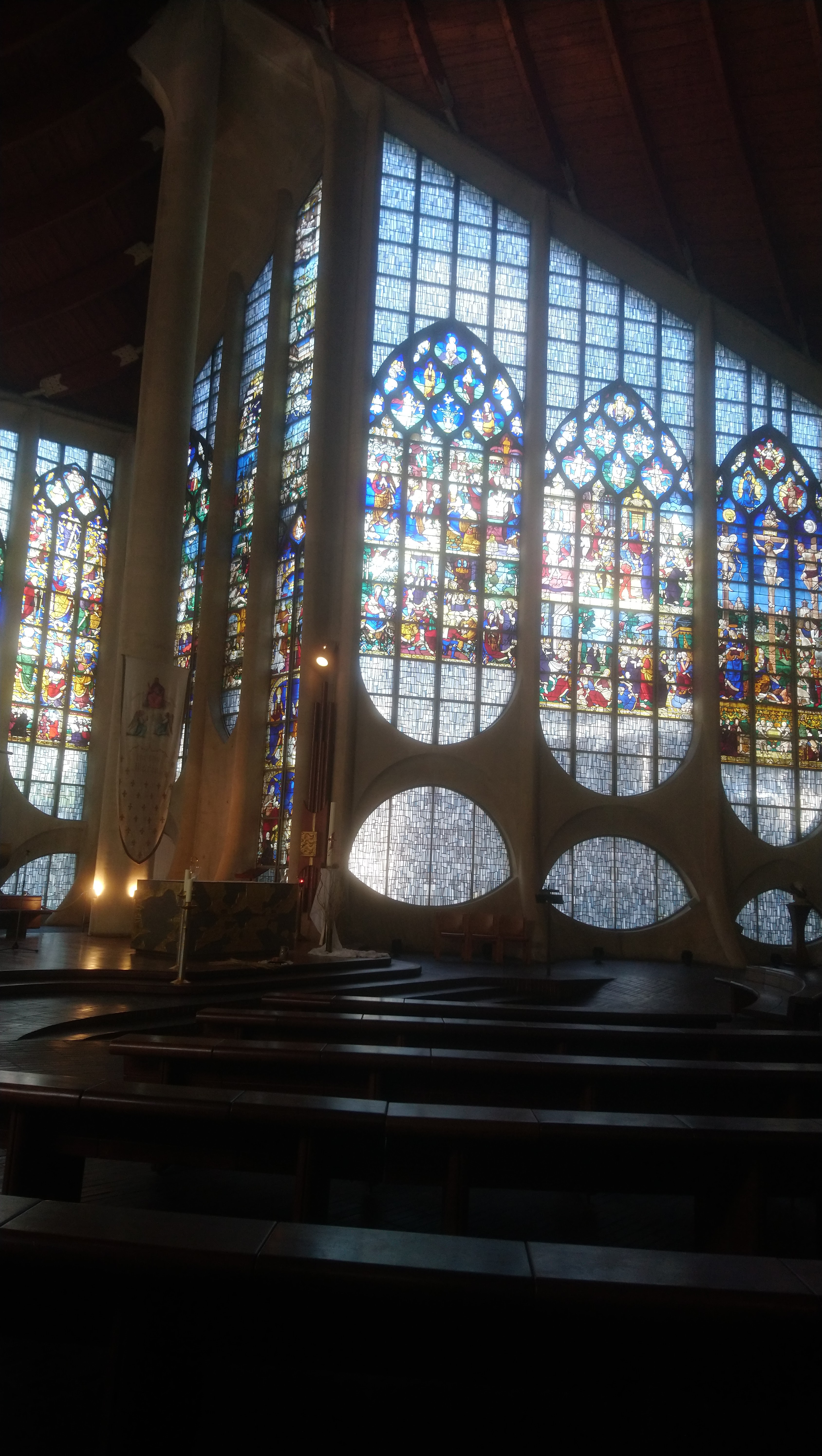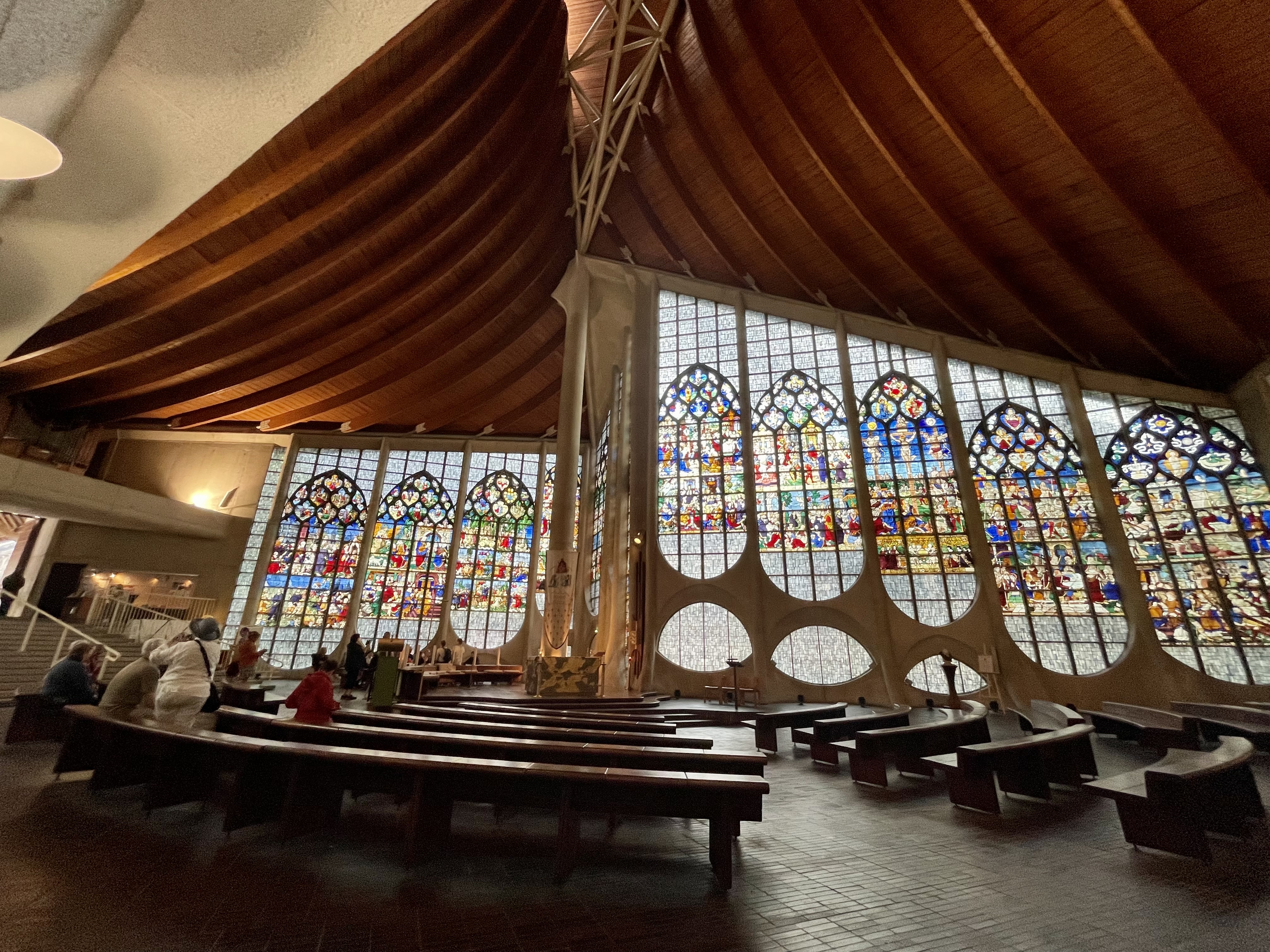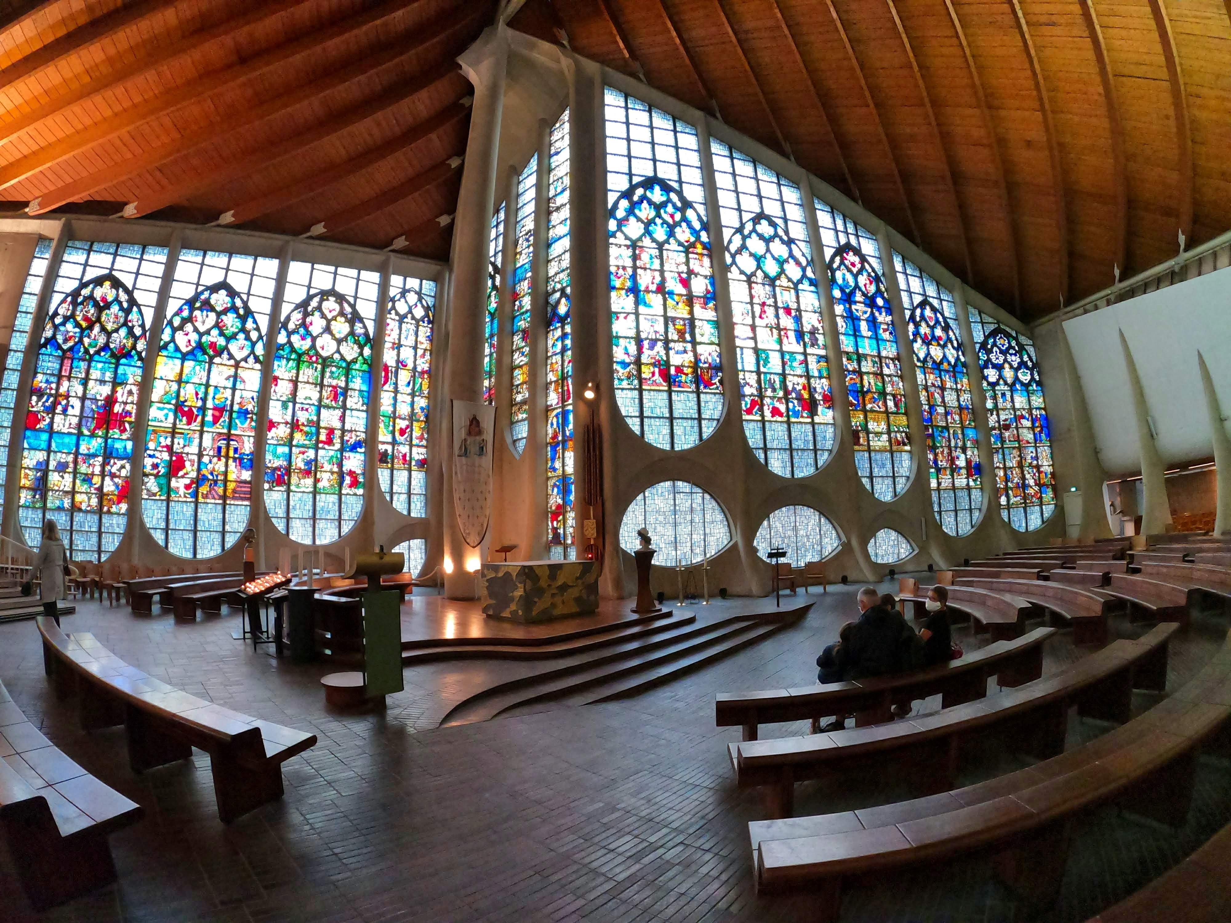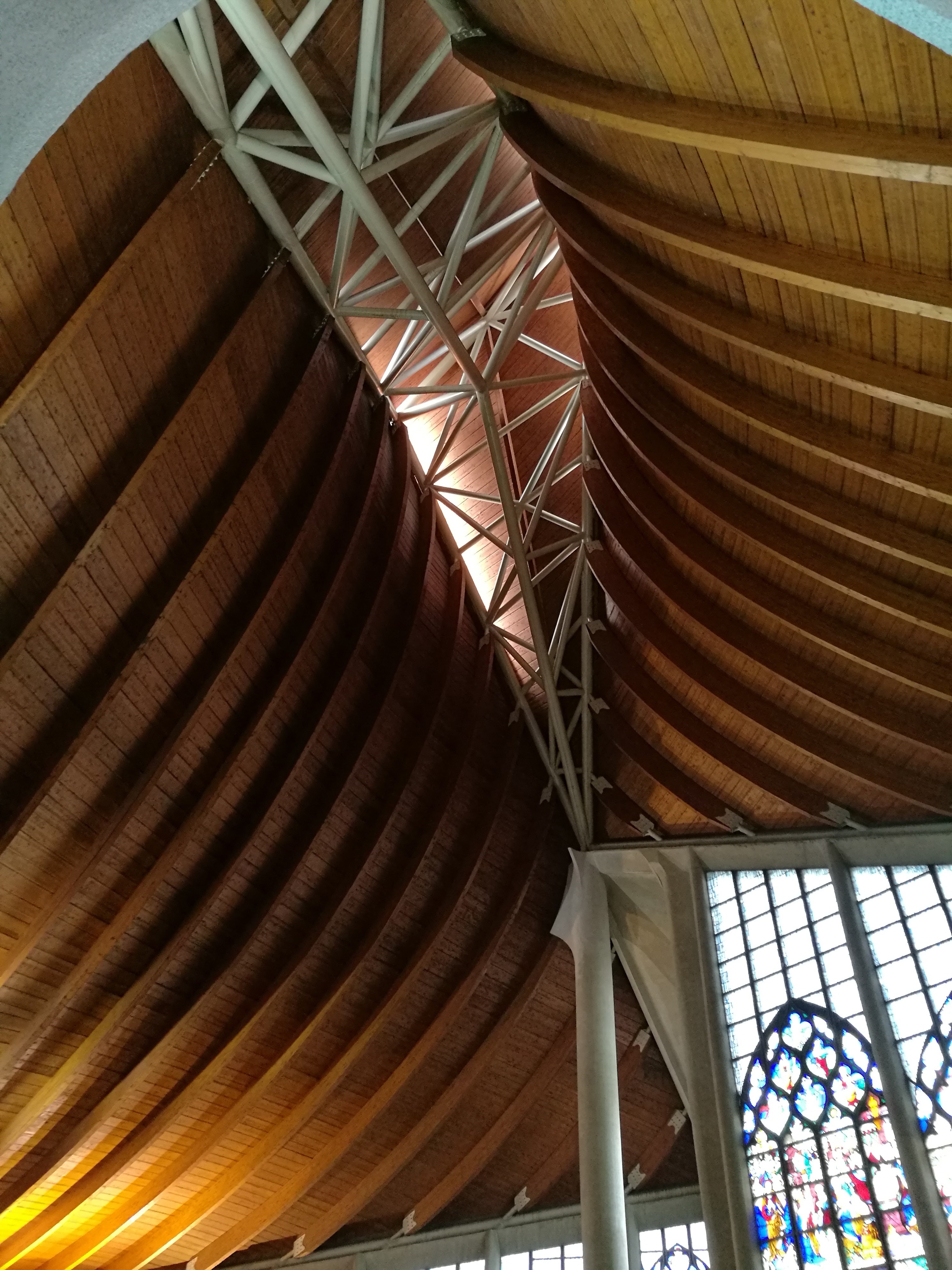 Une église moderne vue de l'extérieur et chaleureuse lorsque l'on pénètre avec ses merveilleux vitraux qui innondent l'édifice de leur lumiere. Et que dire de son toit si étrange comme une coque de bâteau, nous avons adoré son originalité !