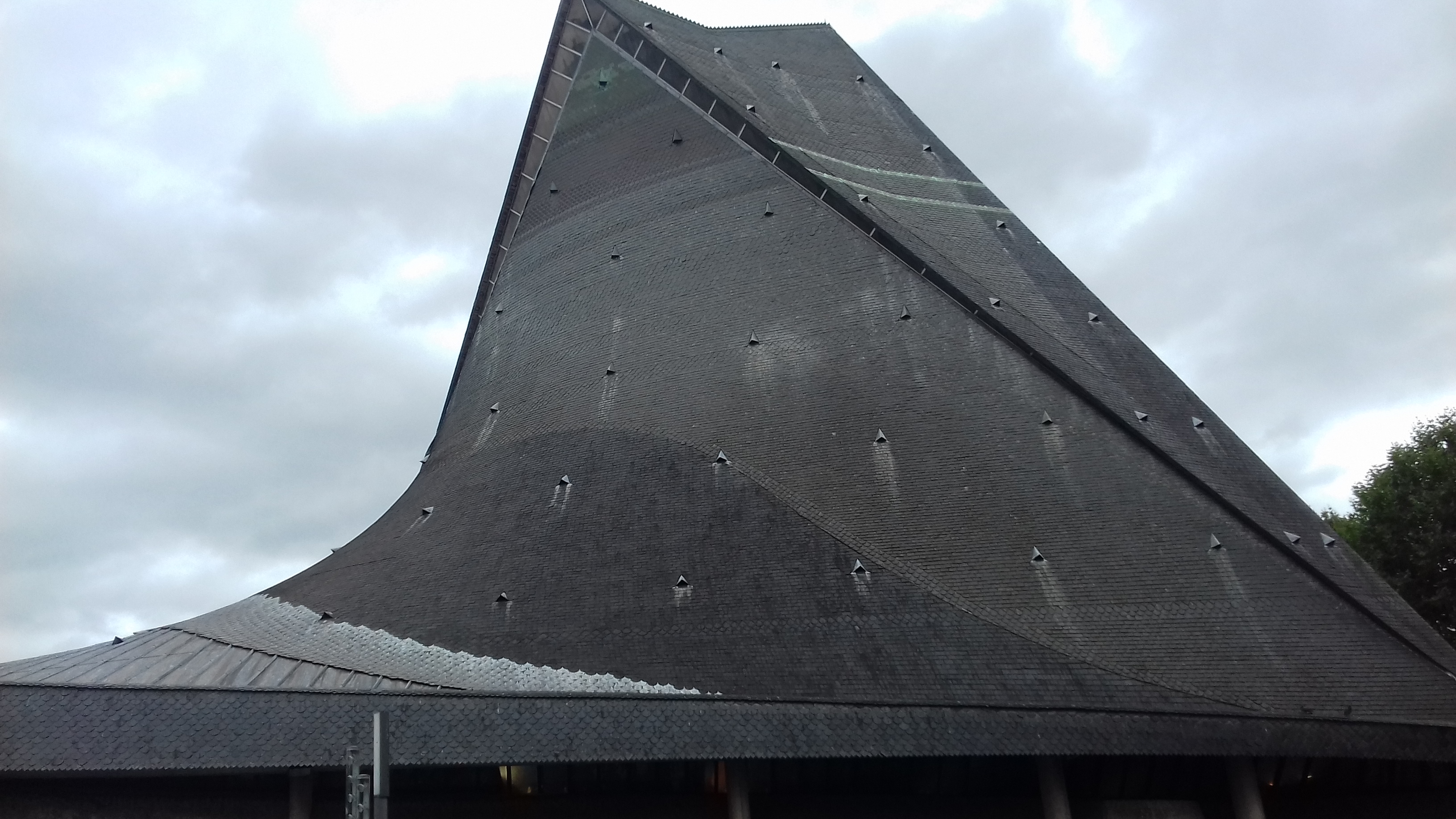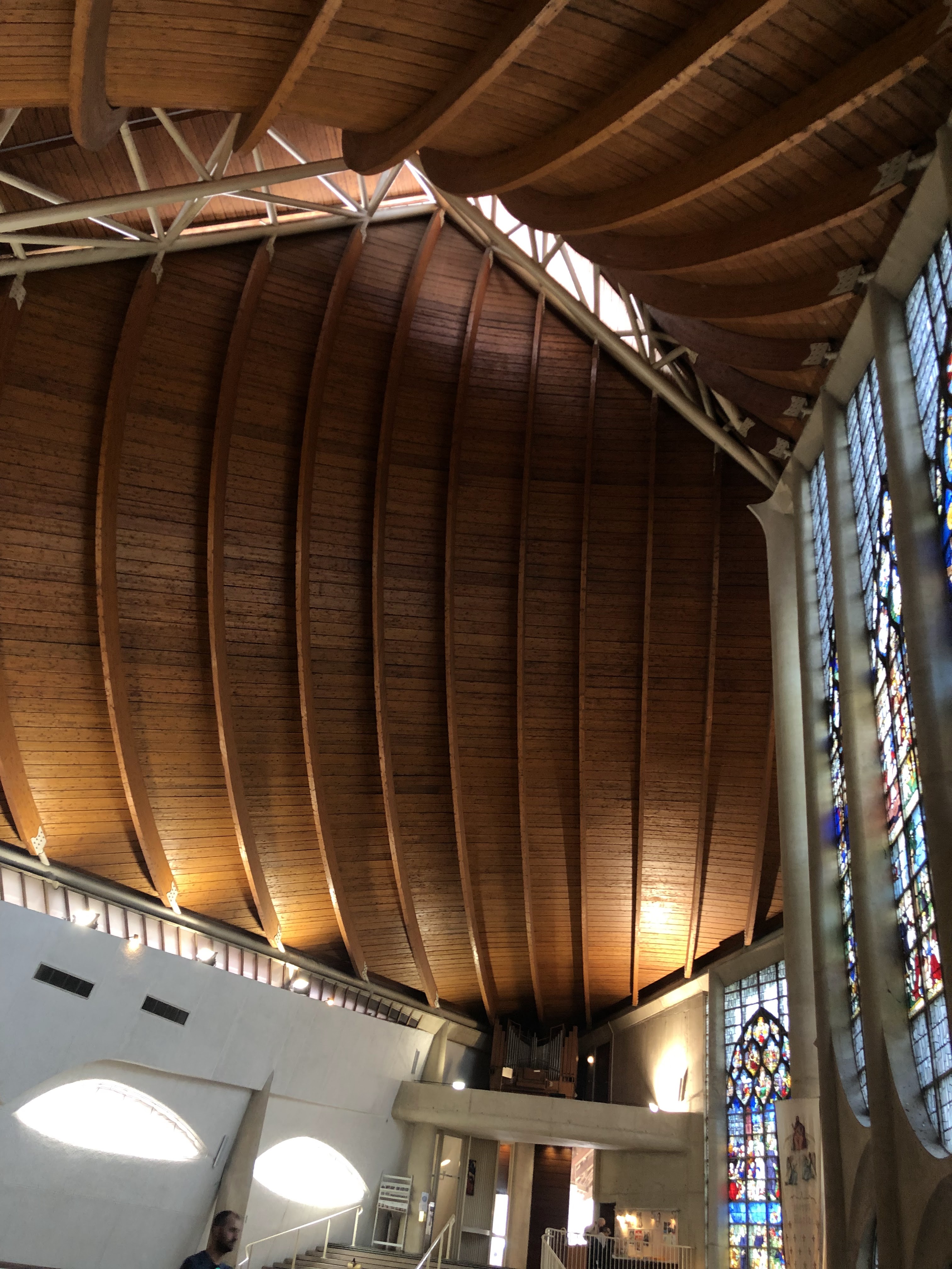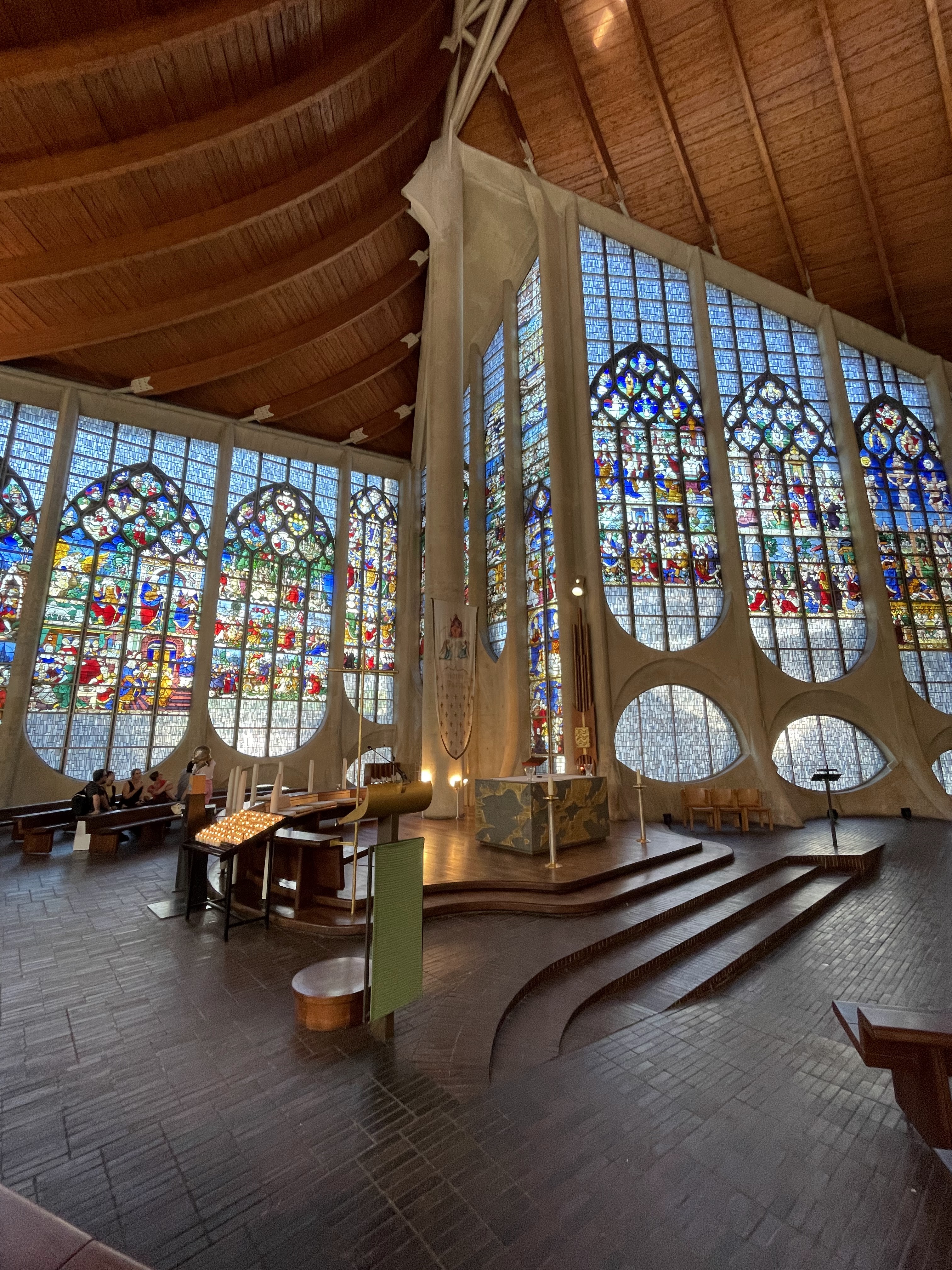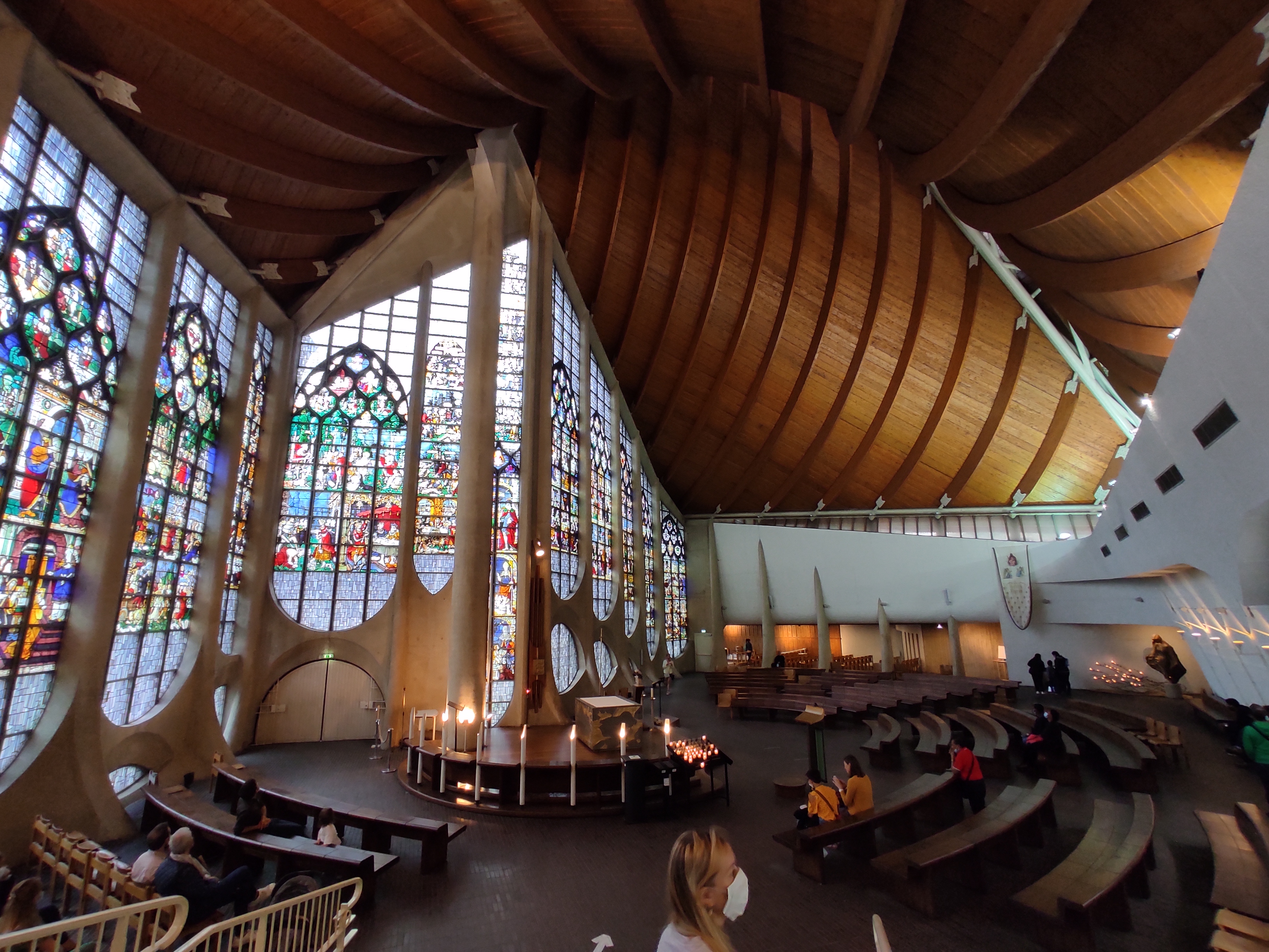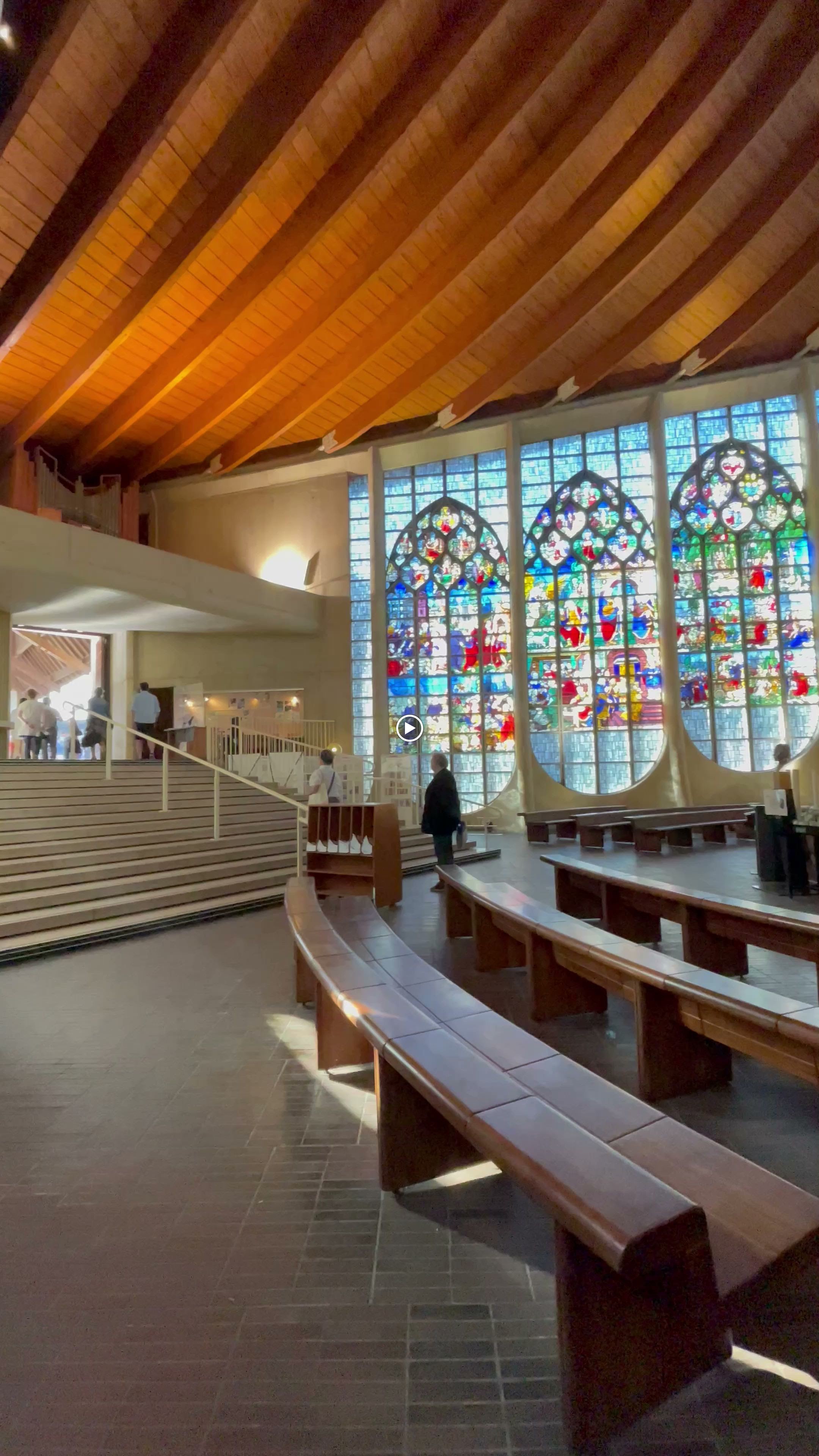 Une église moderne vue de l'extérieur et chaleureuse lorsque l'on pénètre avec ses merveilleux vitraux qui innondent l'édifice de leur lumiere. Et que dire de son toit si étrange comme une coque de bâteau, nous avons adoré son originalité !