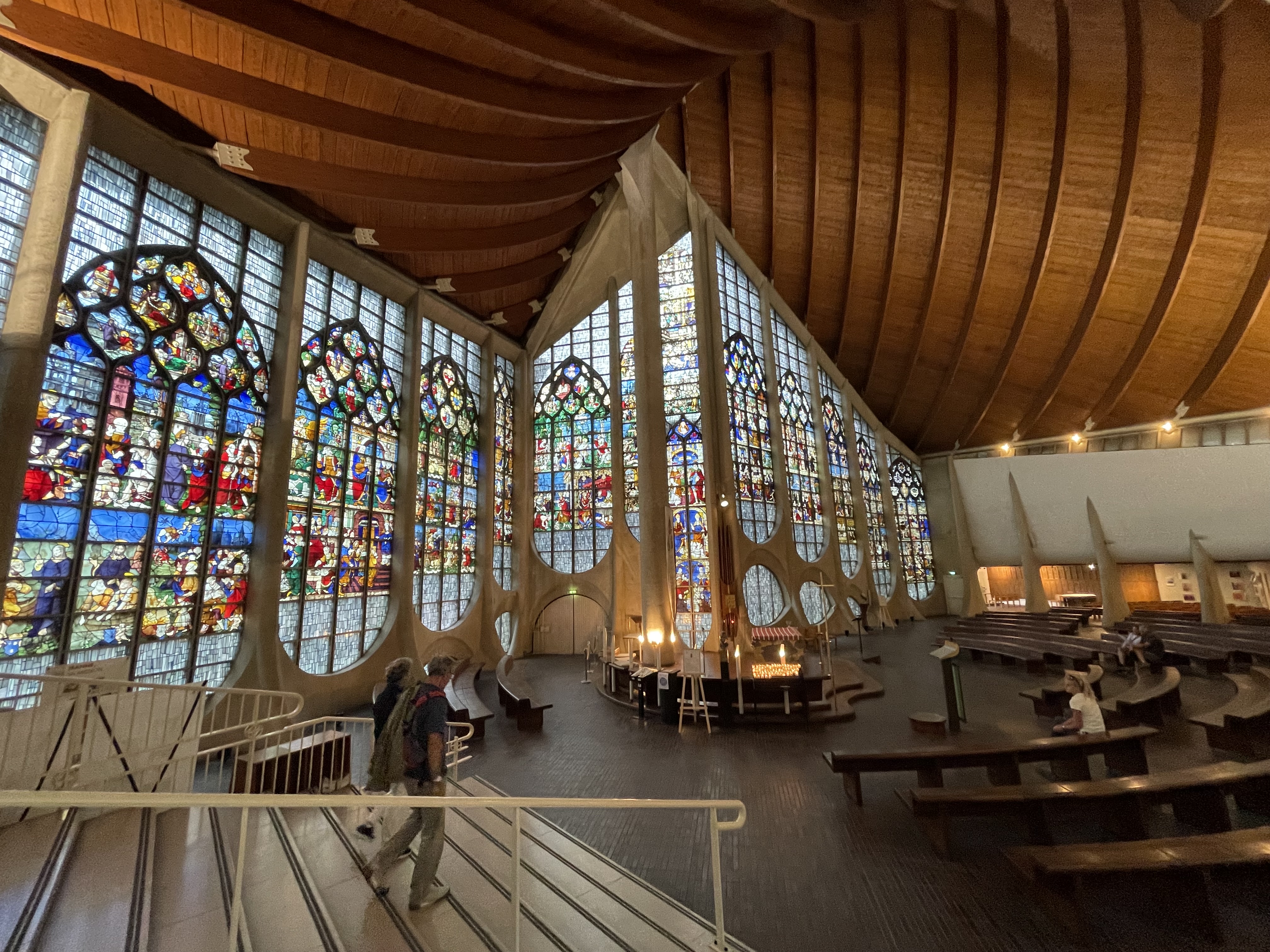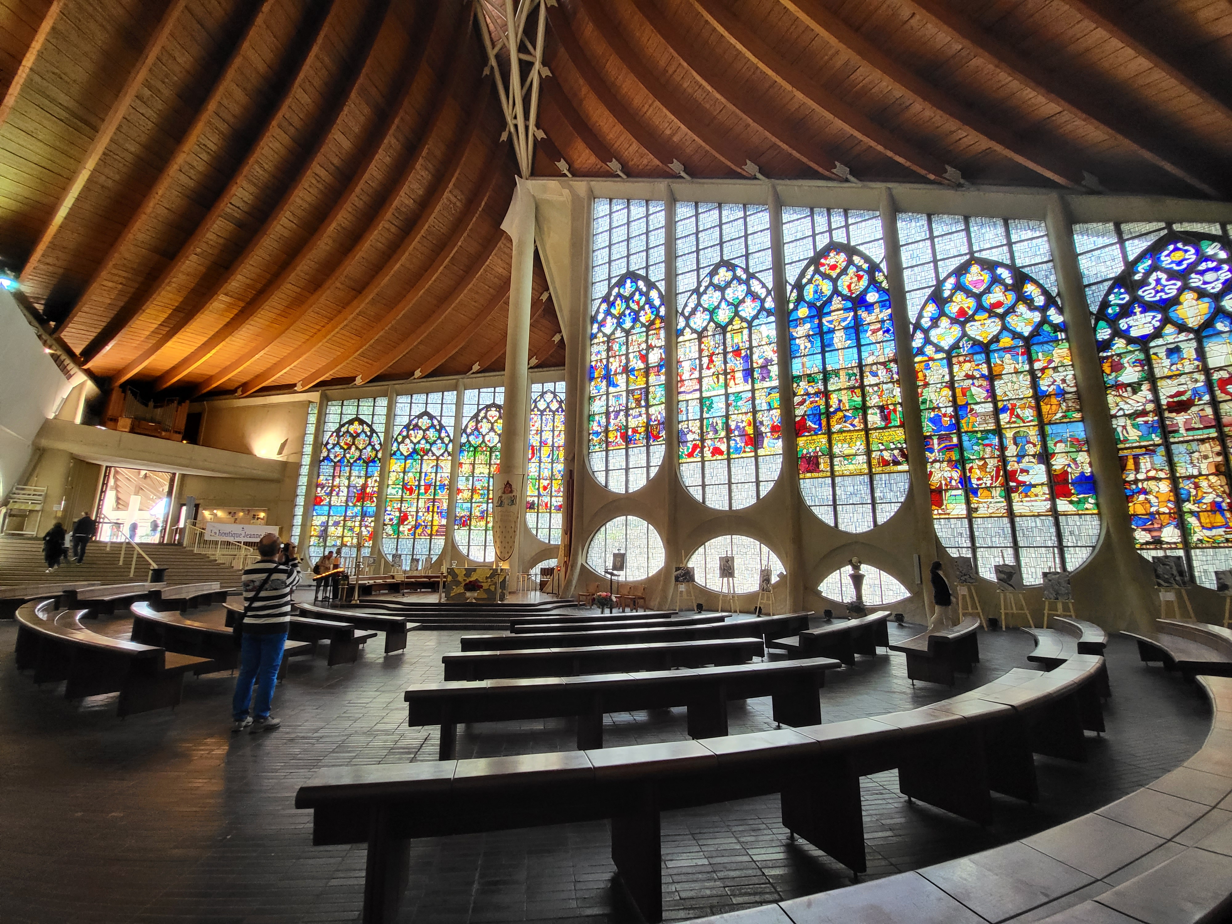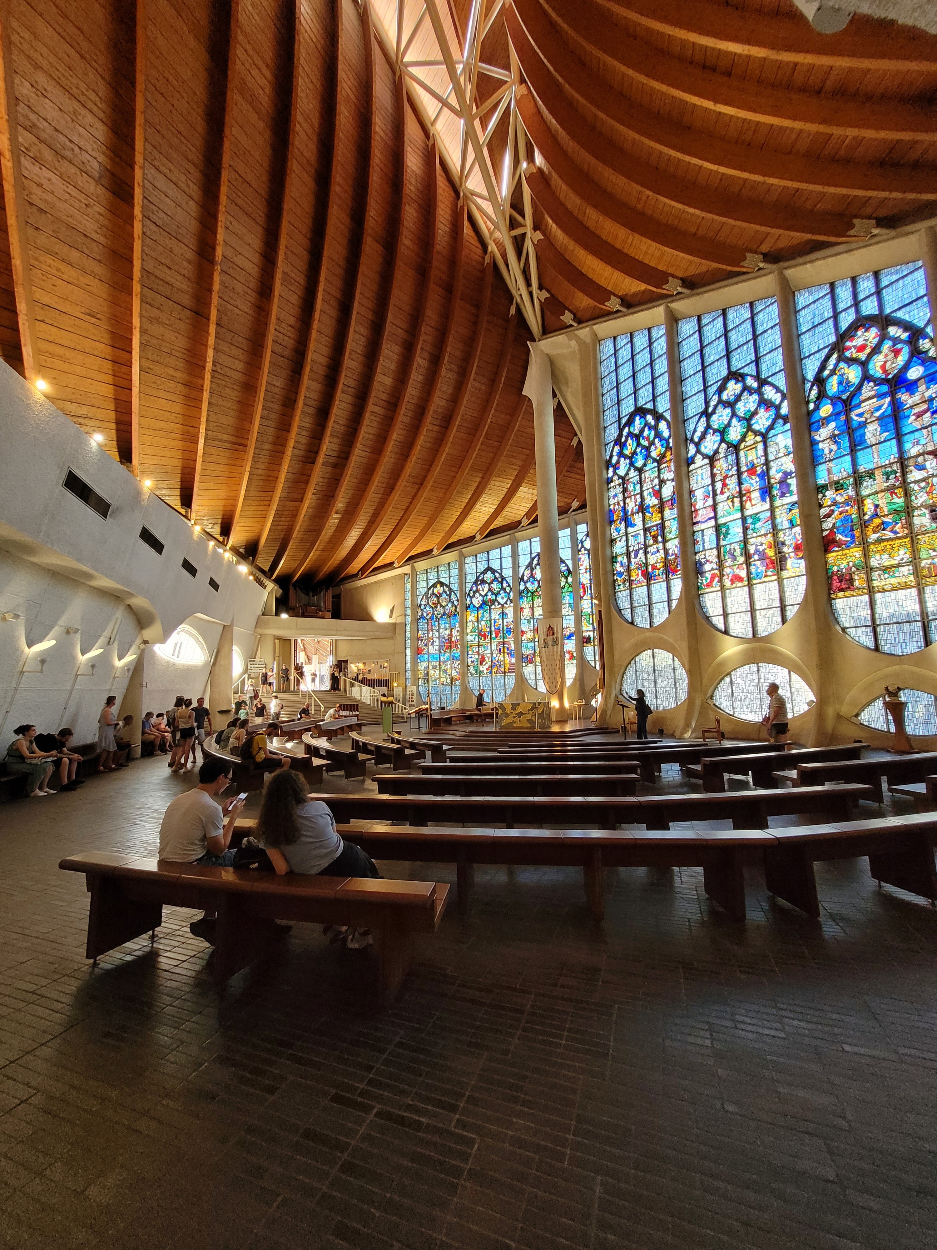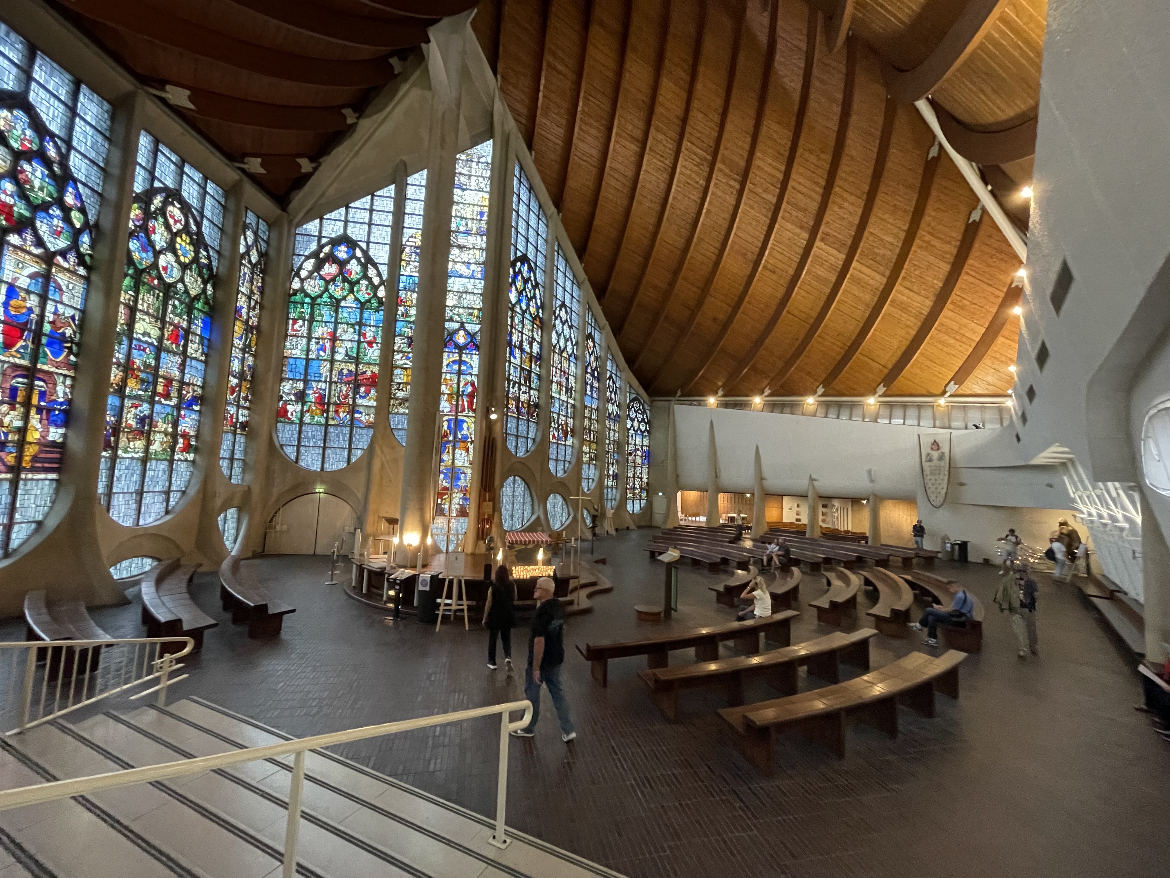 Une église moderne vue de l'extérieur et chaleureuse lorsque l'on pénètre avec ses merveilleux vitraux qui innondent l'édifice de leur lumiere. Et que dire de son toit si étrange comme une coque de bâteau, nous avons adoré son originalité !