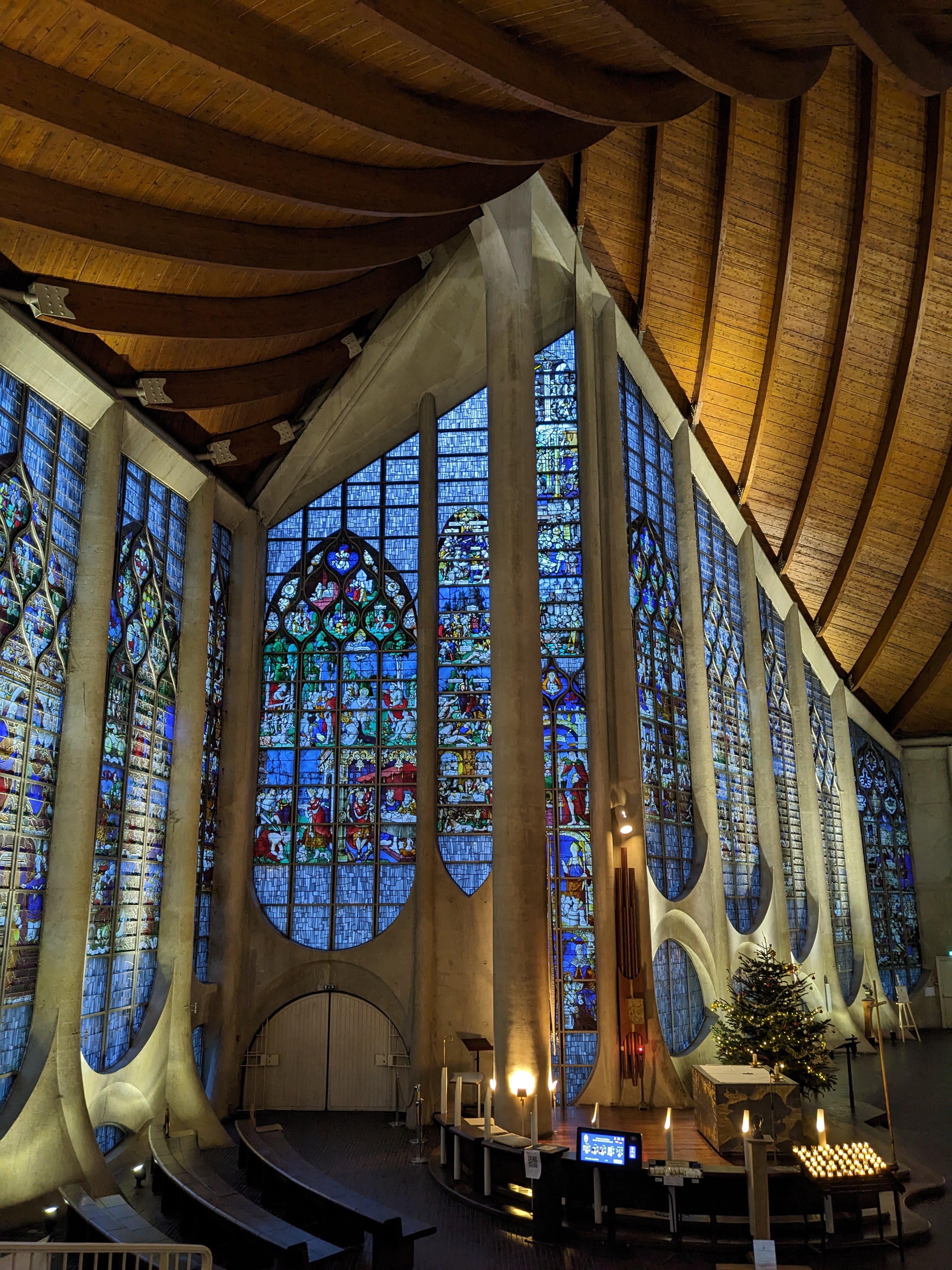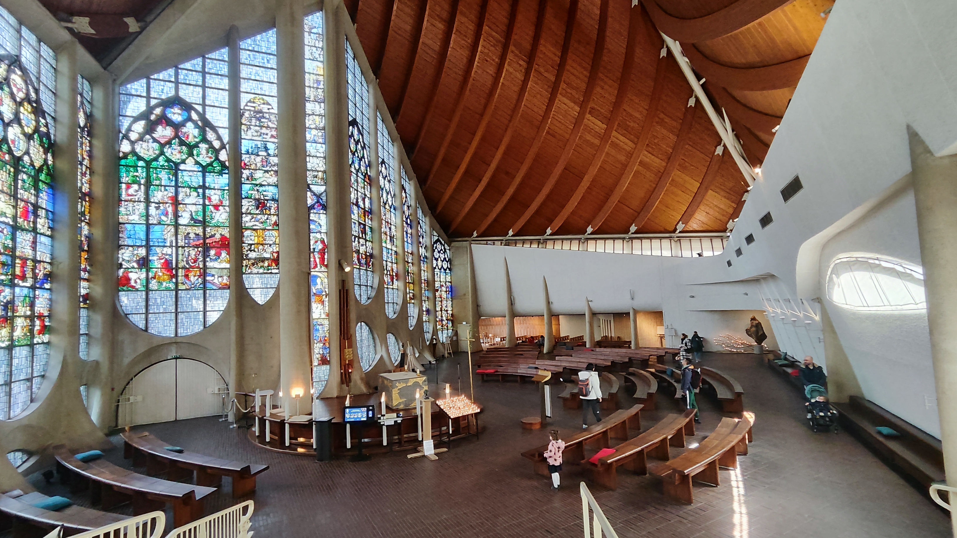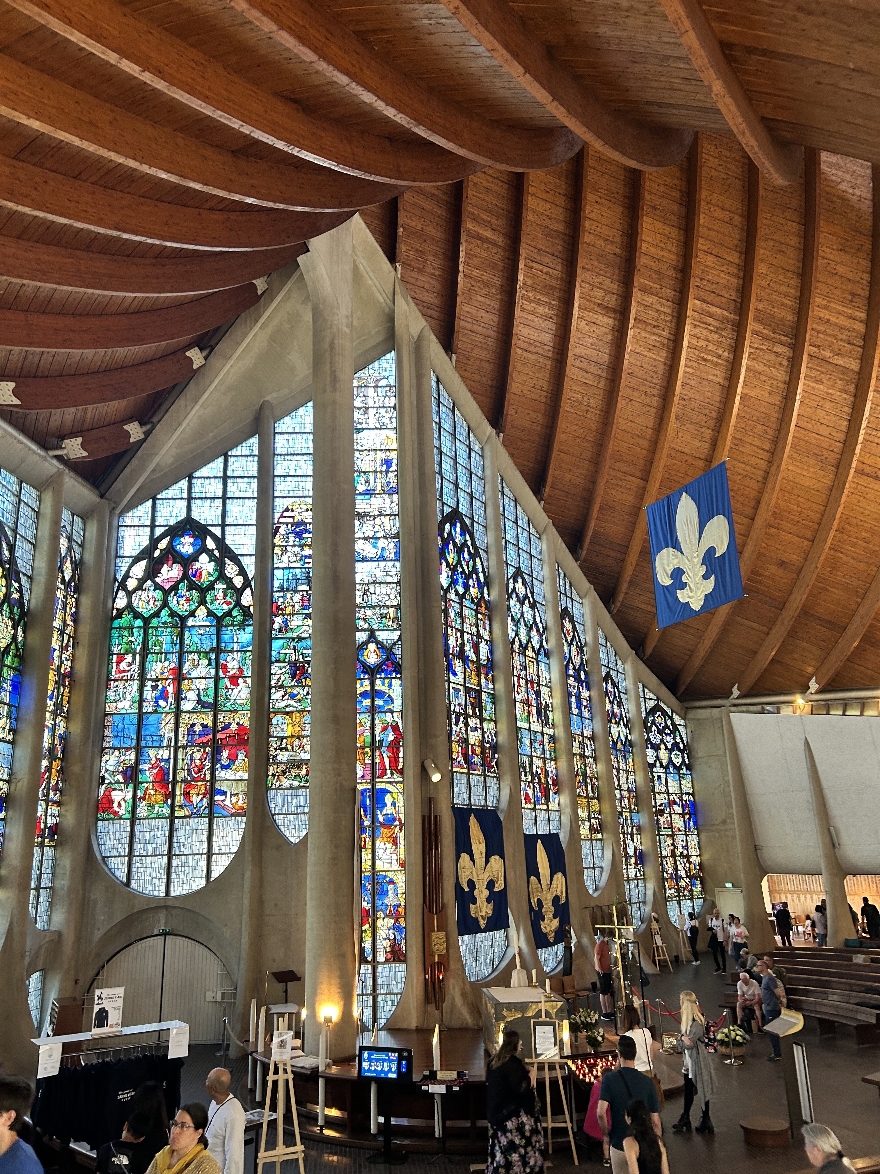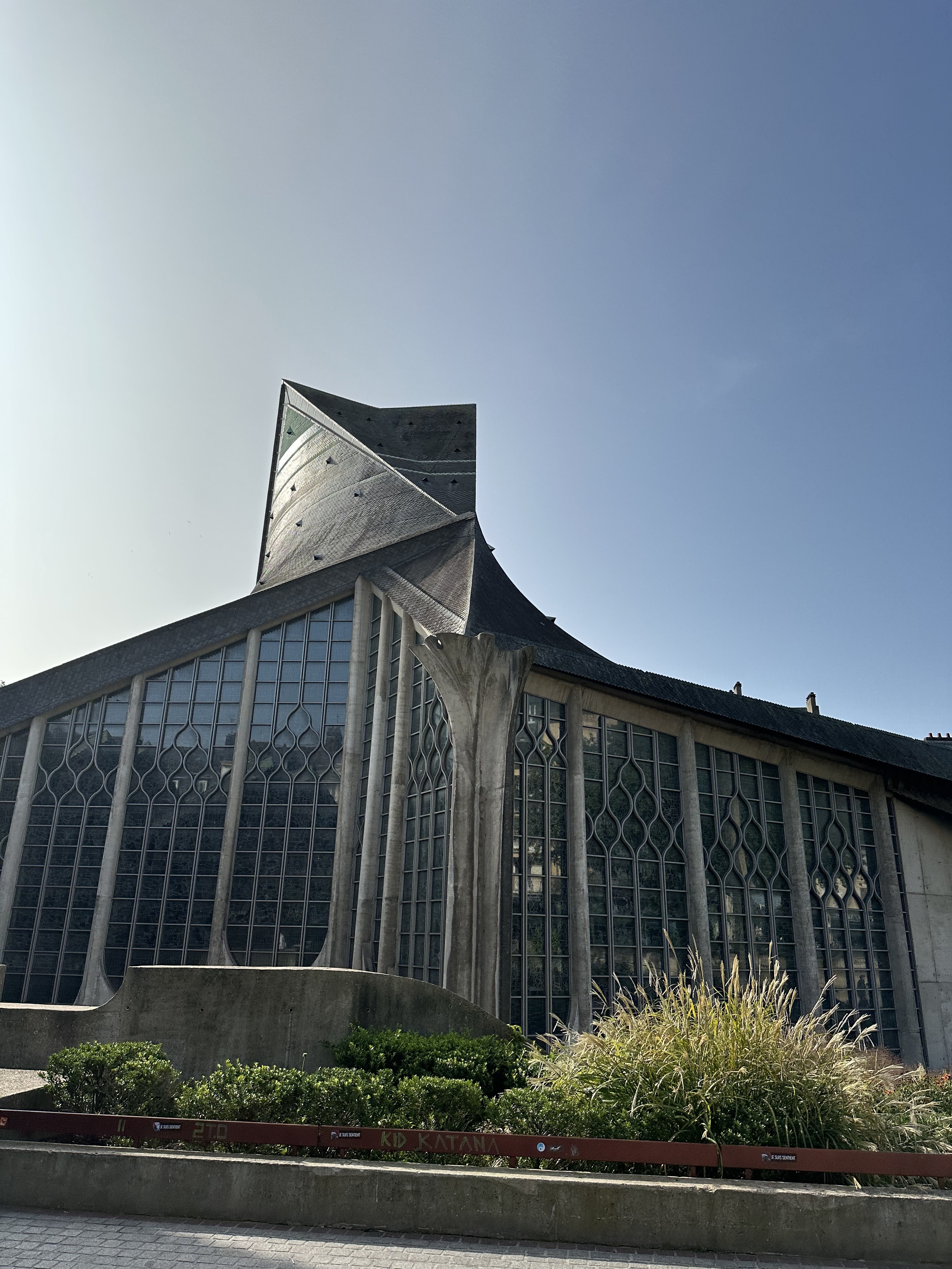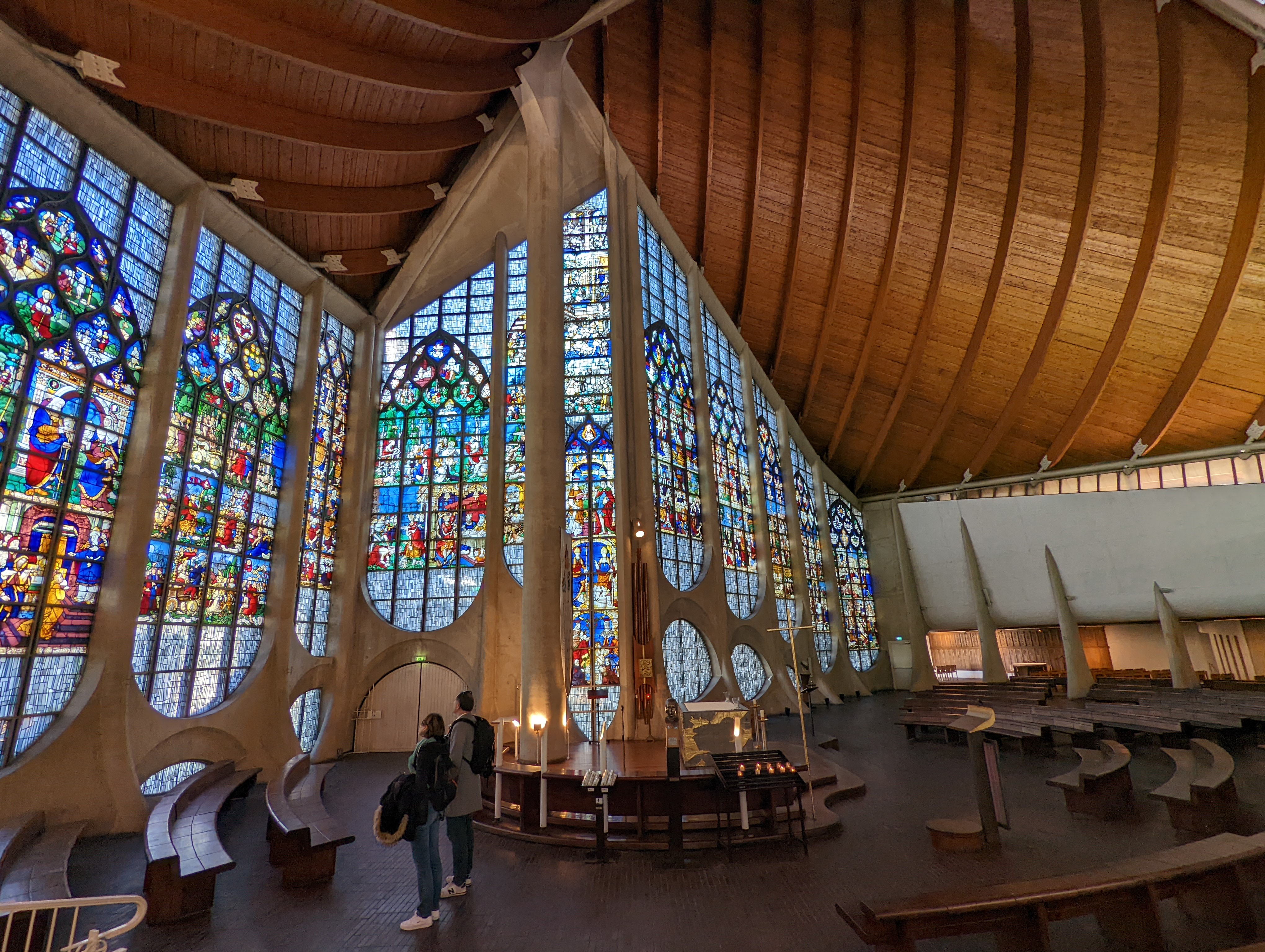 Une église moderne vue de l'extérieur et chaleureuse lorsque l'on pénètre avec ses merveilleux vitraux qui innondent l'édifice de leur lumiere. Et que dire de son toit si étrange comme une coque de bâteau, nous avons adoré son originalité !