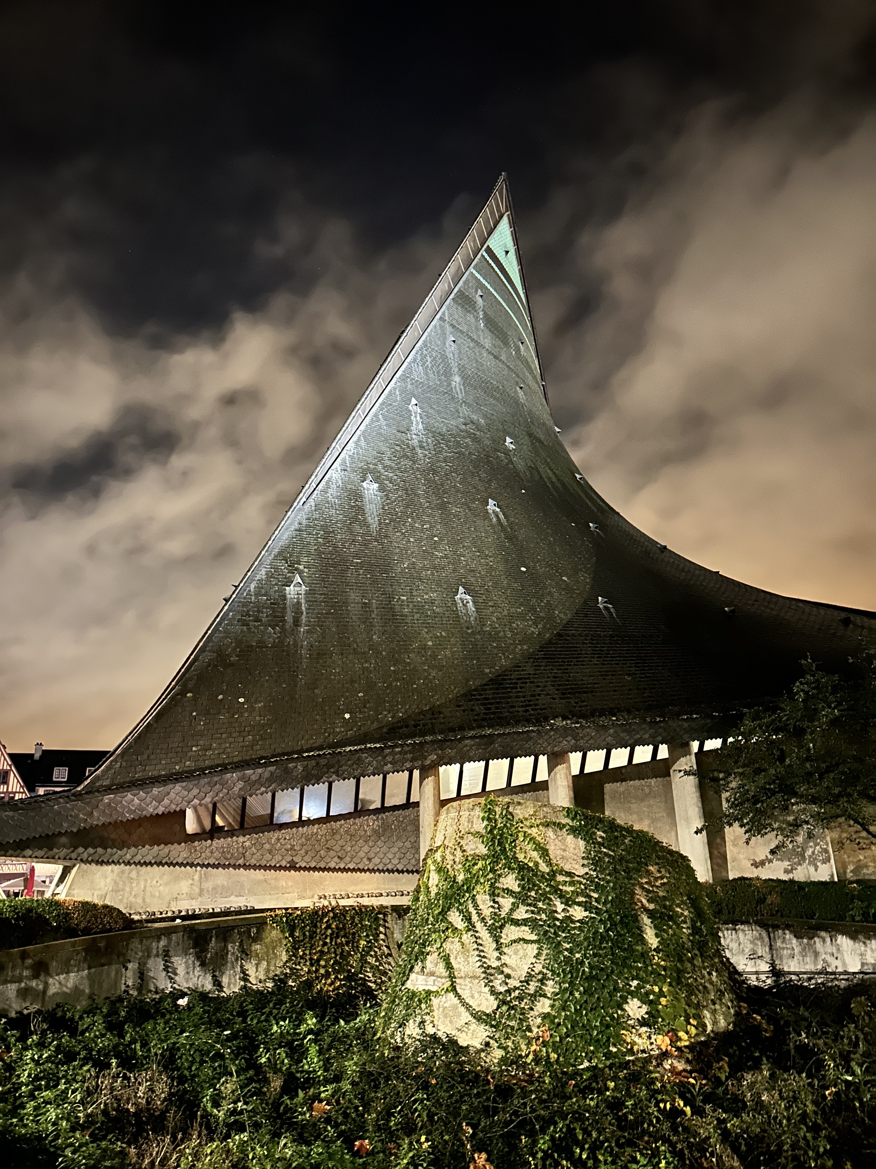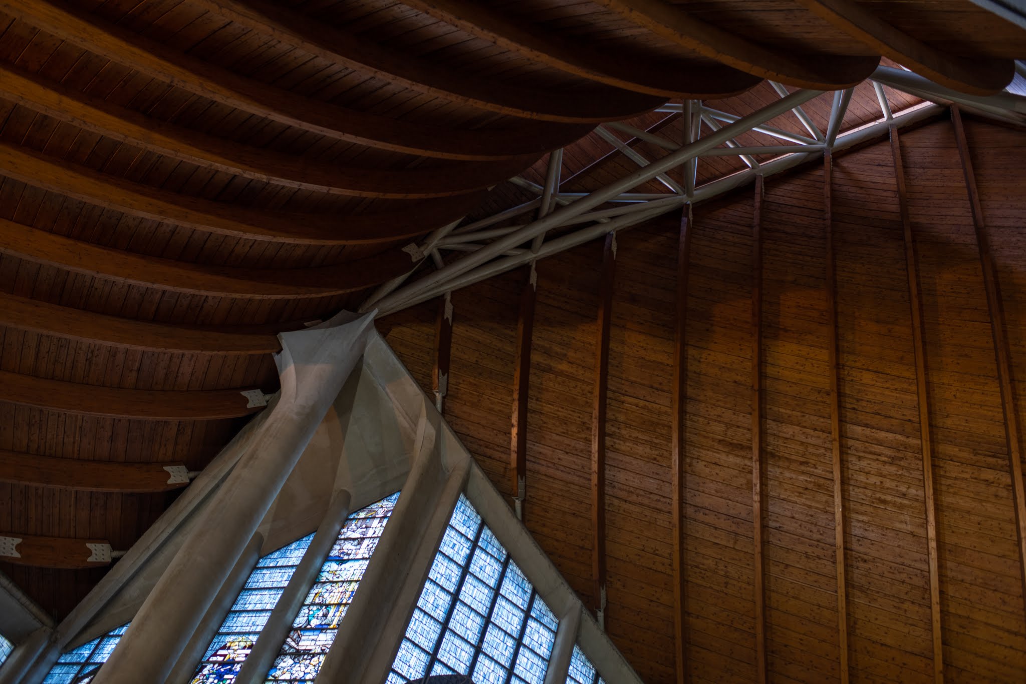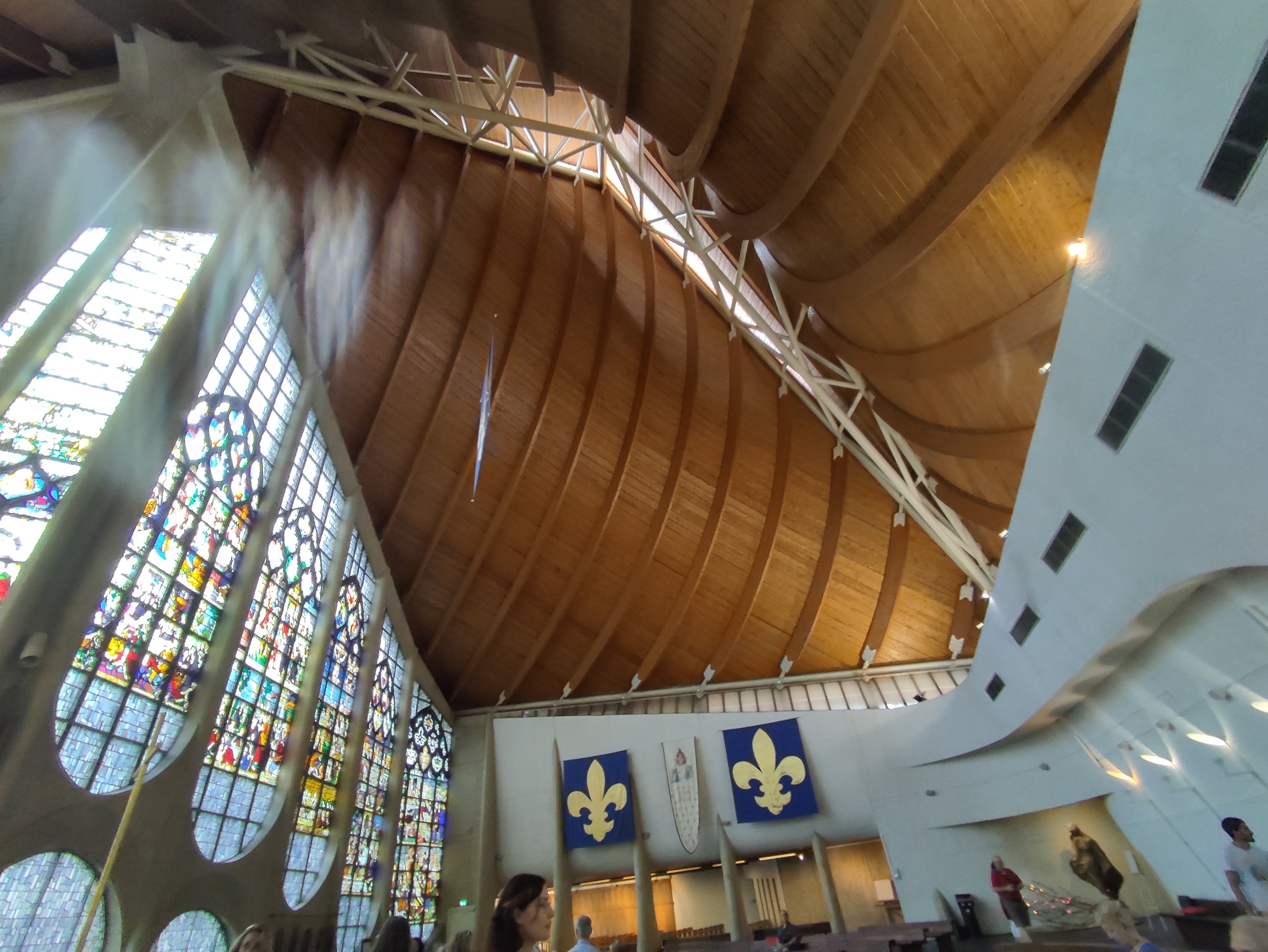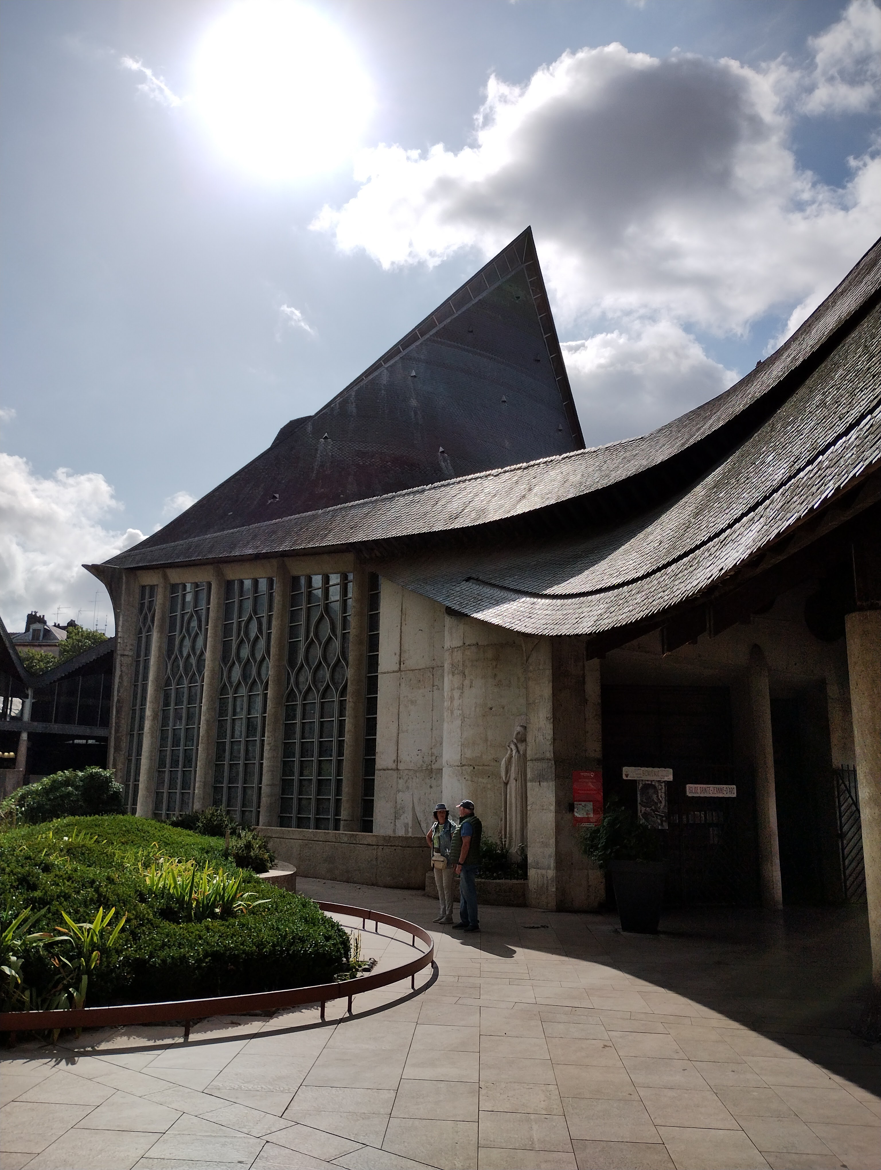 Une église moderne vue de l'extérieur et chaleureuse lorsque l'on pénètre avec ses merveilleux vitraux qui innondent l'édifice de leur lumiere. Et que dire de son toit si étrange comme une coque de bâteau, nous avons adoré son originalité !