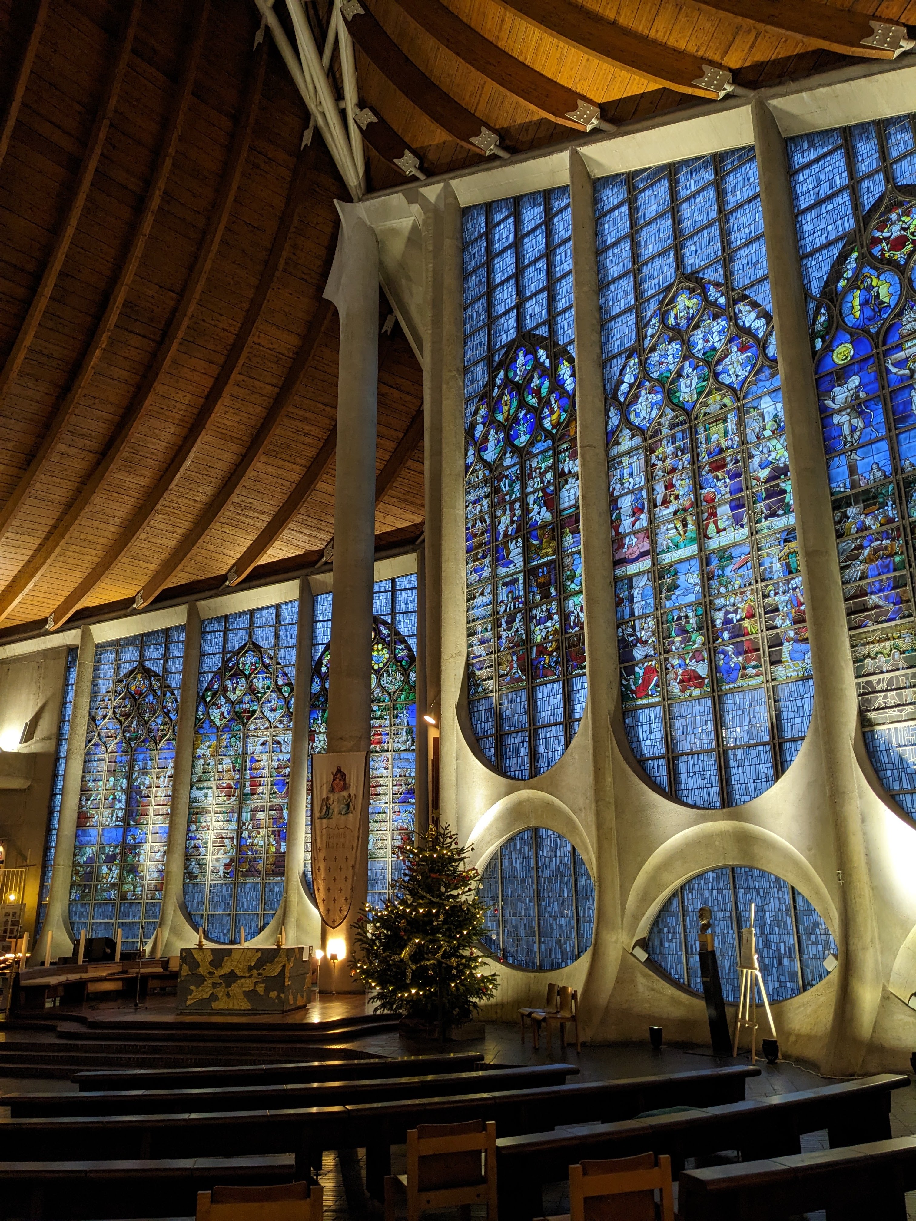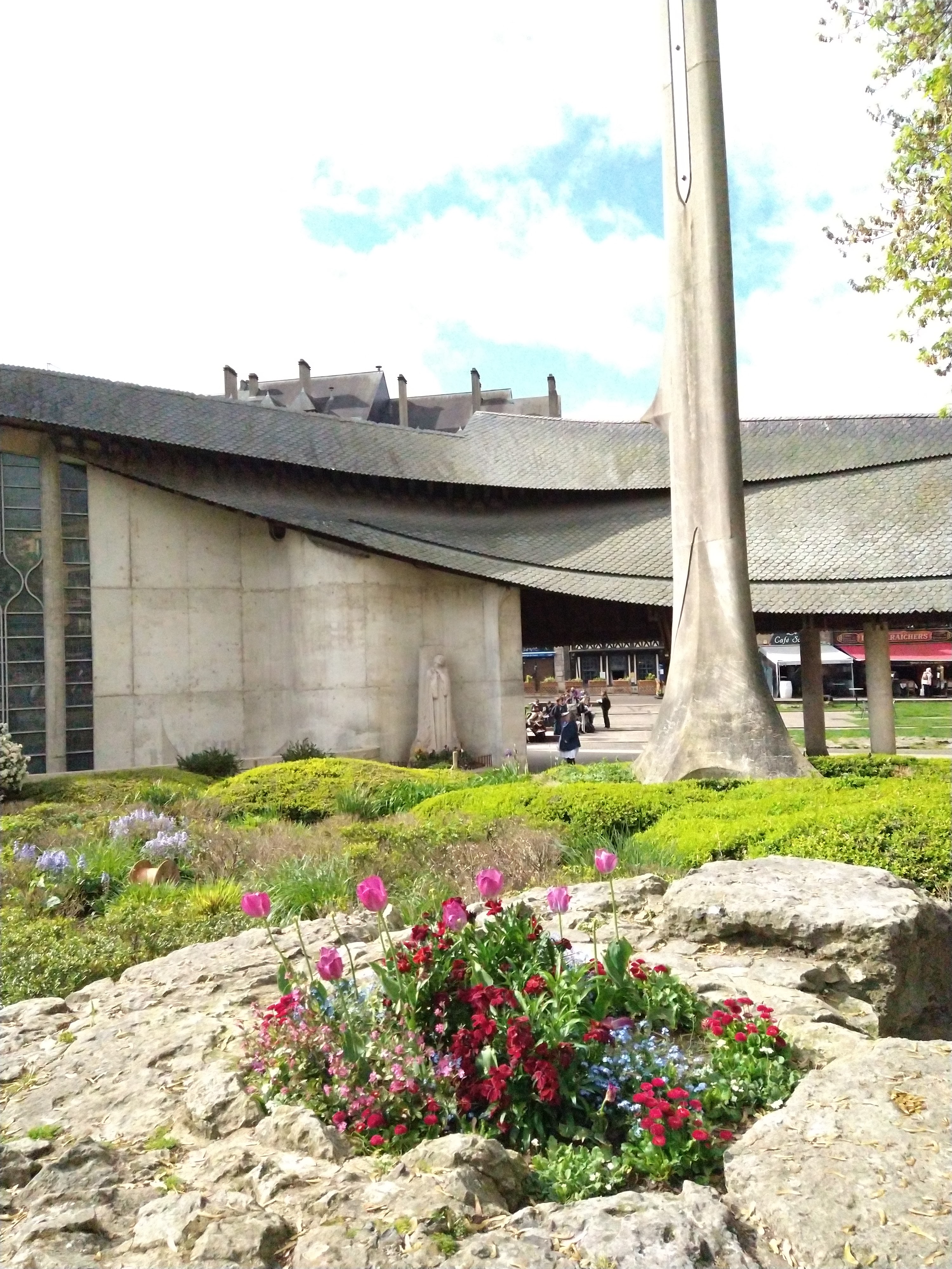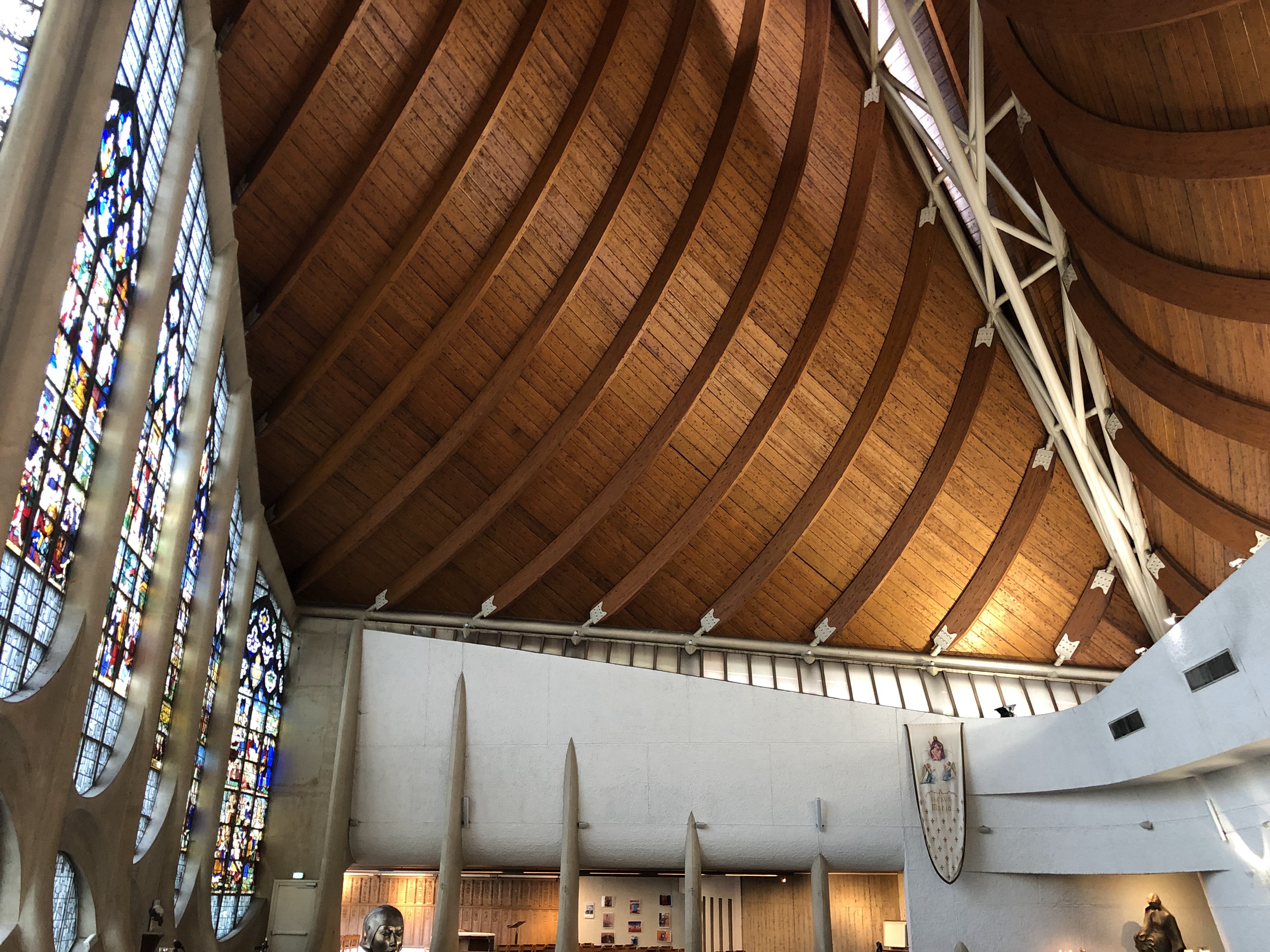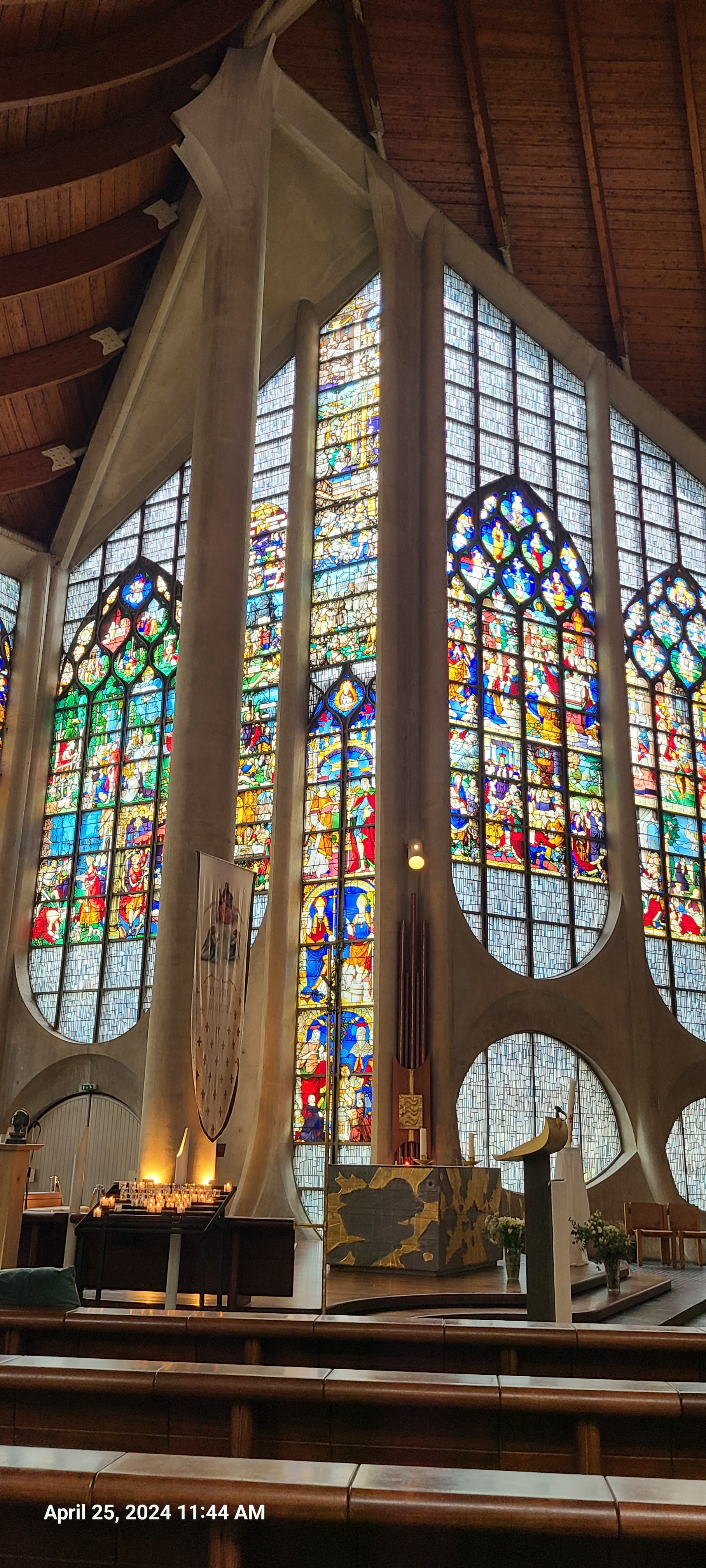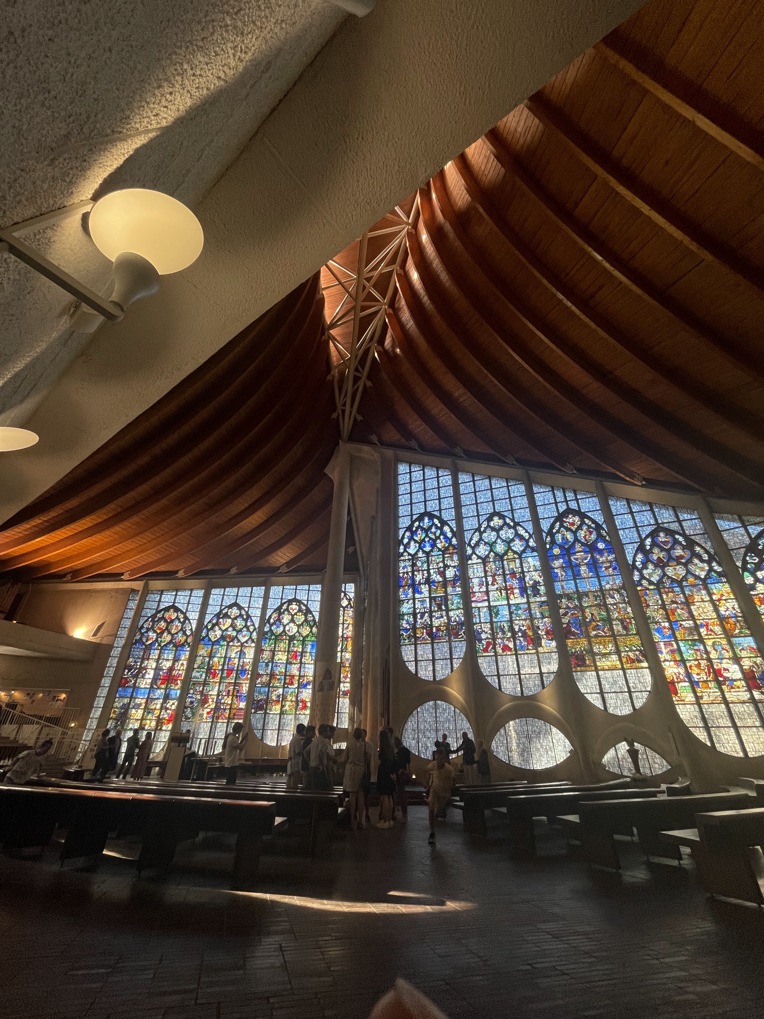 Une église moderne vue de l'extérieur et chaleureuse lorsque l'on pénètre avec ses merveilleux vitraux qui innondent l'édifice de leur lumiere. Et que dire de son toit si étrange comme une coque de bâteau, nous avons adoré son originalité !