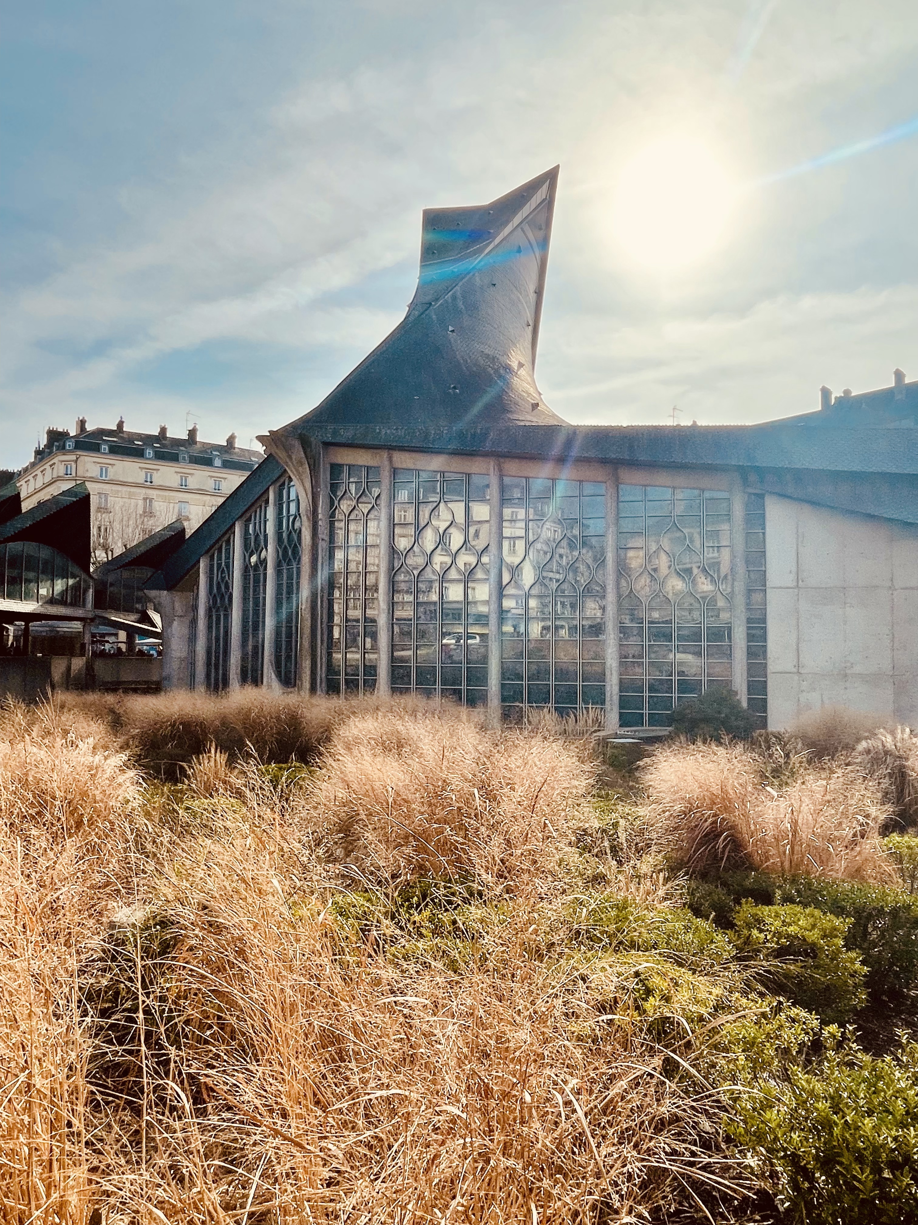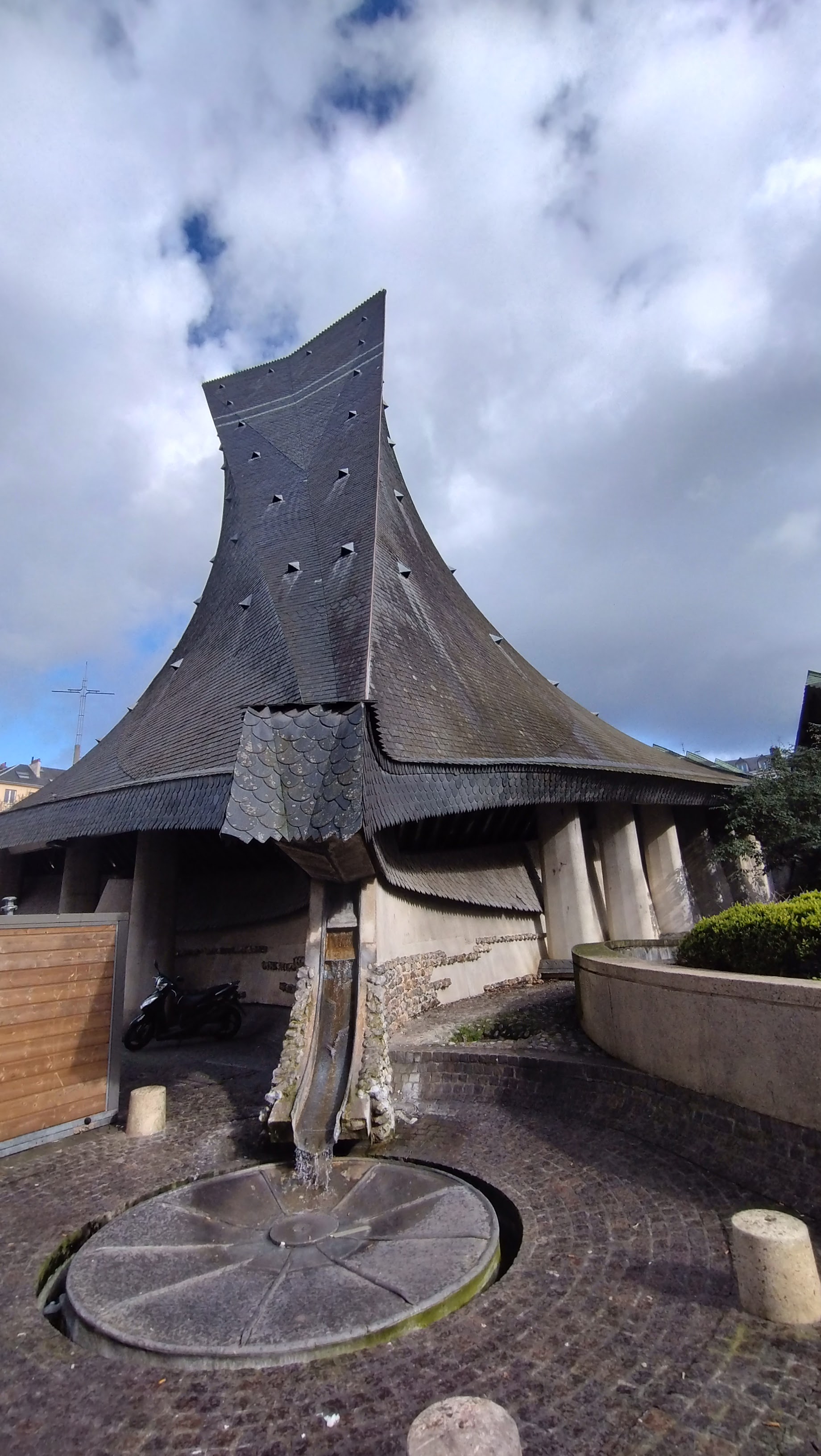Soyons honnête, selon mois, c'est moche. De l'extérieur en tout cas . La plaque explicative est à moitié cachée sous les buissons, le bâtiment n'arrive à faire ni ancien ni moderne . Cependant une fois rentré à l'intérieur pour moi l'effet a été totalement différent. Presque comme transcendé devant l'architecture et la luminosité des vitraux. Chose rare j'ai même pris quelques instants pour simplement m'y assoire et méditer. La simplicité au service du spirituel pour ce vaisseau mi-bateaux mi-lieux de culte. Pièce de la monnaie de Paris sur place que l'office du tourisme oubli parfois de mentionner.