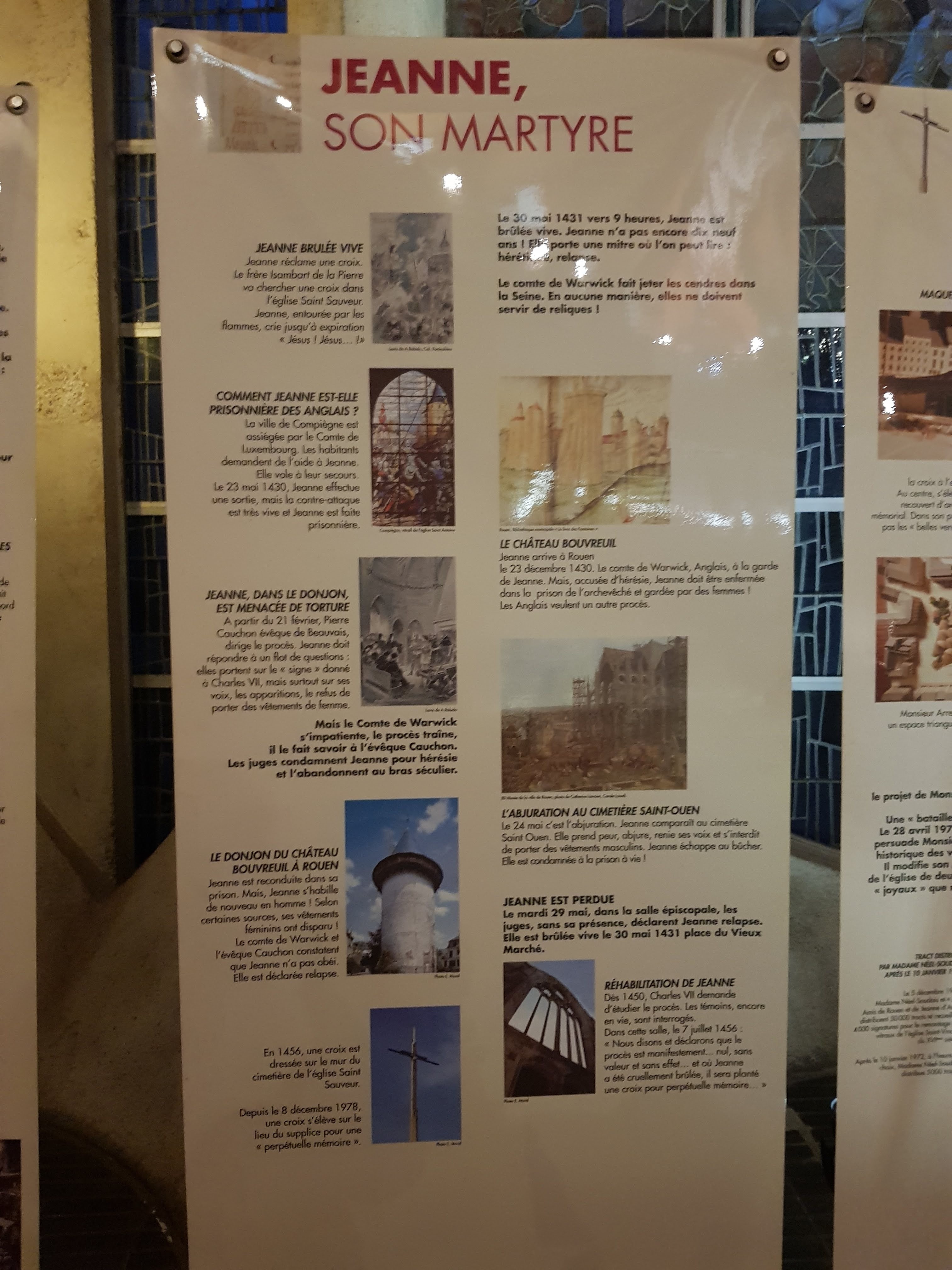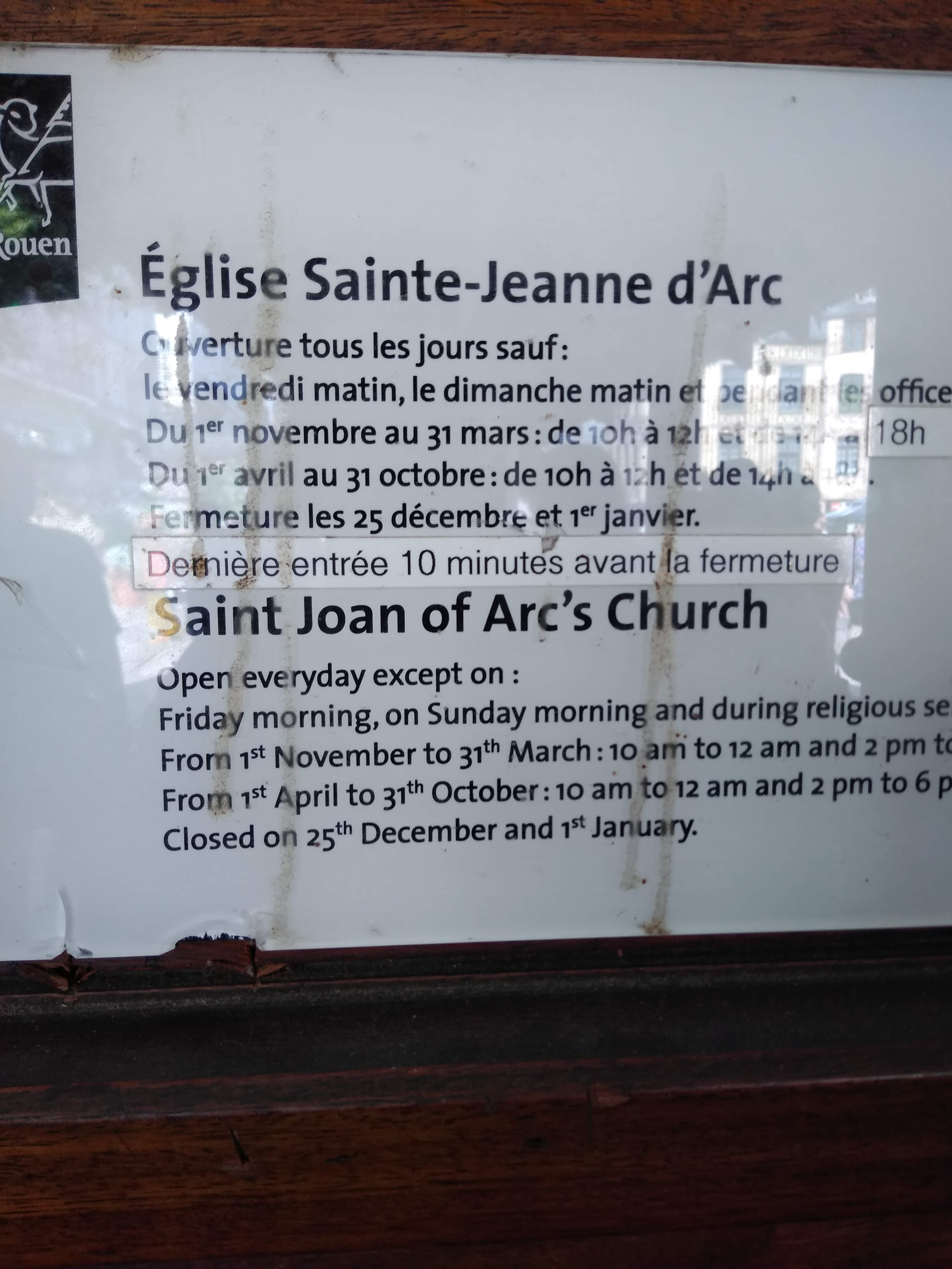 L'église est située près de la place du marché. Le sanctuaire lui-même est impressionnant par sa forme mais aussi par le fait qu'il a été construit là où Jeanne d'Arc a été brûlée vive. Son histoire est triste et s'asseoir sur le marché près du lieu d'exécution ainsi que regarder l'église provoquent de profondes pensées autour de l'histoire, de la religion, de la vie et de la mort qui me viennent à l'esprit.