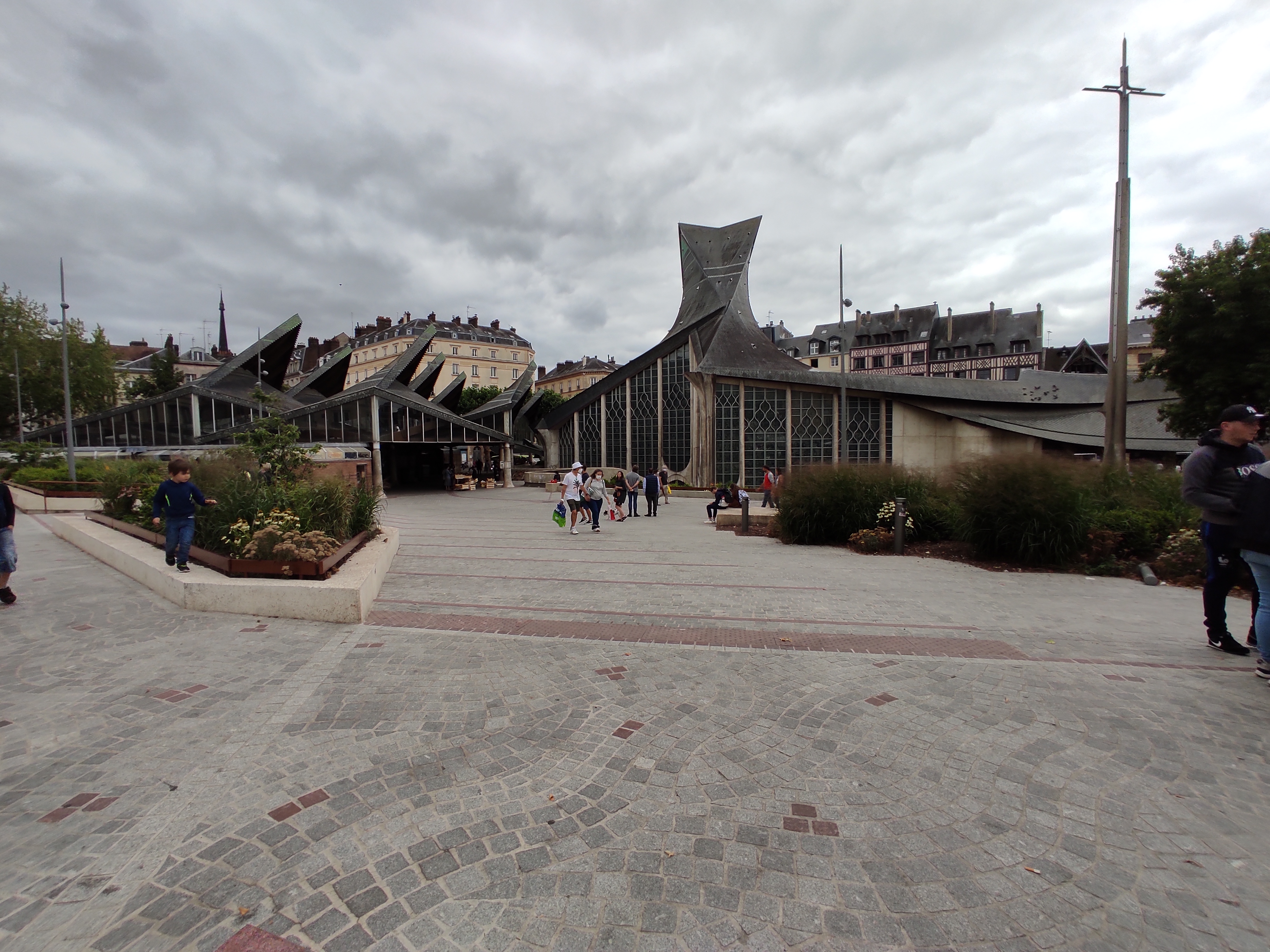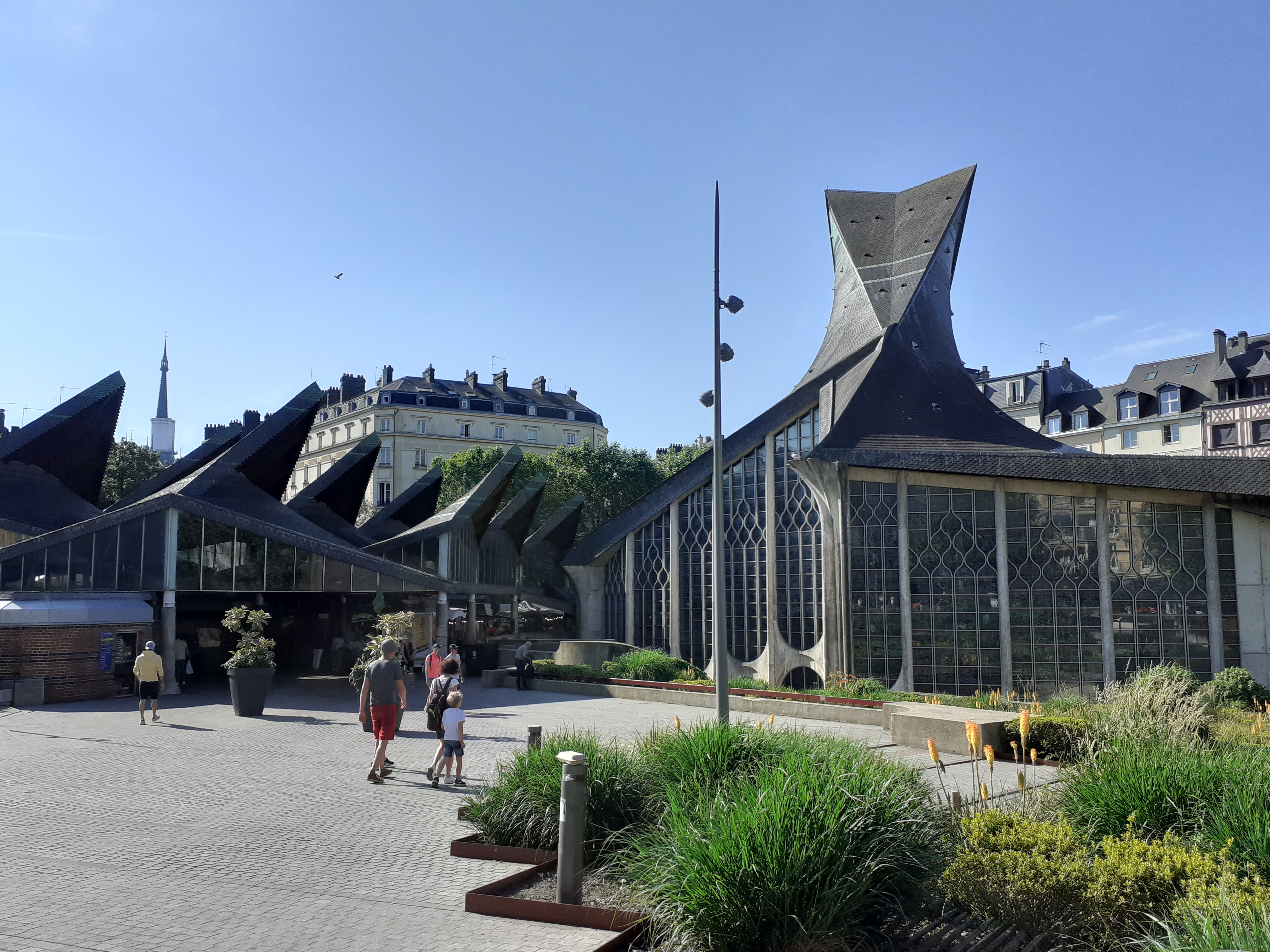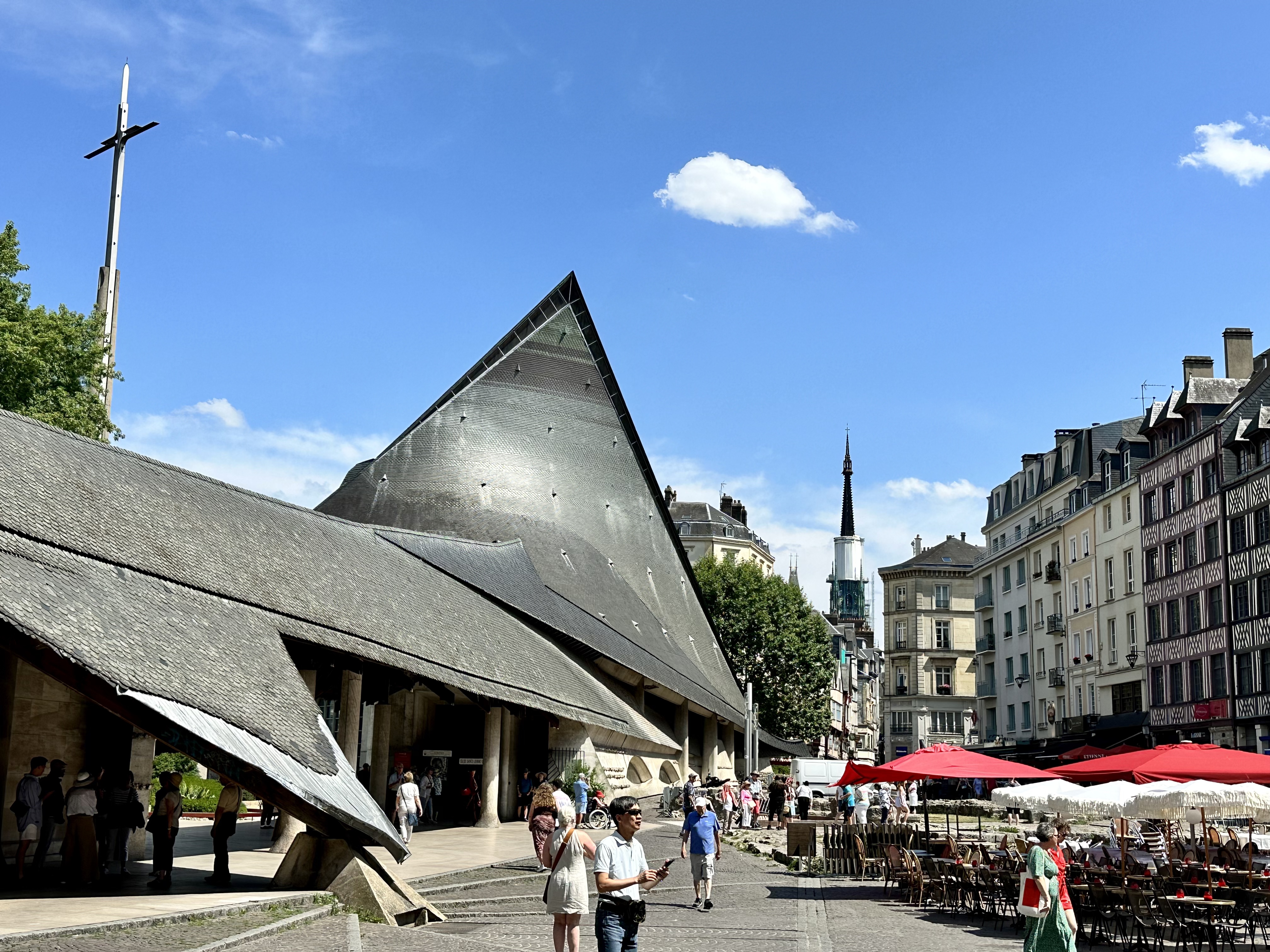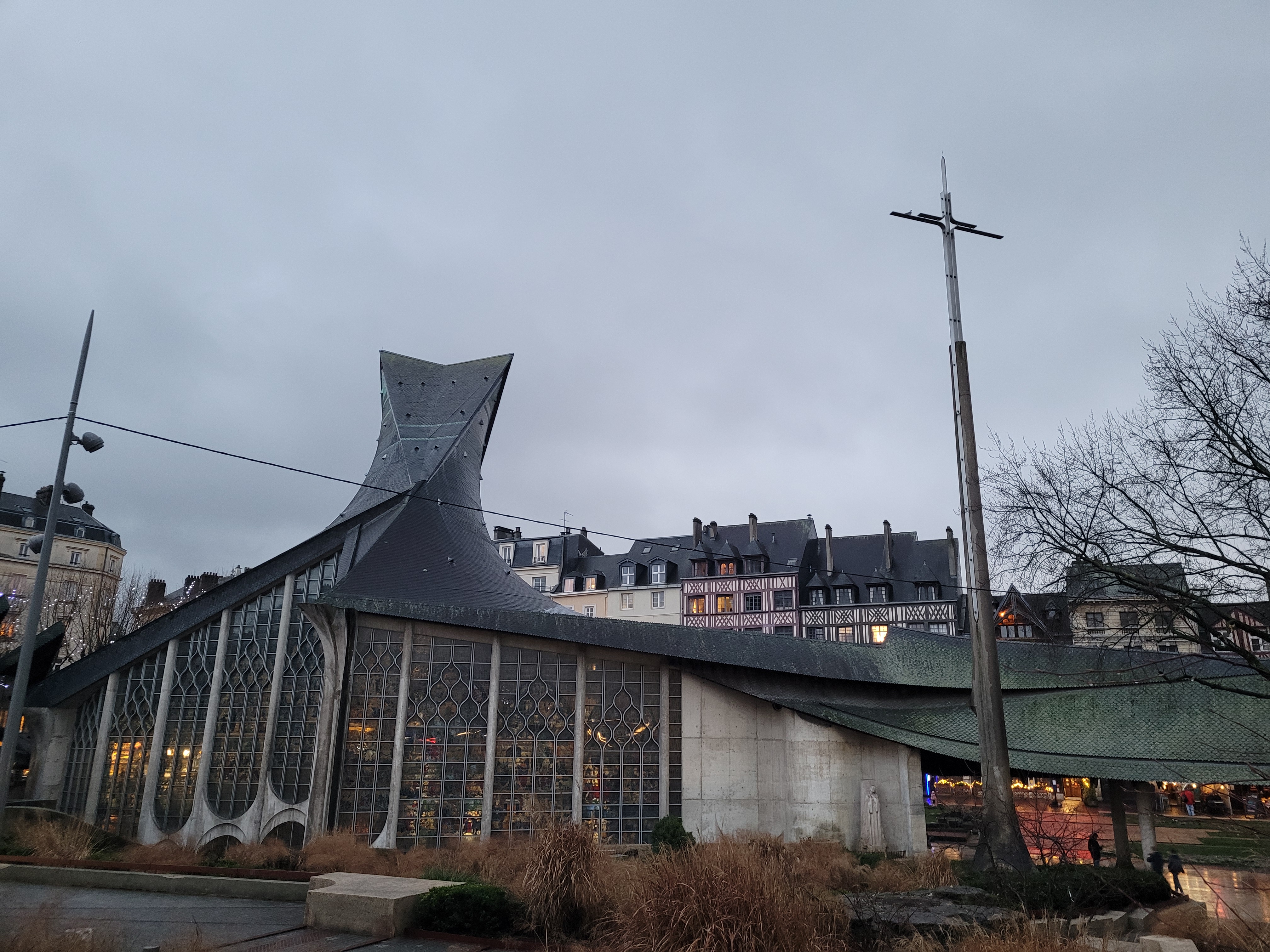 OK, c'est le lieu historique où Jeanne d'Arc a été brûlée vive, mais à mon humble avis, ils pourraient choisir un autre style architectural. L'église Jeanne l'Arc est une église ultra moderne faite de béton, de verre et de bois située au milieu d'une place médiévale avec des maisons à colombages et des rues pavées tout autour. On dirait qu'un OVNI s'est écrasé sur la place. Ce qui ajoute à son design original est le fait que sous l'autre partie du même toit se trouve un marché avec des étals de poissons, de viandes, de fruits et de légumes. Il s'agit en fait du vieux marché (Vieux Marche) d'époque médiévale. L'intérieur est très agréable, moderne également, et j'ai vu de telles églises à Berlin, Helsinki, Rio, etc., mais ici, un tel design ne convient tout simplement pas.