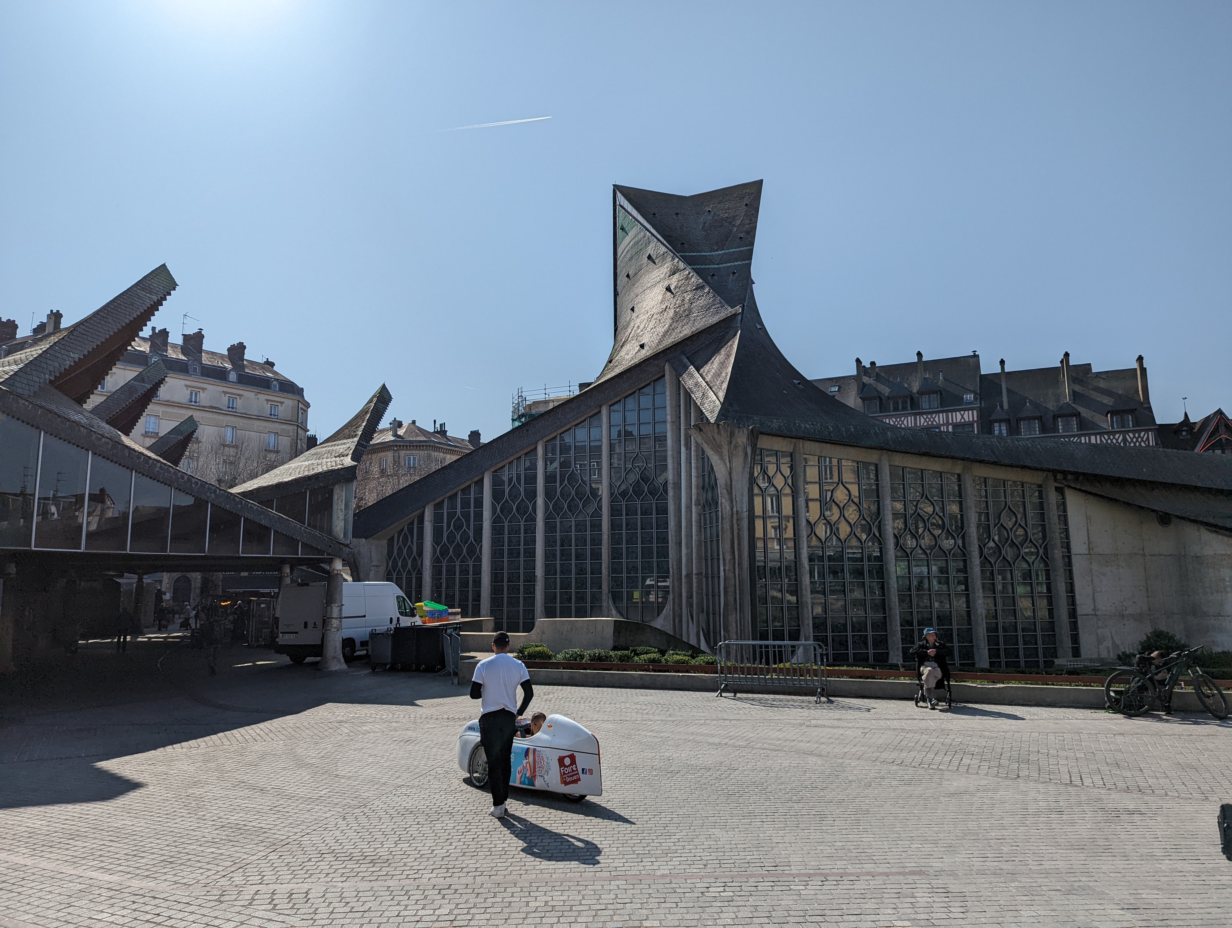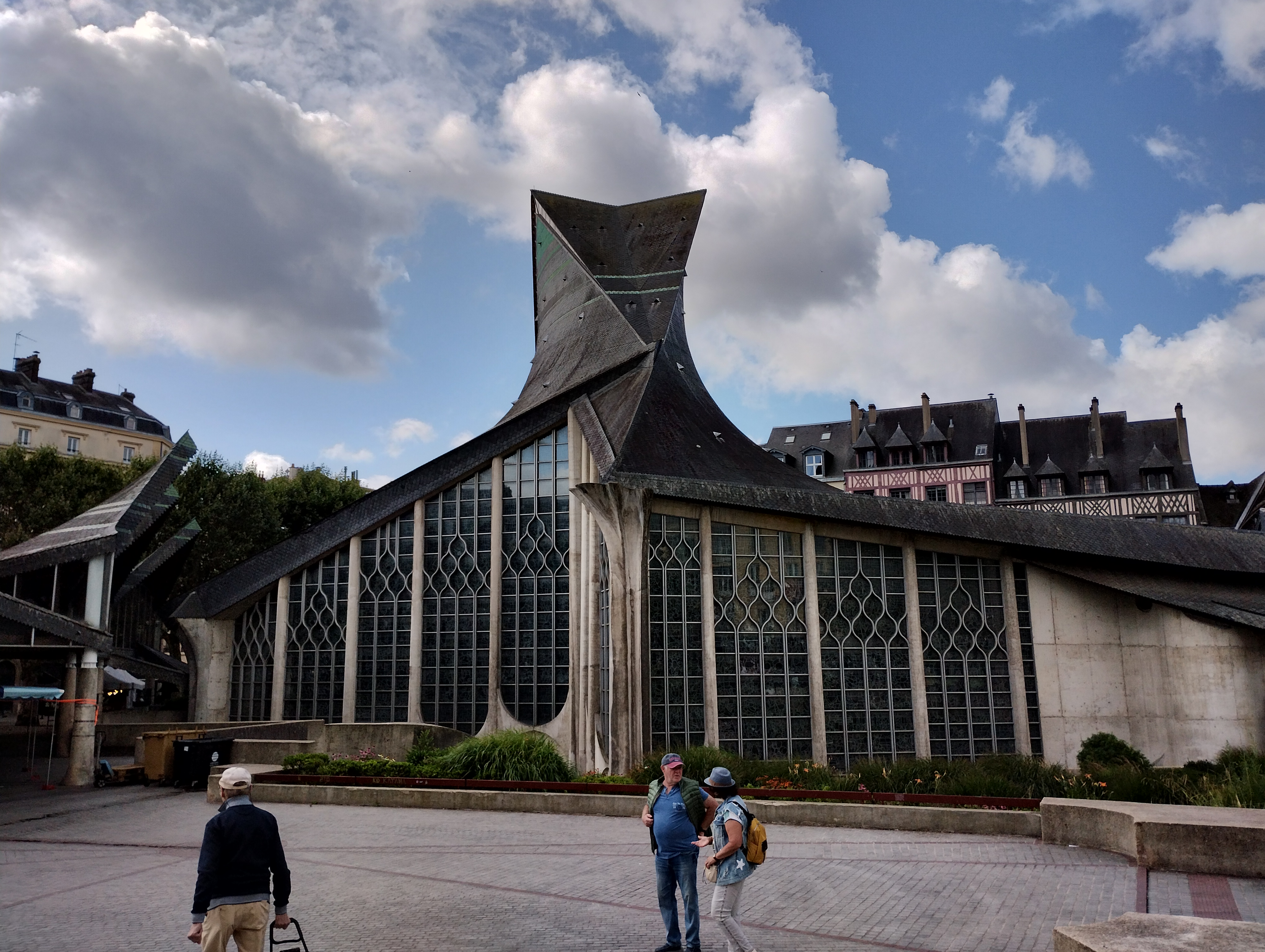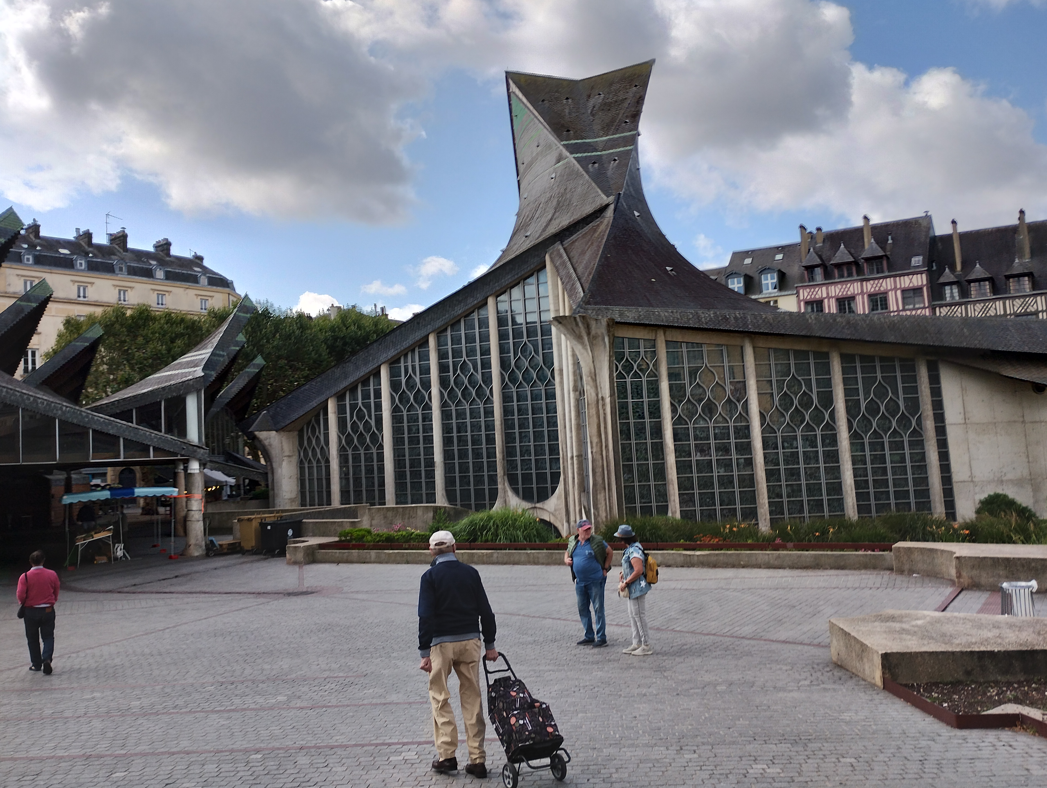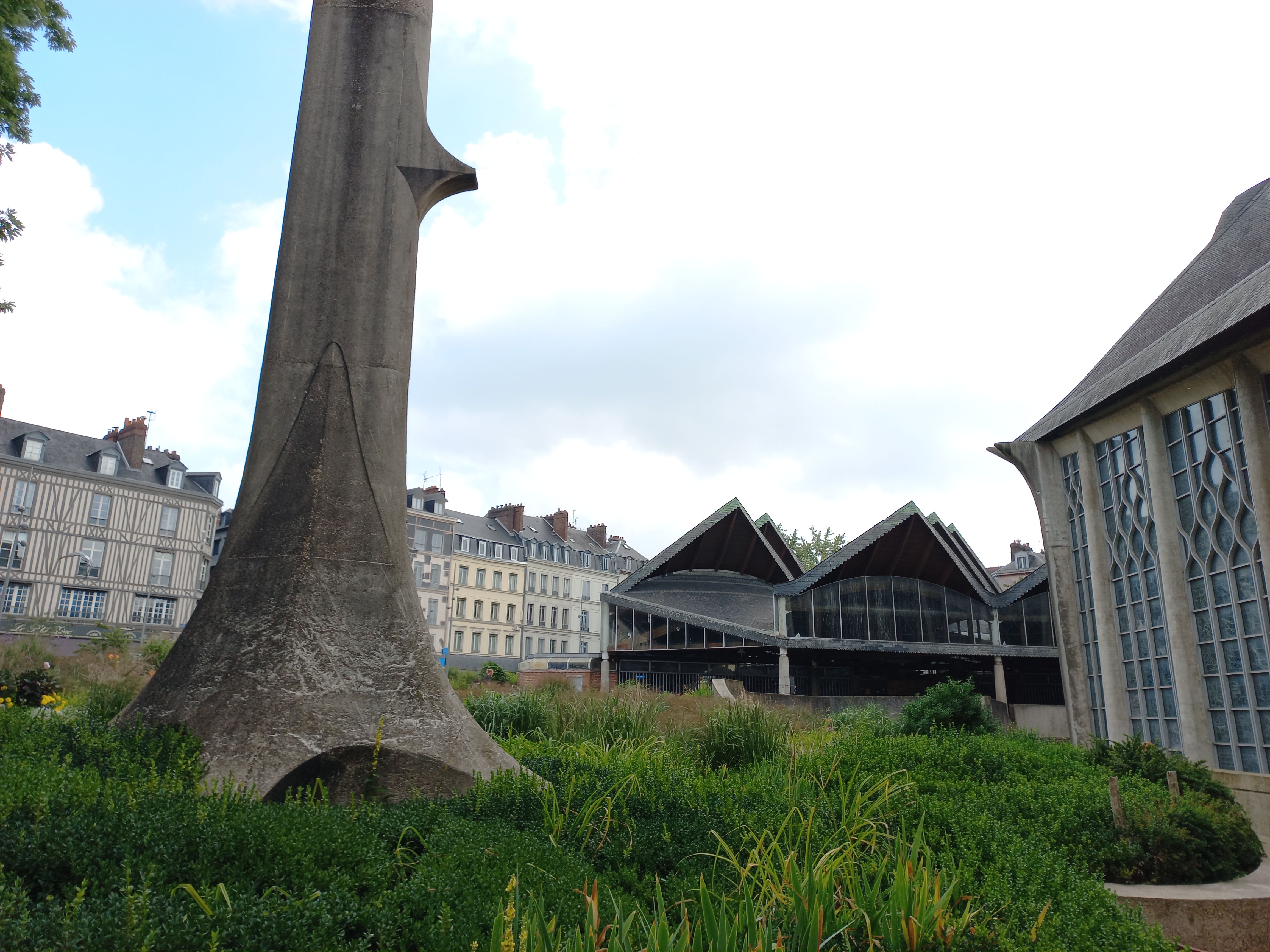 OK, c'est le lieu historique où Jeanne d'Arc a été brûlée vive, mais à mon humble avis, ils pourraient choisir un autre style architectural. L'église Jeanne l'Arc est une église ultra moderne faite de béton, de verre et de bois située au milieu d'une place médiévale avec des maisons à colombages et des rues pavées tout autour. On dirait qu'un OVNI s'est écrasé sur la place. Ce qui ajoute à son design original est le fait que sous l'autre partie du même toit se trouve un marché avec des étals de poissons, de viandes, de fruits et de légumes. Il s'agit en fait du vieux marché (Vieux Marche) d'époque médiévale. L'intérieur est très agréable, moderne également, et j'ai vu de telles églises à Berlin, Helsinki, Rio, etc., mais ici, un tel design ne convient tout simplement pas.