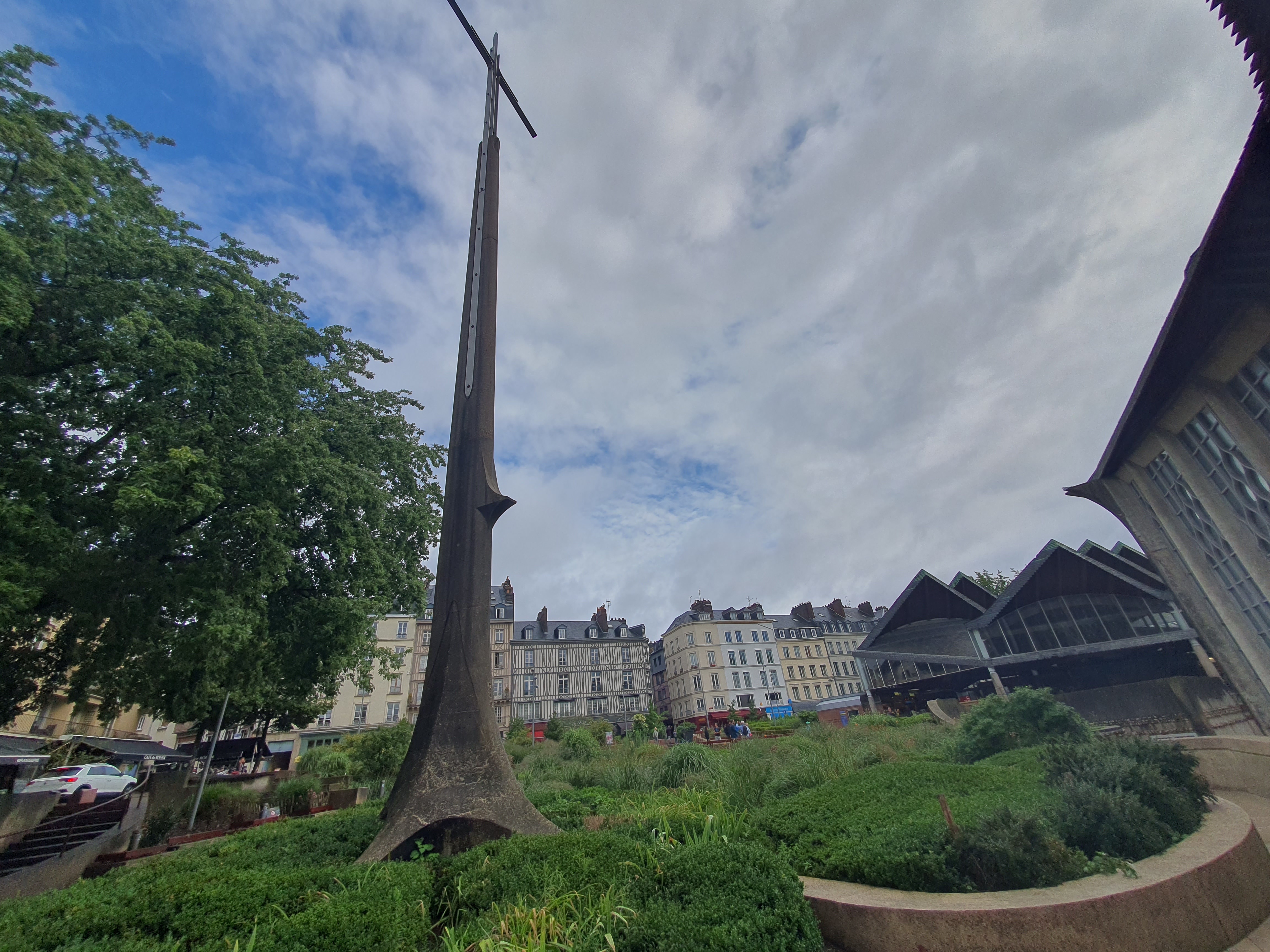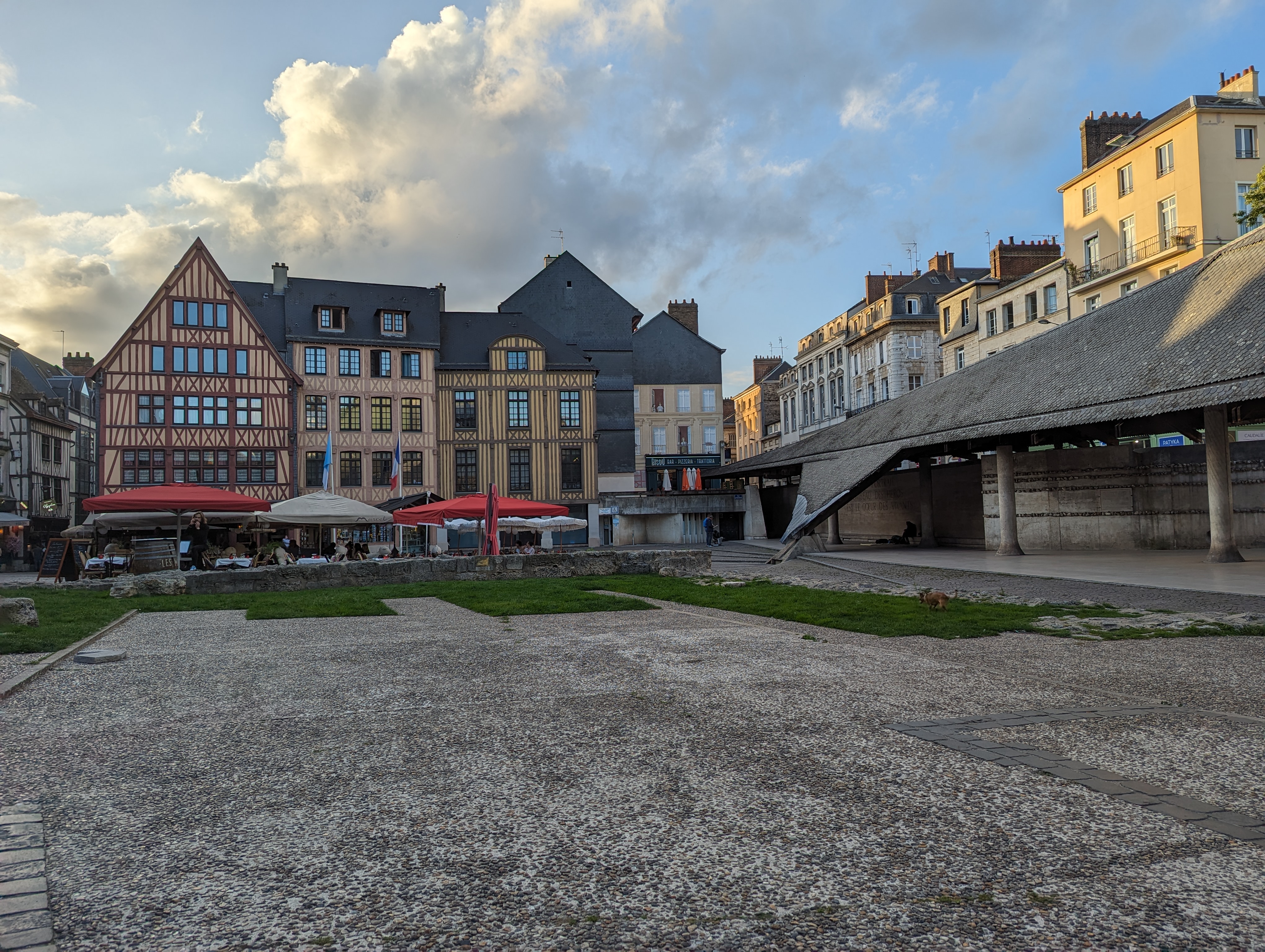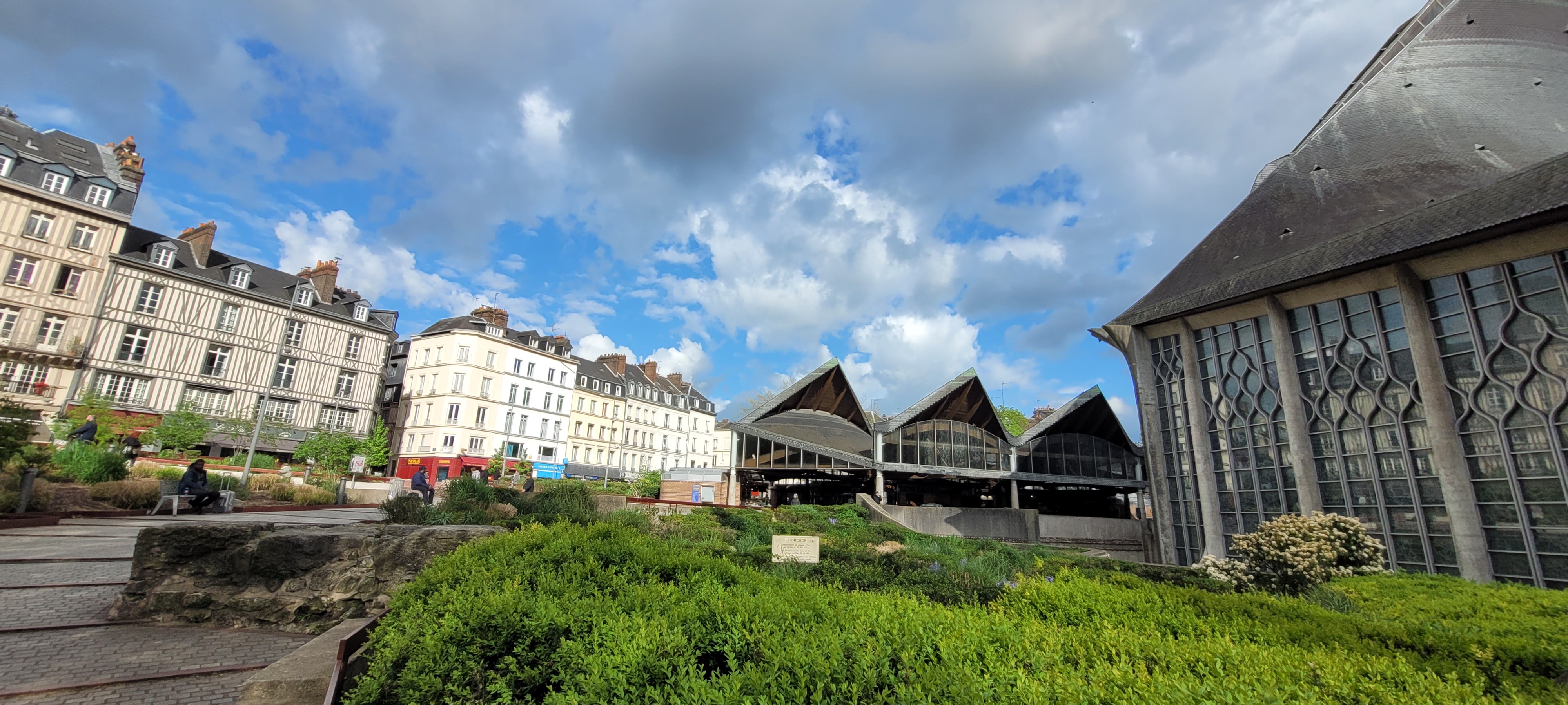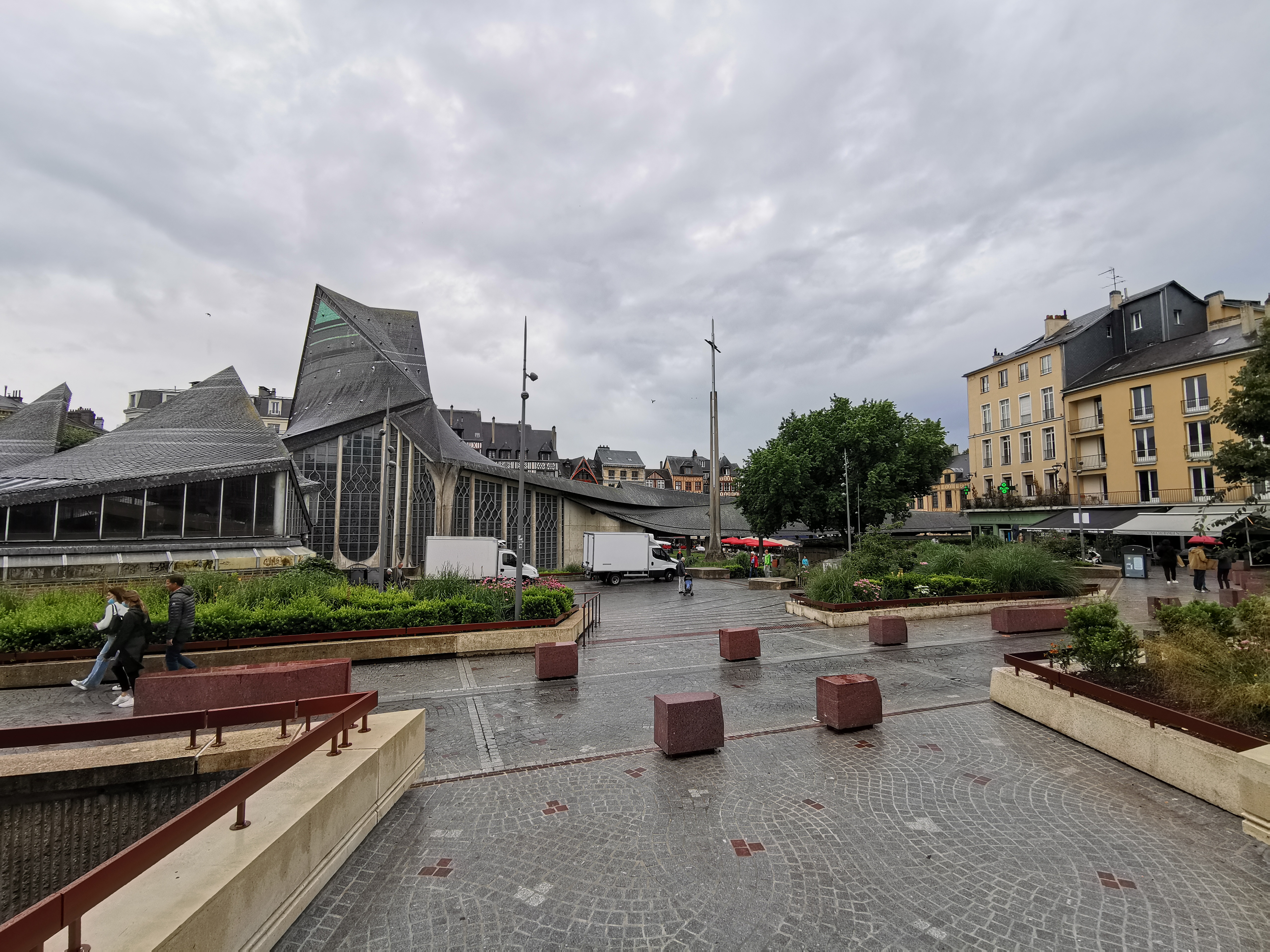 OK, c'est le lieu historique où Jeanne d'Arc a été brûlée vive, mais à mon humble avis, ils pourraient choisir un autre style architectural. L'église Jeanne l'Arc est une église ultra moderne faite de béton, de verre et de bois située au milieu d'une place médiévale avec des maisons à colombages et des rues pavées tout autour. On dirait qu'un OVNI s'est écrasé sur la place. Ce qui ajoute à son design original est le fait que sous l'autre partie du même toit se trouve un marché avec des étals de poissons, de viandes, de fruits et de légumes. Il s'agit en fait du vieux marché (Vieux Marche) d'époque médiévale. L'intérieur est très agréable, moderne également, et j'ai vu de telles églises à Berlin, Helsinki, Rio, etc., mais ici, un tel design ne convient tout simplement pas.