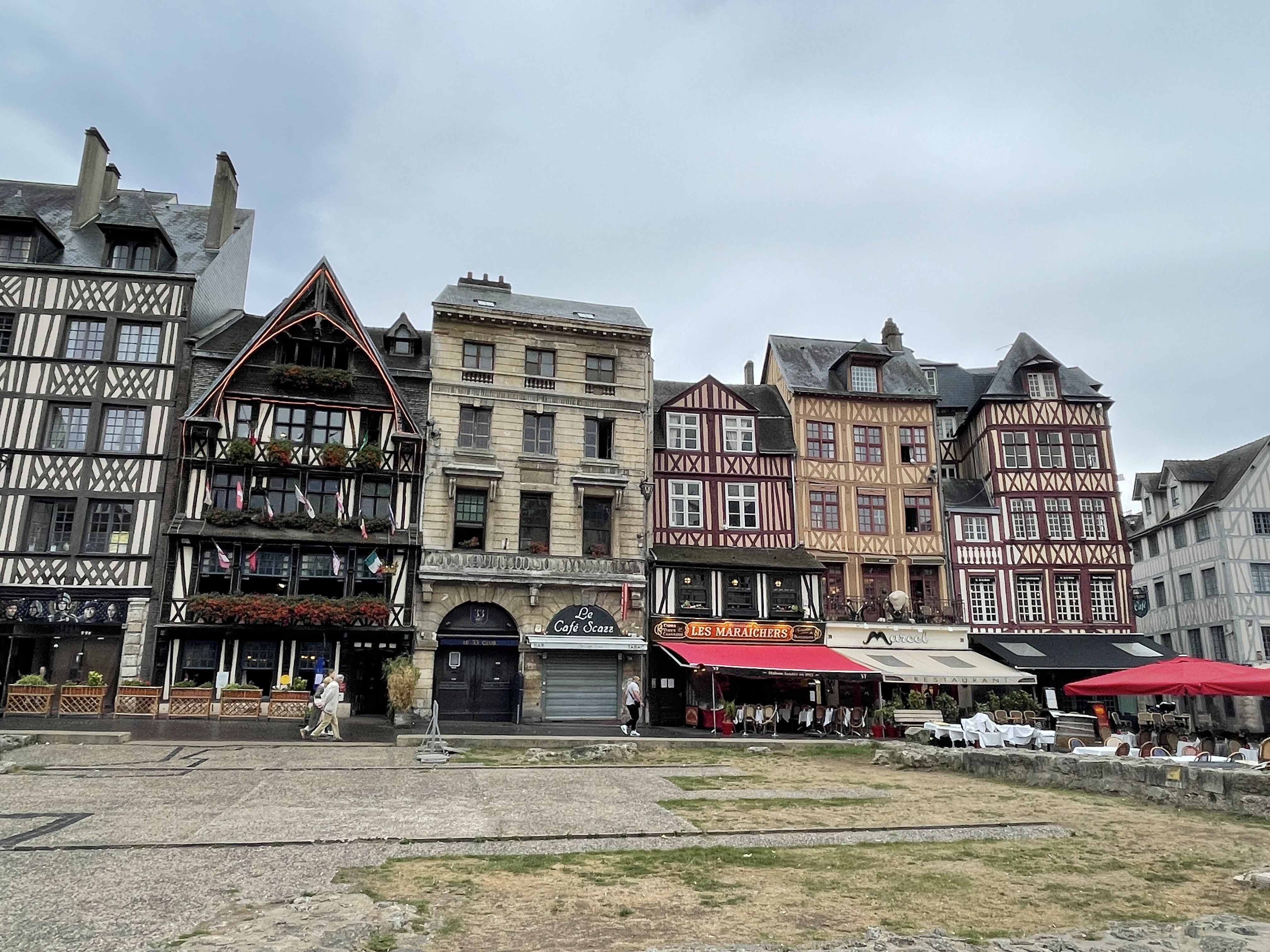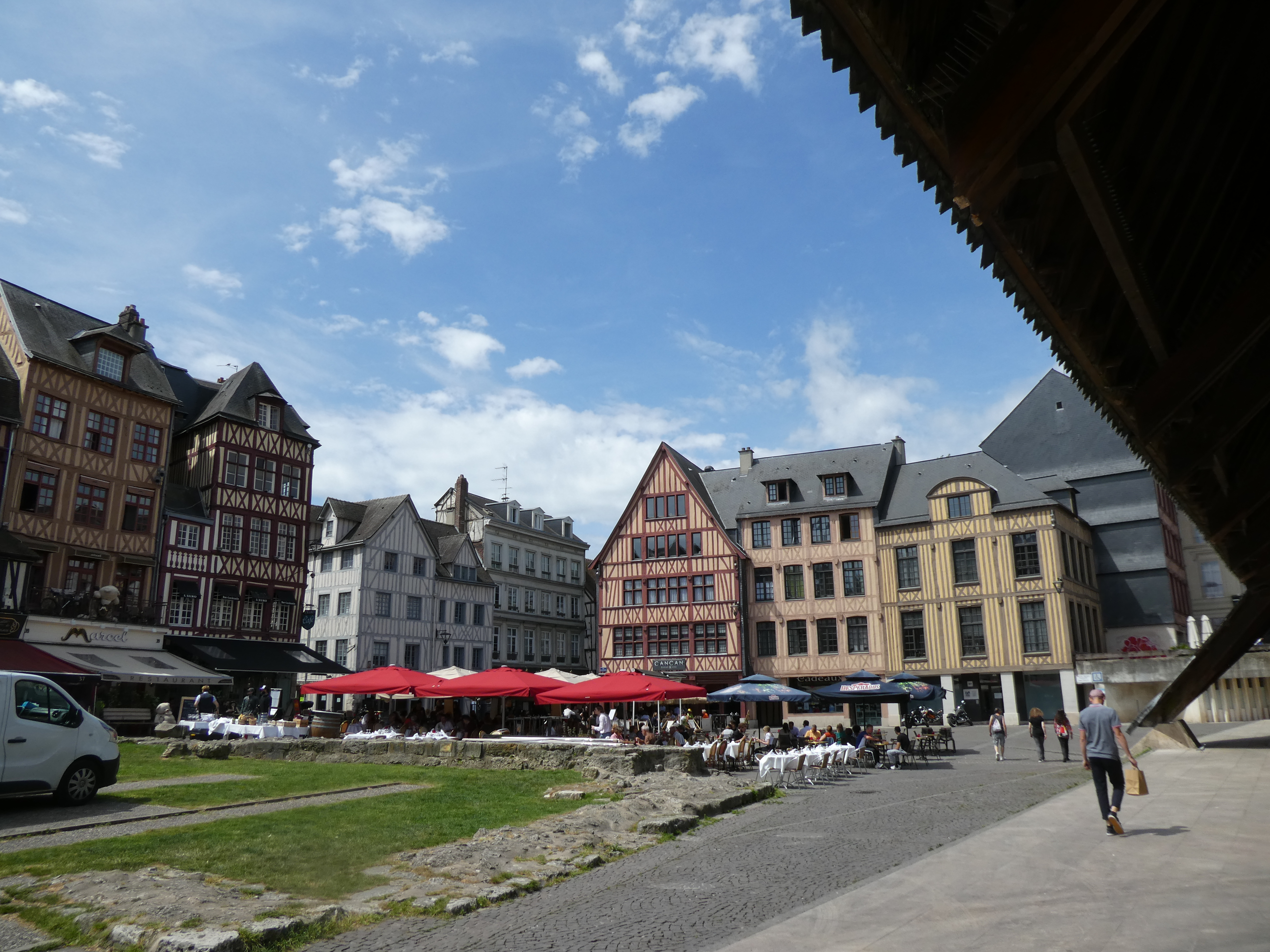 très agréable de se promener dans les veilles ruelles et les belles places avec de nombreuses façades typiques et bien décorées; on peut y découvrir également le bucher de Jeanne d'Arc et l’église qui a une architecture assez originale ; dommage de retrouver toujours les mêmes enseignes de magasins dans les rues autour...