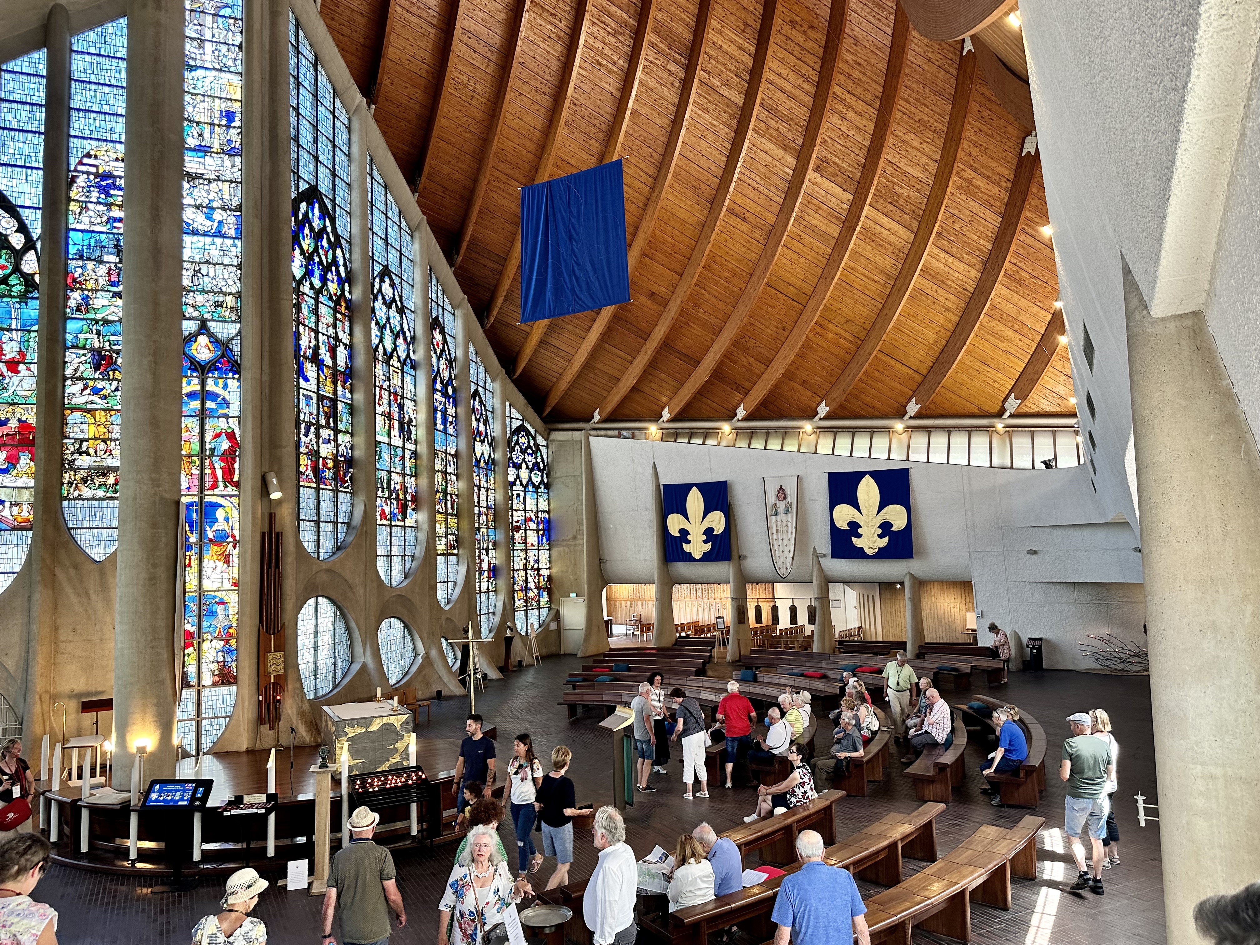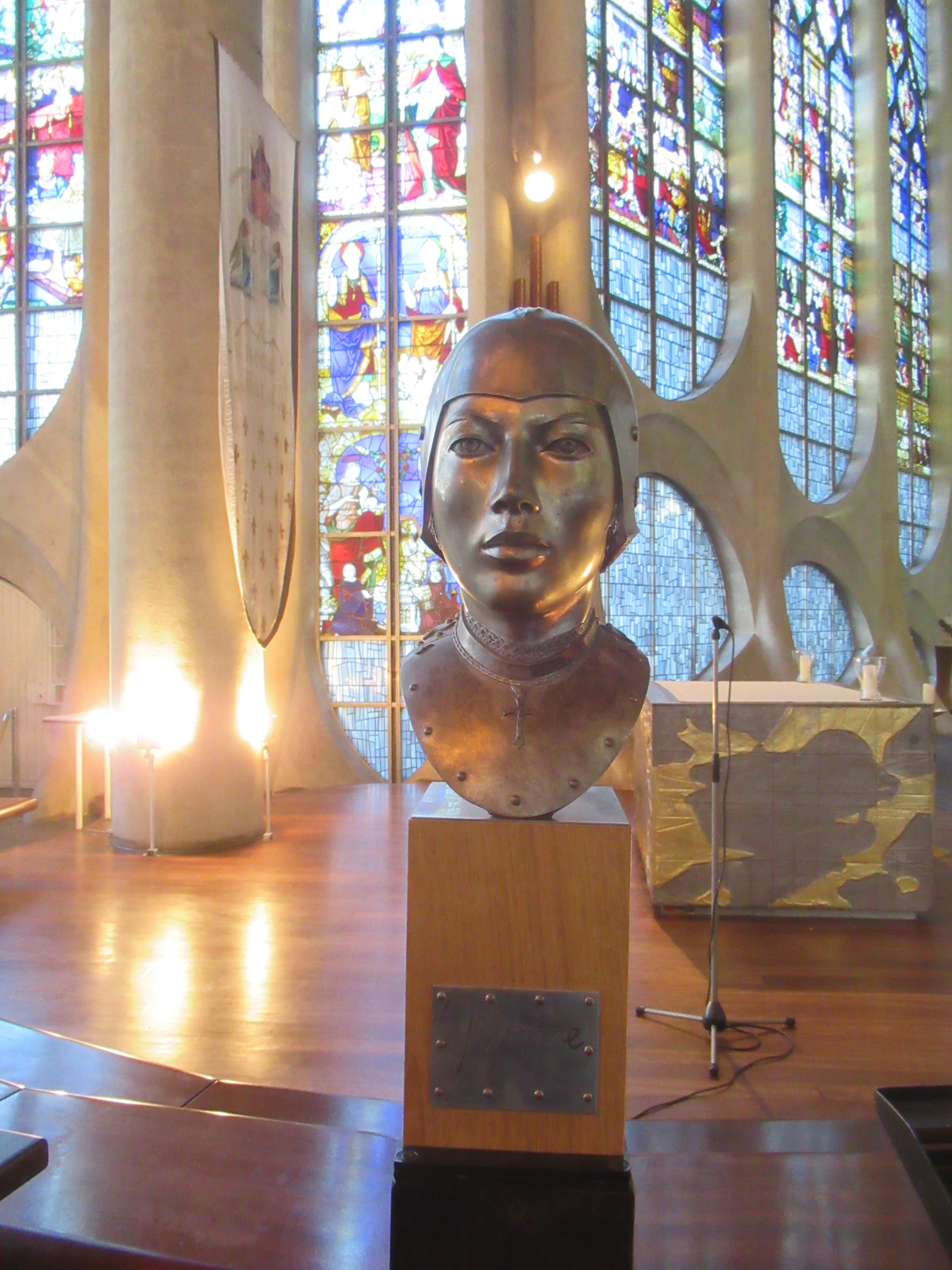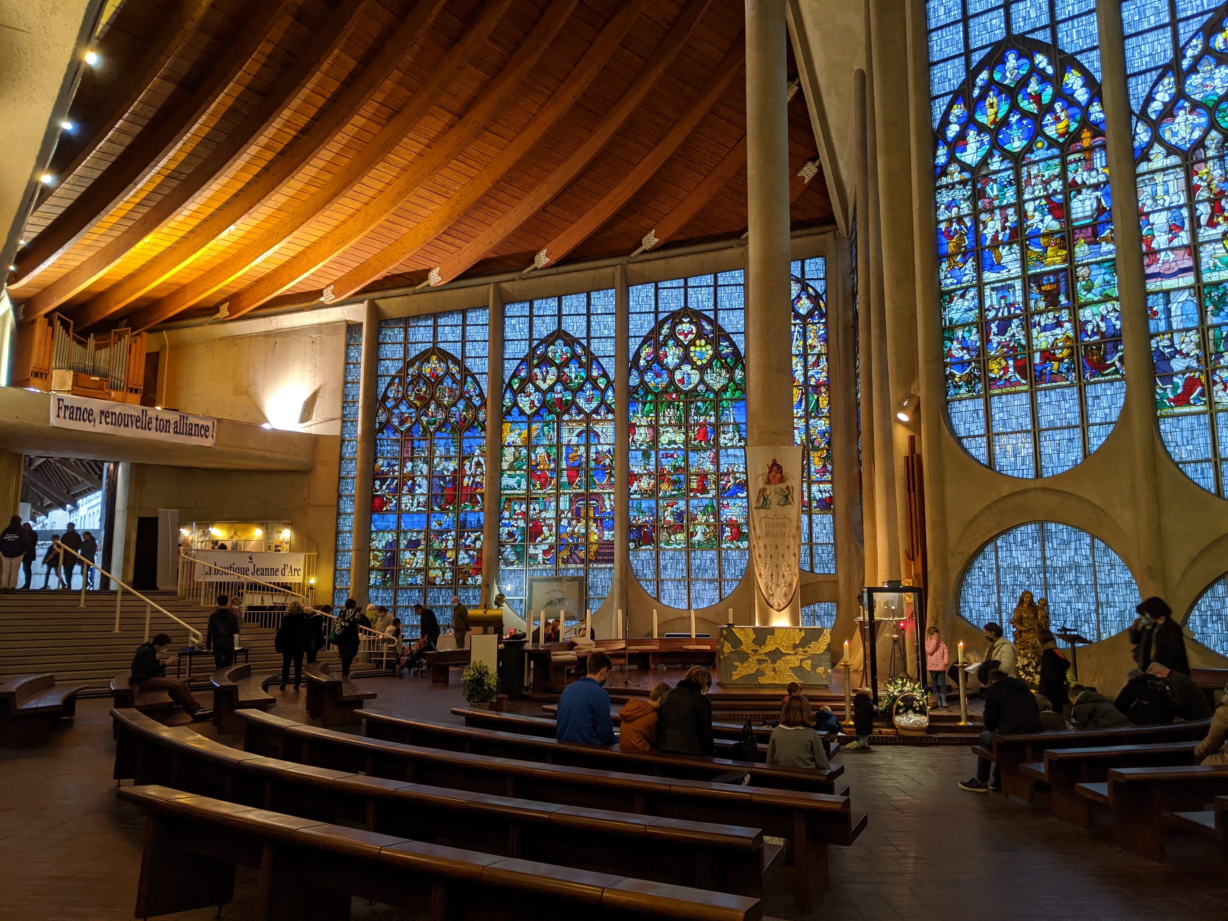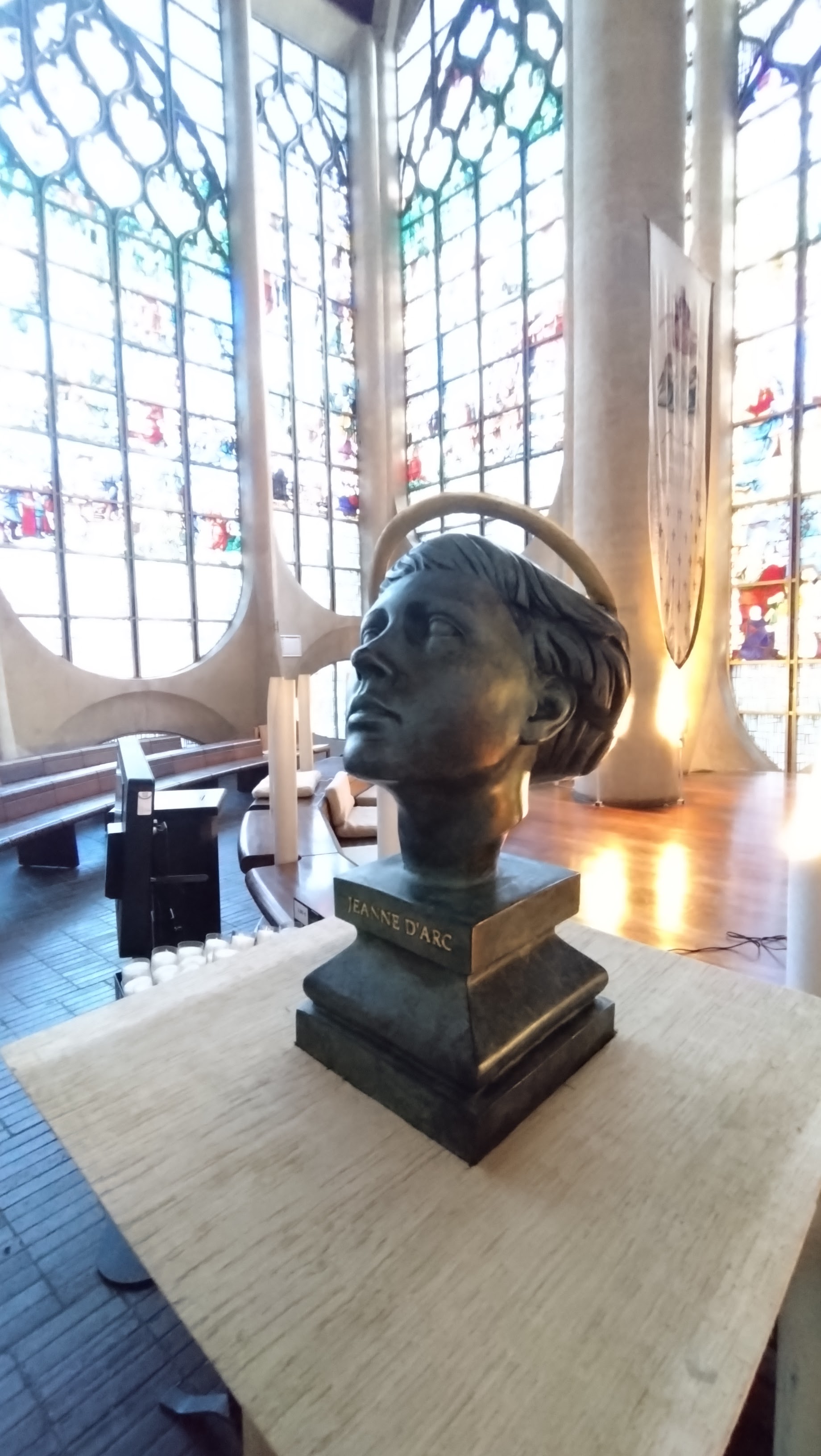 Surprenant coquillage de béton à l'extérieur, cet édifice s'ouvre sur un large escalier qui descend jusqu'au niveau des sièges tournés vers l'autel. Une étincelante clarté pénètre en ce jour d'été caniculaire par les vitraux récupérés d'une église détruite en 1945 dont la beauté magnifie ce lieu. Plusieurs rappels du sort fait à Ste Jeanne d'arc ponctuent différents coins de la salle. Tout cela vaut la visite et le moment de recueillement que ce lieu inspire, à quelques mètres de la croix dressée en souvenir de la sainte.