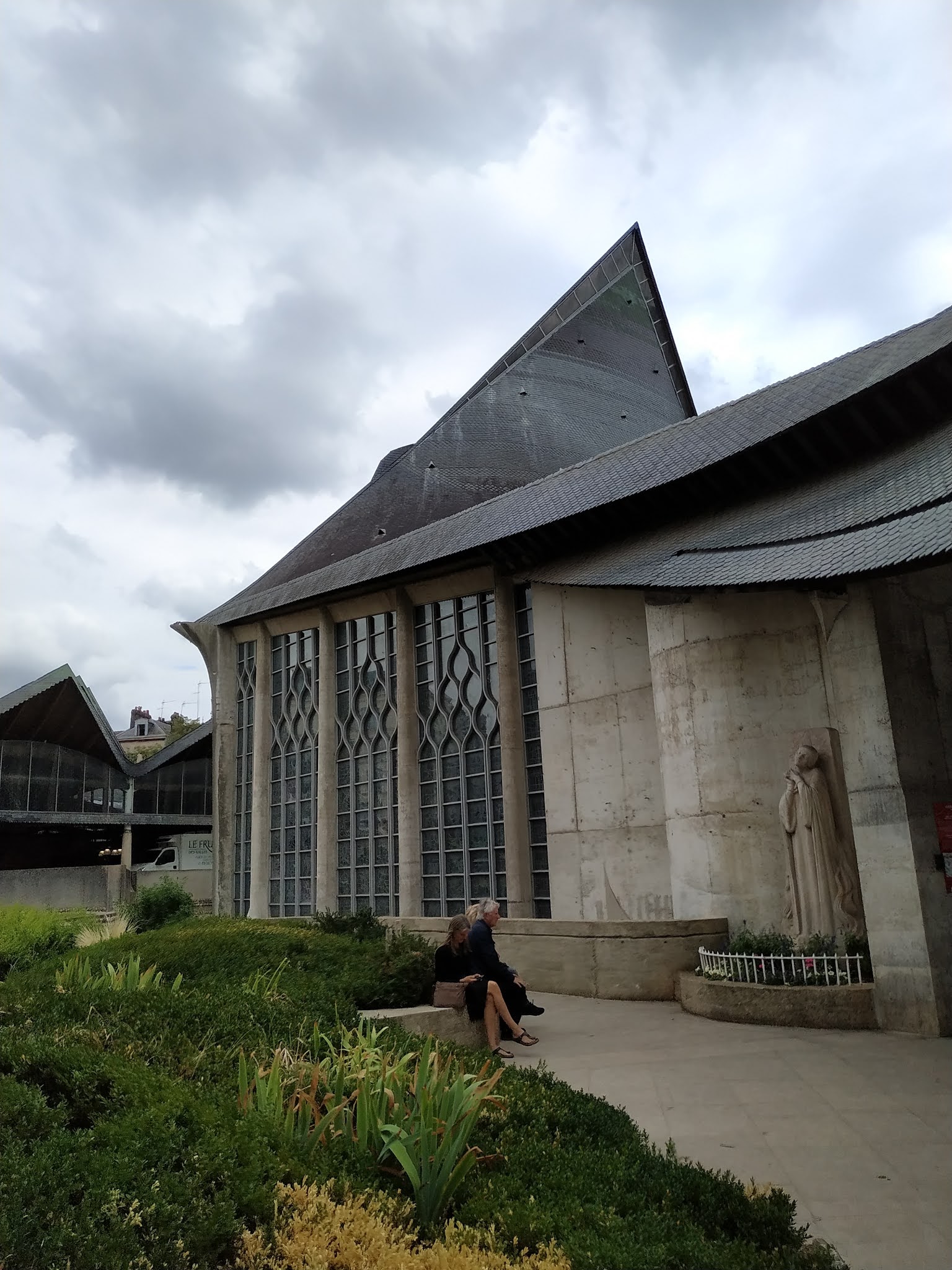 Église à la structure atypique ,ma moitié y vois le casque de Jeanne d'arc, superbe vitraux retraçant l'épopée de la pucelle.