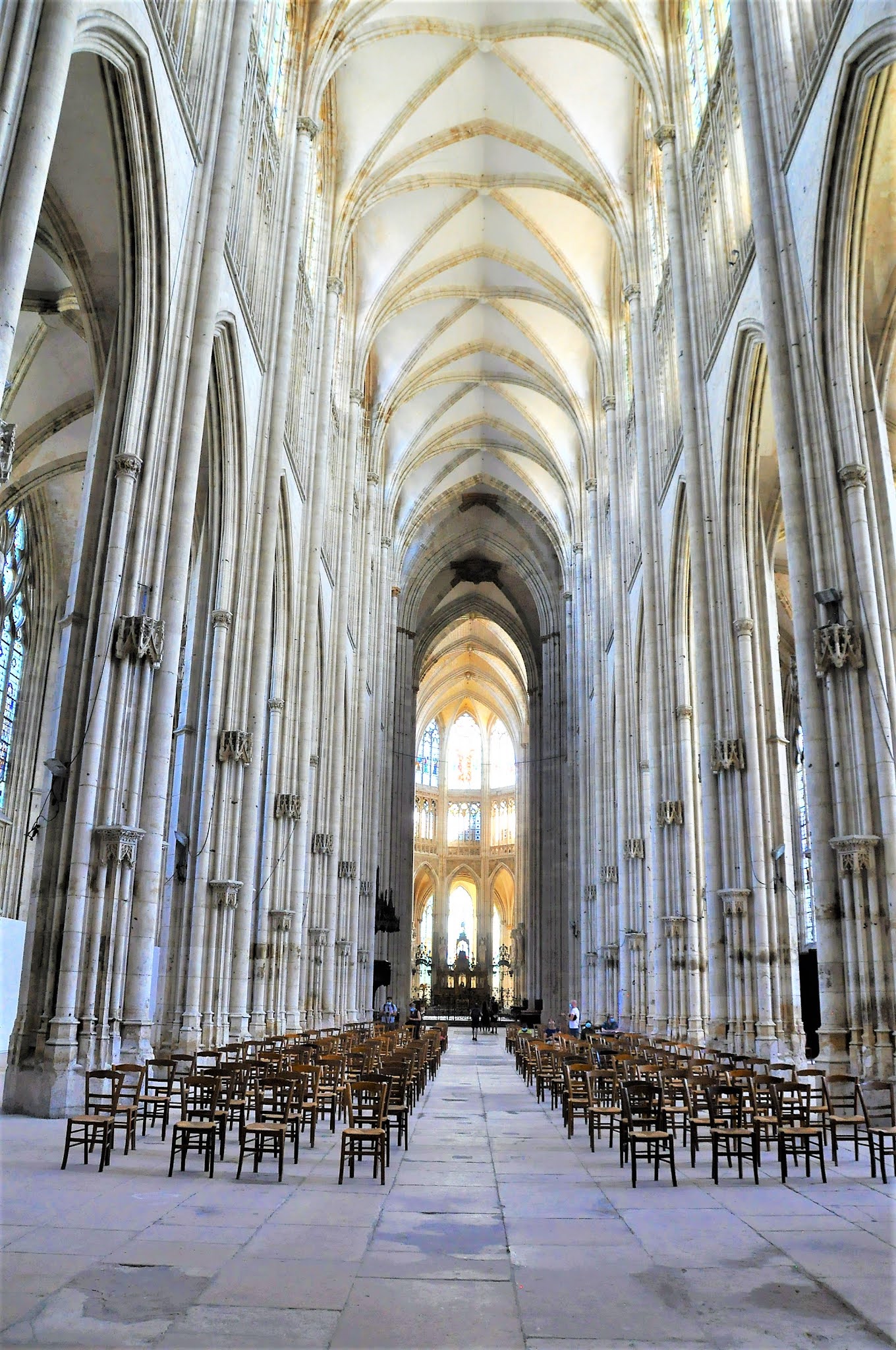 Une structure contemporaine en architecture de cercle. Plus conviviale qu'une allée centrale, et surtout de magnifiques vitraux, dont certains anciens furent reconstitués après la destruction de Rouen par les bombardements. A voir.
