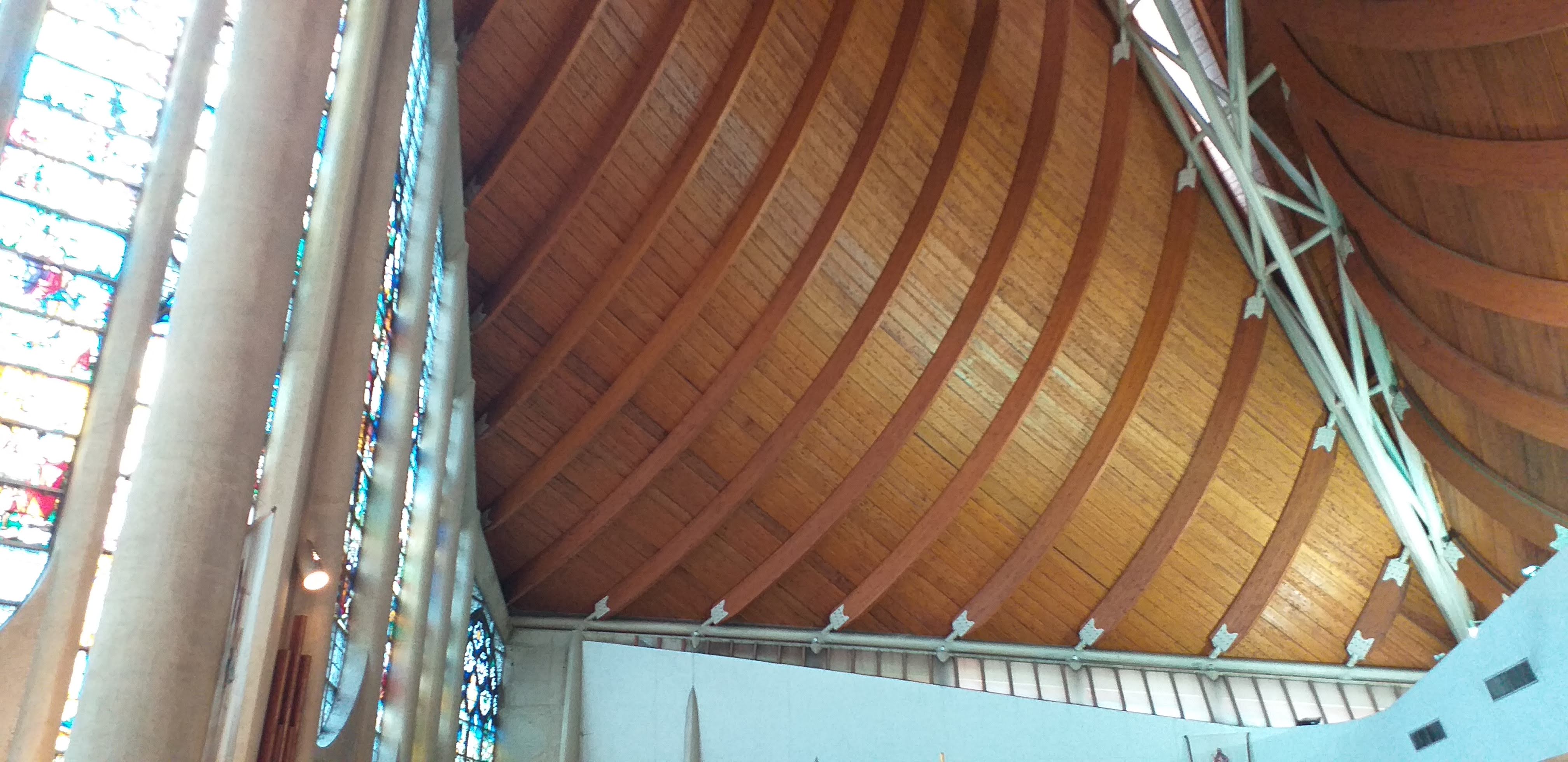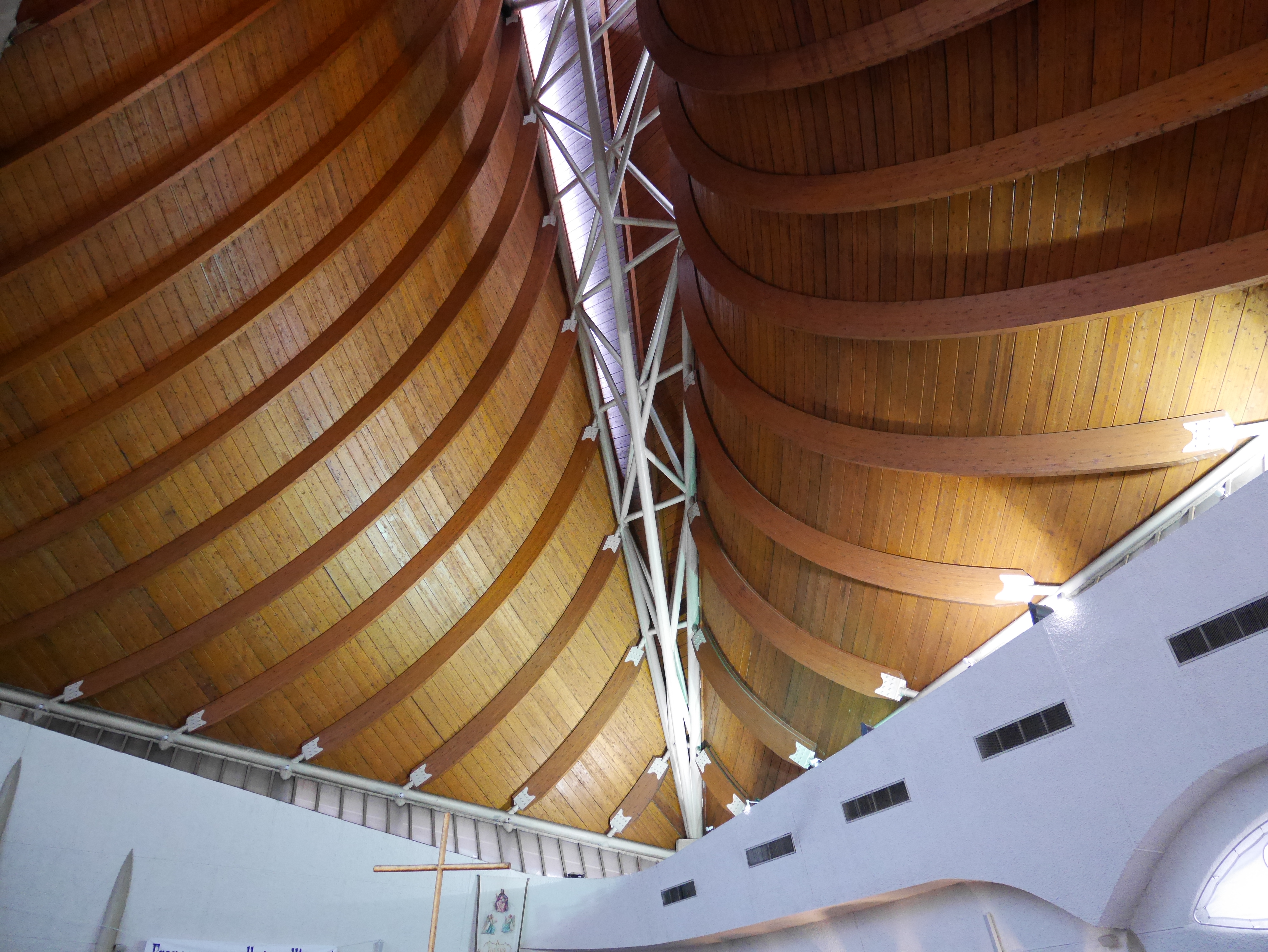 Très belle église catholique de l'intérieur. Très moderne avec son plafond style coque de bateau. Vitraux colorés