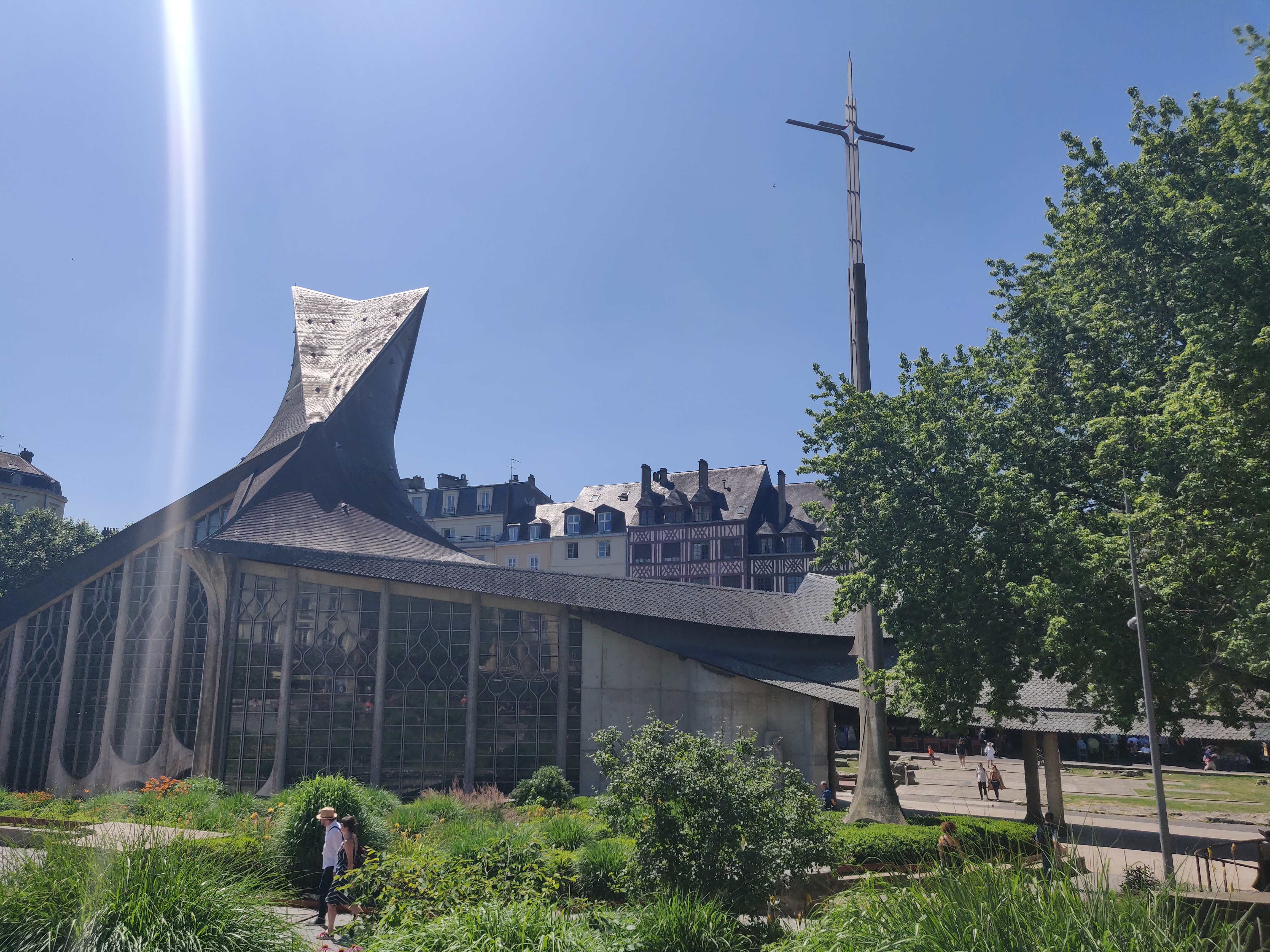 Une version moderne et intéressante d'un édifice religieux, vaguement inspirée d'un drakkar viking (les Vikings étant les Normands « originaux »). La lumière des vitraux est très apaisante. Même s'il n'a pas la grandeur et l'ampleur de la cathédrale gothique voisine, c'est un endroit agréable pour s'asseoir et réfléchir, au cœur d'une place animée. C'est également sur place que Jeanne d'Arc fut brûlée sur le bûcher, un événement marquant de la guerre de Cent Ans entre l'Angleterre et la France.