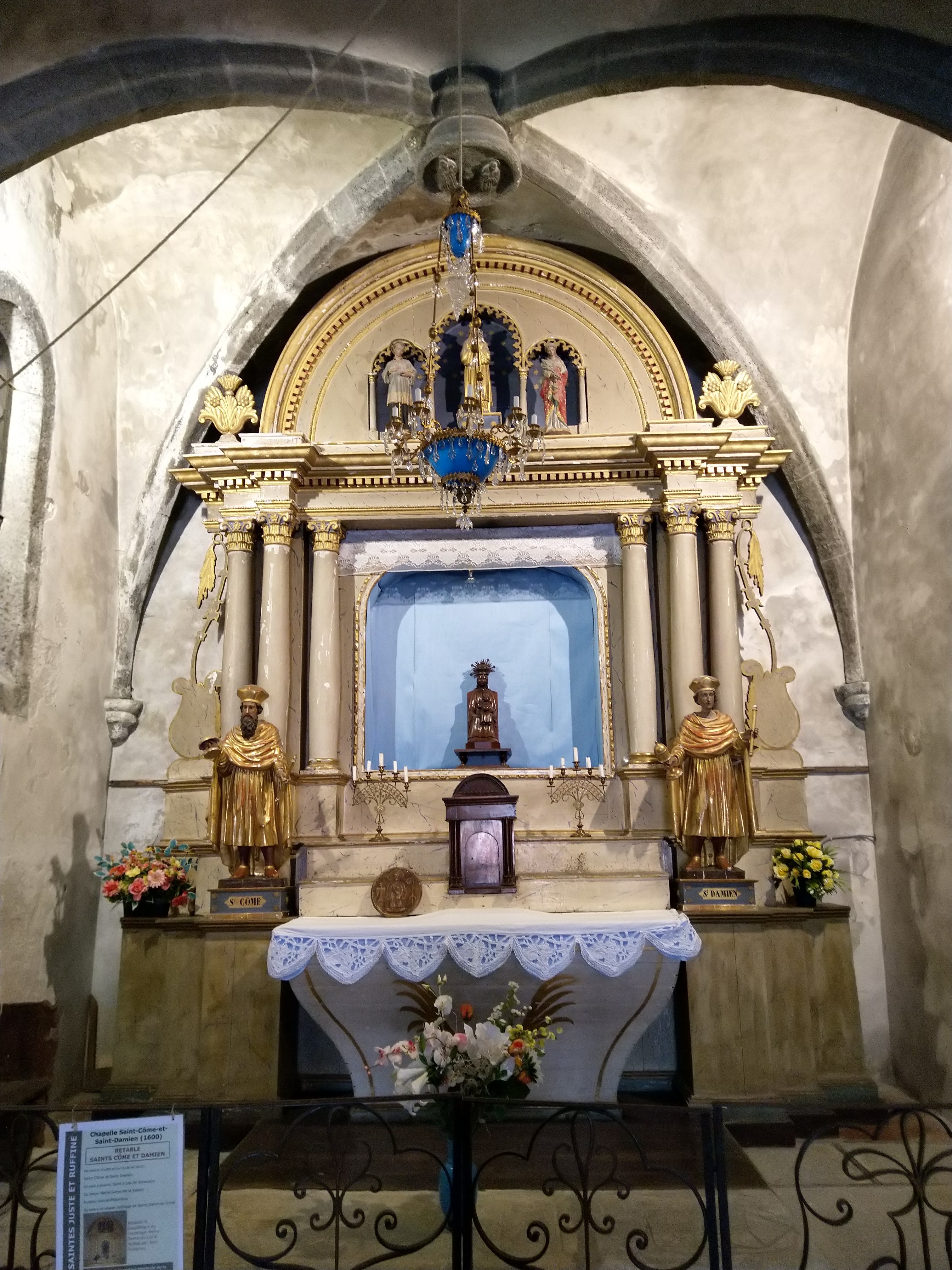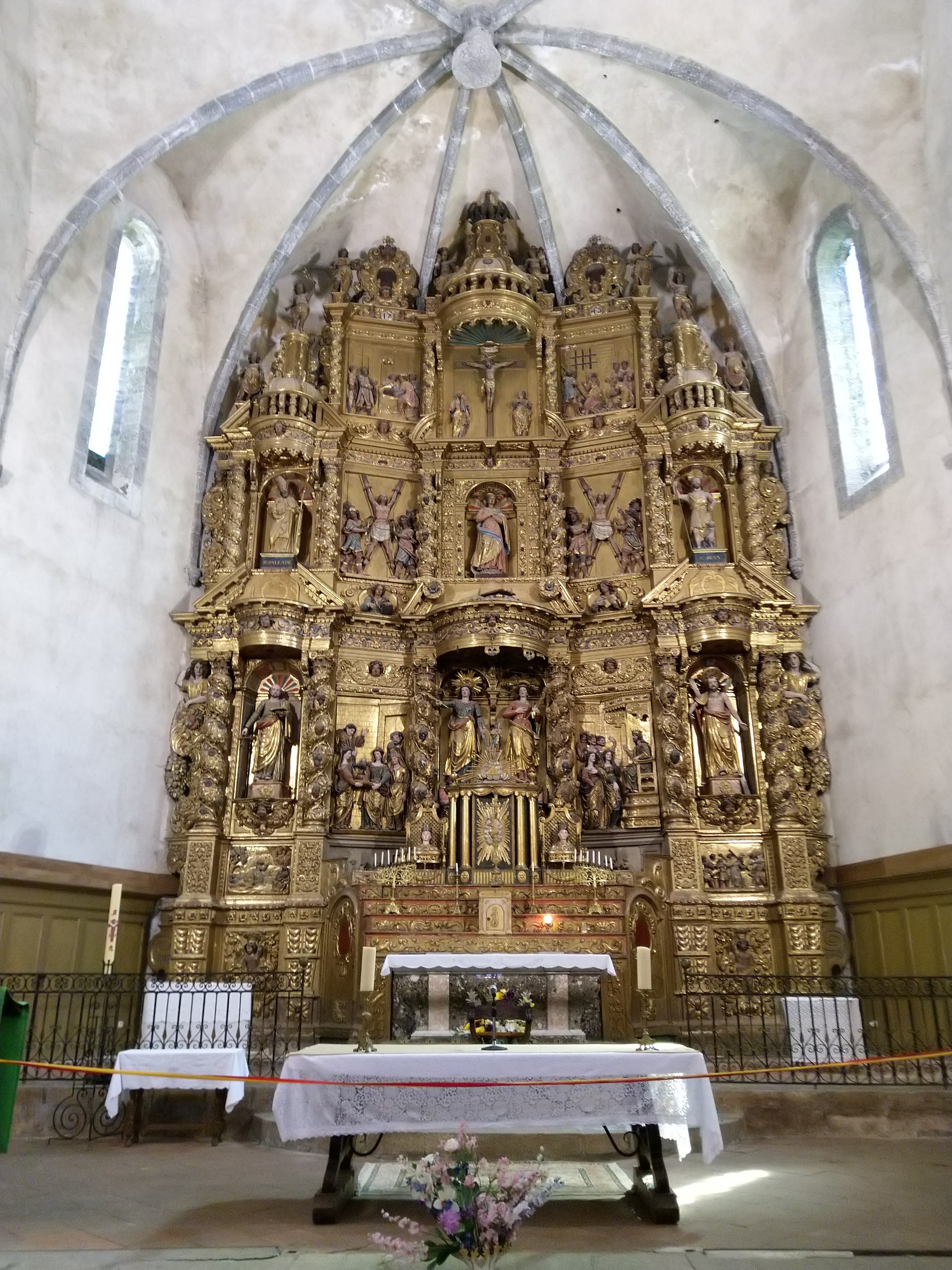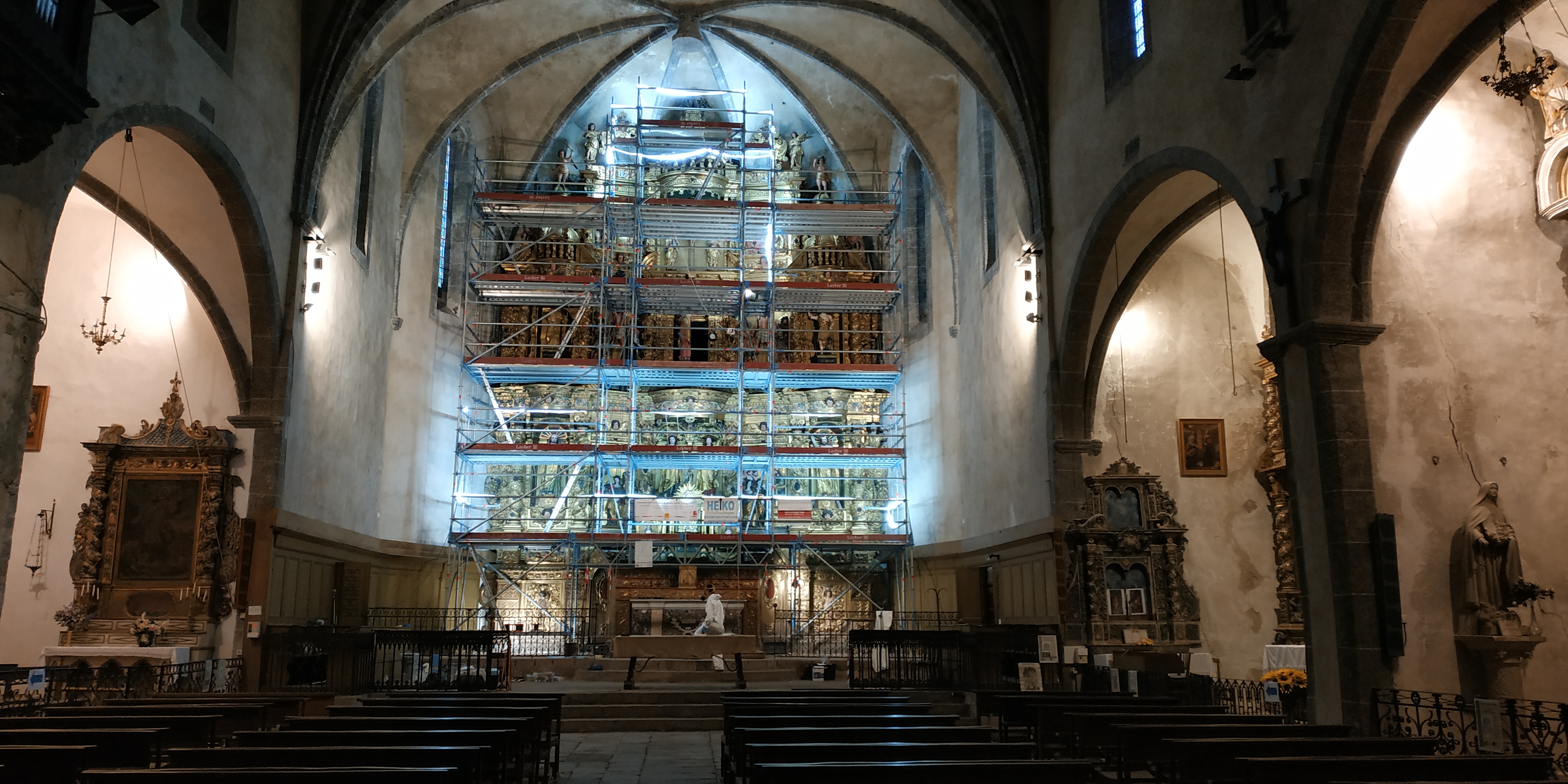 Le retable est en cours de rénovation. Merci aux charmantes demoiselles qui le restaurent d'avoir pris pour moi quelques photos car l'entrée est interdite au public ...