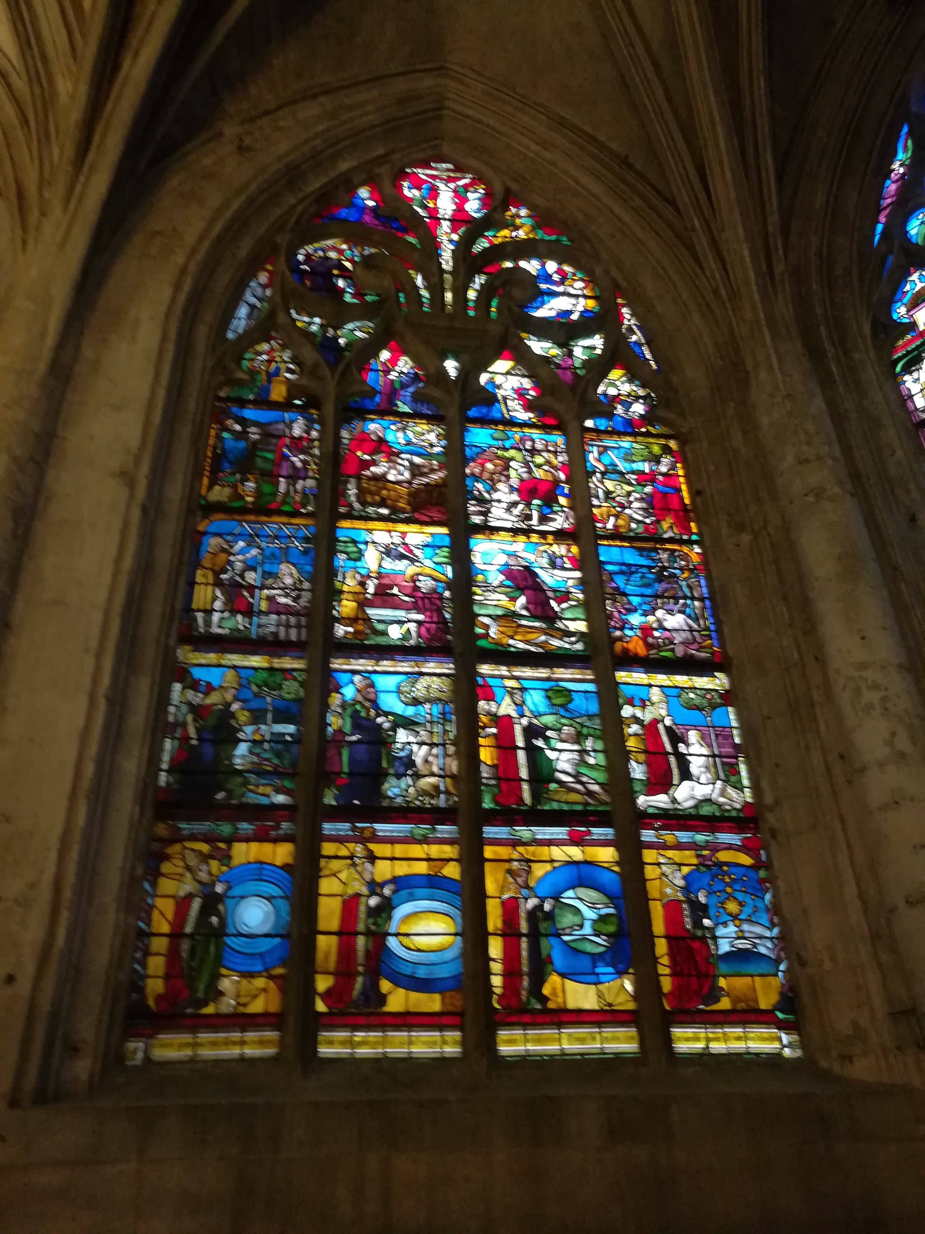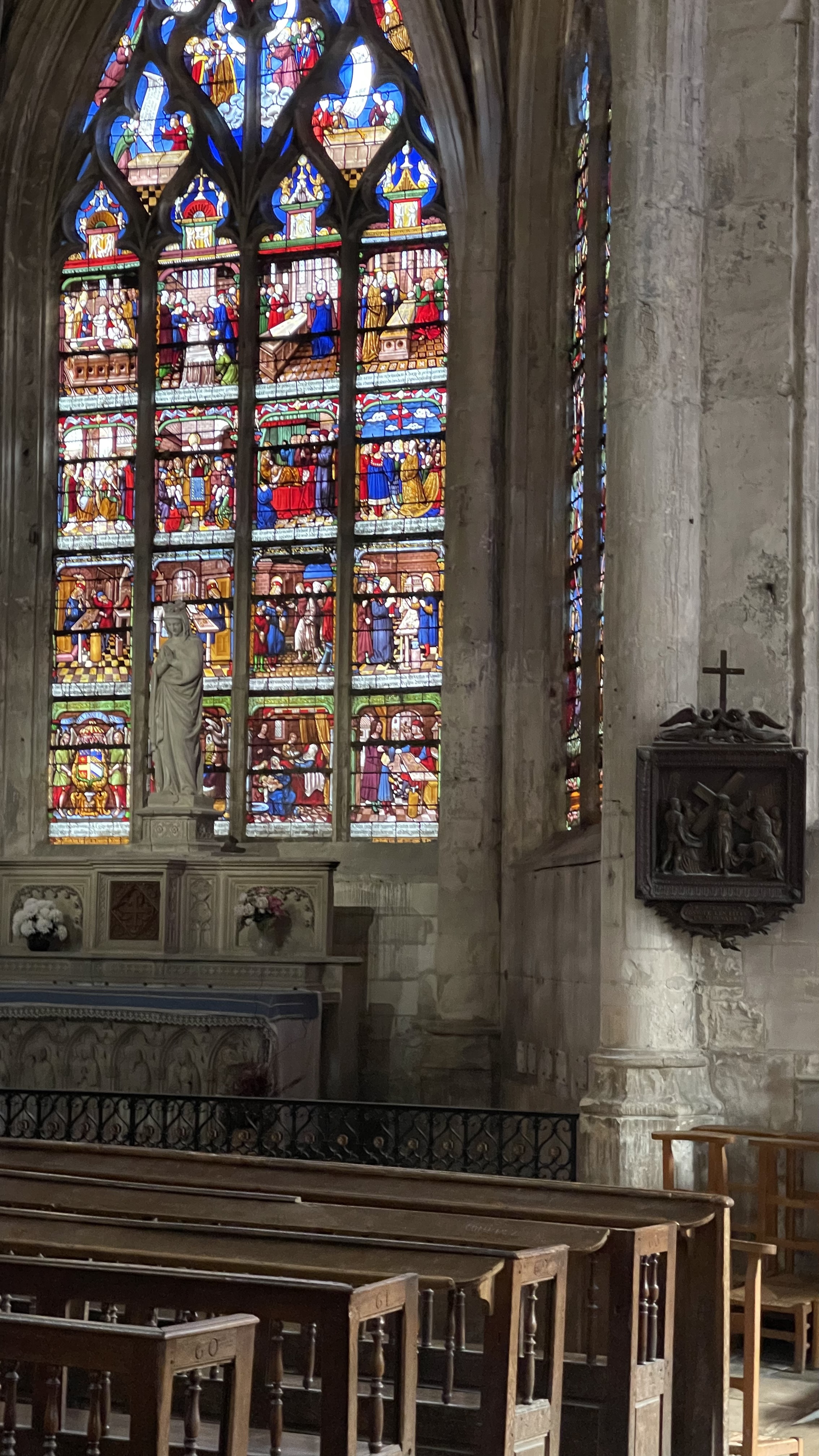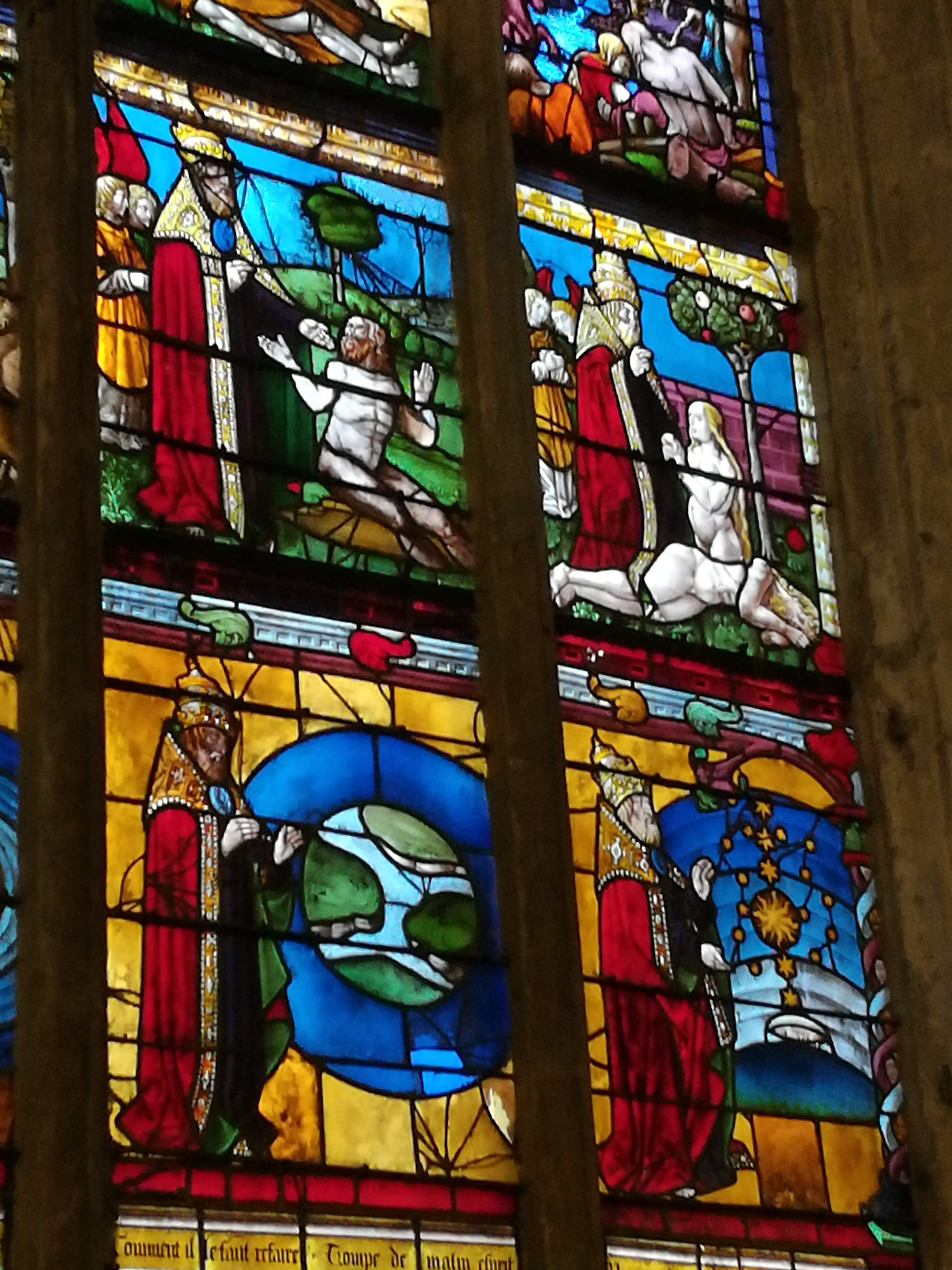 L'étonnant vitrail de la création du monde , les dentelles de pierre, les sculptures sur bois ou pierre ...Une visite ne suffit pas pour tout voir, pour apprécier....à bientôt! J'ai adoré le petit Jardin des Innocents juste accolé. Ces structures reprenant les courbes des arcs de voûtes, ces tressages en métal... malgré sa petitesse, il est possible de s'isoler ....se perdre!
