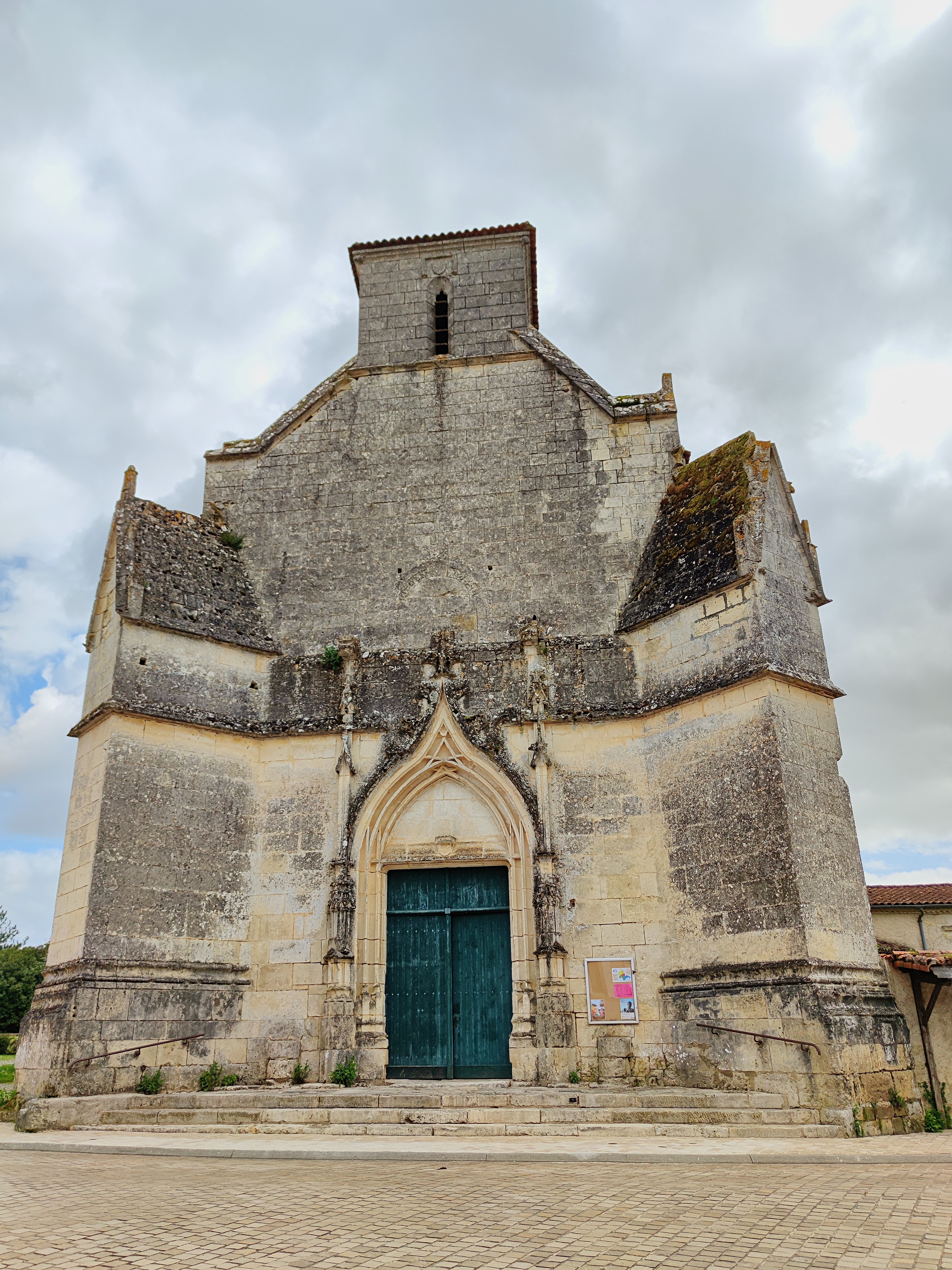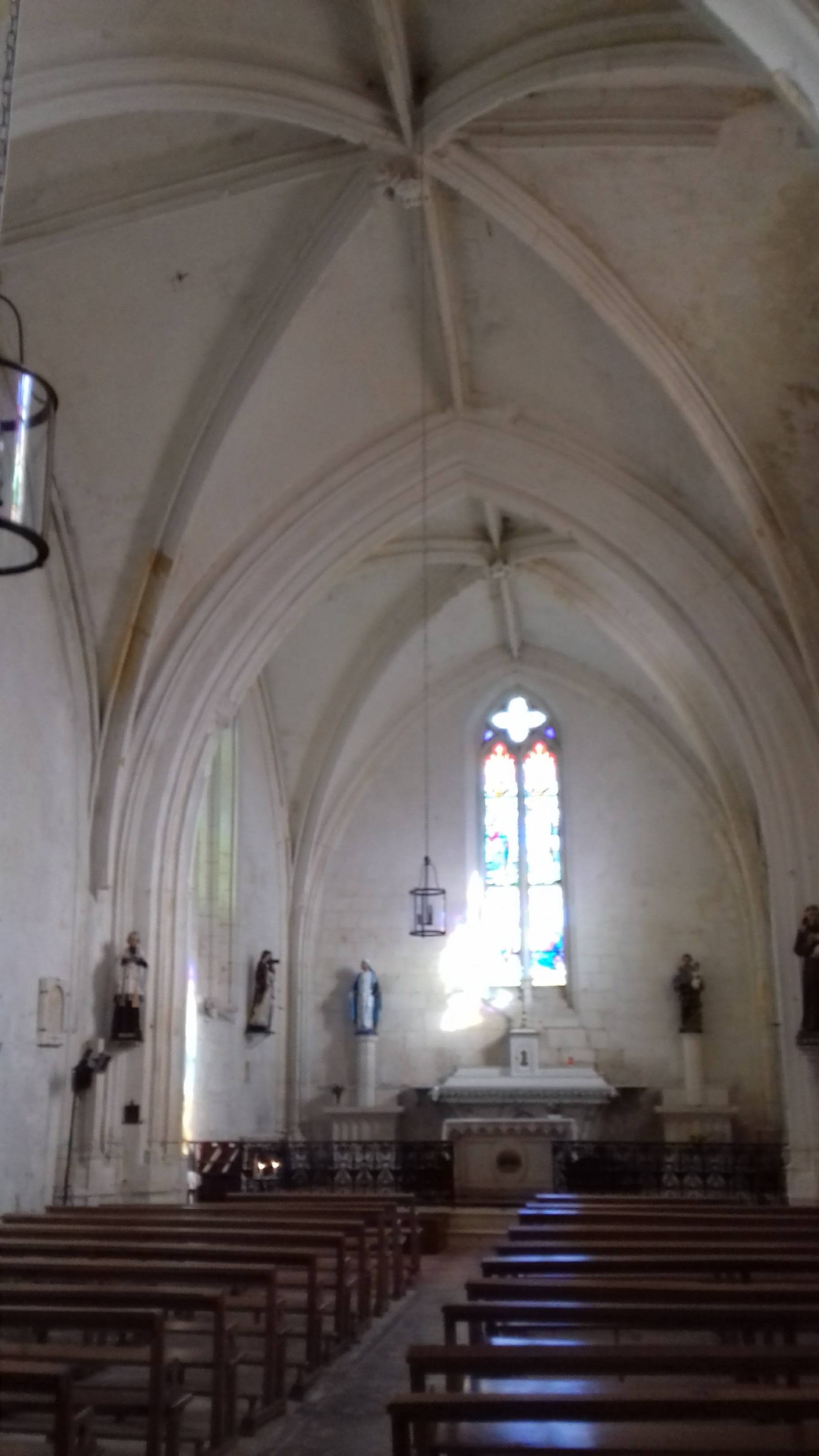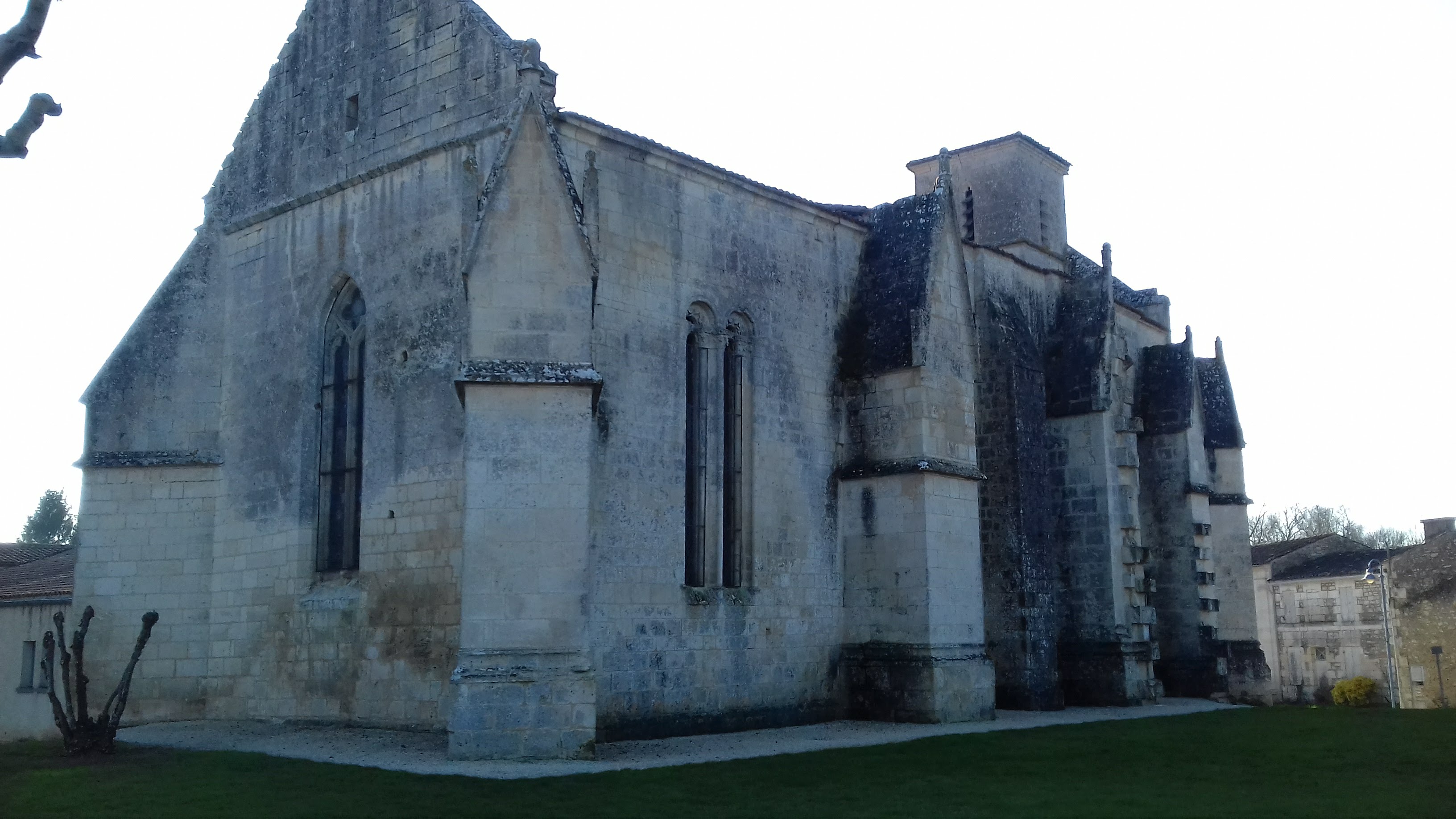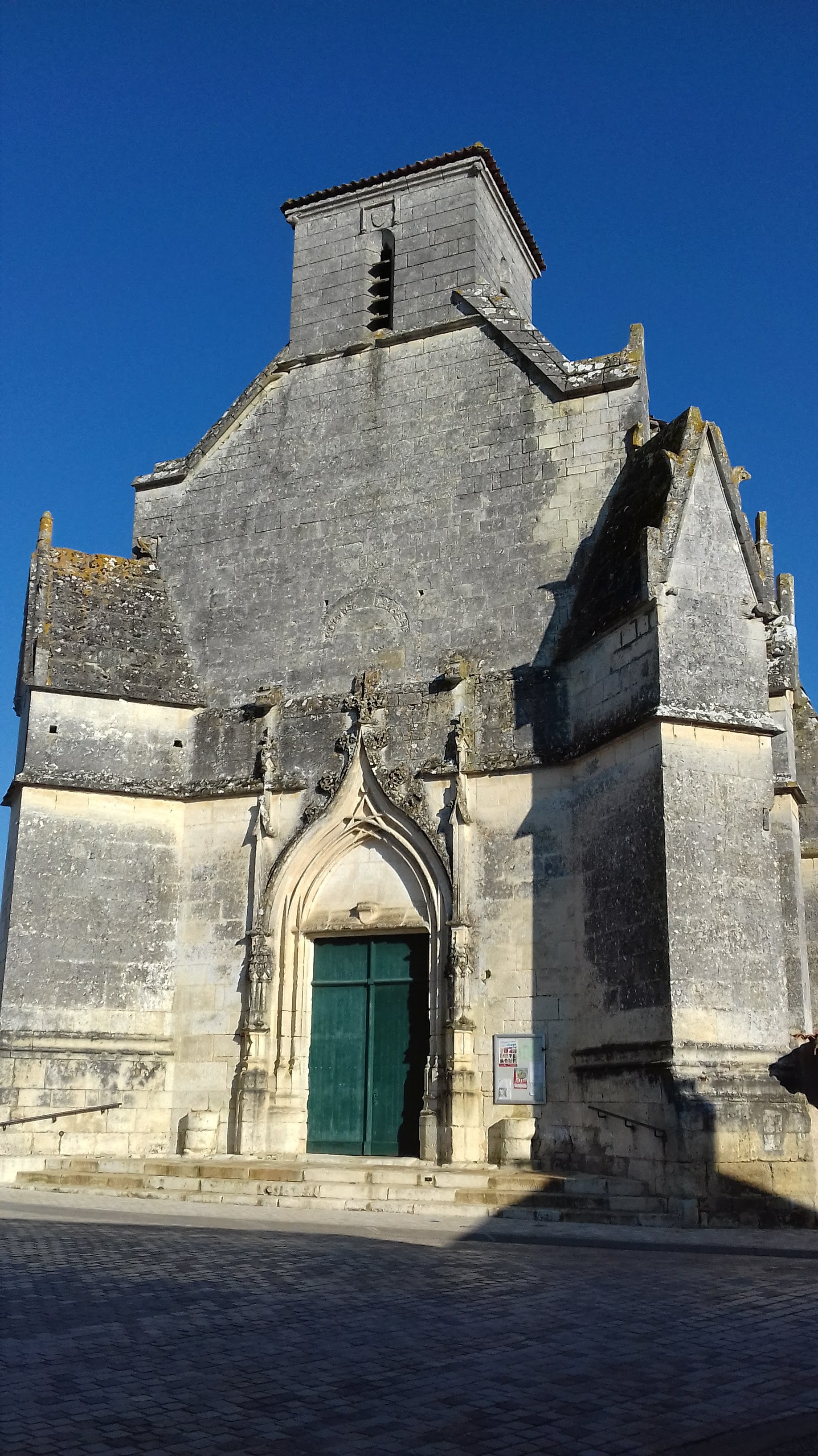 Protégée depuis 1996 par les MH, c'est une église gothique en Saintonge, région au patrimoine roman prestigieux. A l'origine, il s'agissait d'une église romane dont il reste le mur Nord de la 1ère travée ; au 13ème cette église reçoit un chevet plat et des voûtes en croisée d'ogives, l'édifice est alors plus haut que le bâtiment actuel, des arcs formerets ont subsisté dans les combles. Au 15ème, cette église semble avoir été presque entièrement reconstruite, le portail Ouest, de style gothique flamboyant, encadré de puissants contreforts, témoigne de cette époque. Les vitraux de belle facture sont du 19ème ou 20ème le vitrail axial est signé Henri Gesta fils. Un édifice gothique en Saintonge, ce n'est pas si courant, l'histoire de celui-ci est inscrite dans son architecture. J'ai bien aimé l'affichage dans la nef qui présente l'histoire de cette église, ce texte date d'avant 1996 puisqu'il y est exprimé l'absence de protection par les MH. Dans ce texte l'ouverture romane du mur Nord de la 1ère travée est décrite comme murée, elle est aujourd'hui ouverte.