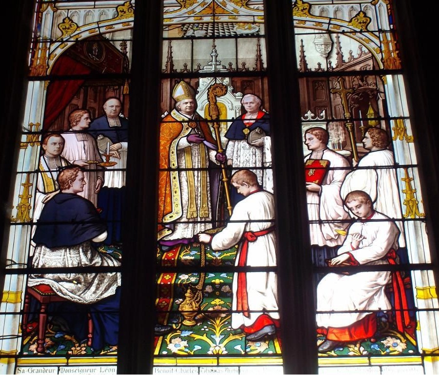 EGLISE SAINTE MADELEINE - XVe au XIXe siècle - Place du Bateau Située Rue de la République, face au Square. Edifice de style ogival à l’emplacement d’une d ancienne chapelle.1ère pierre posée en 1423. ---------------------------------- VITRAIL des NOTAIRES - XIXe siècle - EGLISE SAINTE MADELEINE L’homme de Lettres Hector Malot, qui n’a pourtant jamais caché ses idées anticléricales, a participé au financement de ce vitrail, qui honore la mémoire de son père et de ses 2 successeurs, MM Beauvet et Drapeau, anciens notaires à La Bouille. Leurs 3 portraits figurent en médaillon.