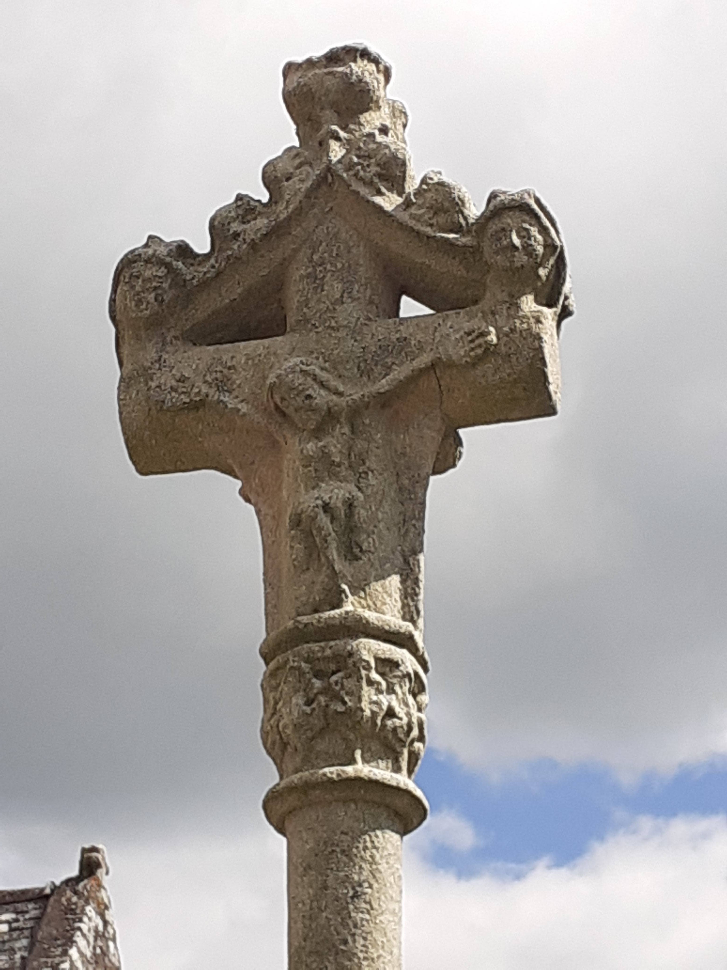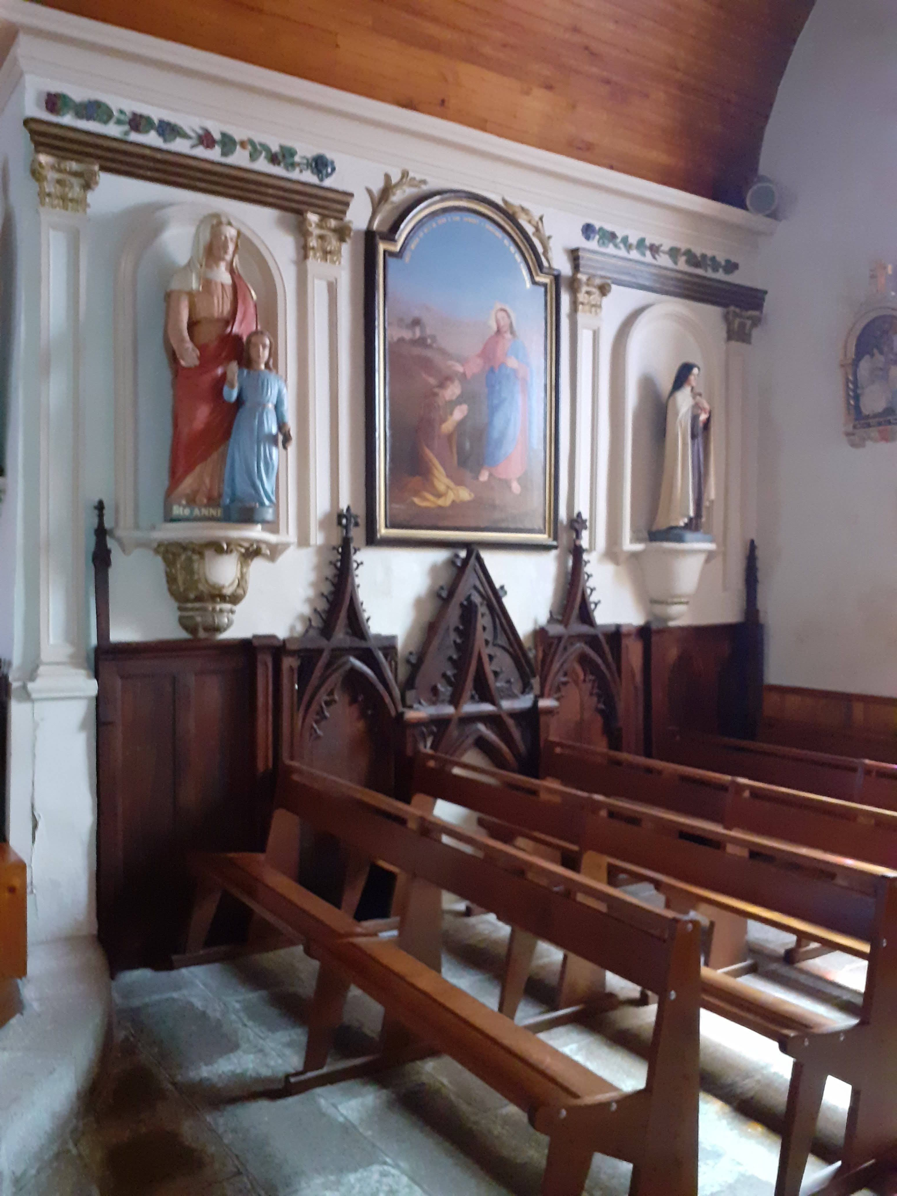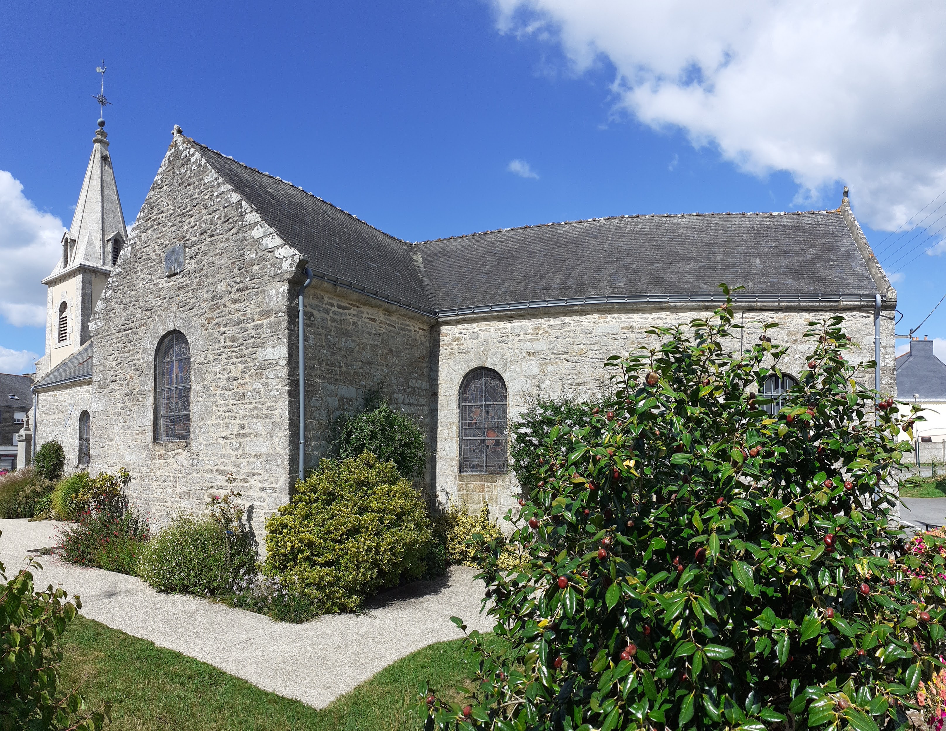 Église magnifiquement fleurie en extérieur. Quelques beaux vitraux. Un très beau calvaire.