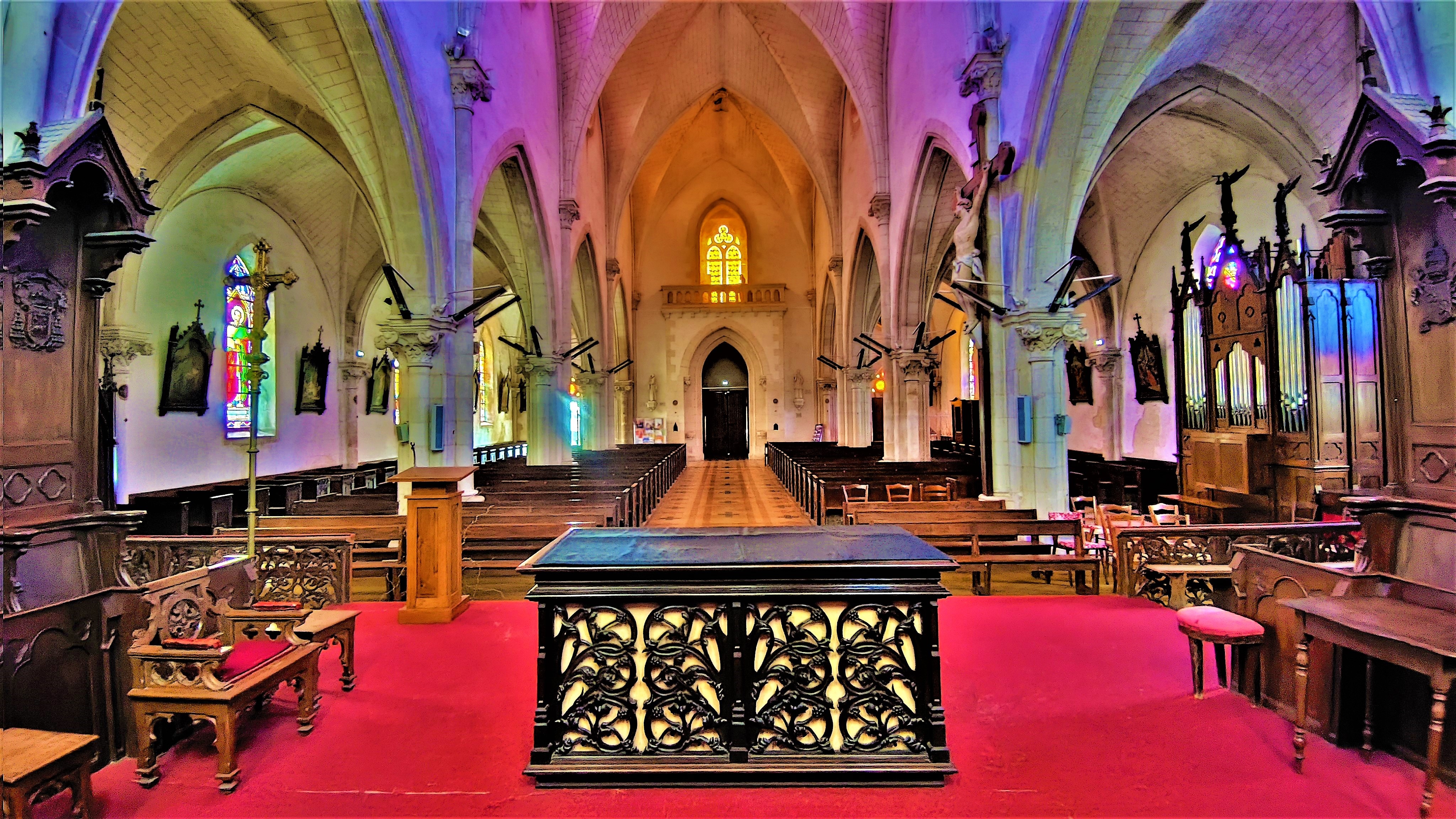 L'extérieur annonce l'organisation des espaces intérieurs : 3 vaisseaux pour la nef, 1 travée pour le chœur et 1 abside à 5 pans. L'existence même des églises dans cette région du Marais Poitevin m'impressionne et démontre une volonté particulière de la population à édifier des monuments, symboles religieux et communautaires, lieux de célébrations, mais aussi de rencontres et d'échanges. L'endroit où se situe Chaillé-les-Marais fut une île entourée par l'océan. Ce dernier se retirant peu à peu, la cité se retrouva bordée de marais. L'assèchement de ces derniers commença au second millénaire sous l'influence d'abbayes ; travaux colossaux, chemins d'eau, pont, passerelles, écluses, digues, etc… La montée des océans étant une réalité, ces aménagements sont encore en plein développement aujourd'hui ; la tempête meurtrière de 2010 (Xynthia qui causa 47 morts et 150 millions de dégâts) fut un signal d'une extrême brutalité. Cette église Sainte-Marie-Madeleine, construite au tout début du 13è siècle, fut d'abord un édifice roman. Les siècles passèrent et l'église était déjà très délabrée quand arriva la révolution française mais son état de ruine imminente ne convainquit pas immédiatement les autorités à une reconstruction. Il fallut attendre 1868 pour voir terminée l'église actuelle. Néogothique, de nombreuses baies équipées de vitraux réalisés par Louis-Victor Gesta offrent un bel éclairage. Ouverte et accueillante, une impression chaleureuse émane de l'intérieur, lieu propice au recueillement, à la prière, ou pour une simple détente.
