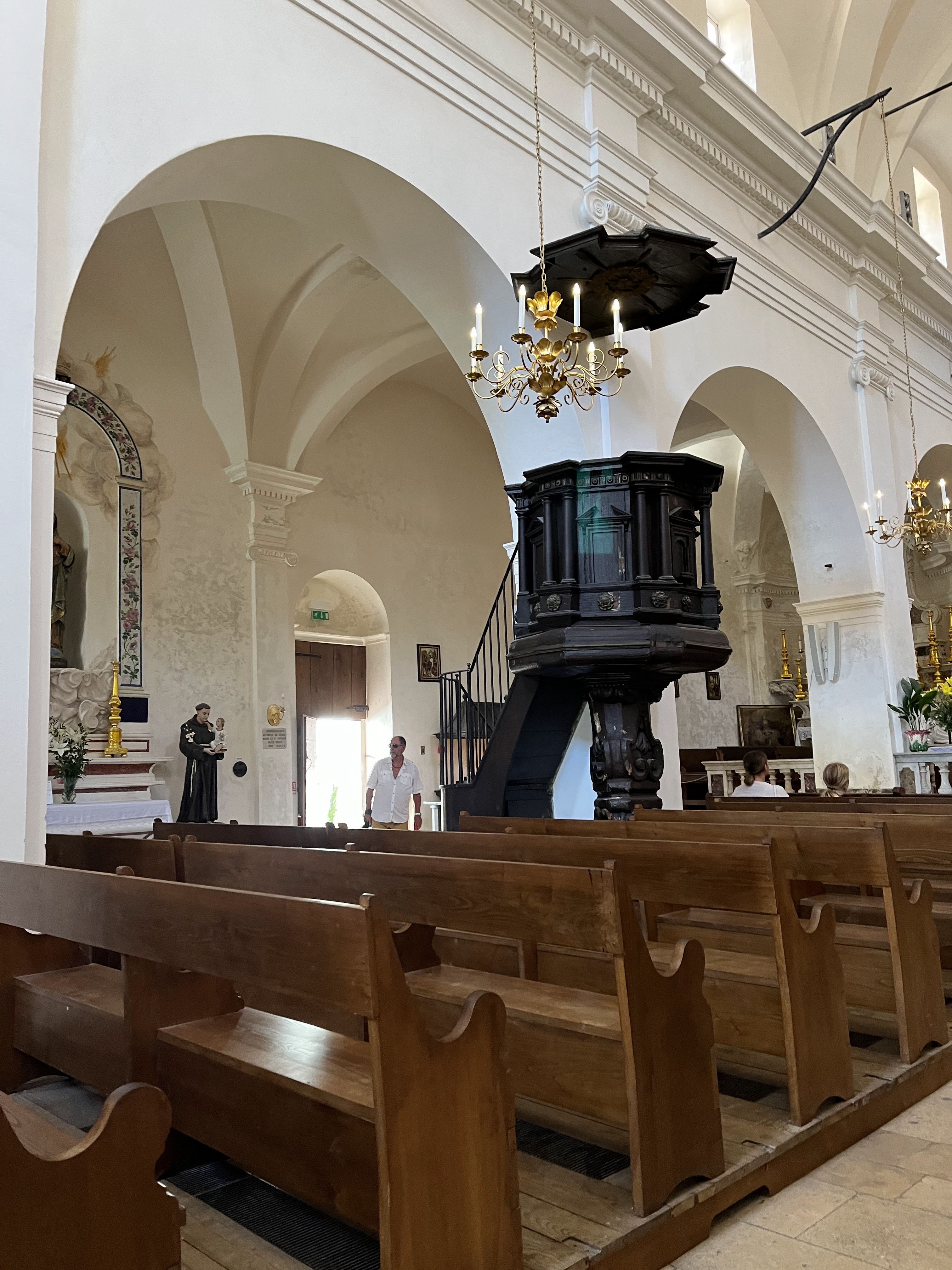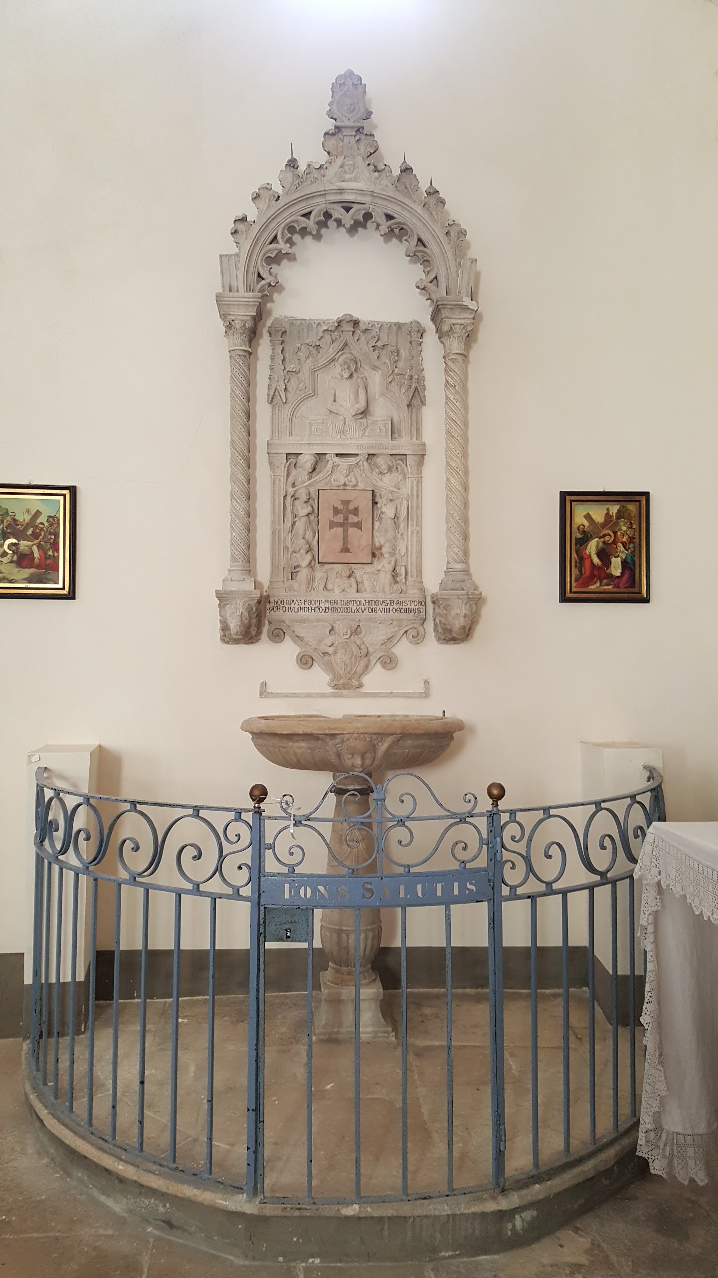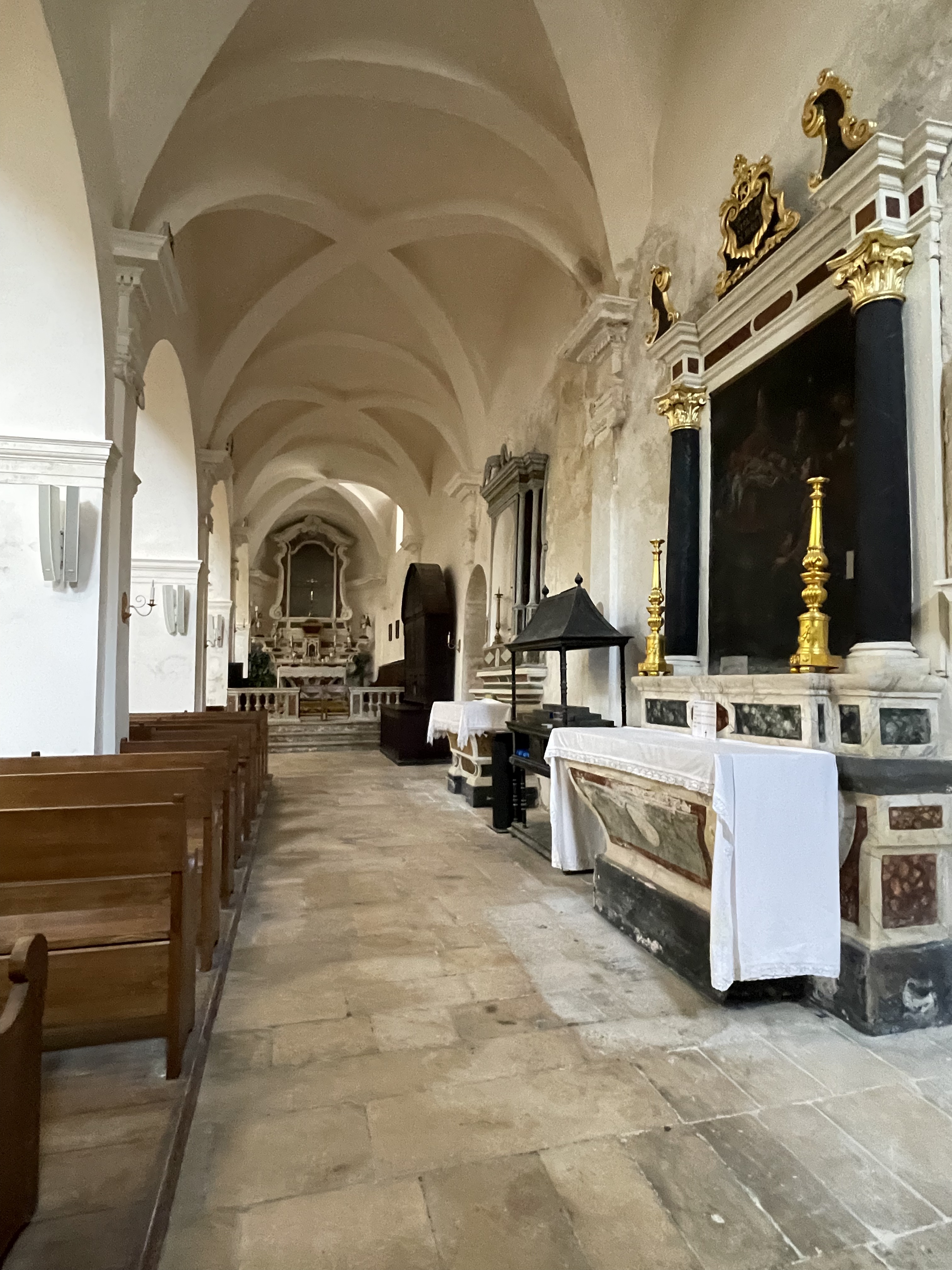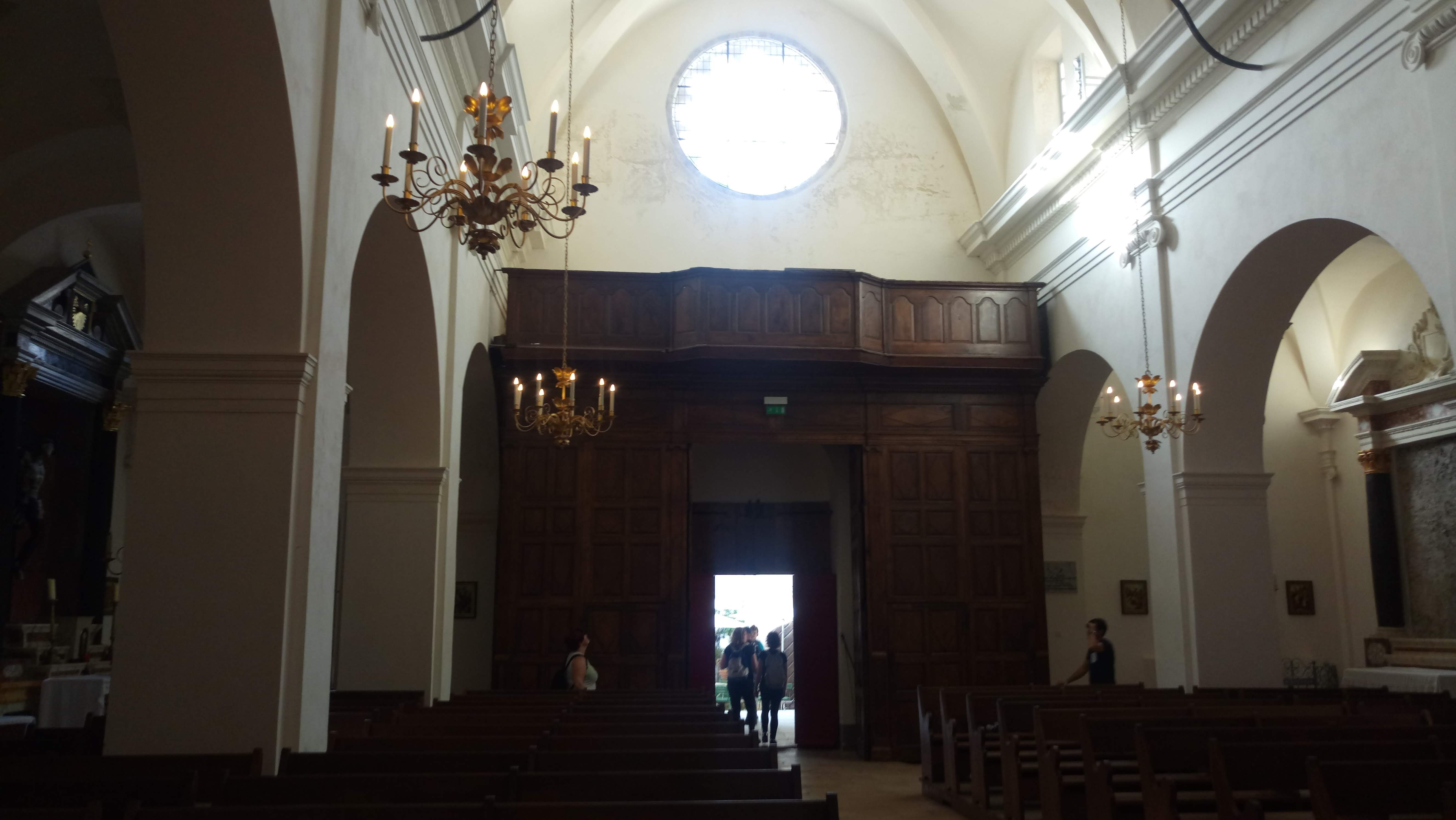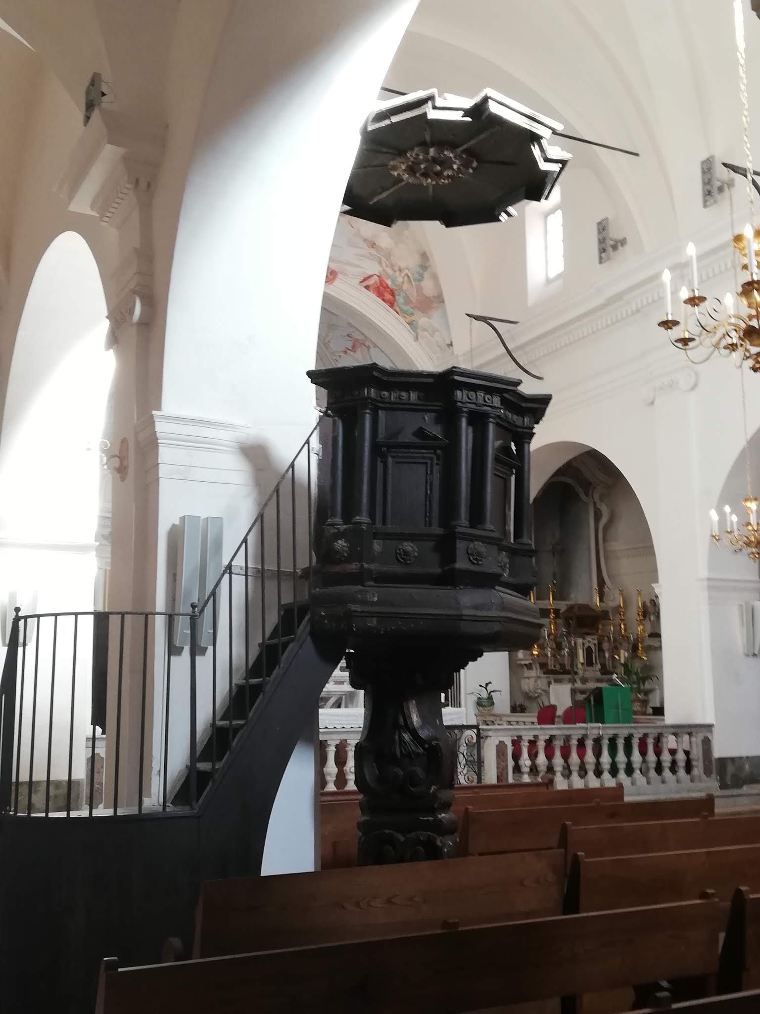C'est le moment d'être curieux et de lever le nez. Les rues encadrant l'église ont de curieux arcs boutants. Ce sont des collecteurs d'eau des toits environnant amenant les eaux pluviales vers une citerne de 650m située sous la Loggia/porche de l'église. Maintenant cette citerne sert de salle de conférence. Amoureux de l'architecture, ne manquez pas cet endroit. Un élégant campanile orne l'édifice L'autel de l'église, en marqueterie de marbre polychrome mérite plus qu'un passage furtif.