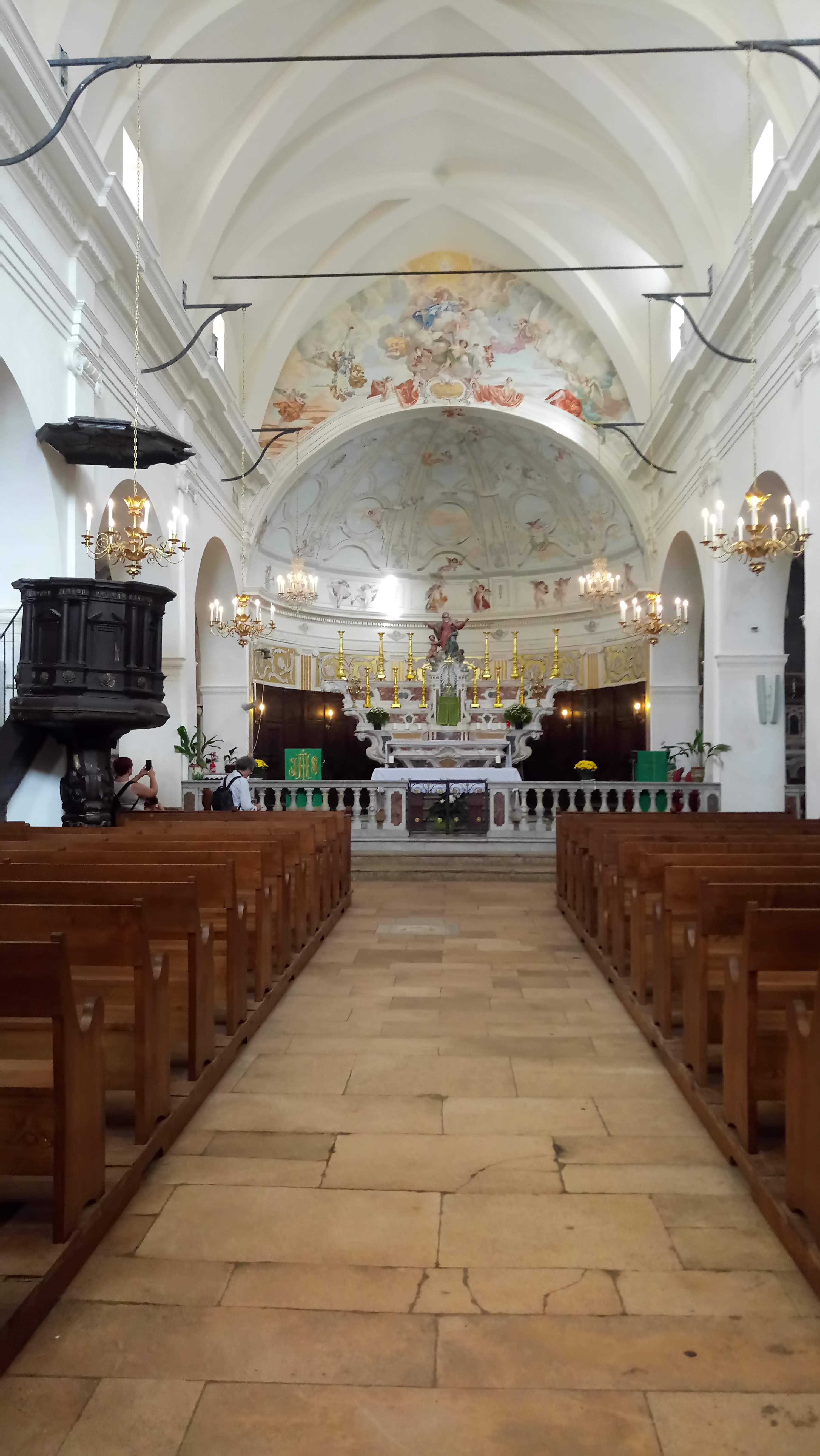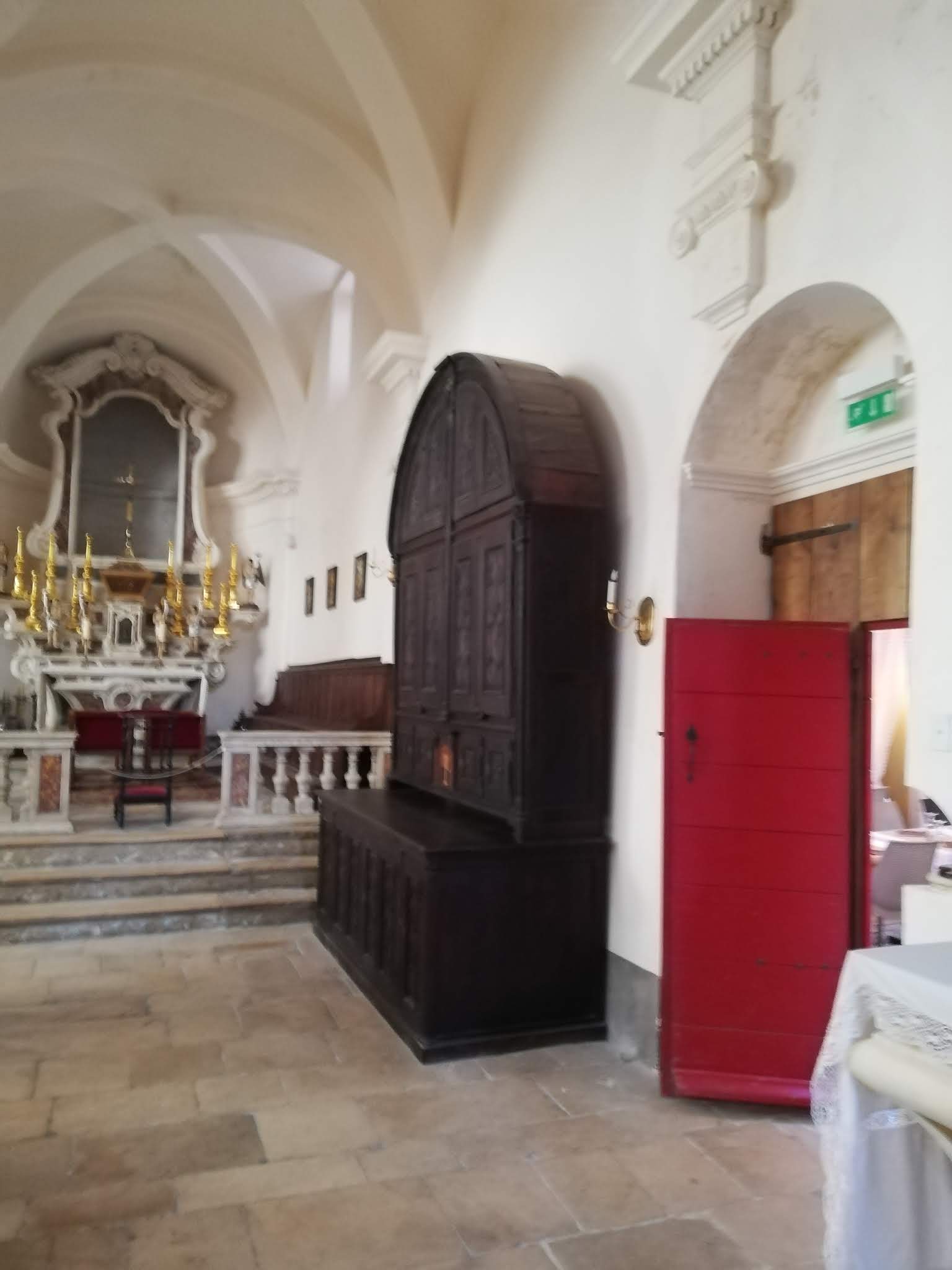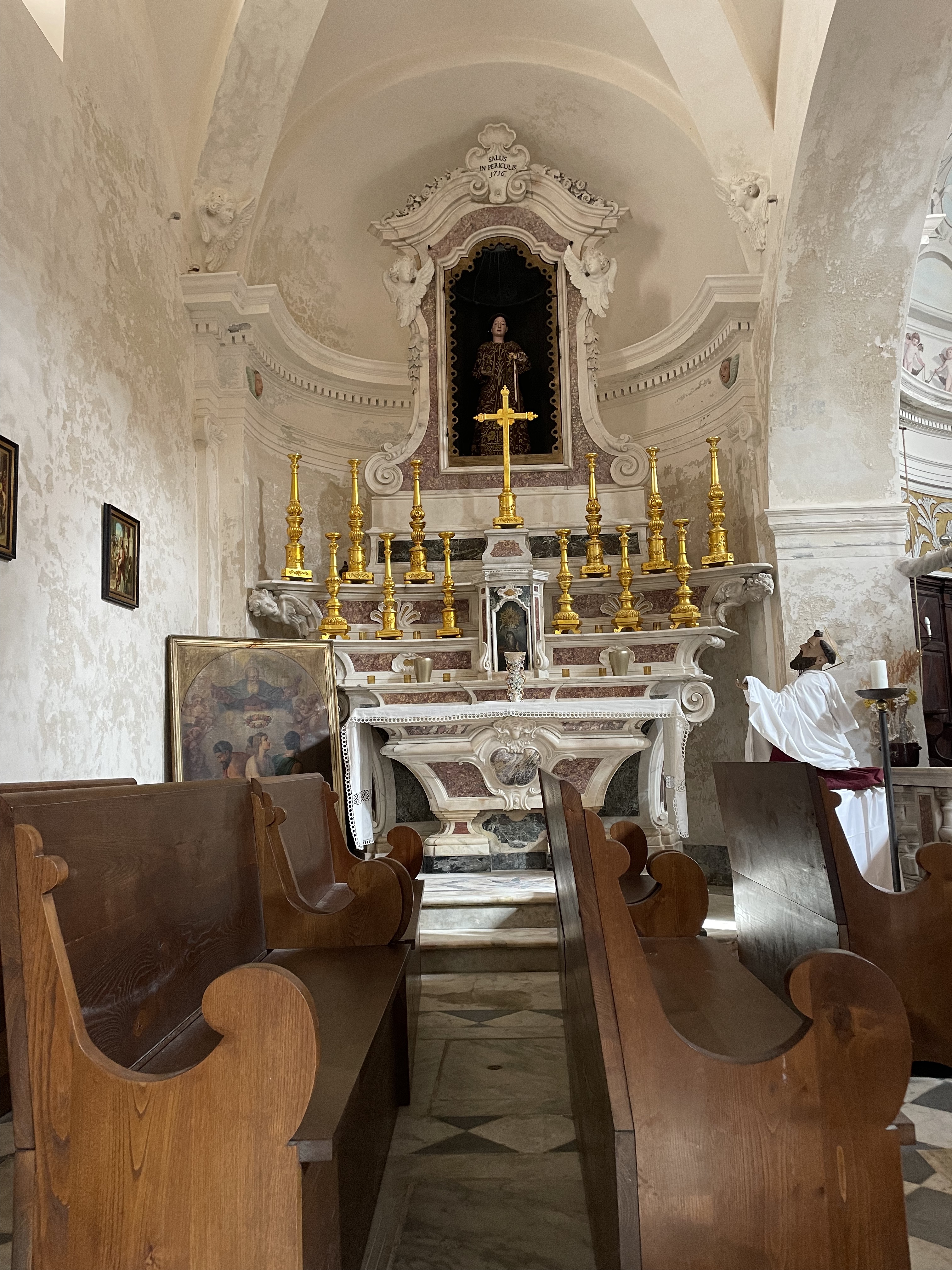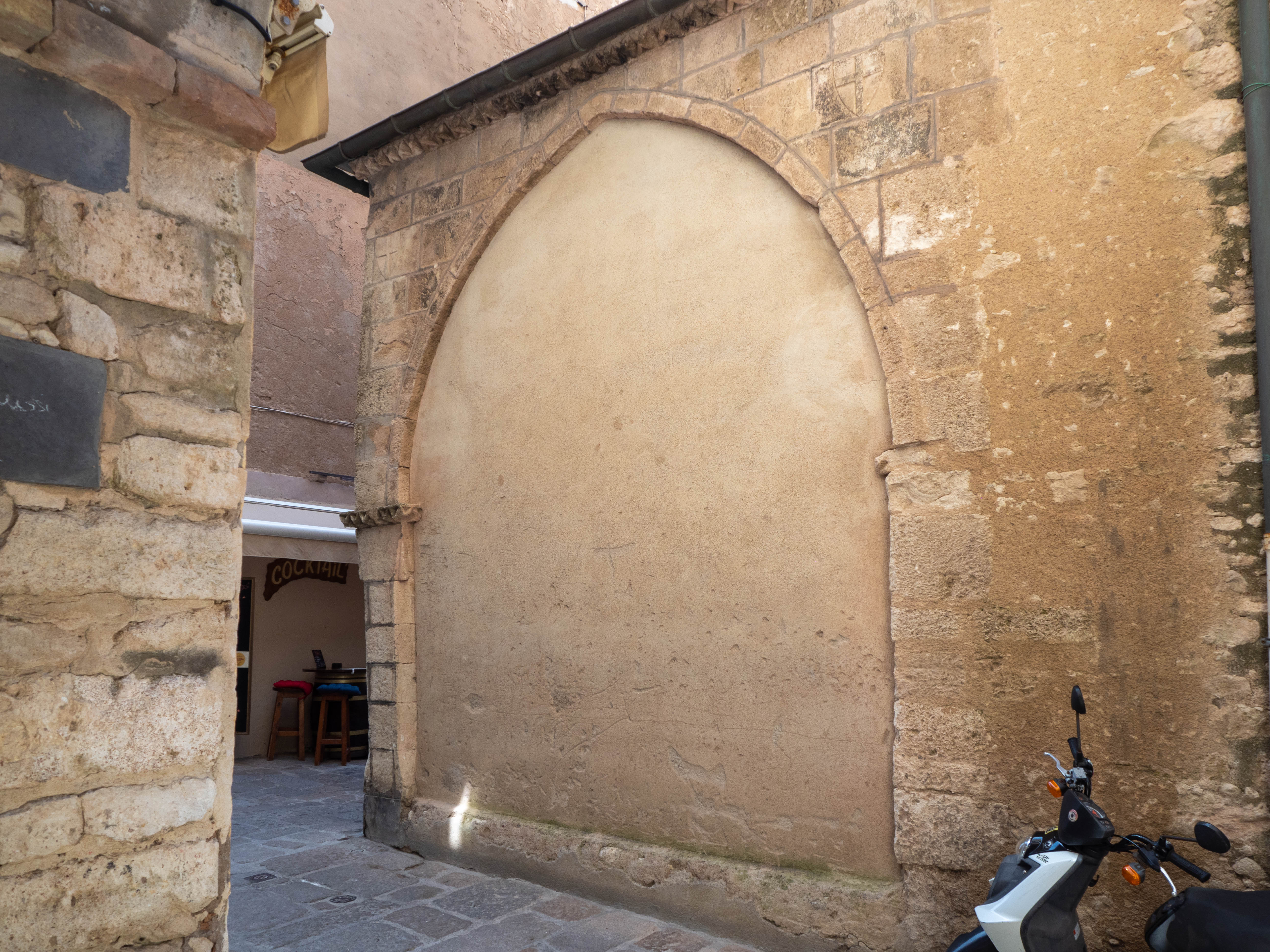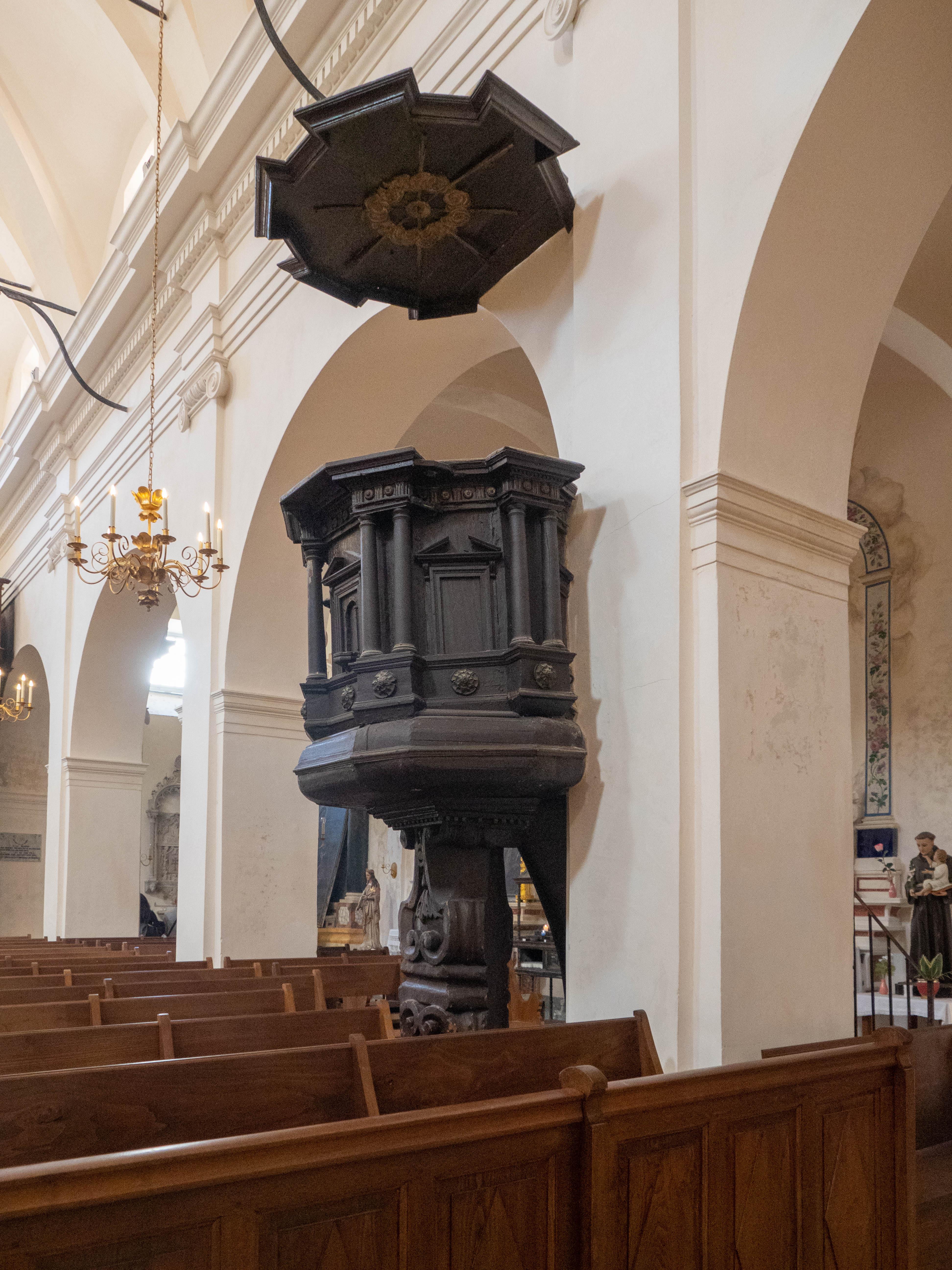 C'est le moment d'être curieux et de lever le nez. Les rues encadrant l'église ont de curieux arcs boutants. Ce sont des collecteurs d'eau des toits environnant amenant les eaux pluviales vers une citerne de 650m située sous la Loggia/porche de l'église. Maintenant cette citerne sert de salle de conférence. Amoureux de l'architecture, ne manquez pas cet endroit. Un élégant campanile orne l'édifice L'autel de l'église, en marqueterie de marbre polychrome mérite plus qu'un passage furtif.