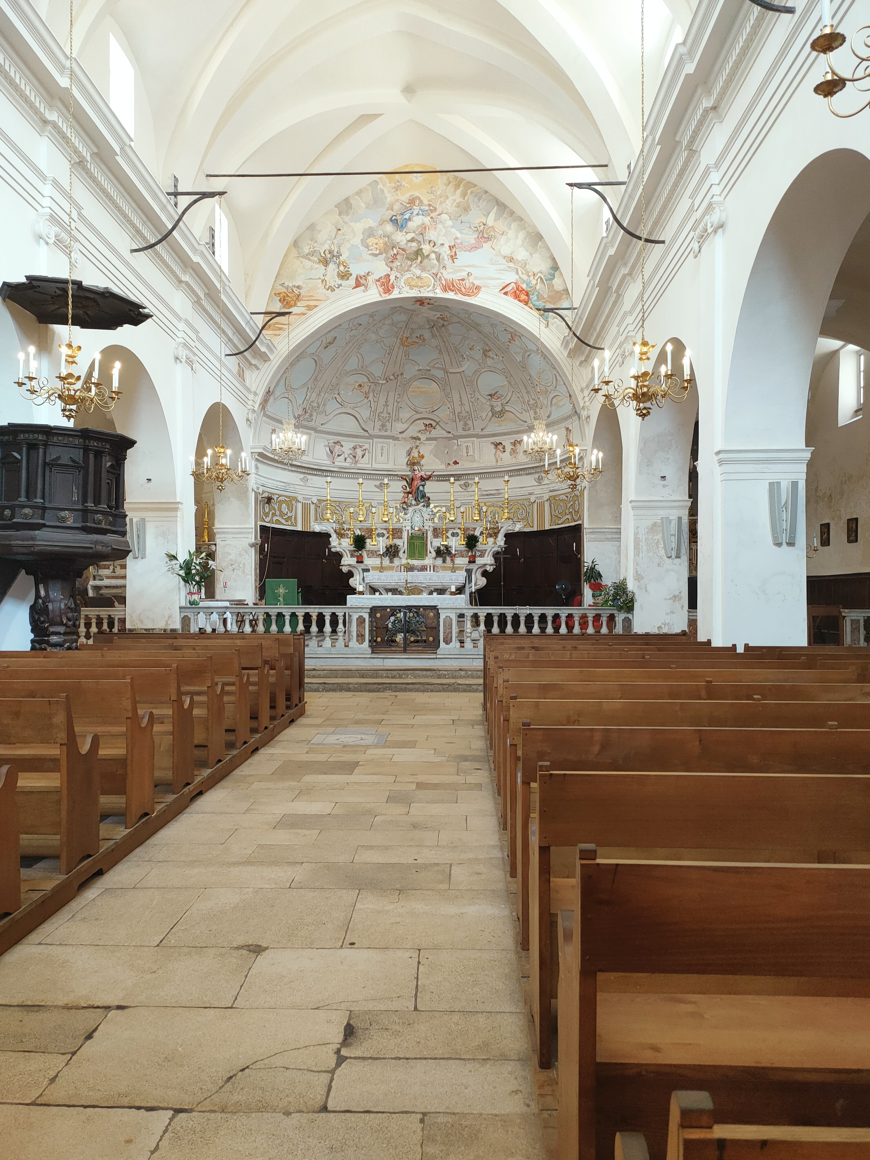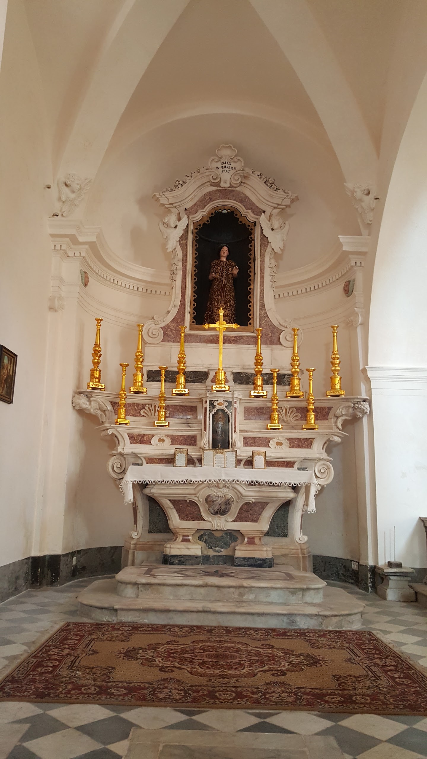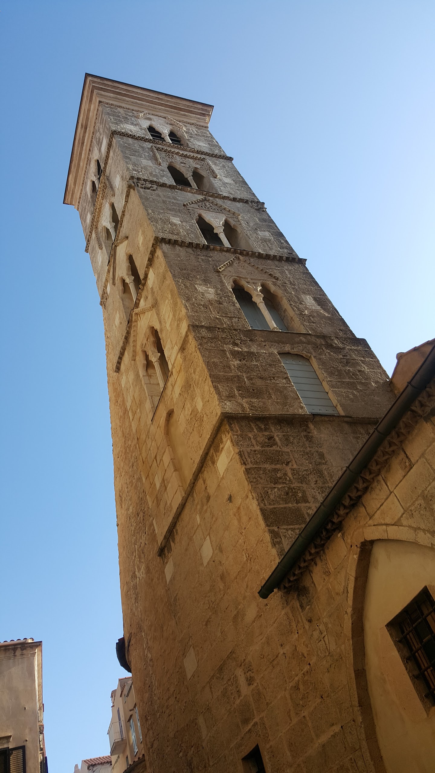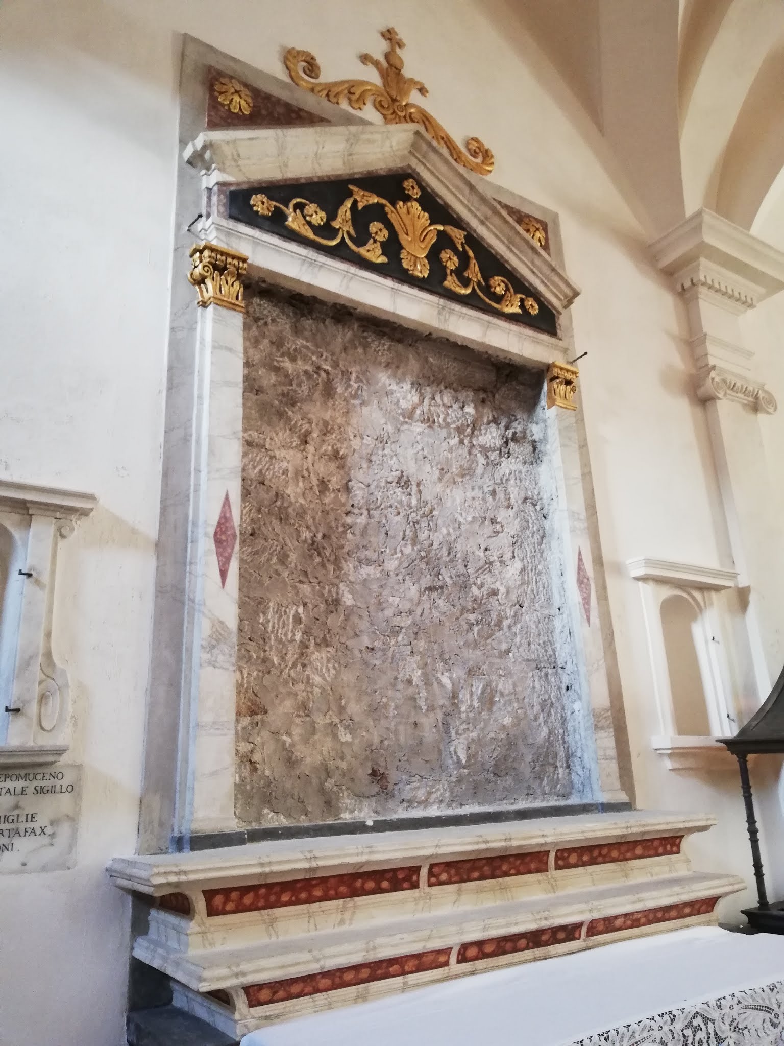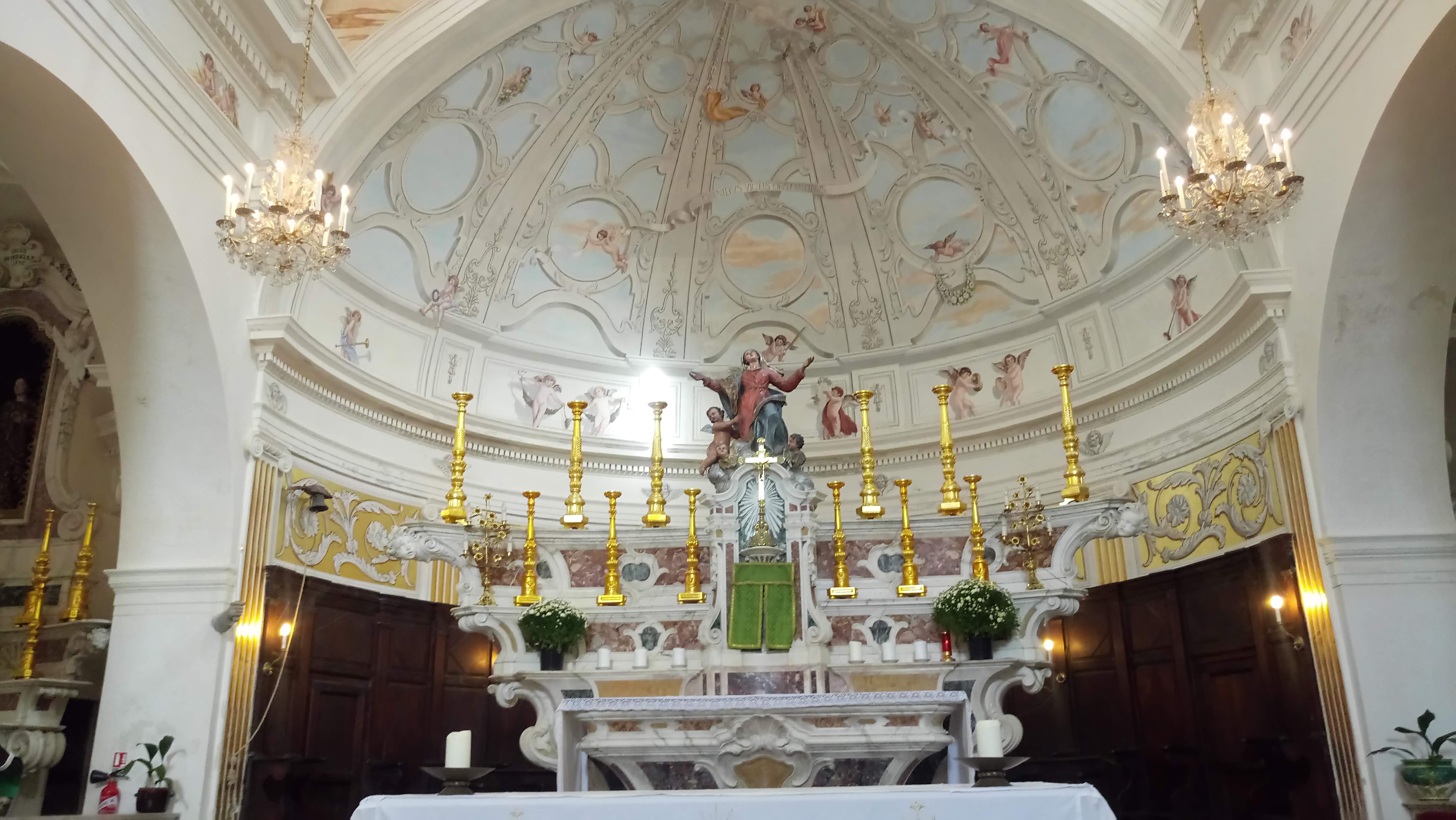 C'est le moment d'être curieux et de lever le nez. Les rues encadrant l'église ont de curieux arcs boutants. Ce sont des collecteurs d'eau des toits environnant amenant les eaux pluviales vers une citerne de 650m située sous la Loggia/porche de l'église. Maintenant cette citerne sert de salle de conférence. Amoureux de l'architecture, ne manquez pas cet endroit. Un élégant campanile orne l'édifice L'autel de l'église, en marqueterie de marbre polychrome mérite plus qu'un passage furtif.