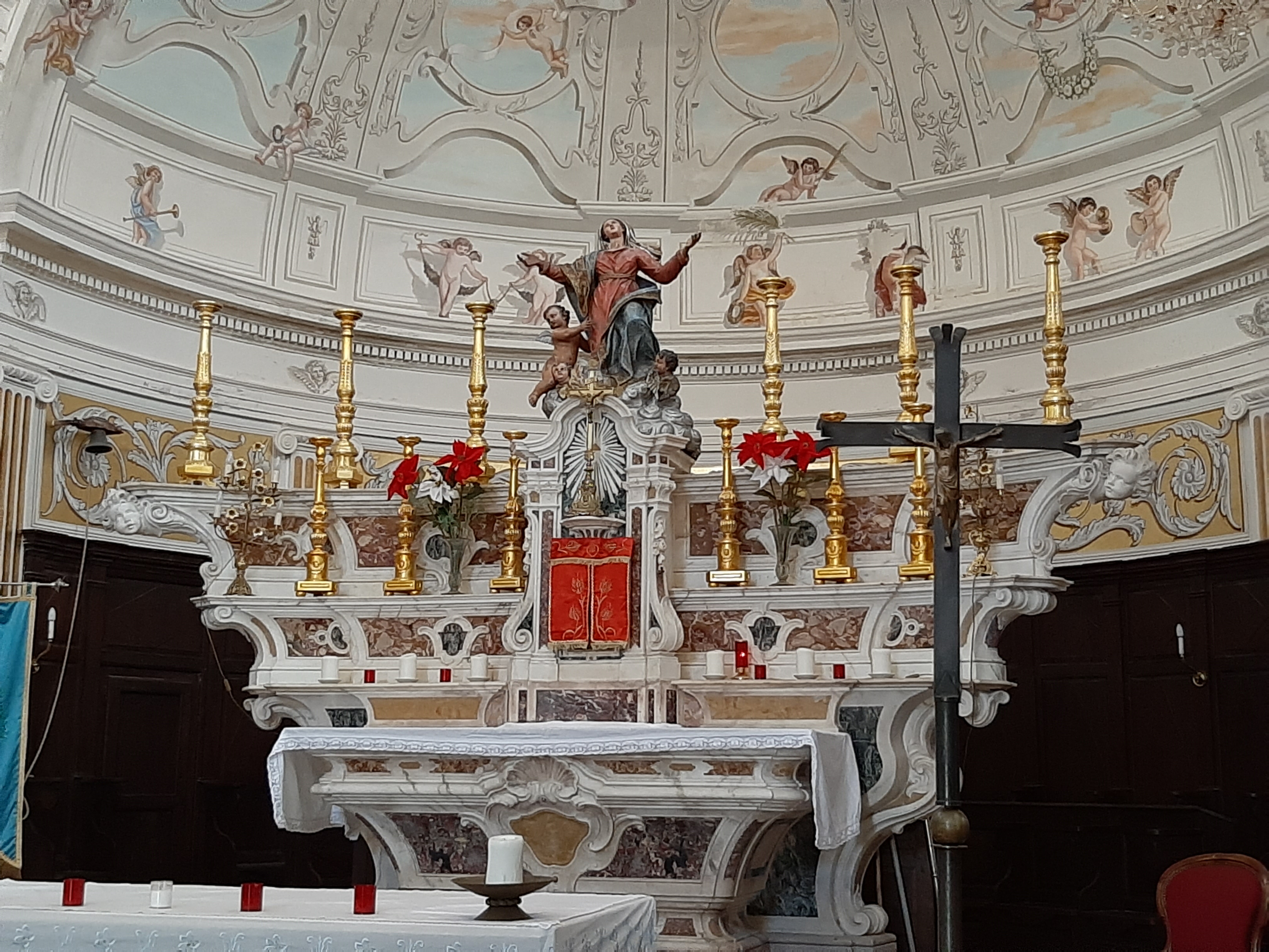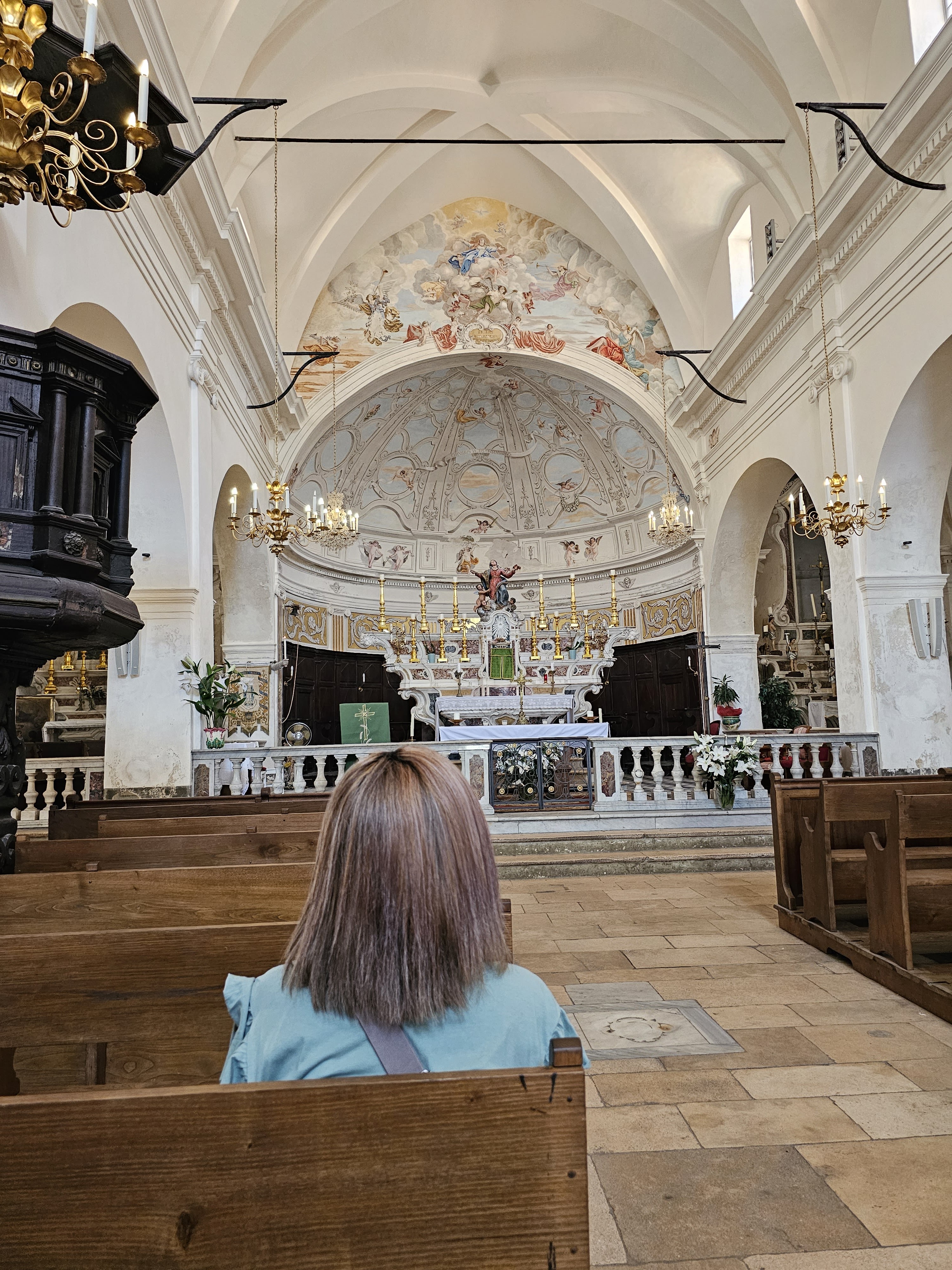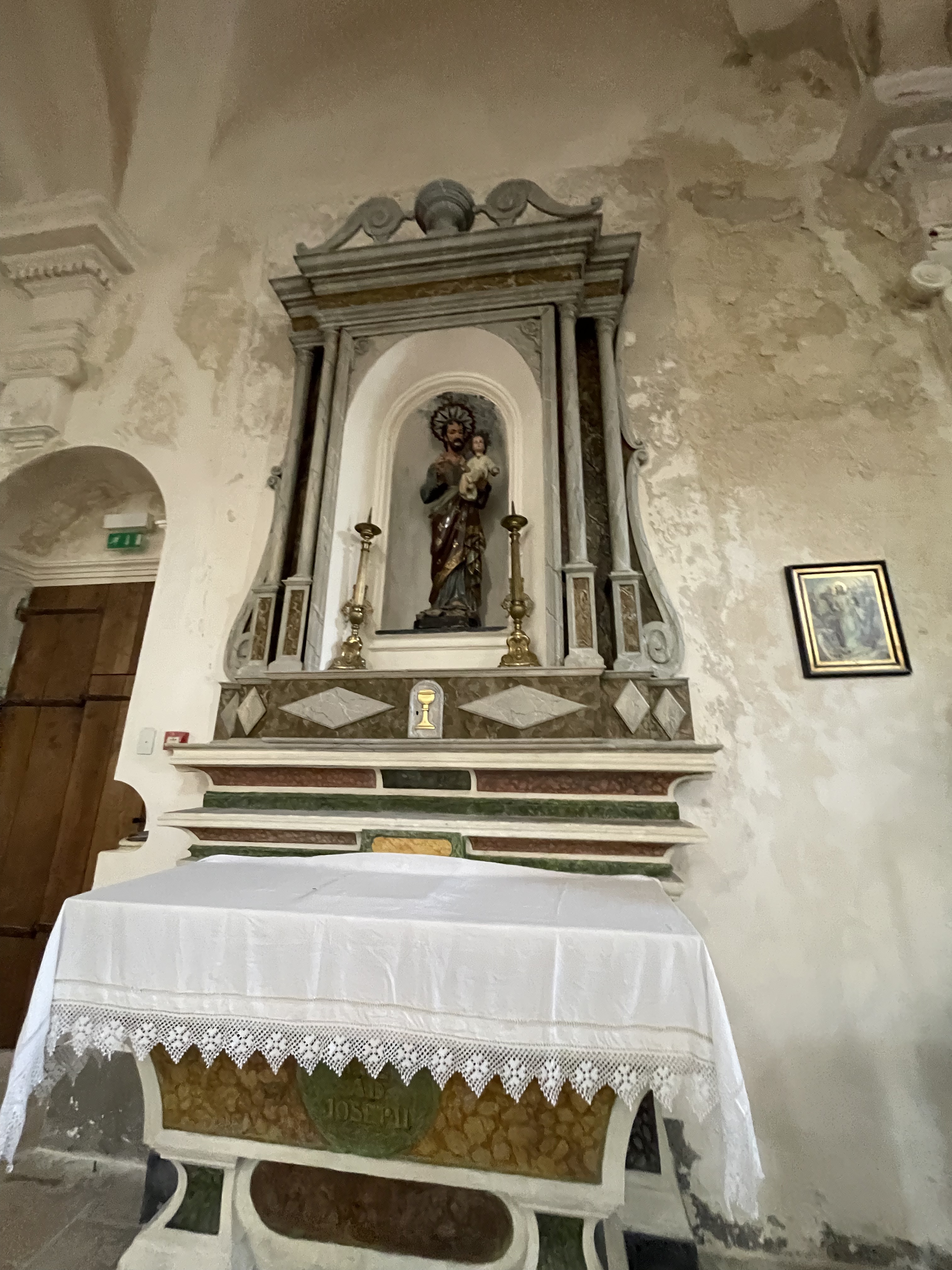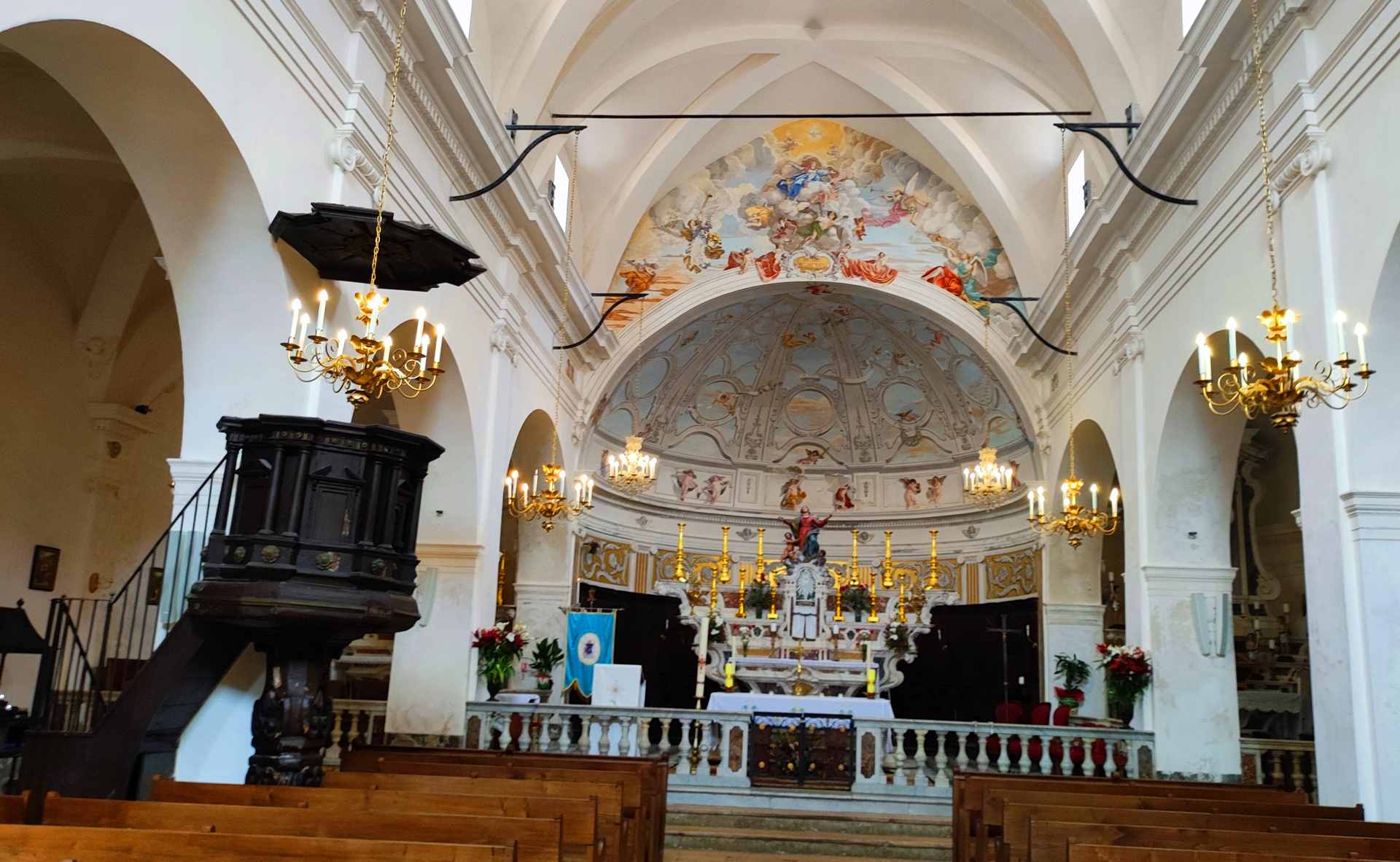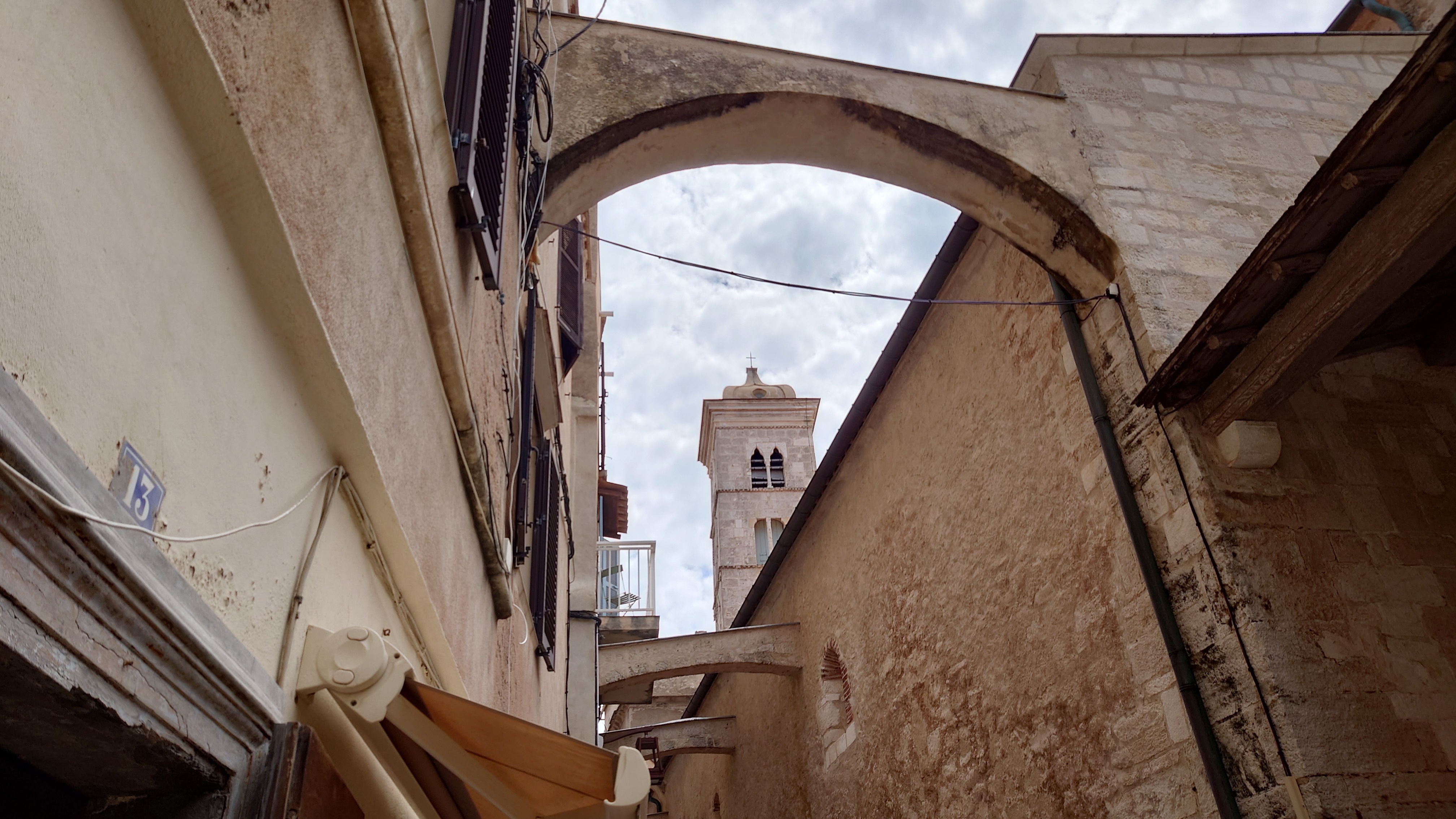 C'est le moment d'être curieux et de lever le nez. Les rues encadrant l'église ont de curieux arcs boutants. Ce sont des collecteurs d'eau des toits environnant amenant les eaux pluviales vers une citerne de 650m située sous la Loggia/porche de l'église. Maintenant cette citerne sert de salle de conférence. Amoureux de l'architecture, ne manquez pas cet endroit. Un élégant campanile orne l'édifice L'autel de l'église, en marqueterie de marbre polychrome mérite plus qu'un passage furtif.