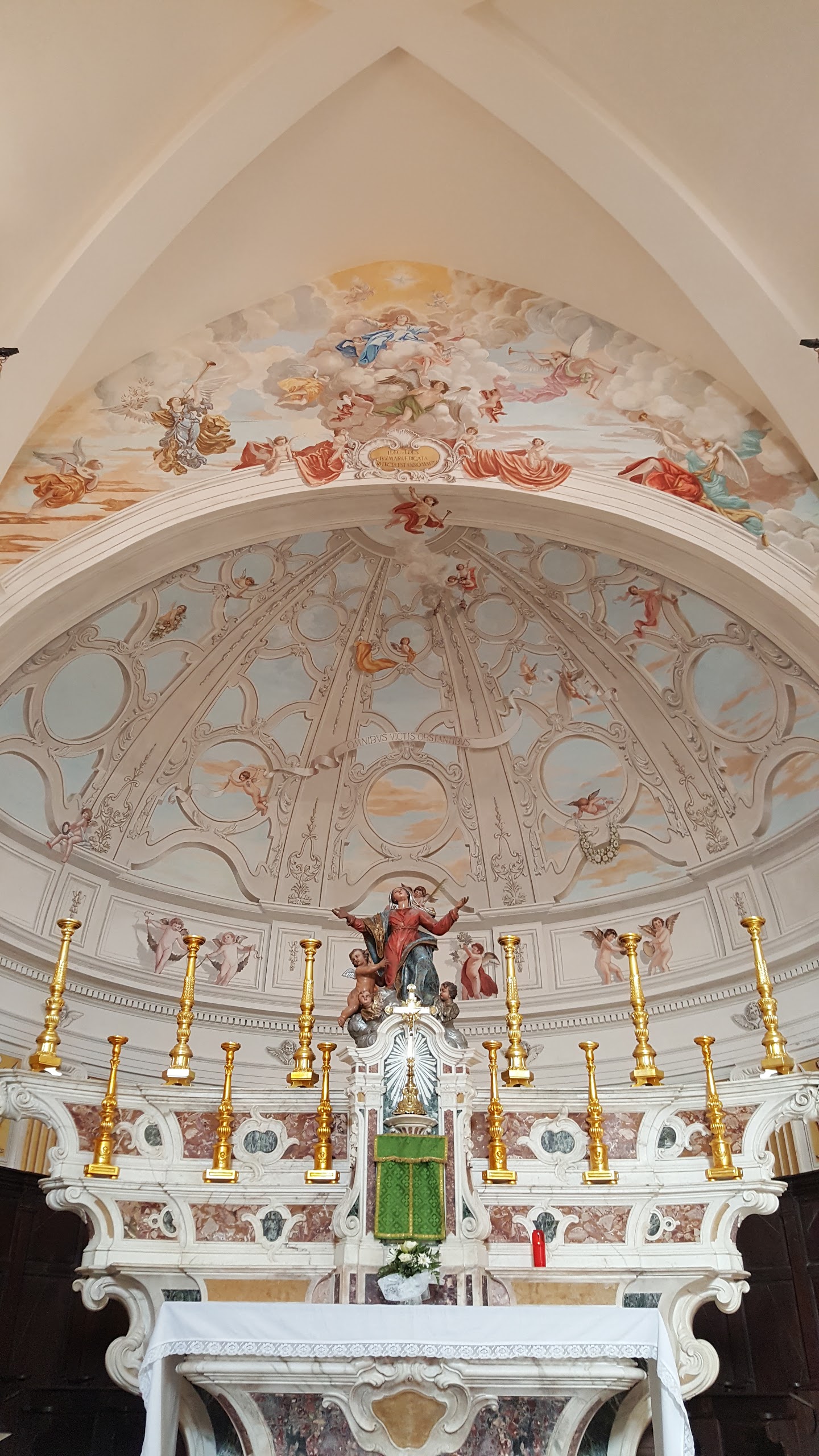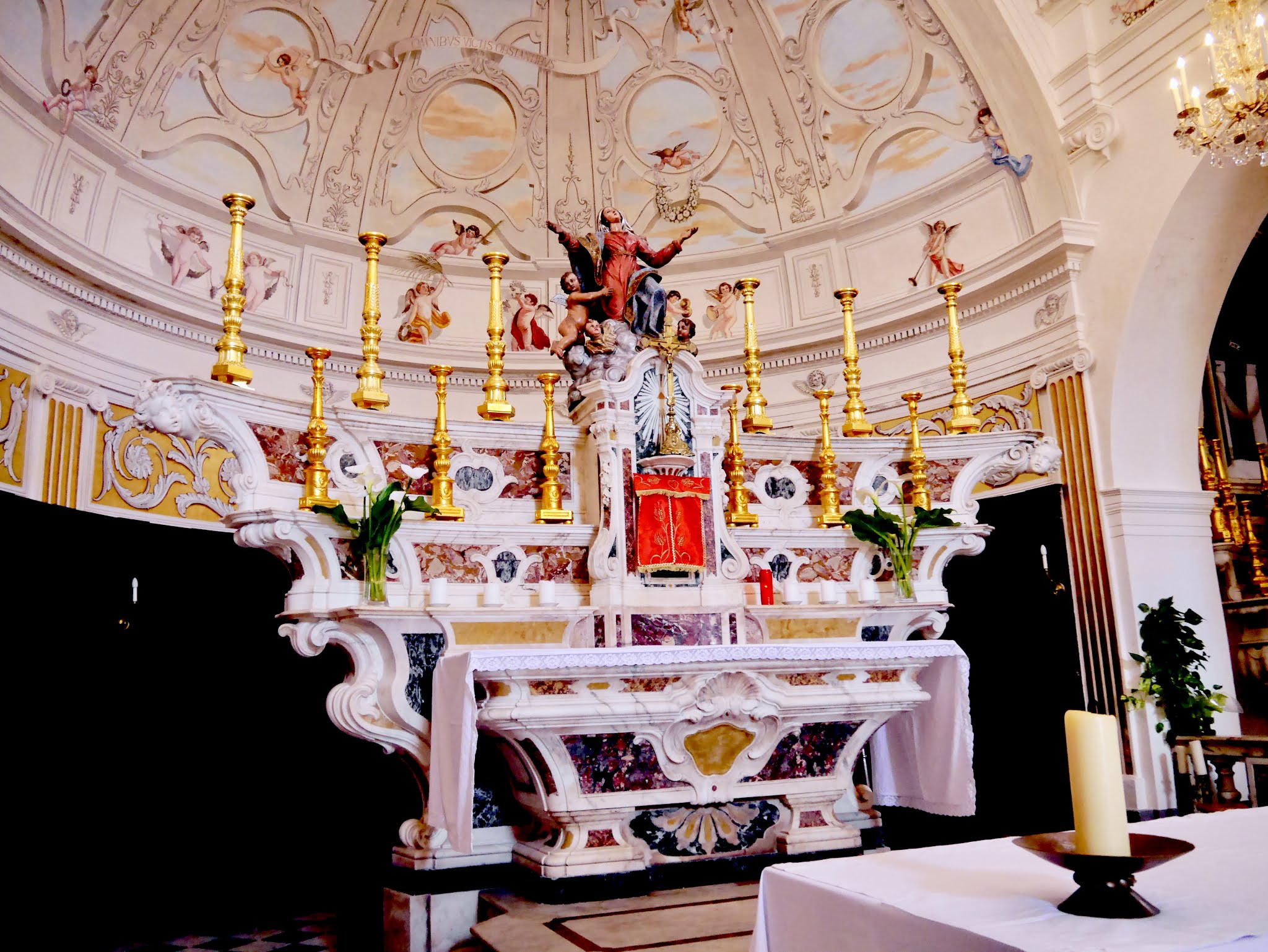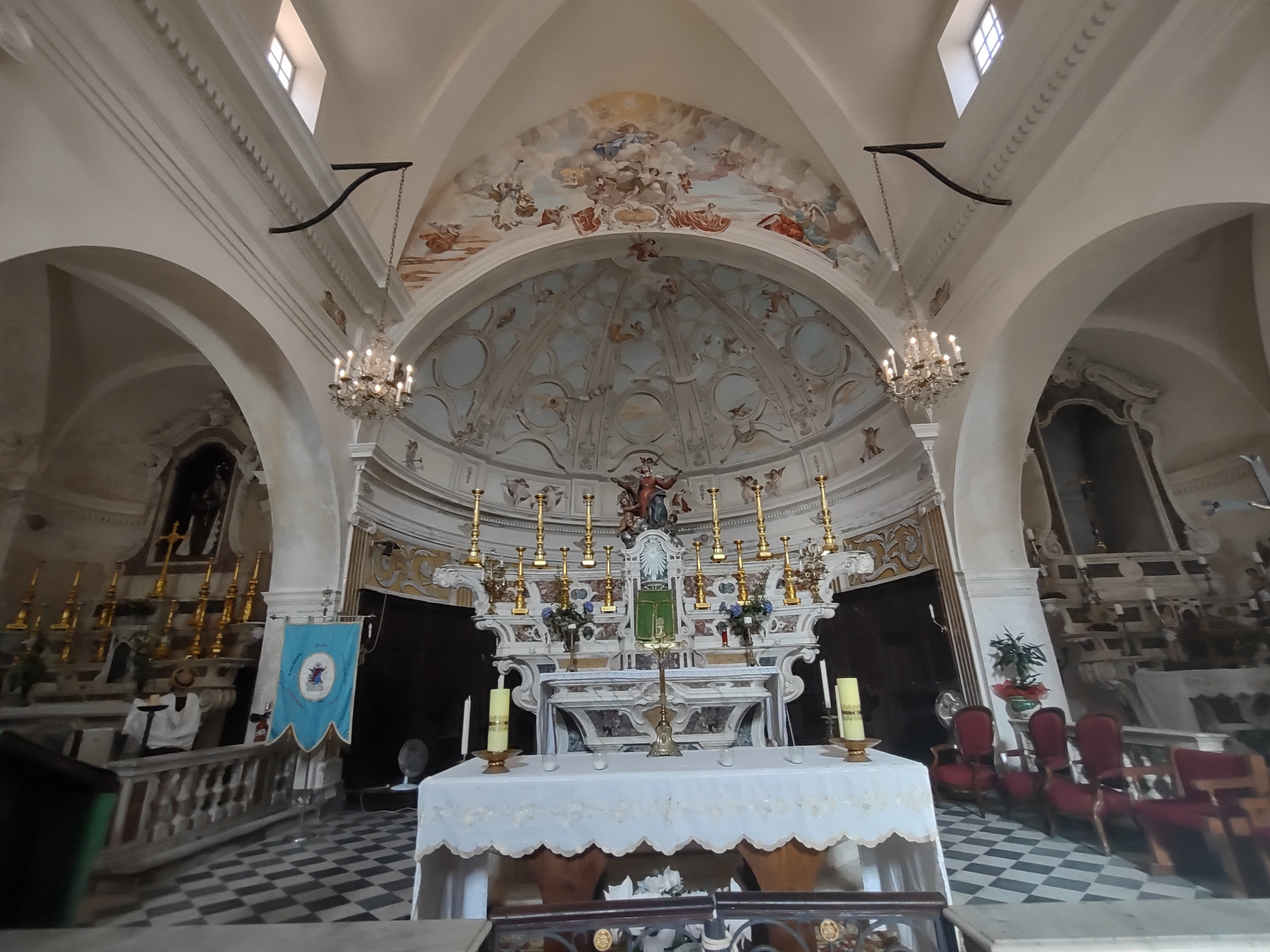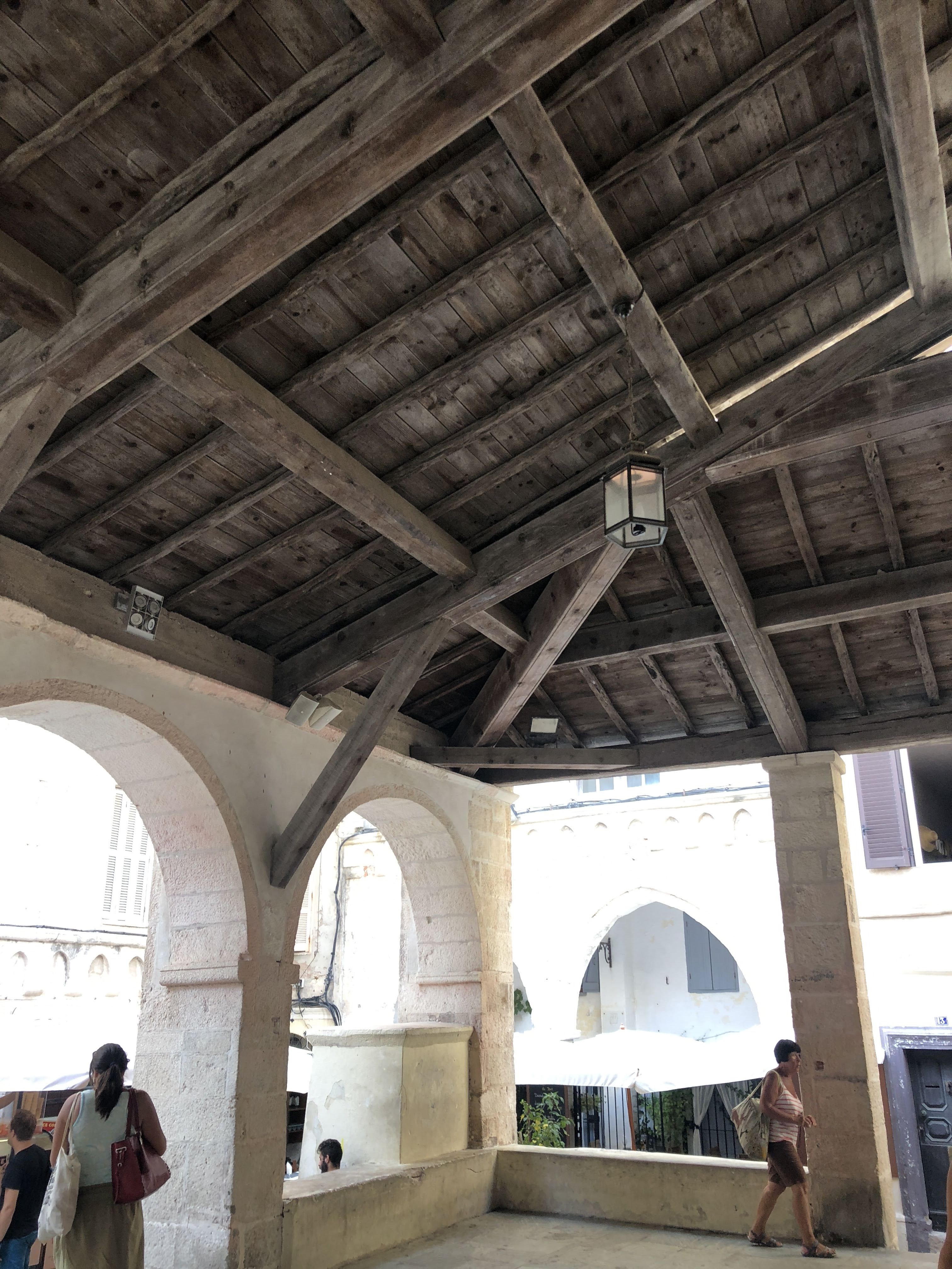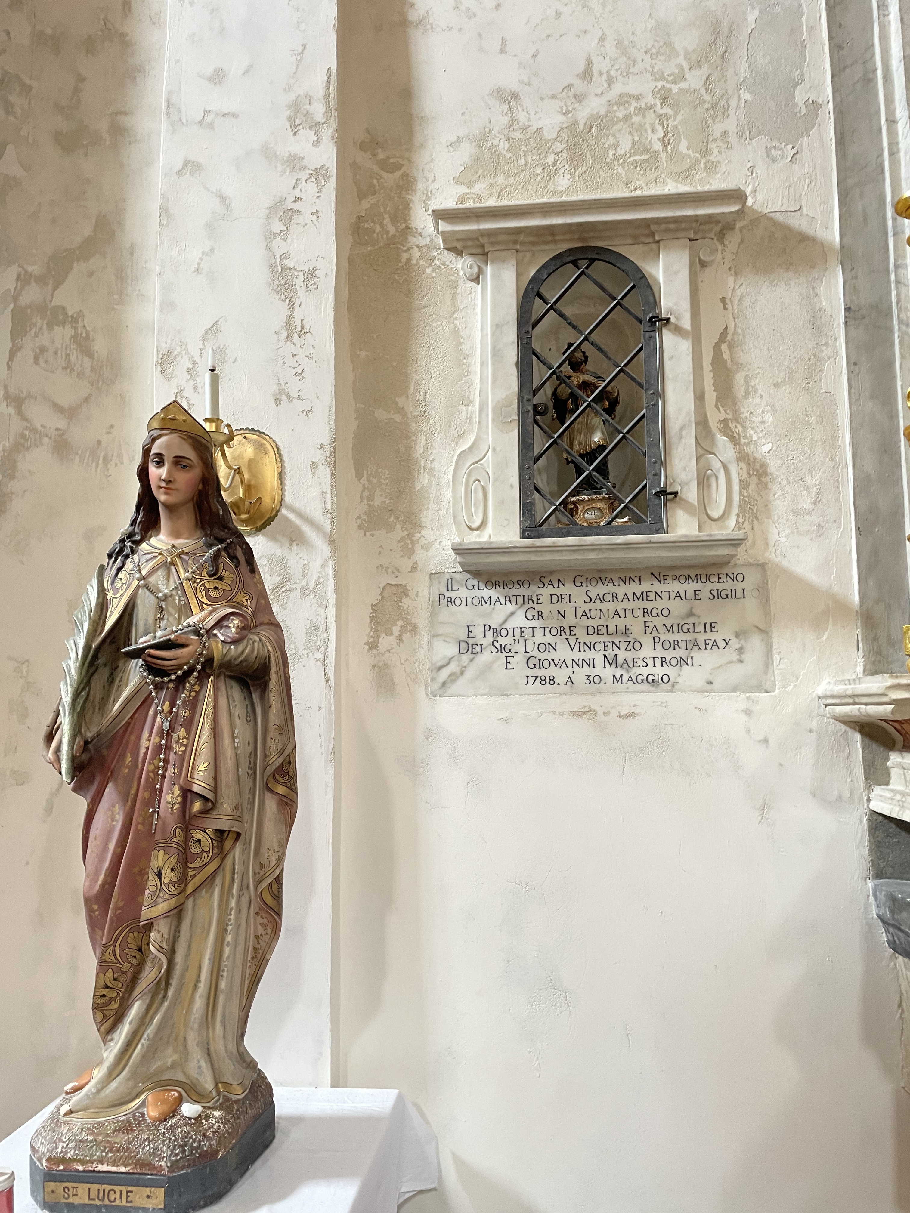 C'est le moment d'être curieux et de lever le nez. Les rues encadrant l'église ont de curieux arcs boutants. Ce sont des collecteurs d'eau des toits environnant amenant les eaux pluviales vers une citerne de 650m située sous la Loggia/porche de l'église. Maintenant cette citerne sert de salle de conférence. Amoureux de l'architecture, ne manquez pas cet endroit. Un élégant campanile orne l'édifice L'autel de l'église, en marqueterie de marbre polychrome mérite plus qu'un passage furtif.