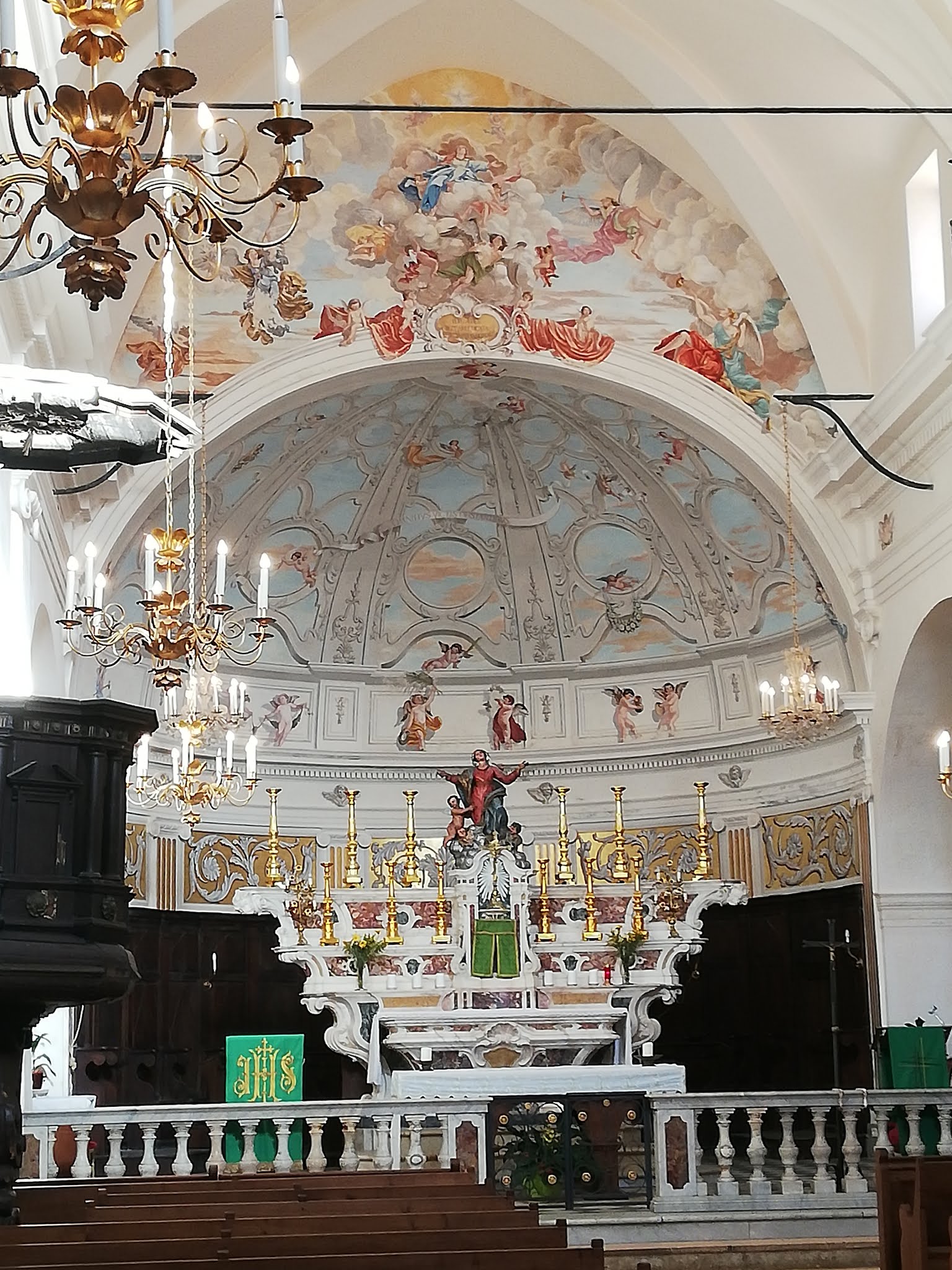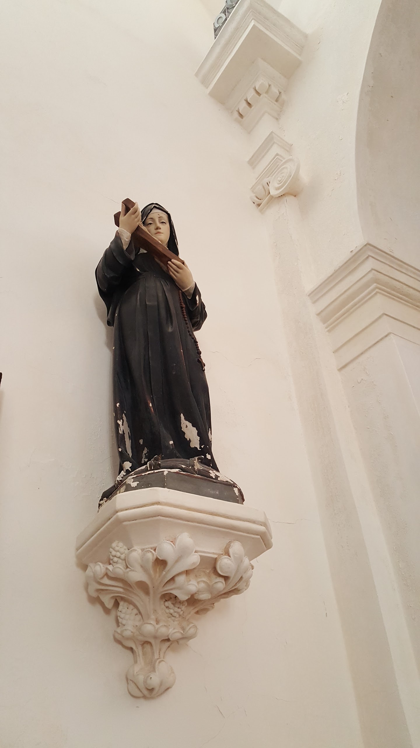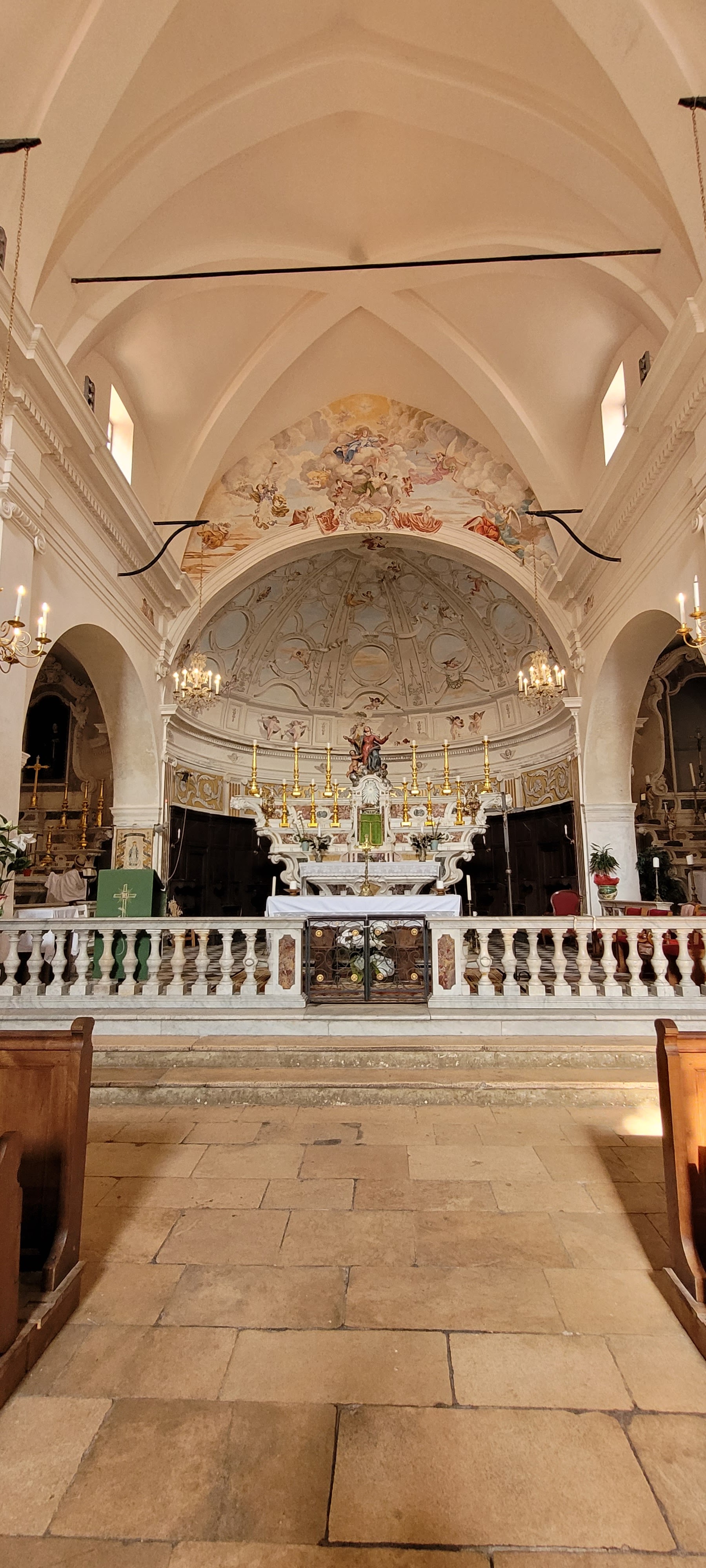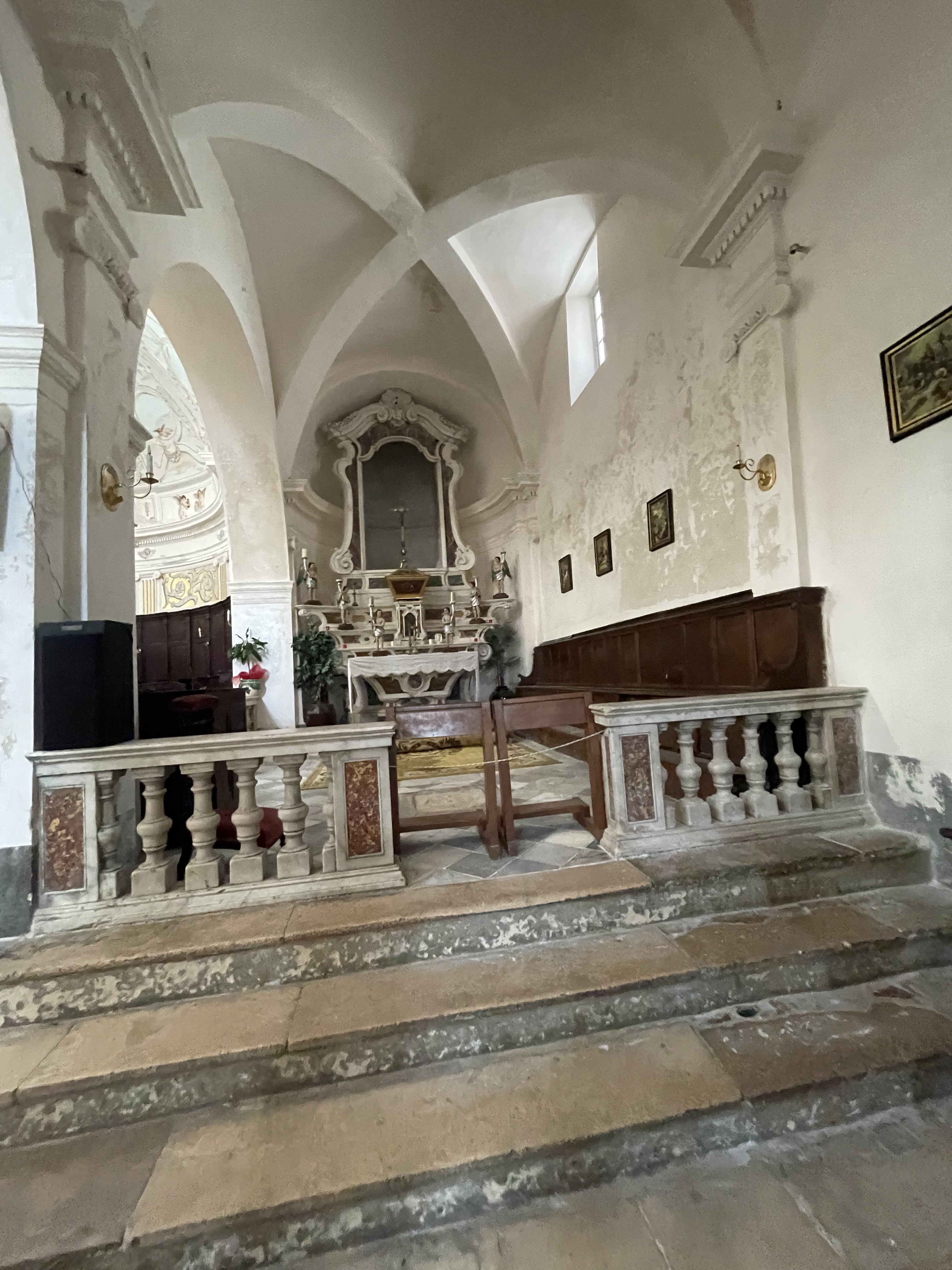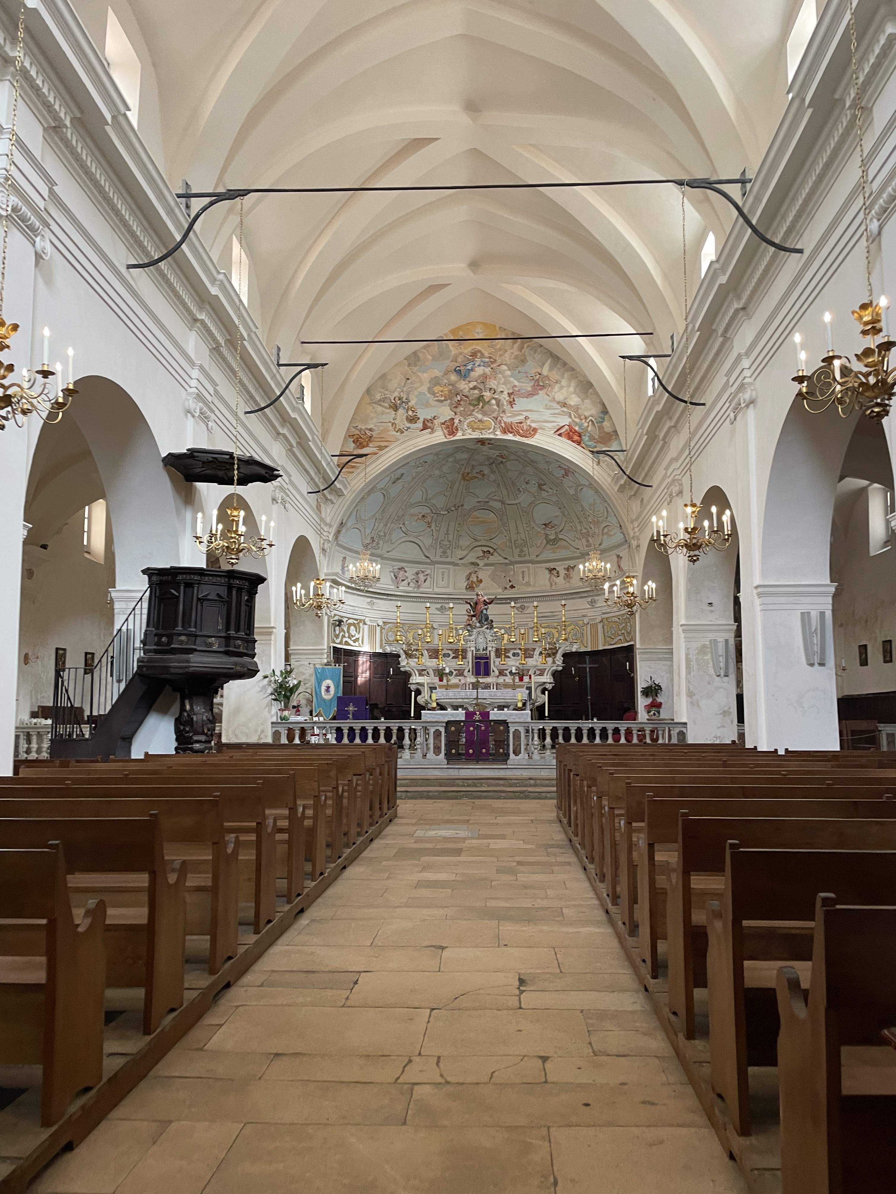Jaime la couleur blanche interieure de cette église ! Couleur qui nous ravive par rapport aux couleurs moroses de cette vieille ville de bonifacio...contraste frappant entre ce blanc (et les peintures magnifiques) par rapport aux ruelles étroites grises et sales et tristes........regardez la photo de la façade tout a côté de l'entrée de l'église...