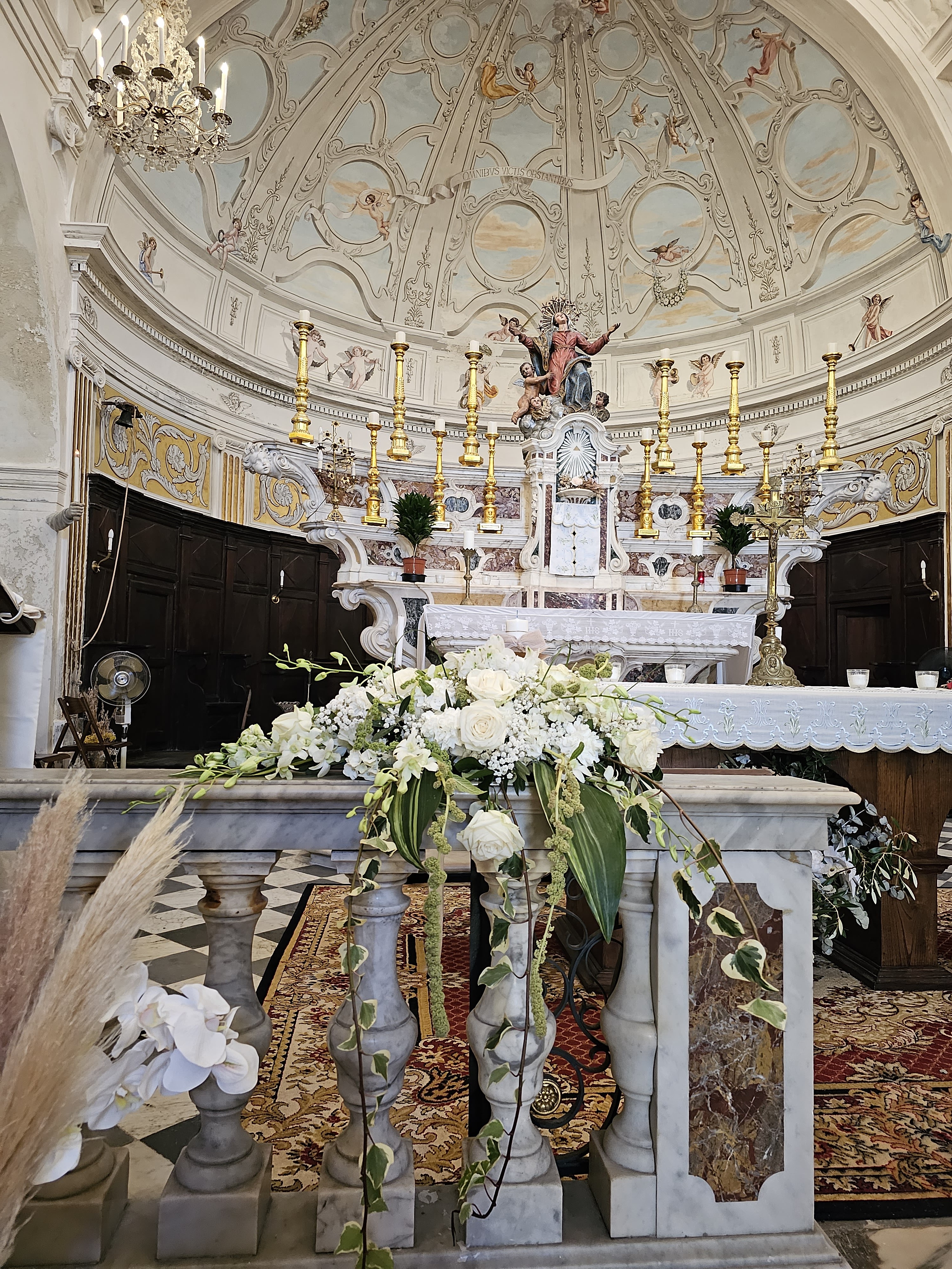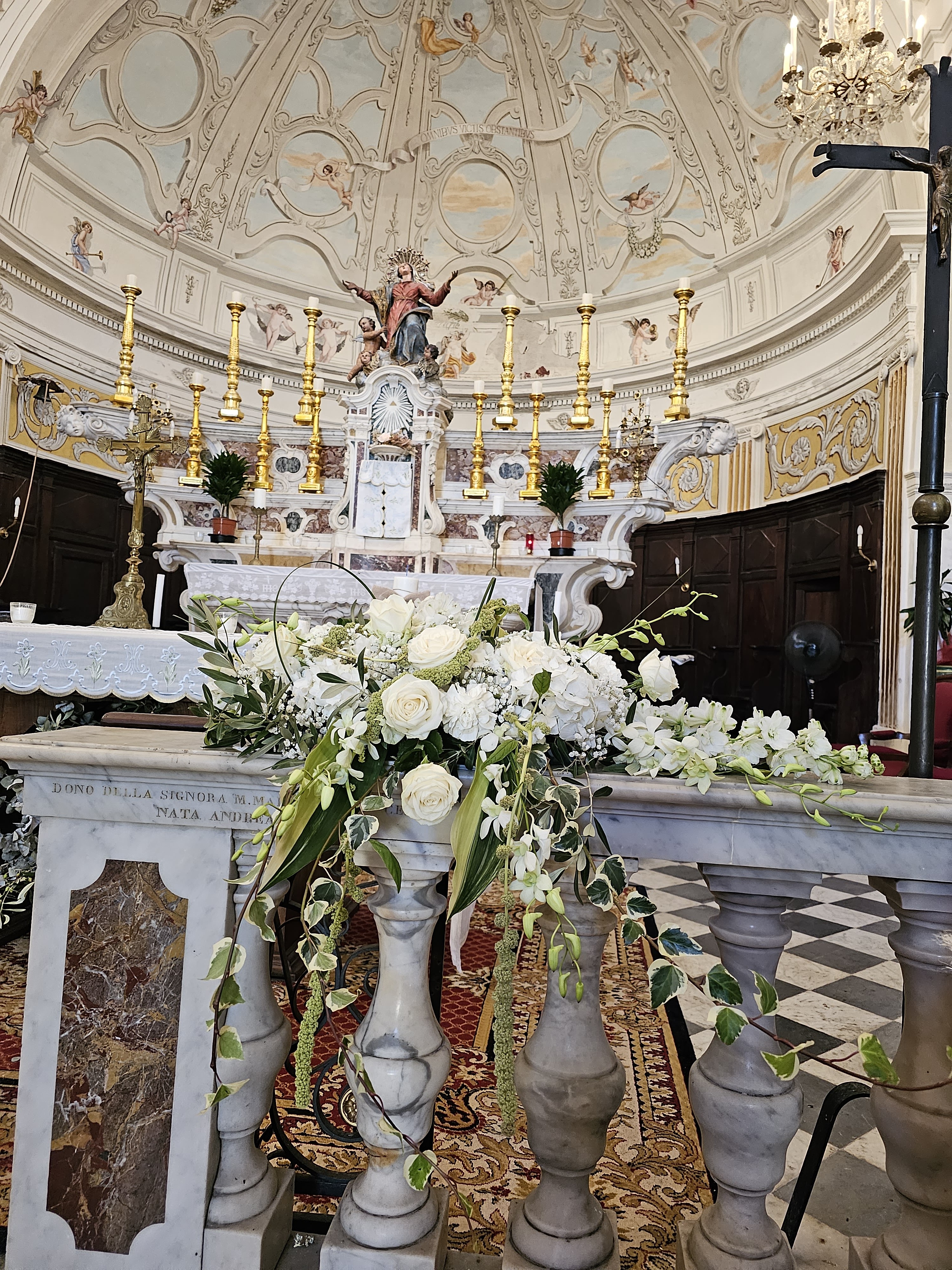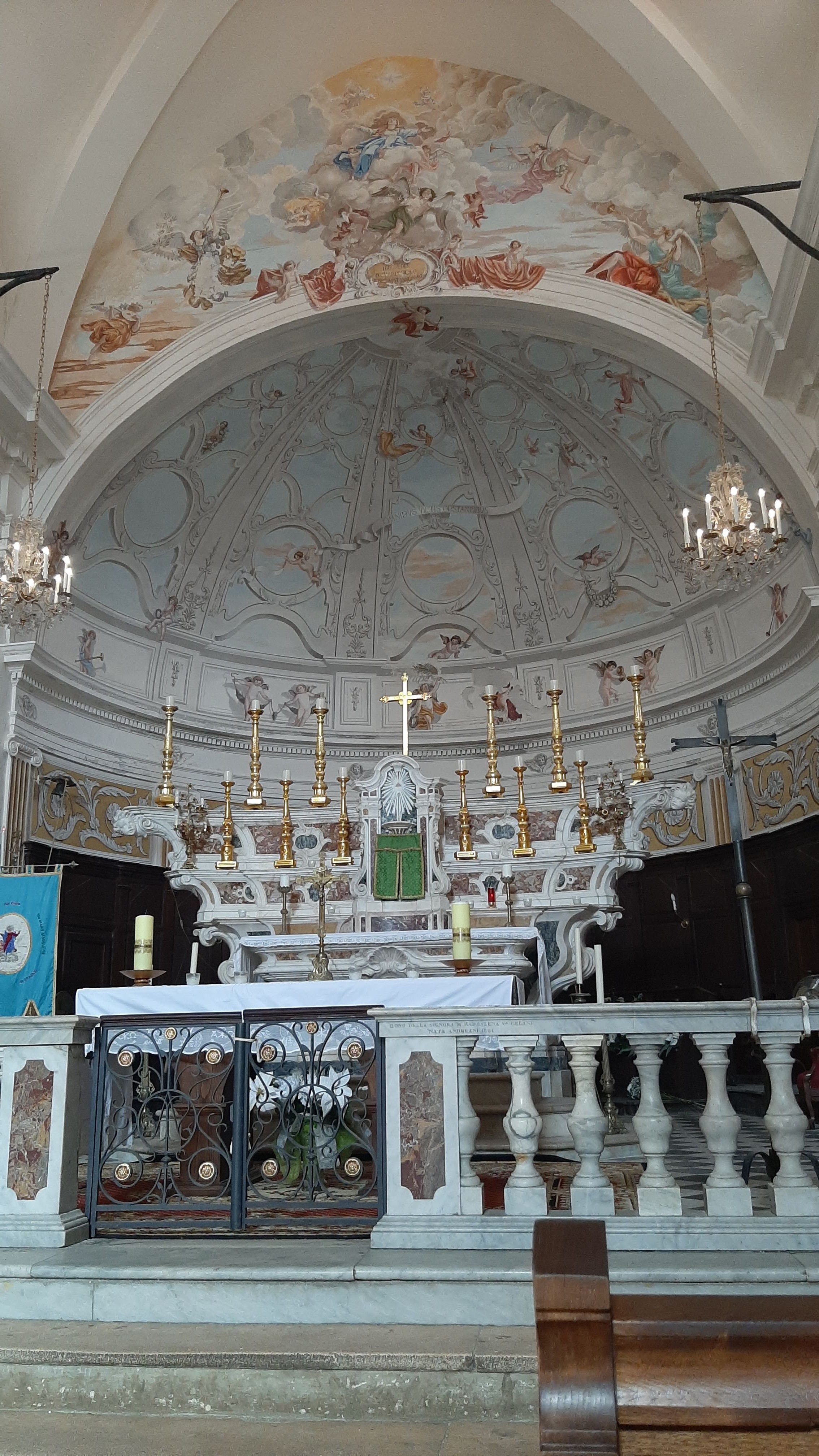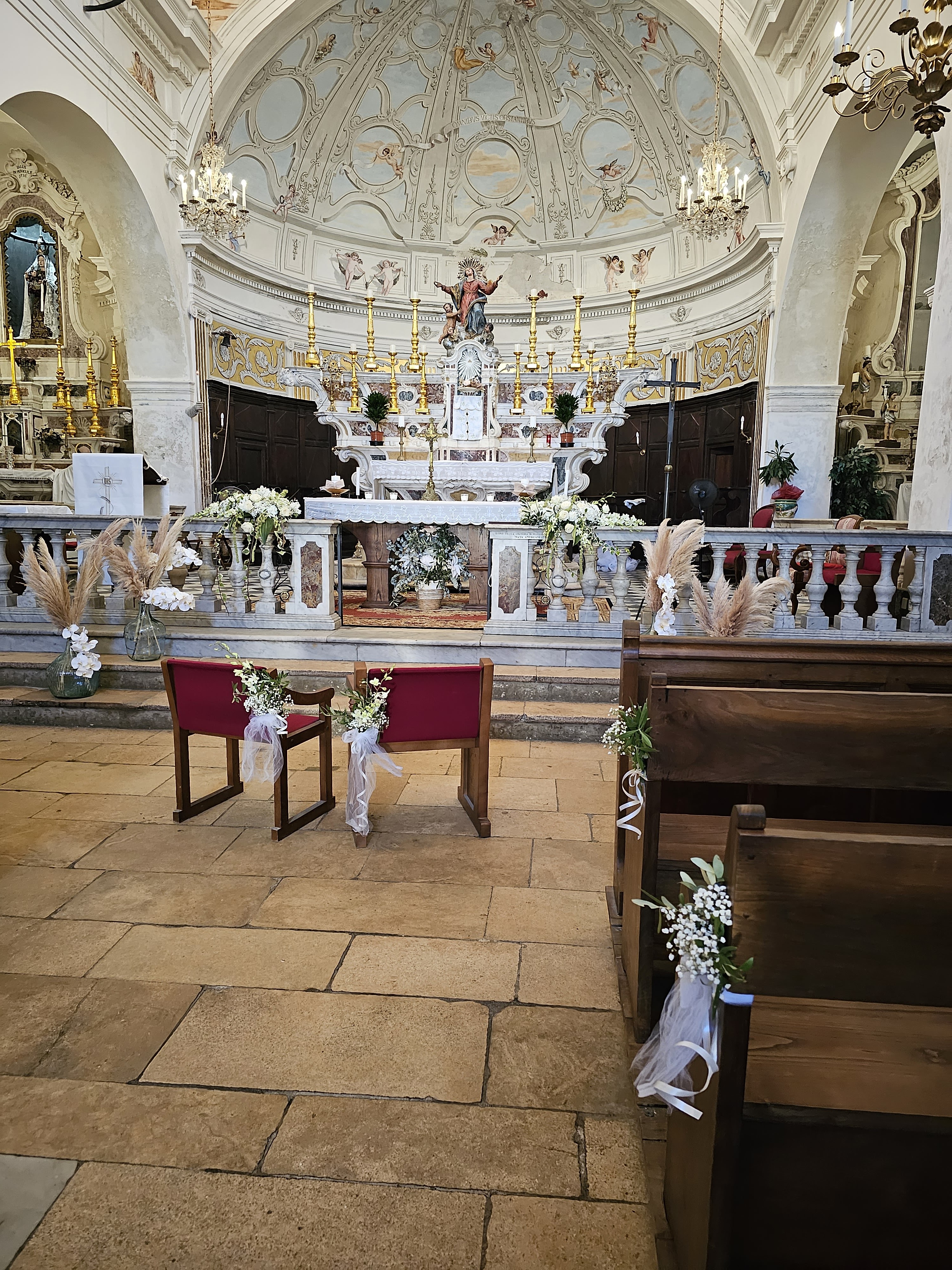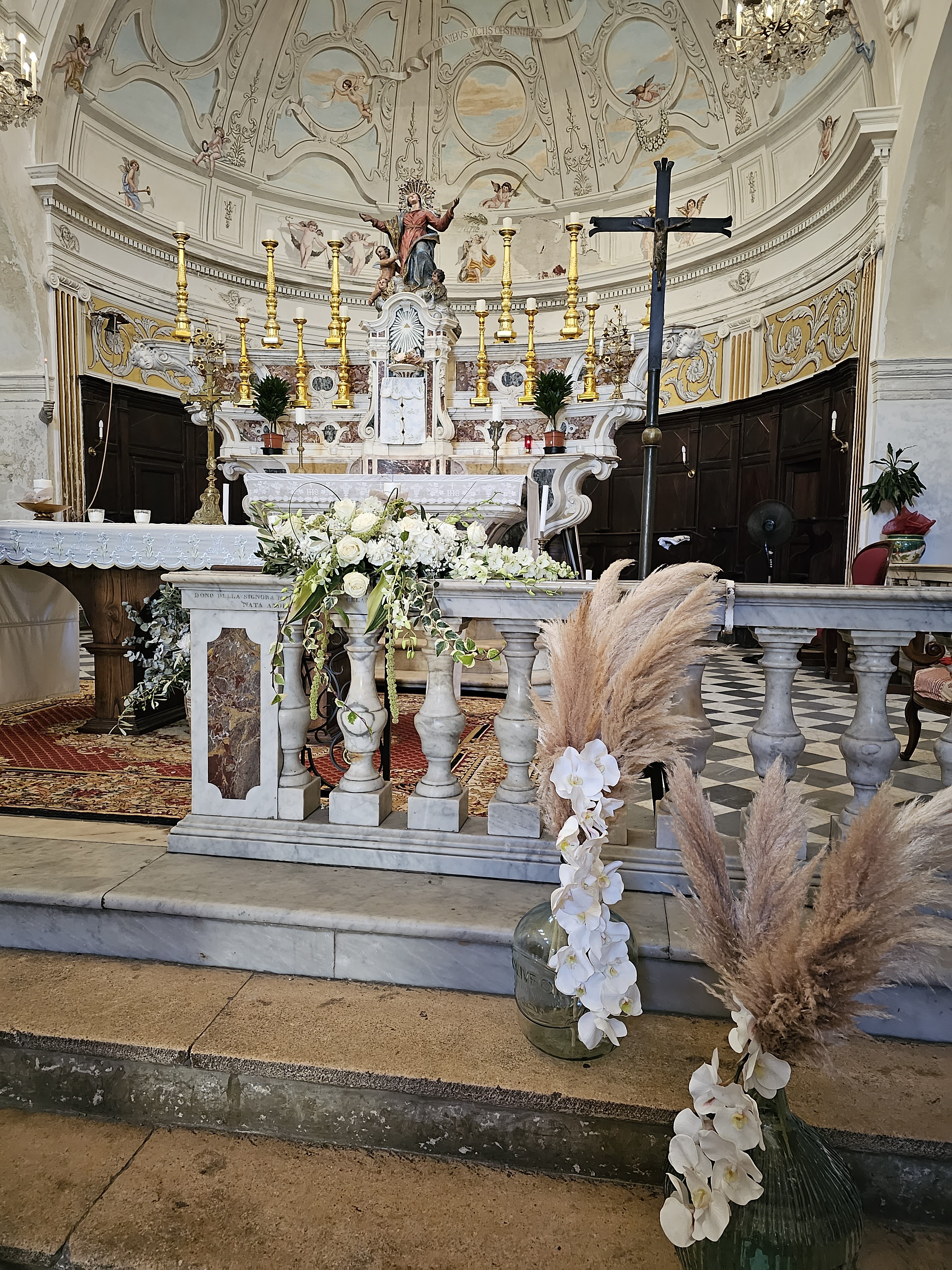 Jaime la couleur blanche interieure de cette église ! Couleur qui nous ravive par rapport aux couleurs moroses de cette vieille ville de bonifacio...contraste frappant entre ce blanc (et les peintures magnifiques) par rapport aux ruelles étroites grises et sales et tristes........regardez la photo de la façade tout a côté de l'entrée de l'église...