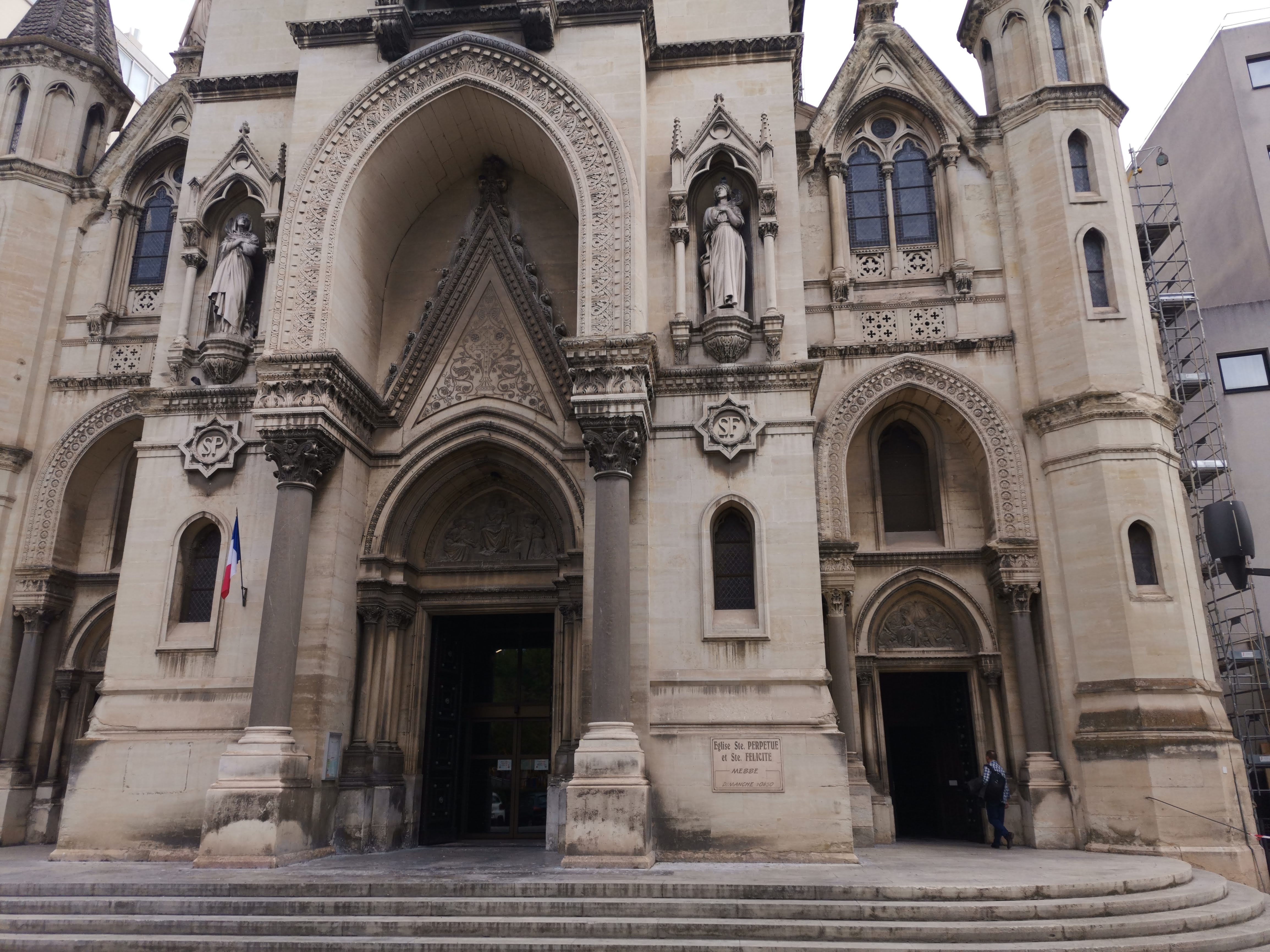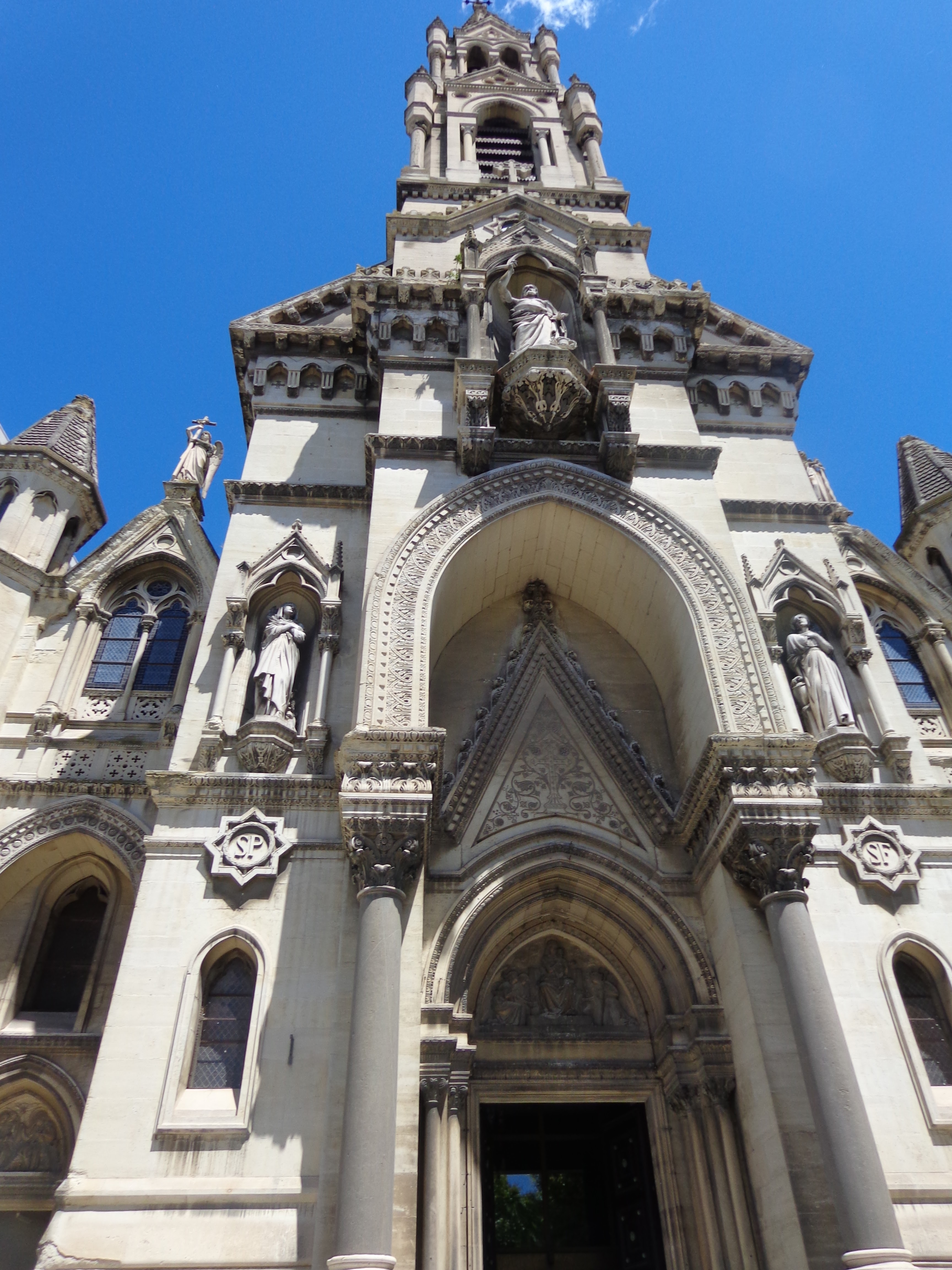 Belle tour de l'église Santa Perpetua, à Nîmes. Le clocher de la façade présente une flèche d'une hauteur de 70 mètres dominant l'esplanade Charles de Gaulle. Sa première pierre fut posée en 1852 par Louis Napoléon Bonaparte. La construction fut achevée en 1864. L'église fut construite selon les plans de l'architecte León Feuchère.