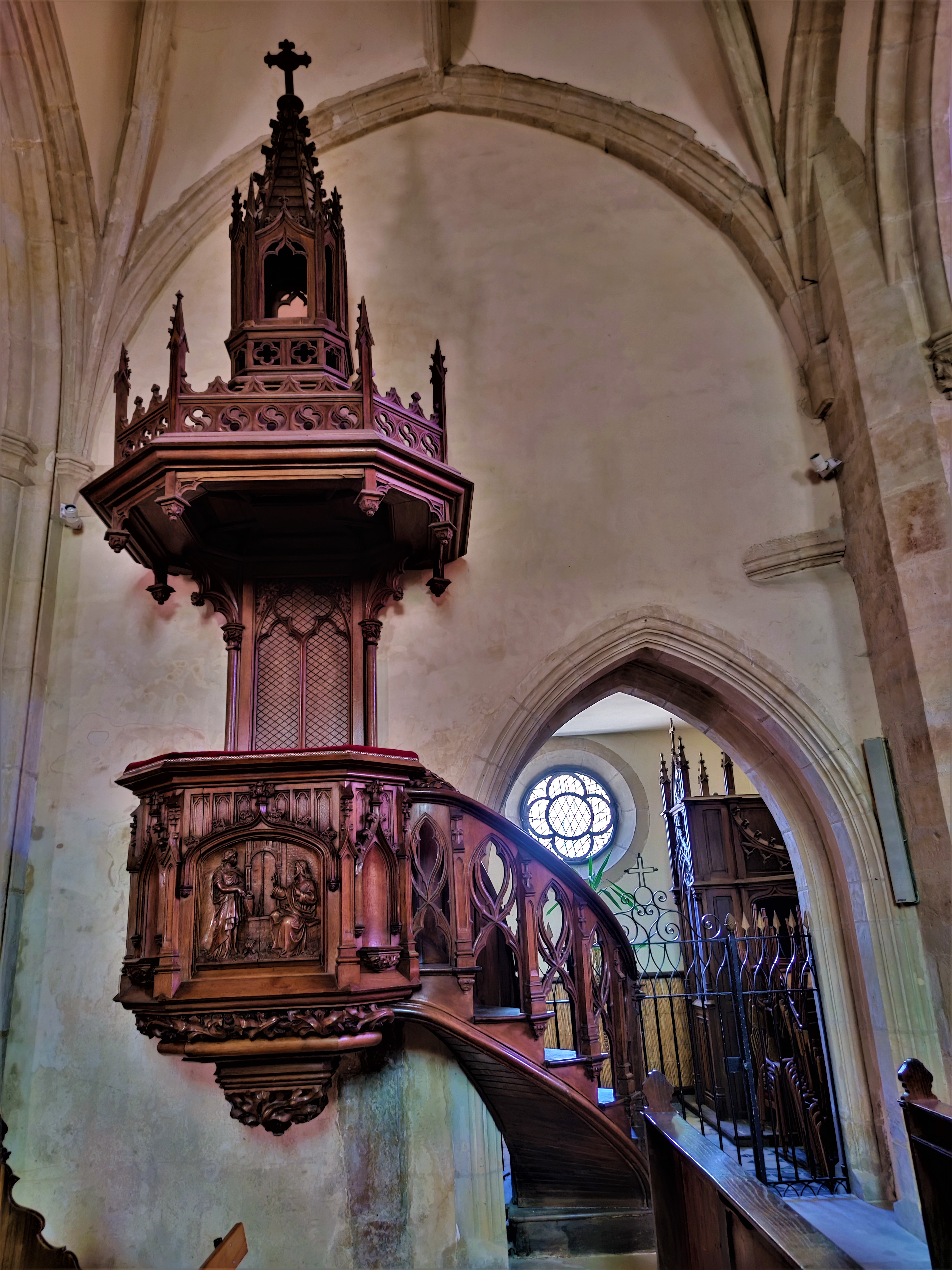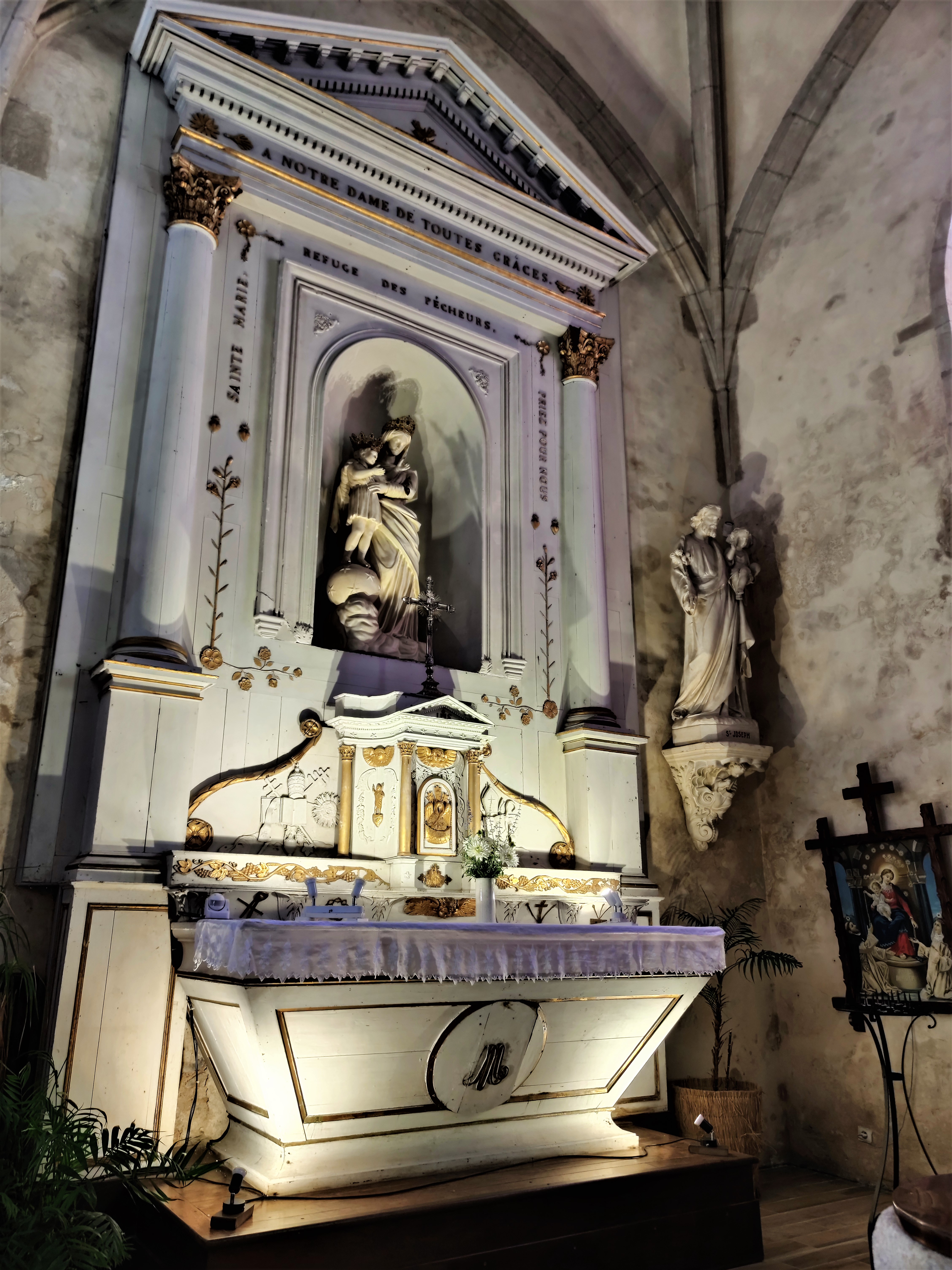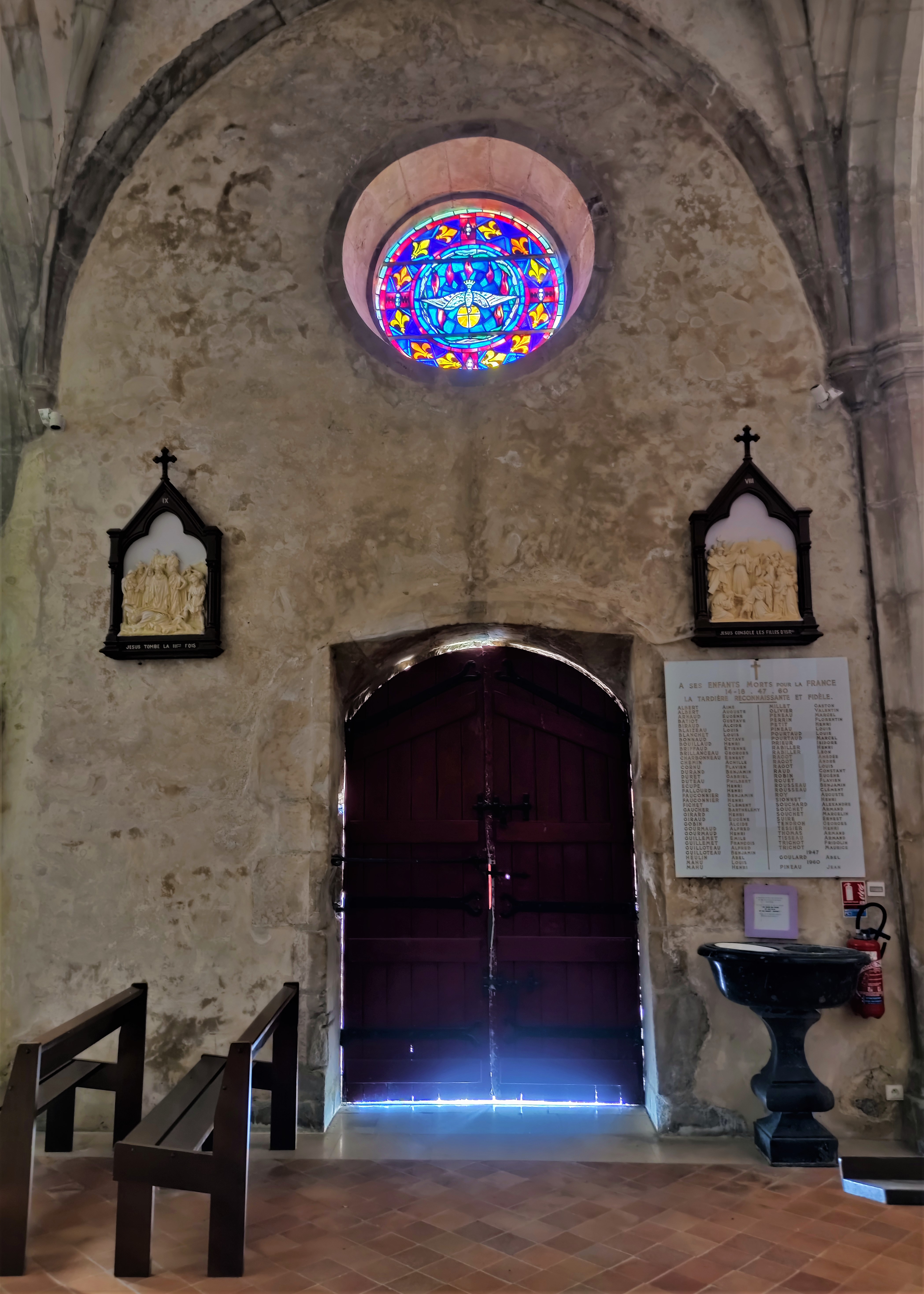 Une église en bon état, et le plus, un beau trésor, une peinture de Rubens (copie) un mobilier et des vitraux. La première église fut construite au 12ème siècle, elle fut modifiée, agrandie et reconstruite en partie au 14ème siècle, dans le style gothique, c'est la base de l'église actuelle. Au 16ème siècle, durant les guerres de religions très actives dans cette région, les huguenots l'envahissent et la dépouille brutalement en 1568. Puis vint la révolution française. Vendue en 1795 comme bien national, devenue bâtiment agricole, laissée sans entretien, elle se dégrade. Elle revient à la commune en 1824 et sera remise en état tout au long du 19ème siècle. Au 20ème, des campagnes de restauration se succèdent, offrant aujourd'hui aux visiteurs une église en bon état. Le plus, un beau trésor, une peinture de Rubens (copie) un mobilier et des vitraux.